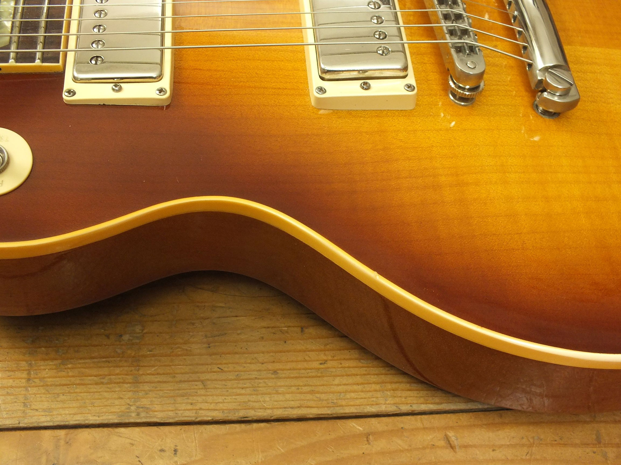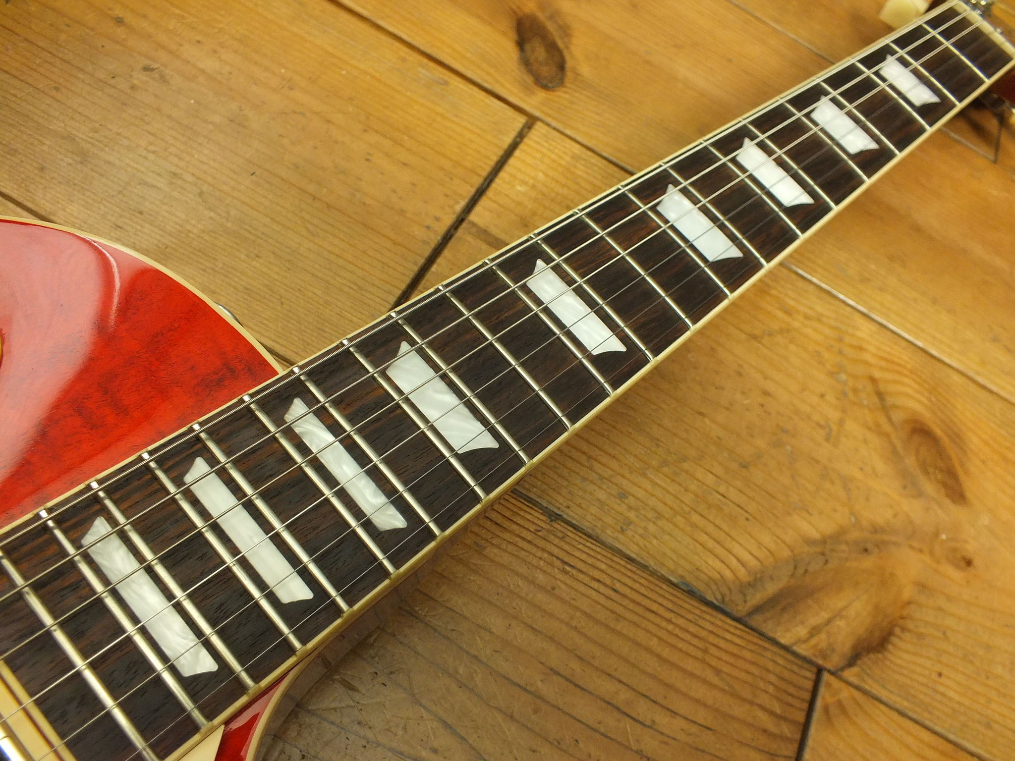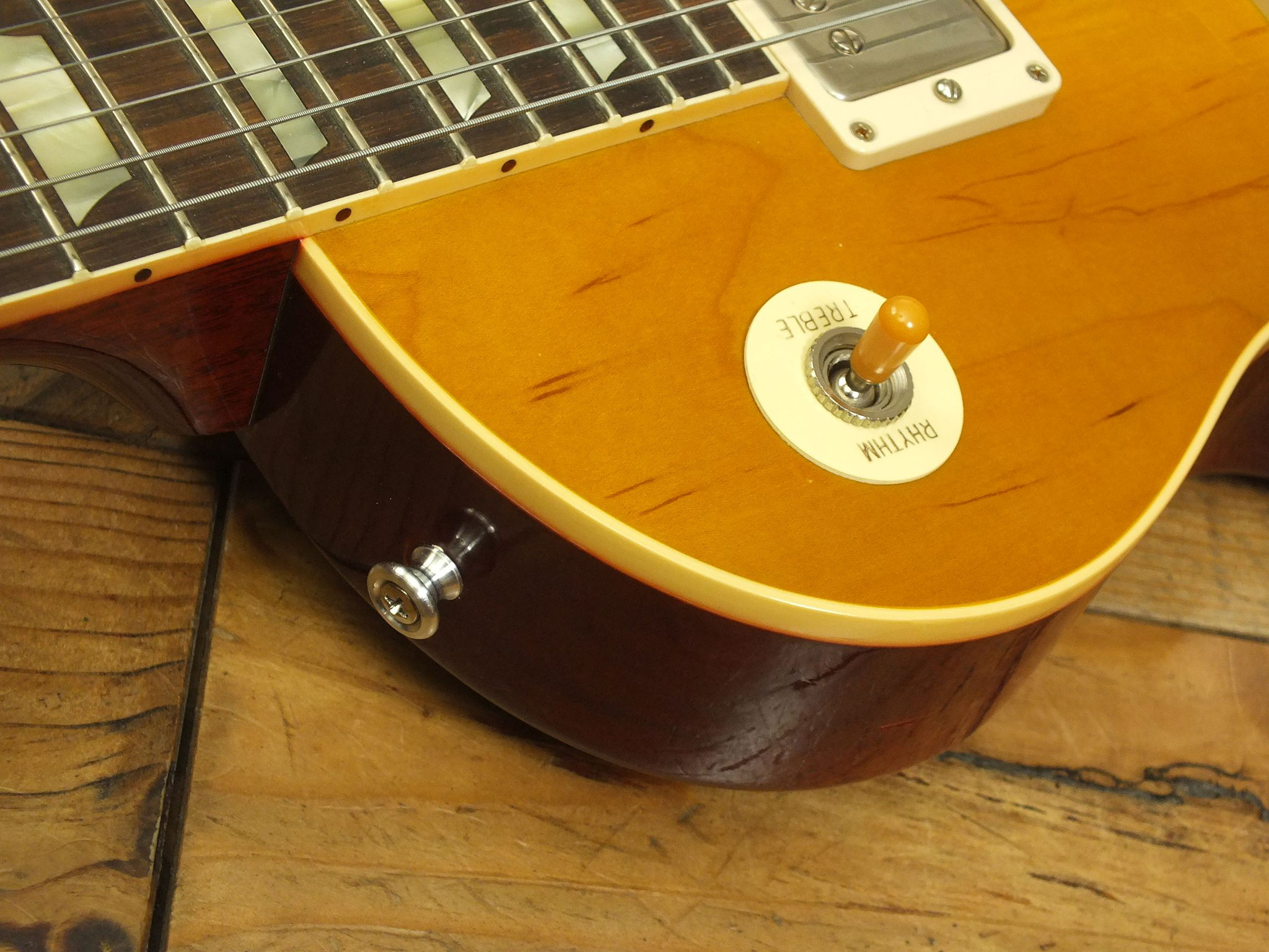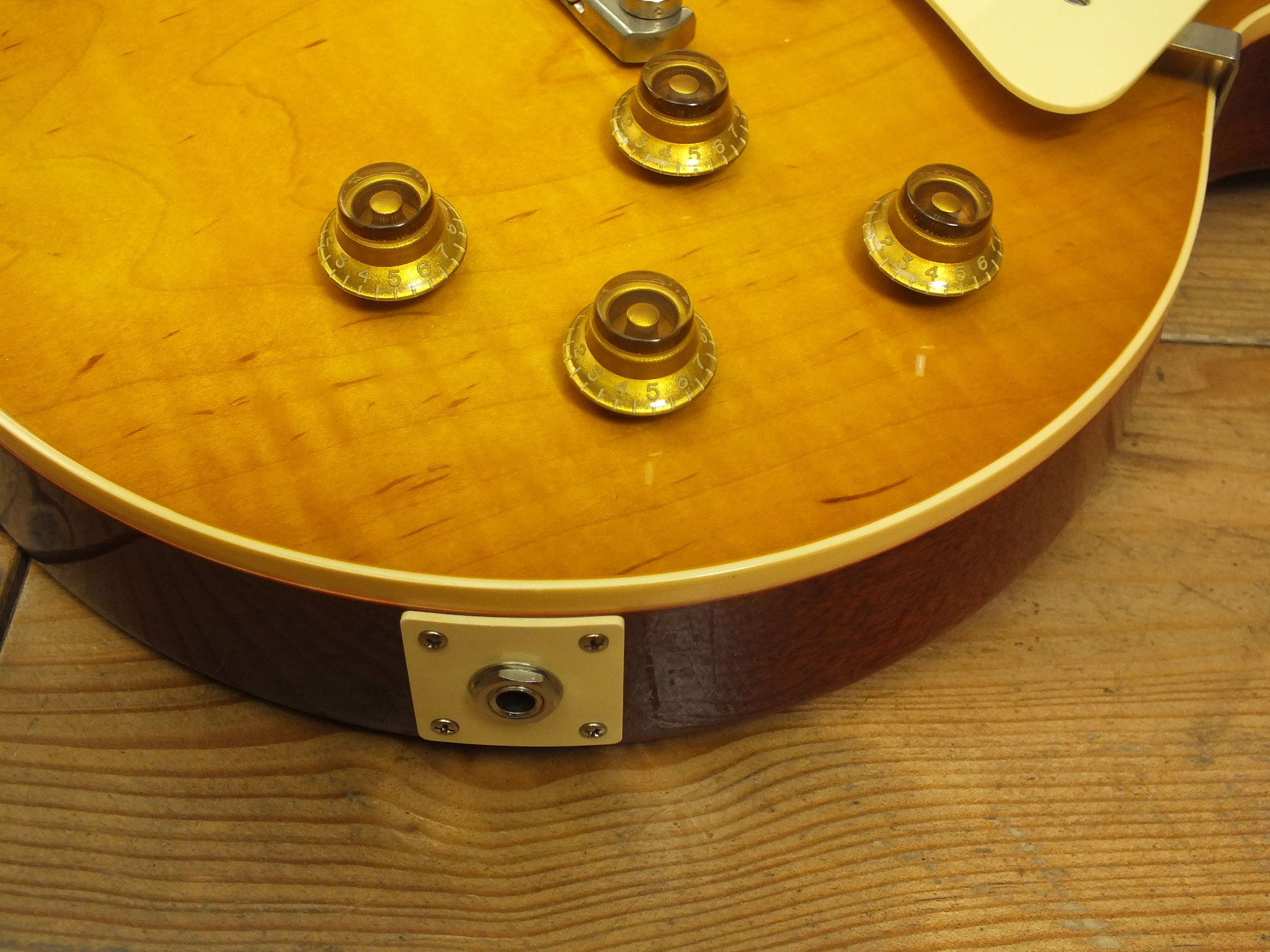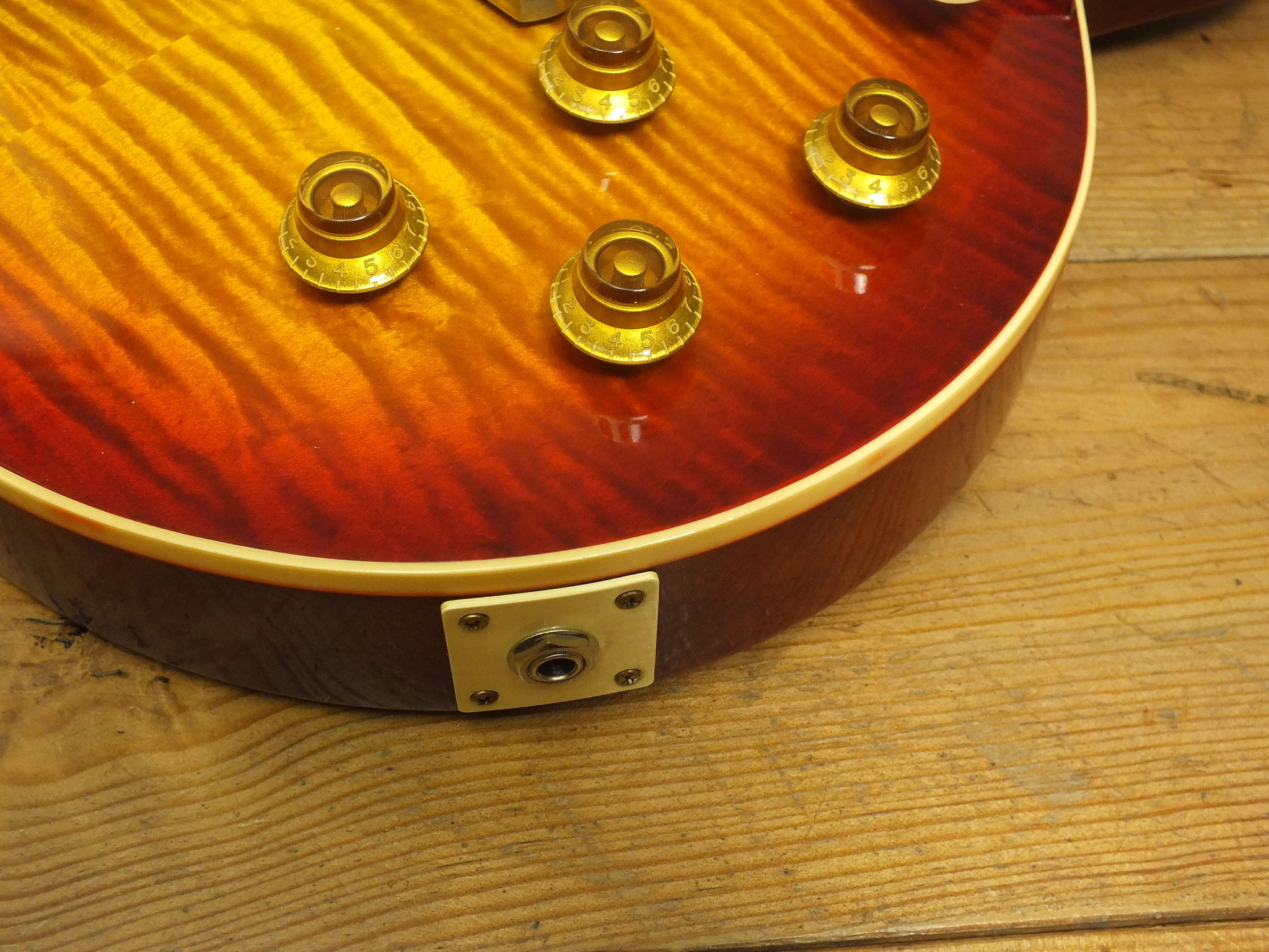 Die sonstigen Komponenten sind altbewährt: Mahagoni-Body mit gewölbter Ahorn-Decke. Ein recht kräftiger Hals mit Ebenholz-Griffbrett und 22 Medium-Jumbo-Bünden.