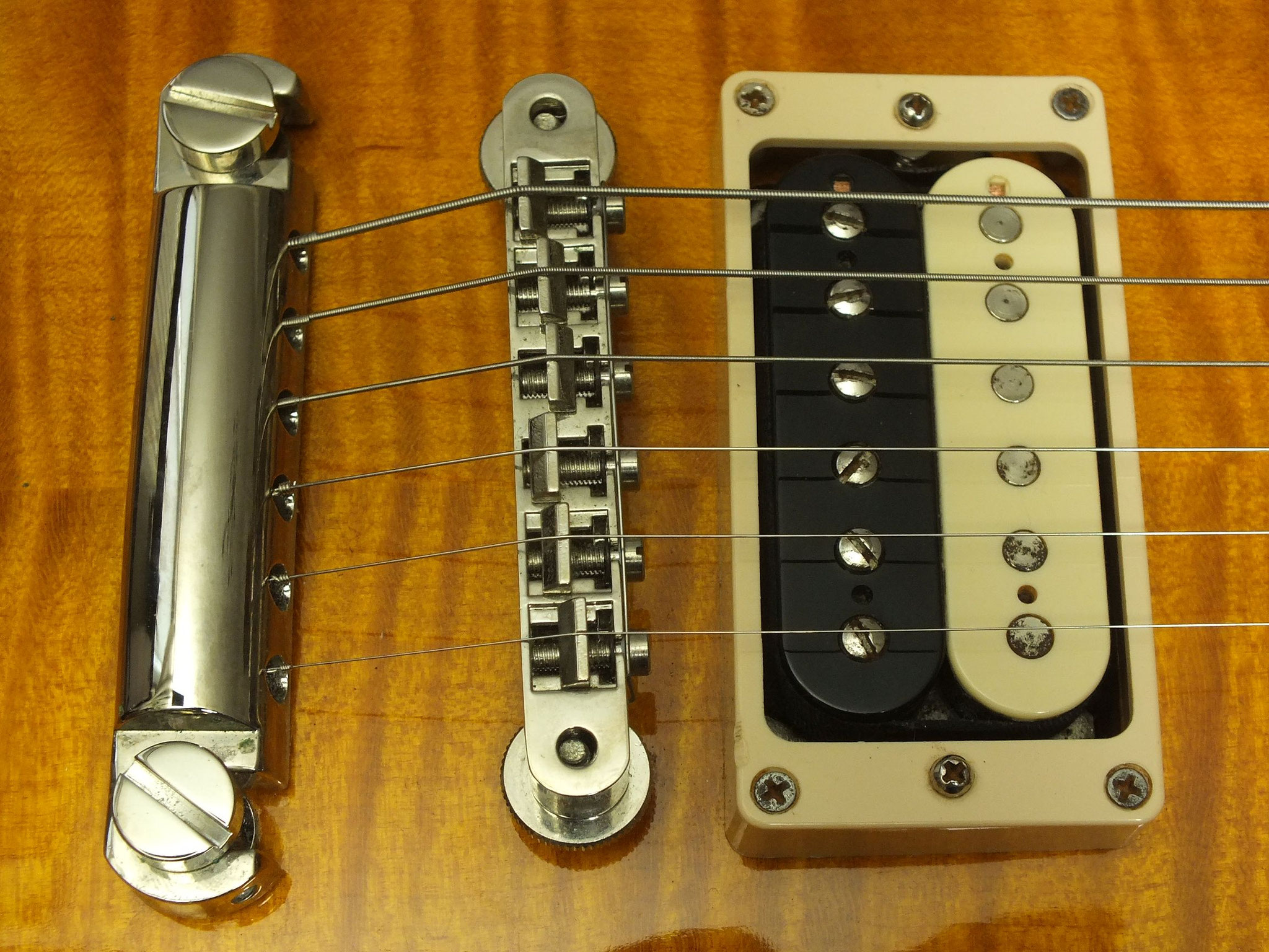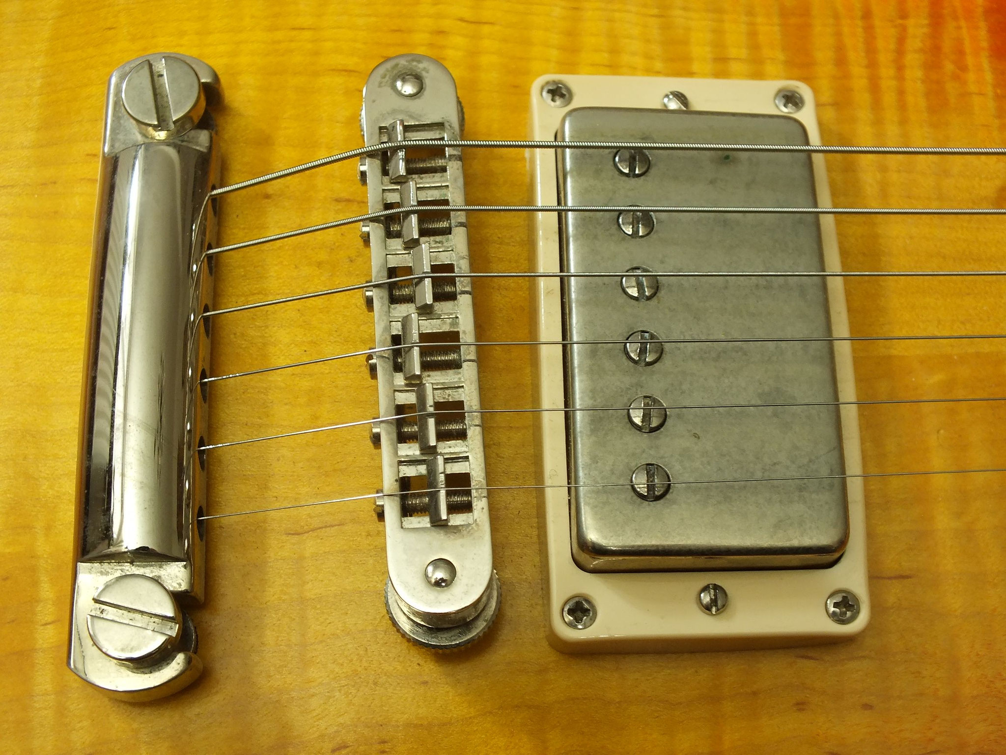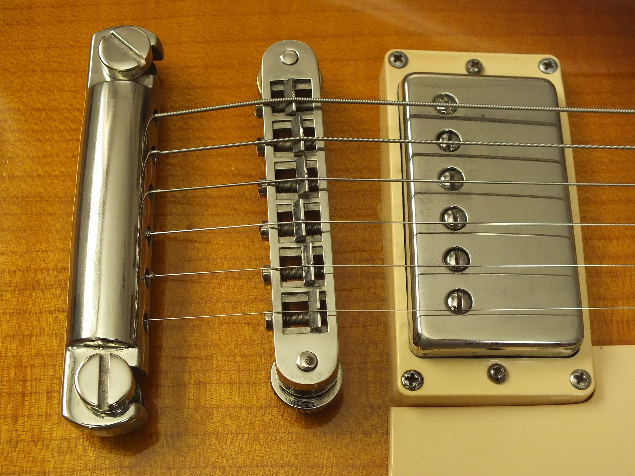 Ebenfalls nicht original sind das Alu-Stop-Tailpiece und die Tune-O-Matic Bridge von Faber, mit denen der Vorbesitzer die Gitarre ausgestattet hat.
