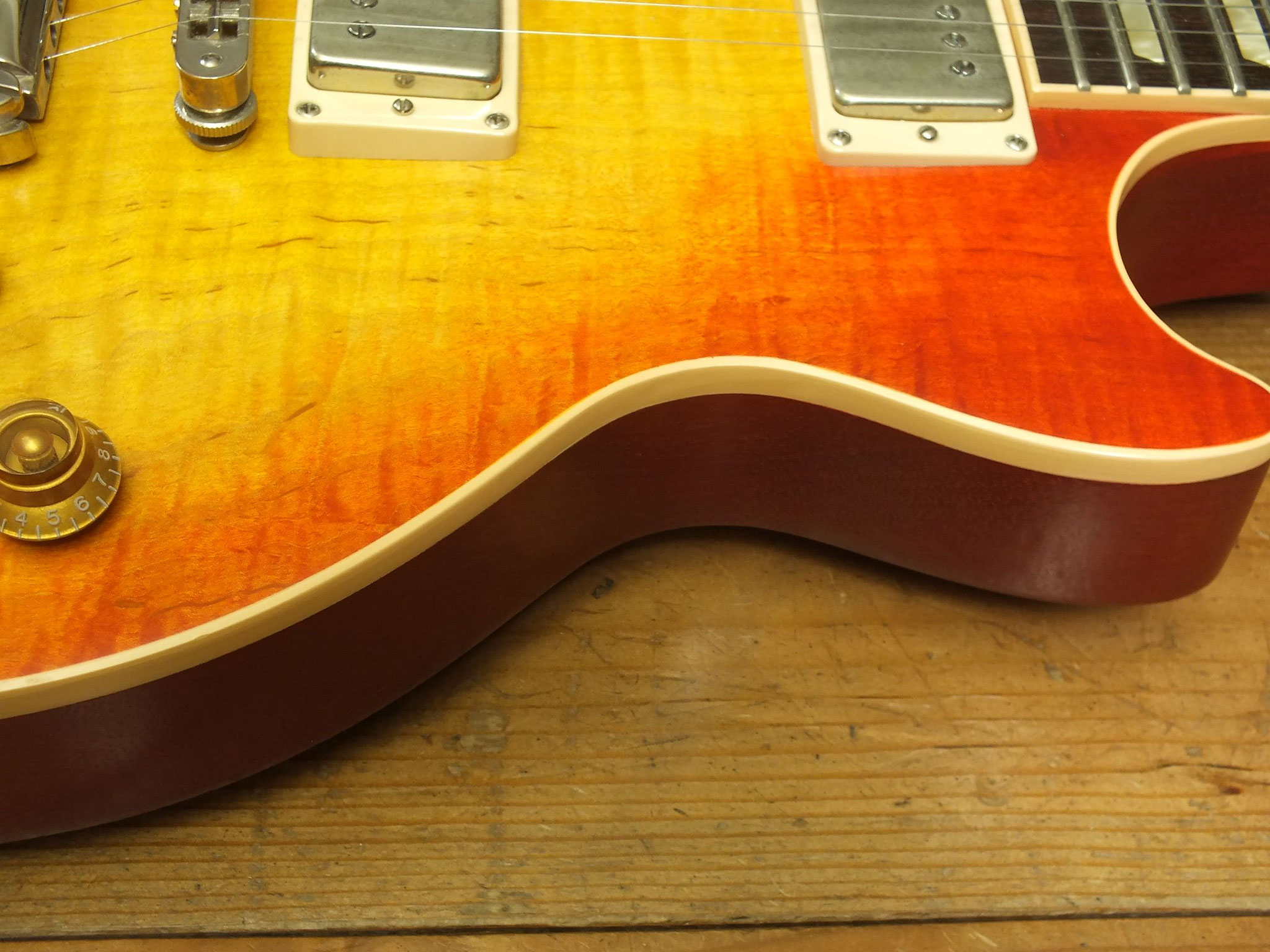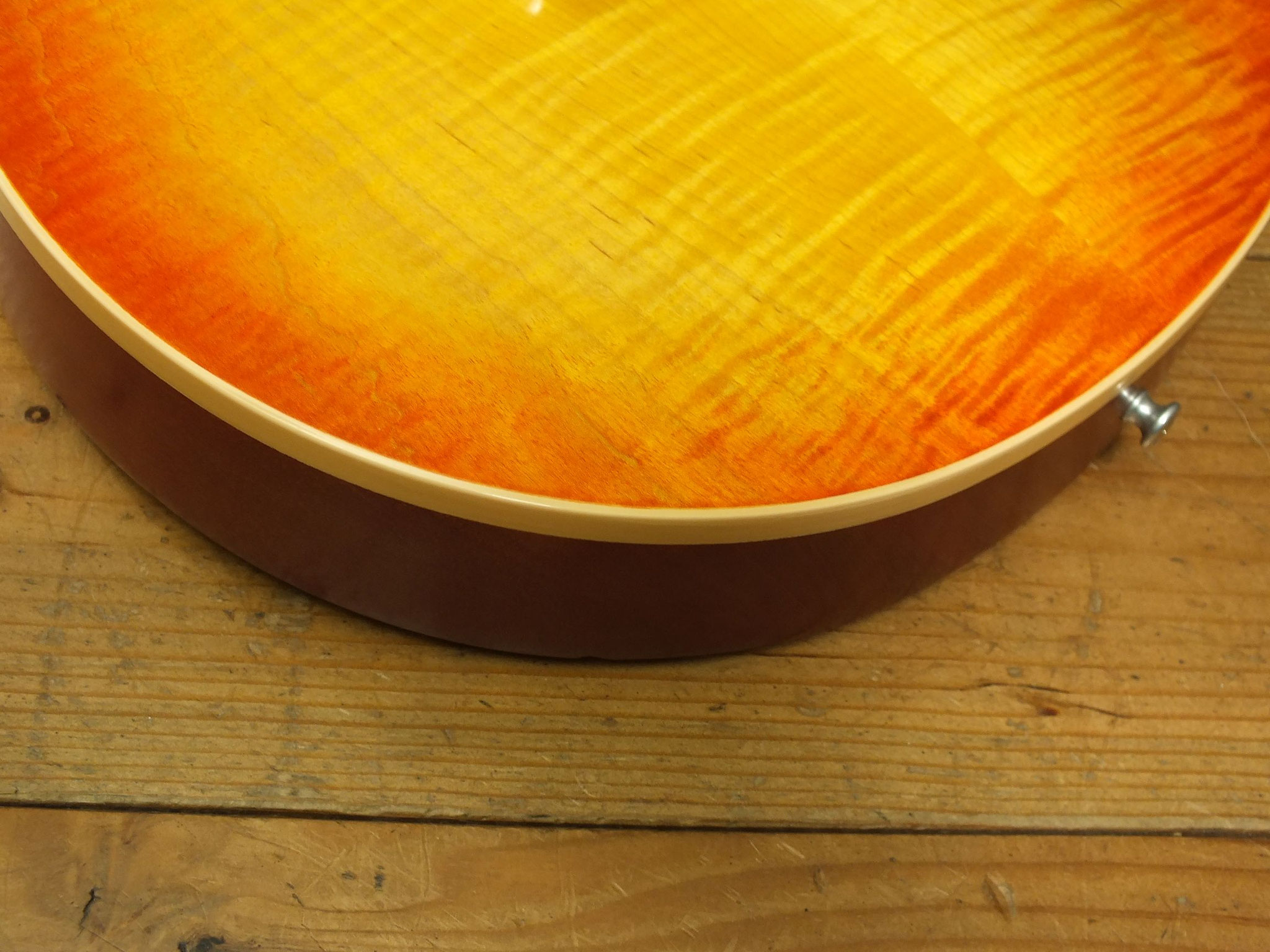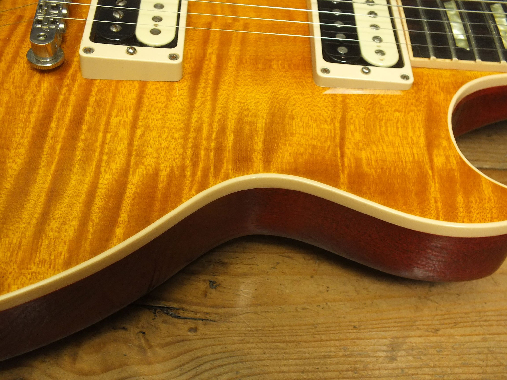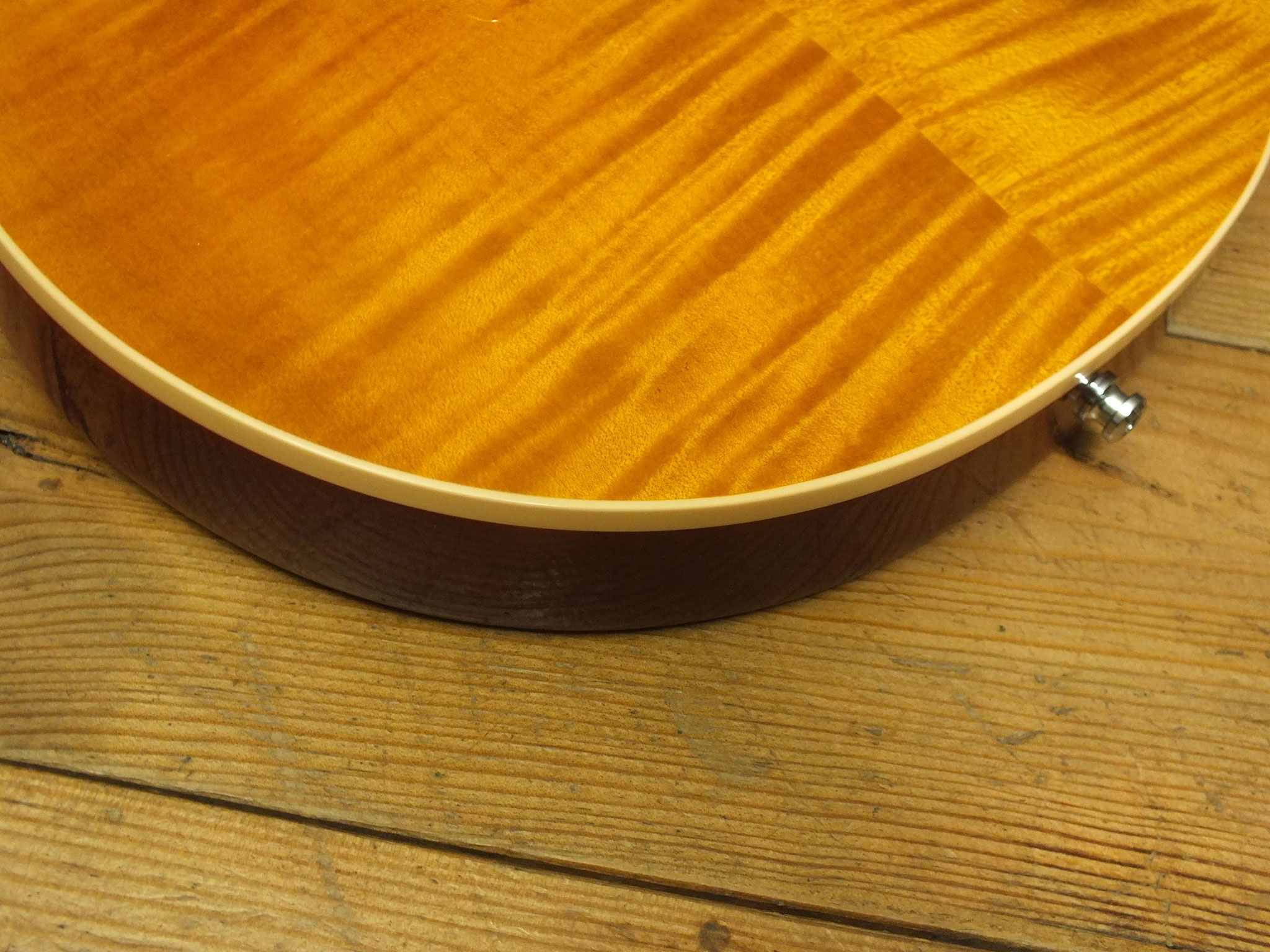 Ergonomischer und etwas flacherer Body mit "Bierbauch" Fräsung, fließendem Hals-Korpus-Übergang und wunderschönem "Flamed Maple Top" im Amber / Lemon Burst Finish.