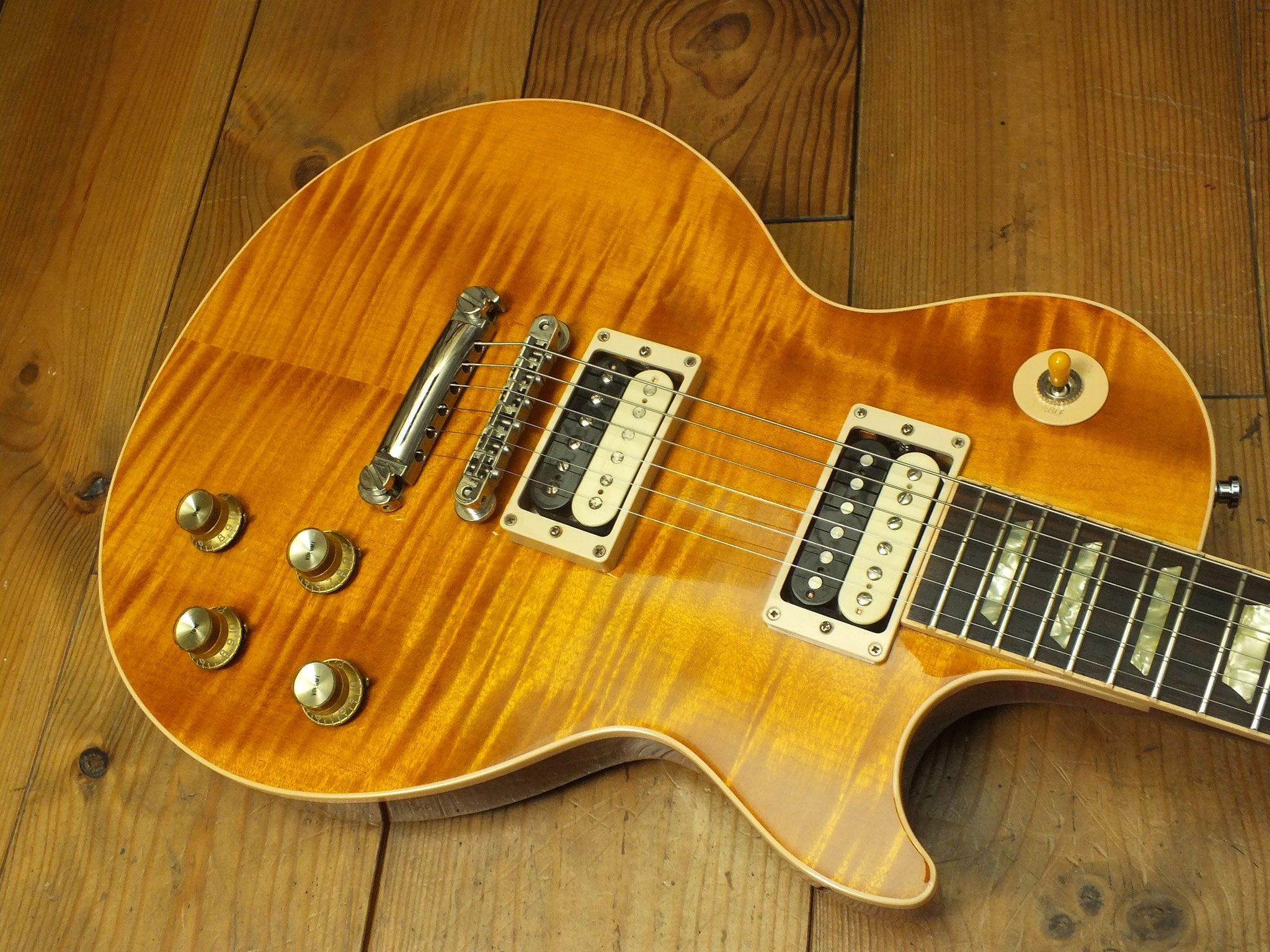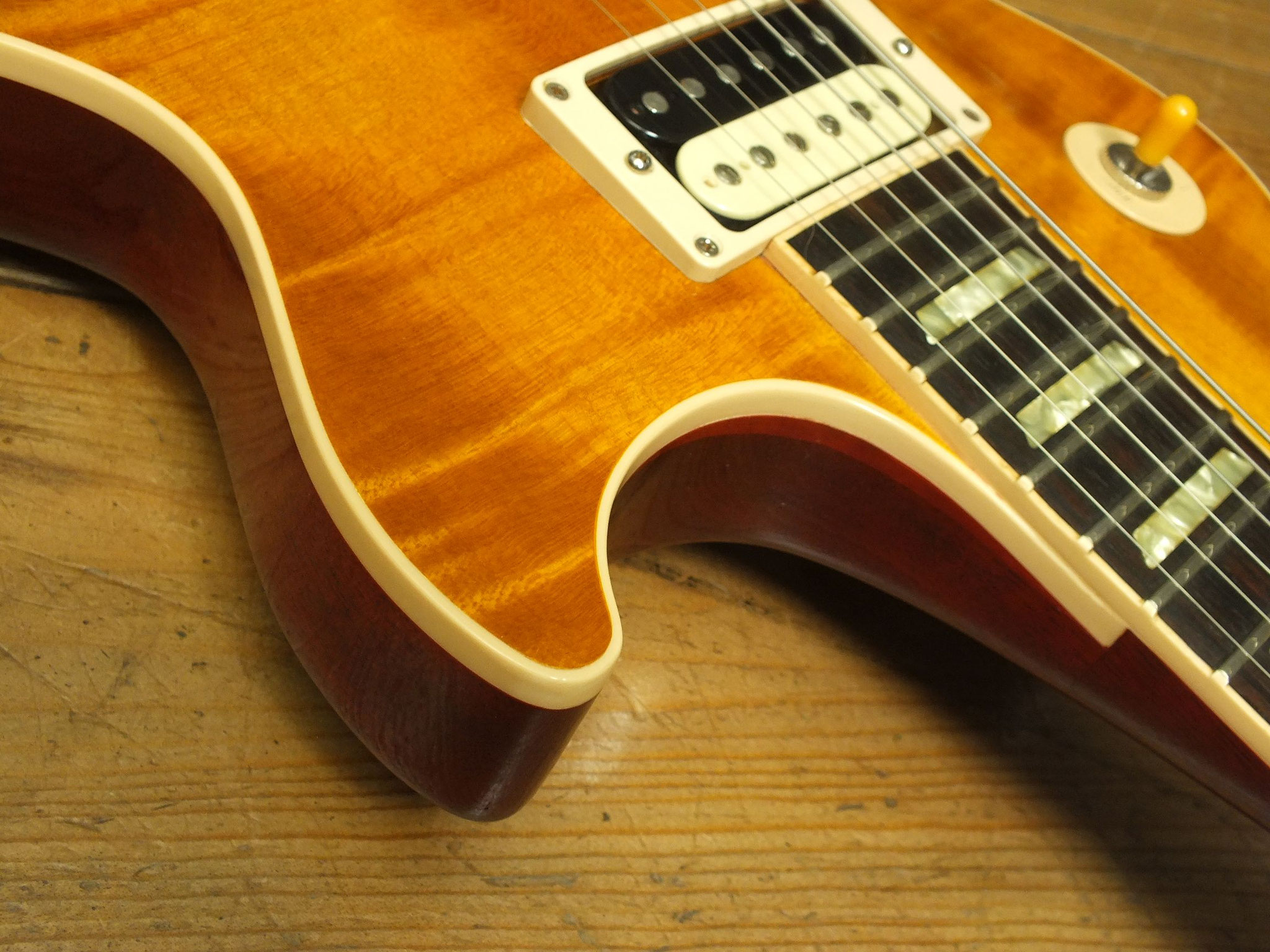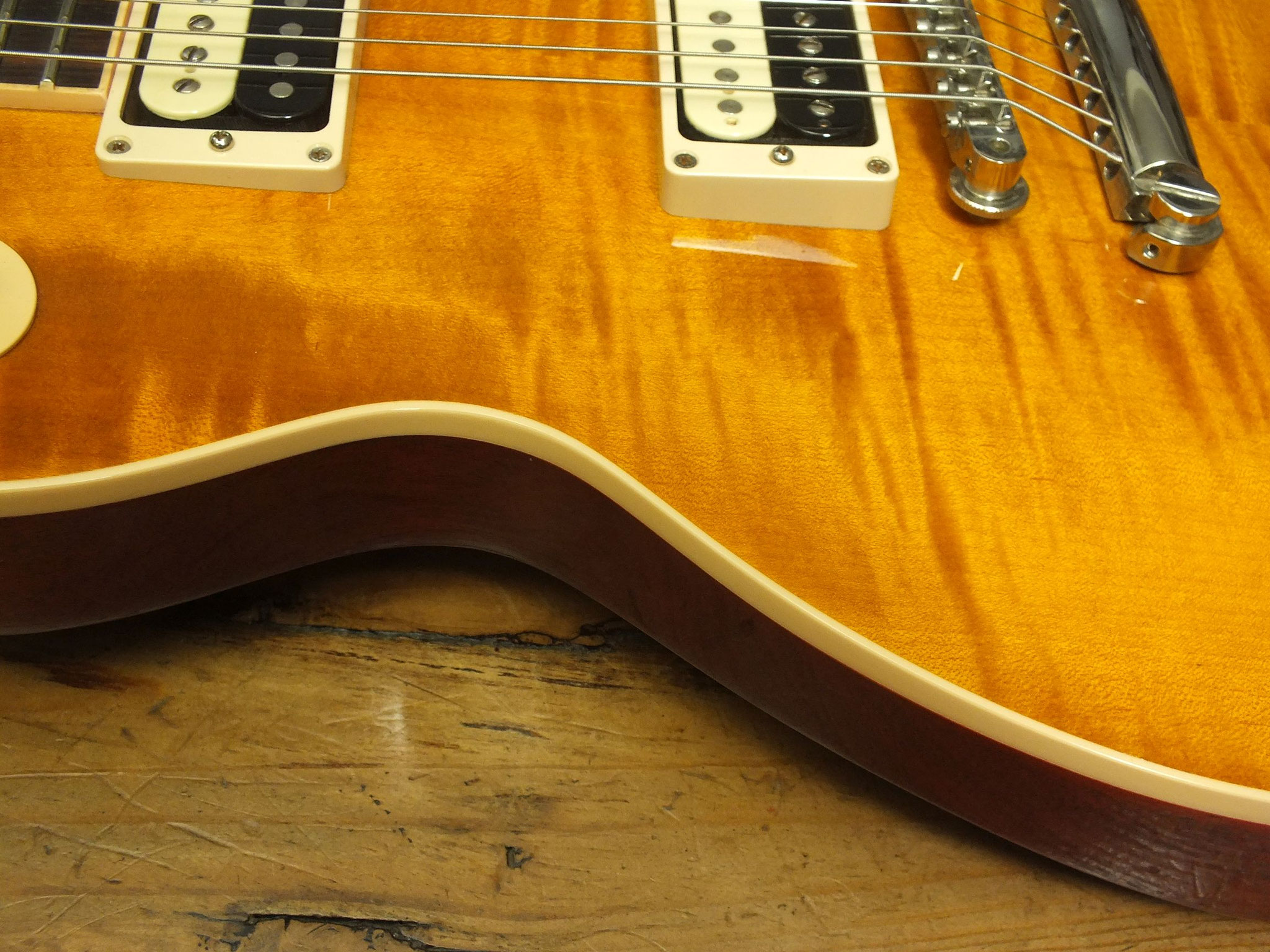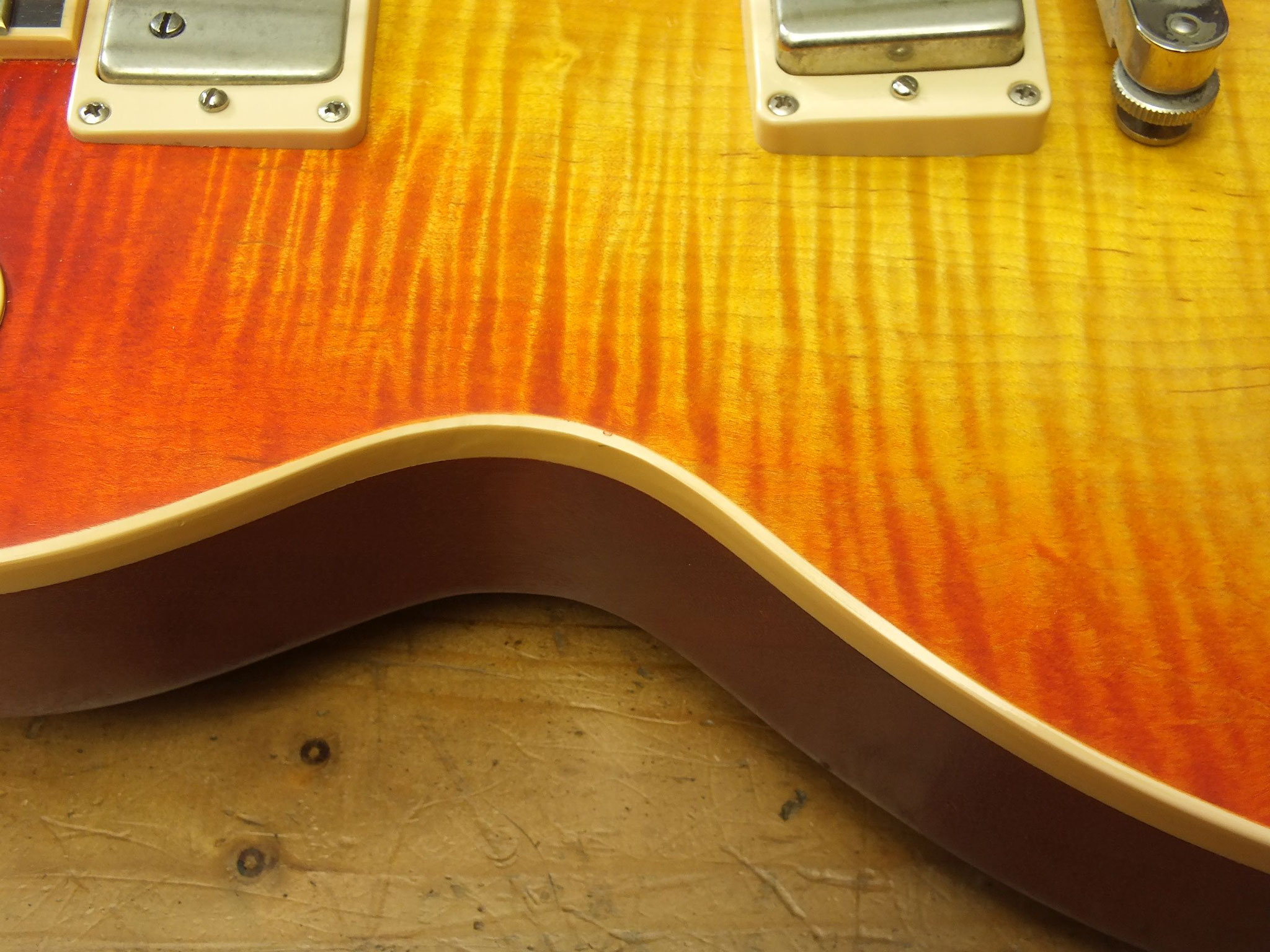 Ergonomischer und etwas flacherer Body mit "Bierbauch" Fräsung, fließendem Hals-Korpus-Übergang und wunderschönem "Flamed Maple Top" im Amber / Lemon Burst Finish.