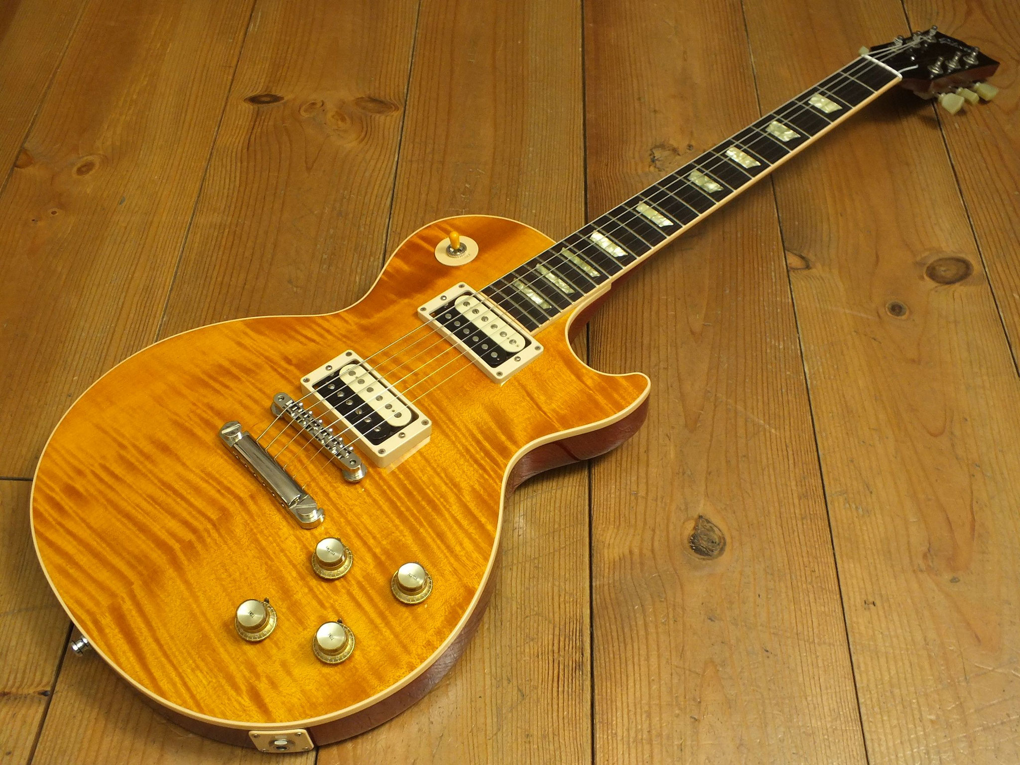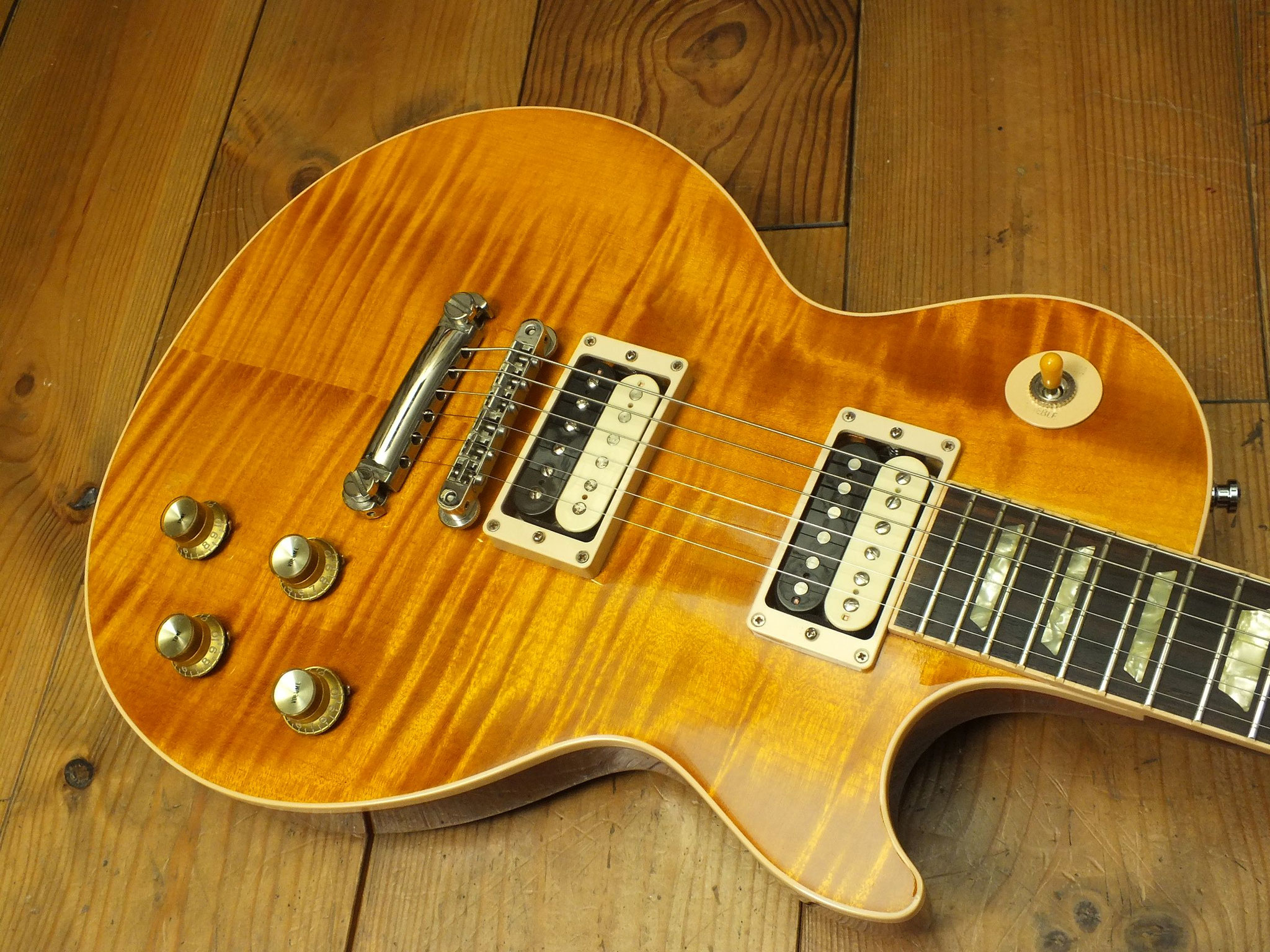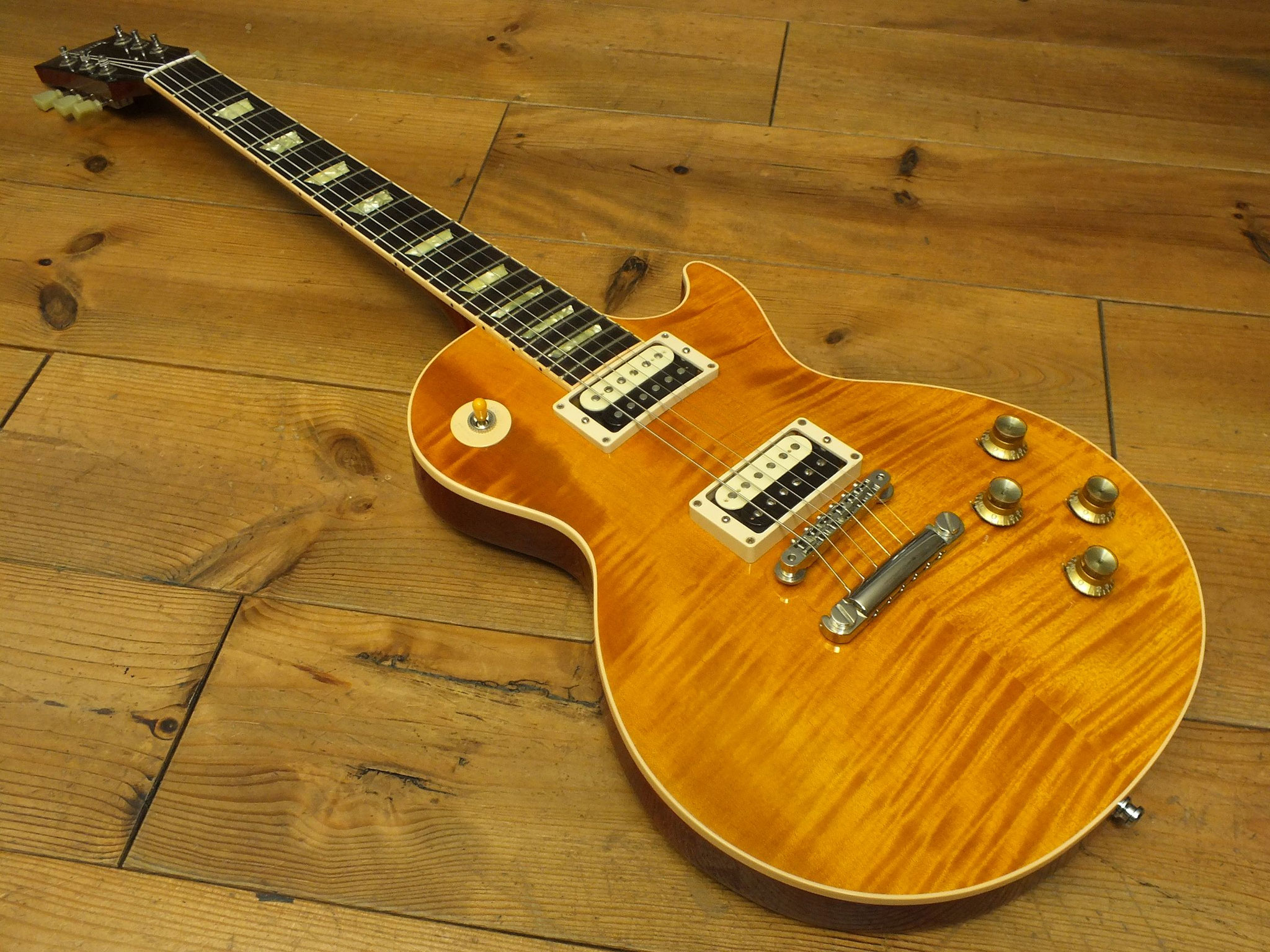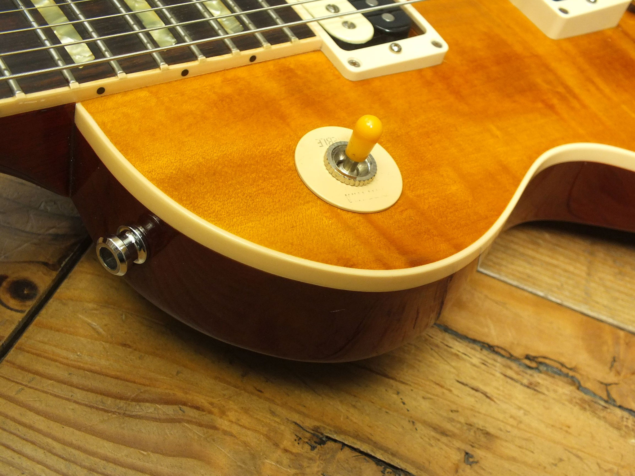 Ergonomischer und etwas flacherer Body mit "Bierbauch" Fräsung, fließendem Hals-Korpus-Übergang und wunderschönem "Flamed Maple Top" im Amber / Lemon Burst Finish.