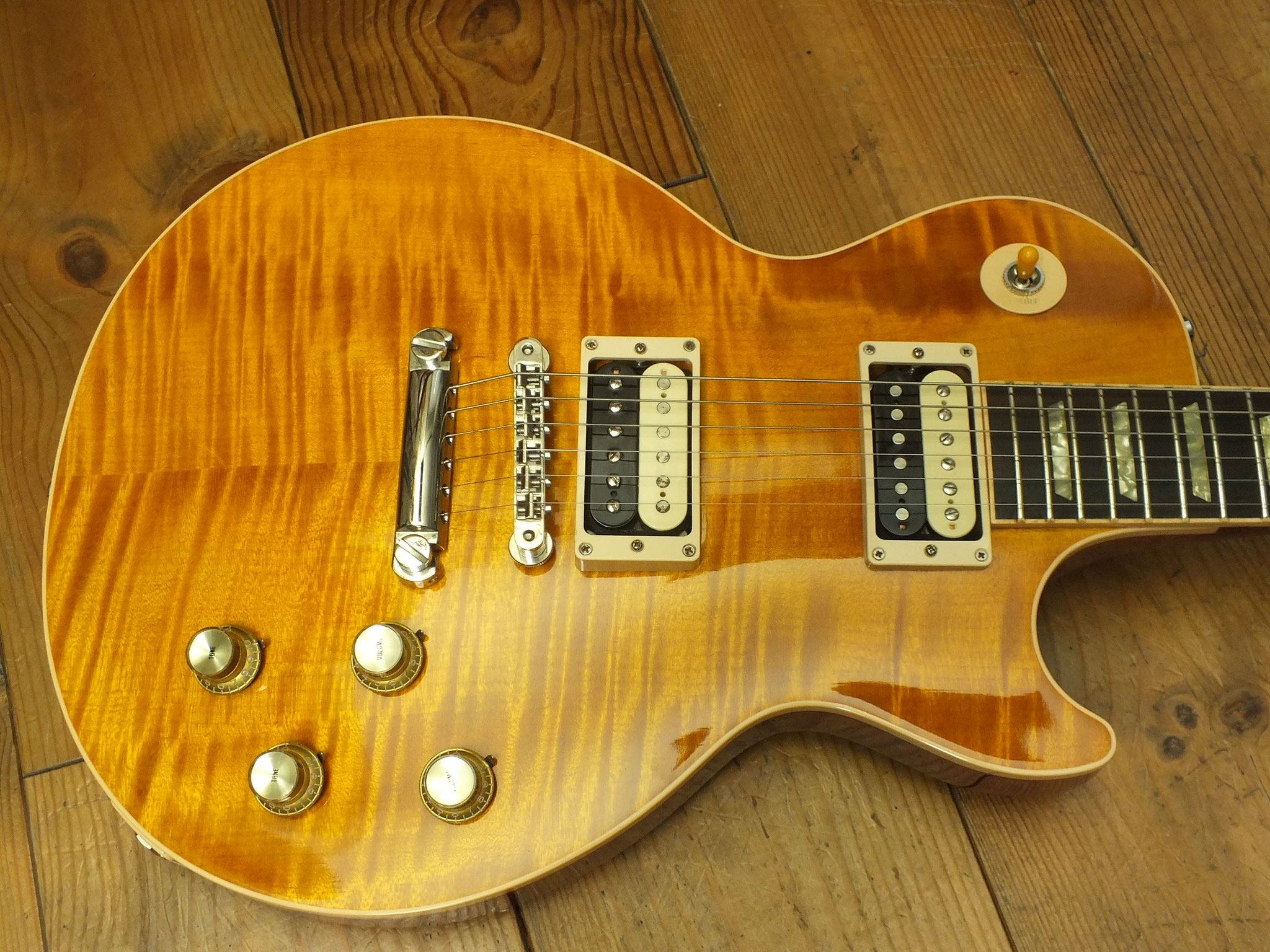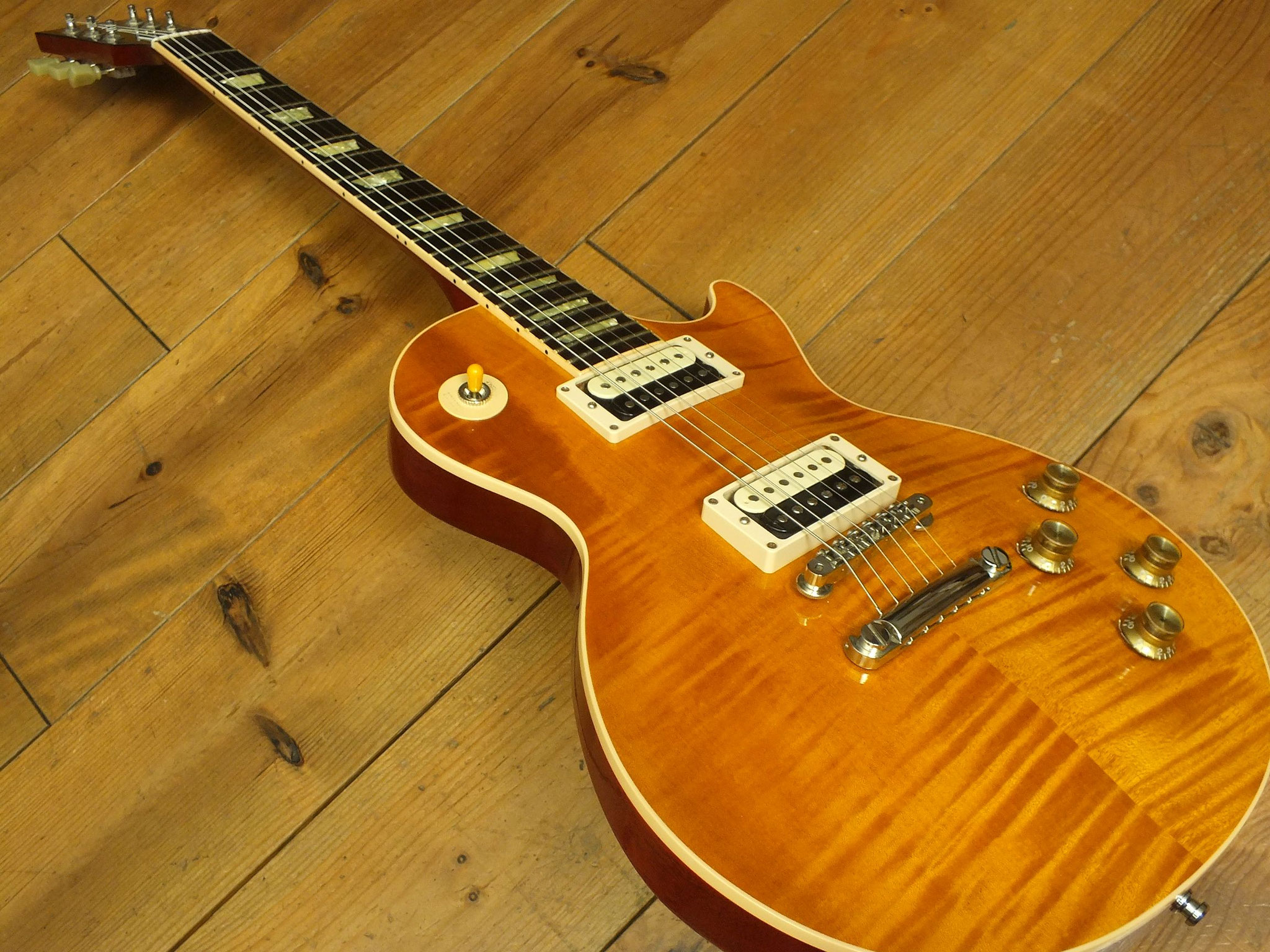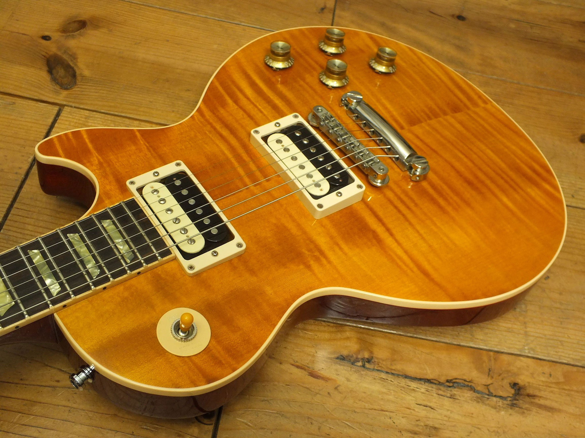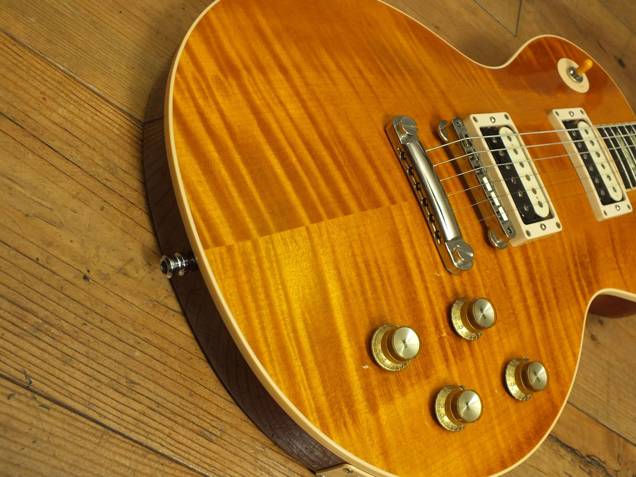 Ergonomischer und etwas flacherer Body mit "Bierbauch" Fräsung, fließendem Hals-Korpus-Übergang und wunderschönem "Flamed Maple Top" im Amber / Lemon Burst Finish.