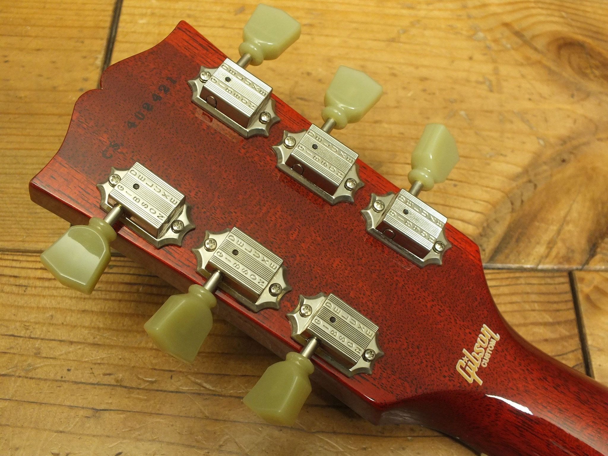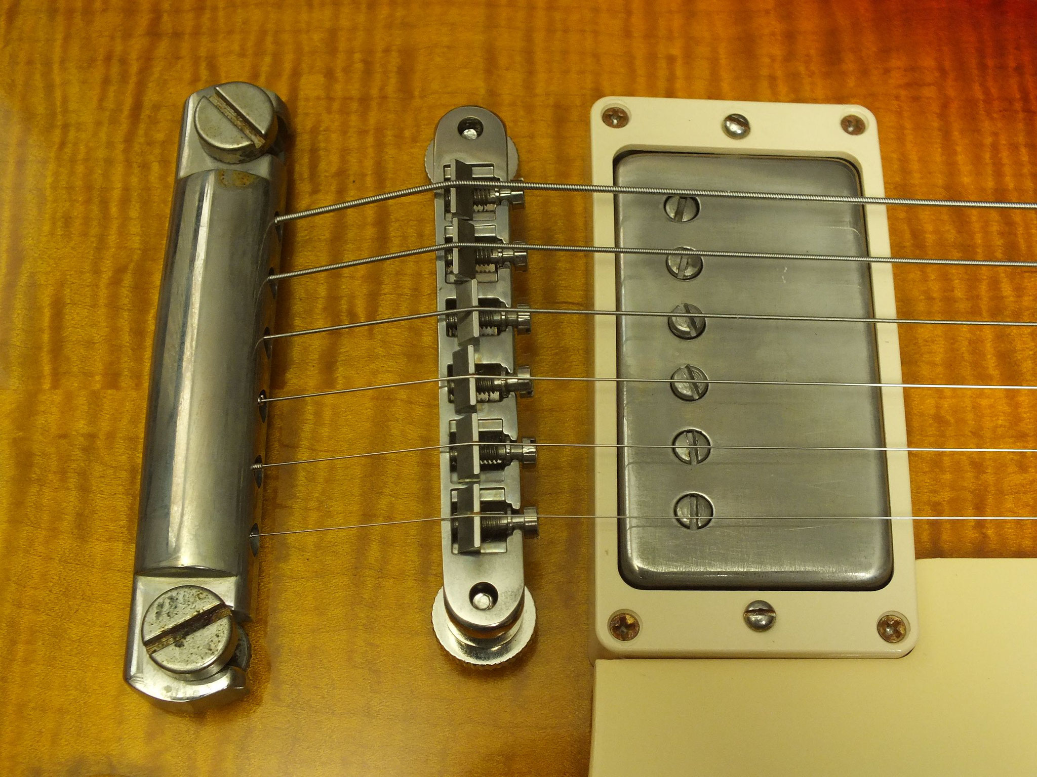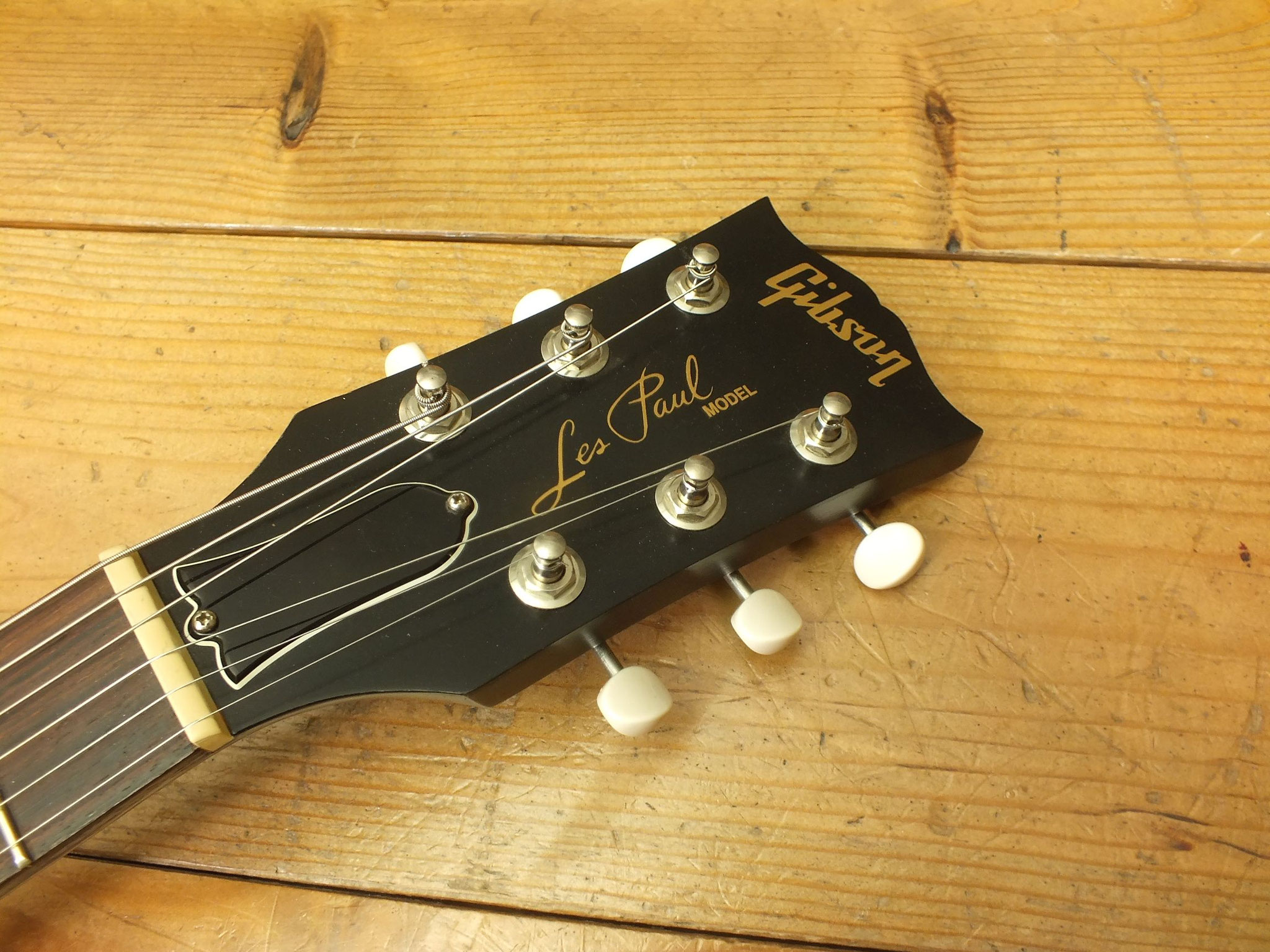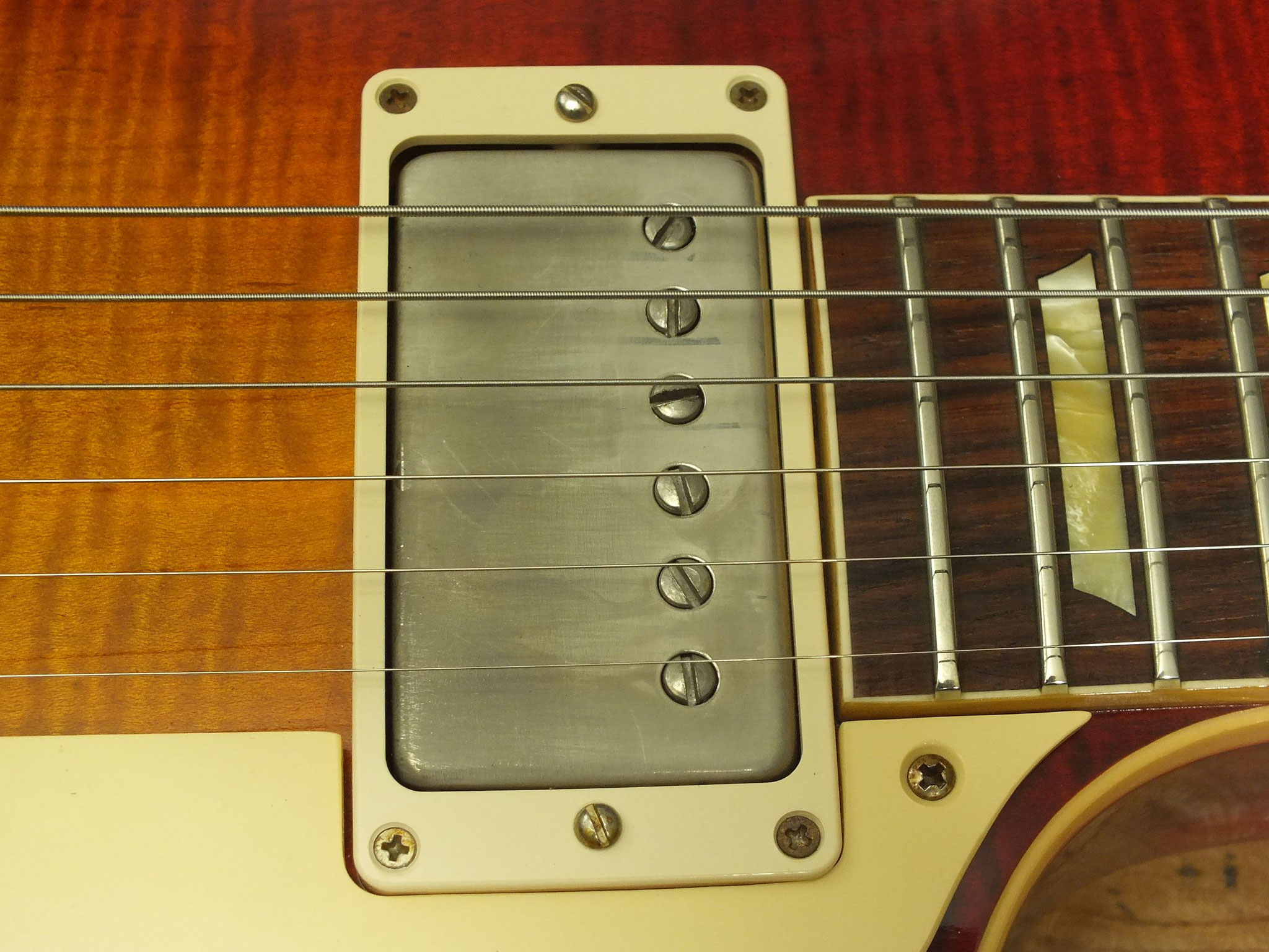 Bestückt mit Gibson Burstbucker Humbucker-Pickups. Die Tonabnehmer sind ebenso wie die Hardware ab Werk geaged. Der Vorbesitzer hatte diese Gitarre übrigens mit mal anderen Pickups bestückt. Nun sind die Originalen wieder verbaut.