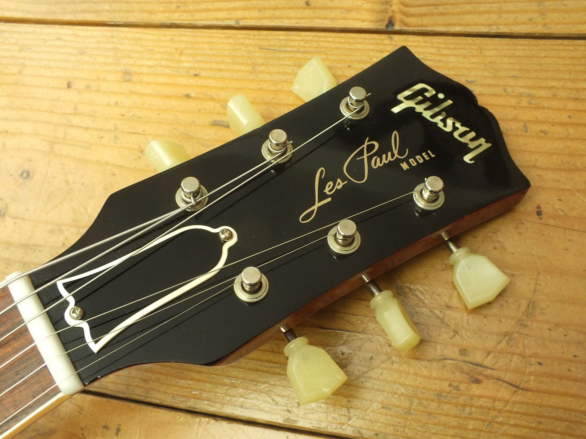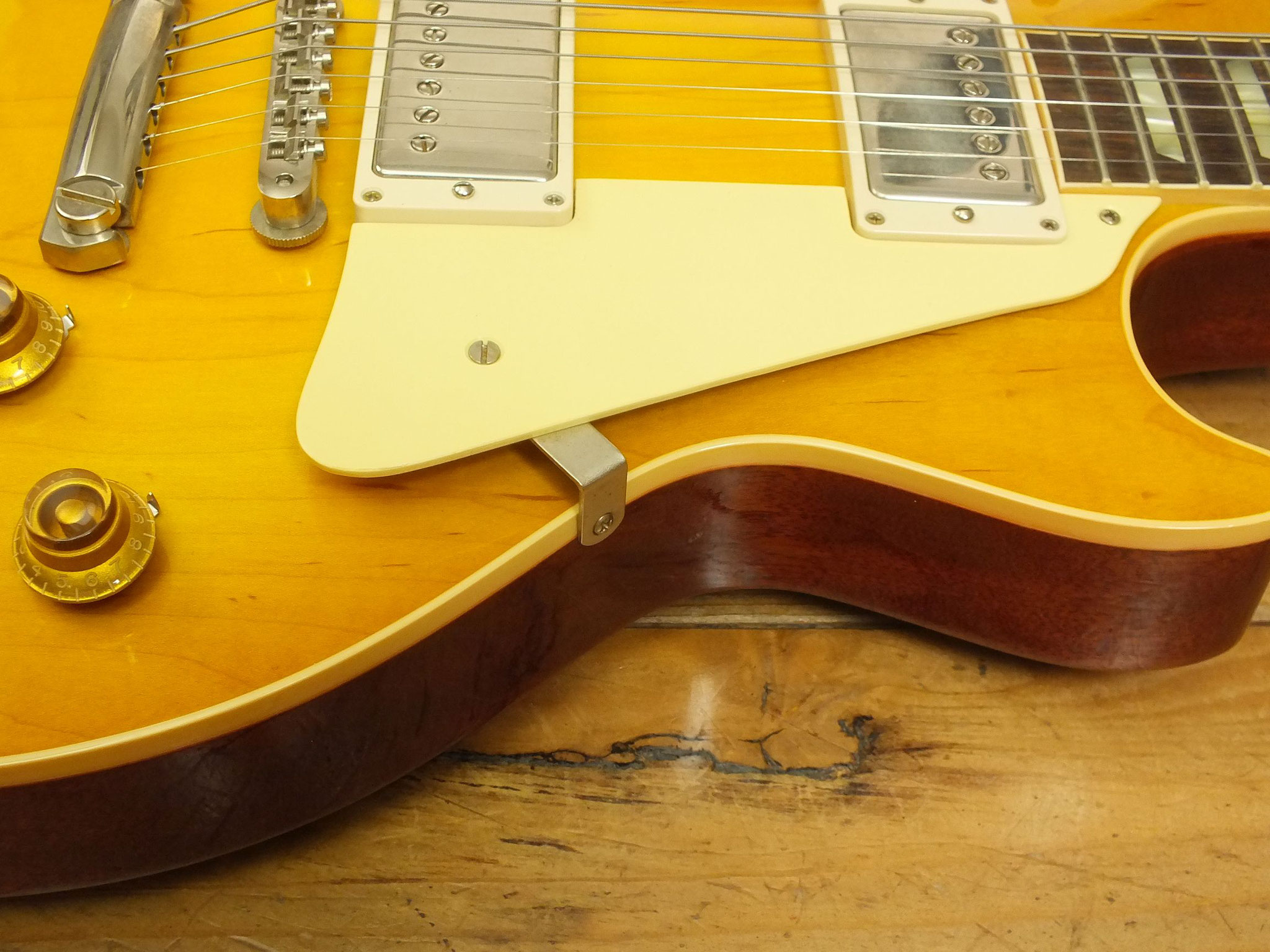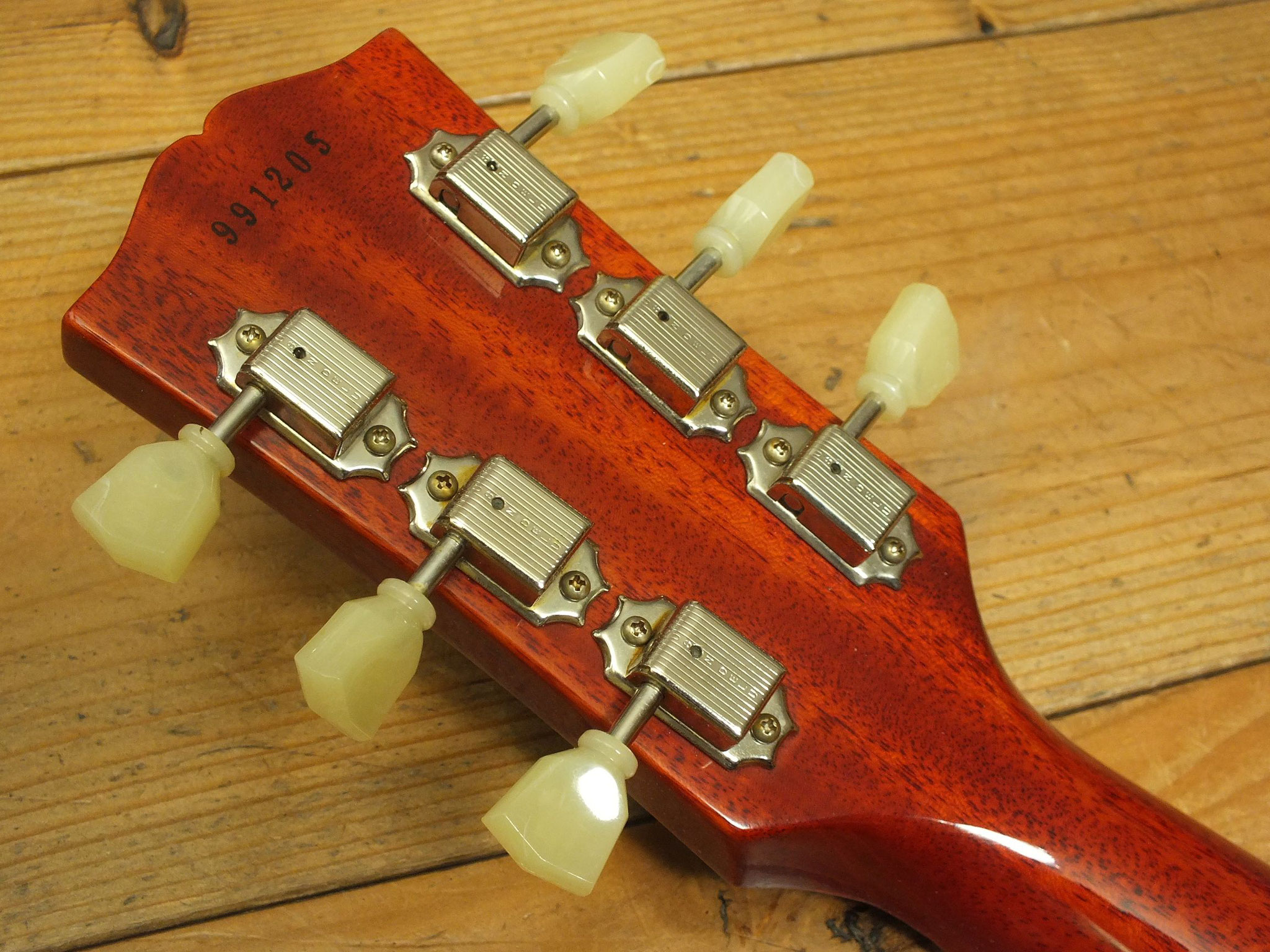 Bestückt mit Gibson Burstbucker Humbucker-Pickups. Die Tonabnehmer sind ebenso wie die Hardware ab Werk geaged. Der Vorbesitzer hatte diese Gitarre übrigens mit mal anderen Pickups bestückt. Nun sind die Originalen wieder verbaut.