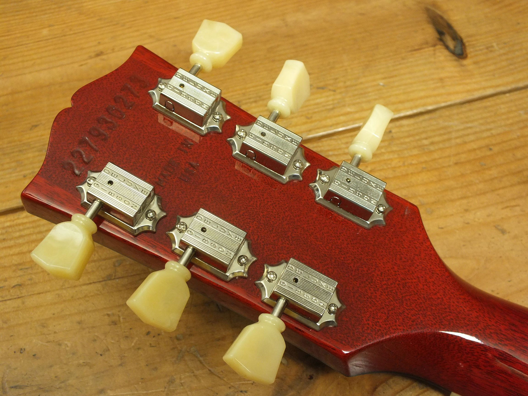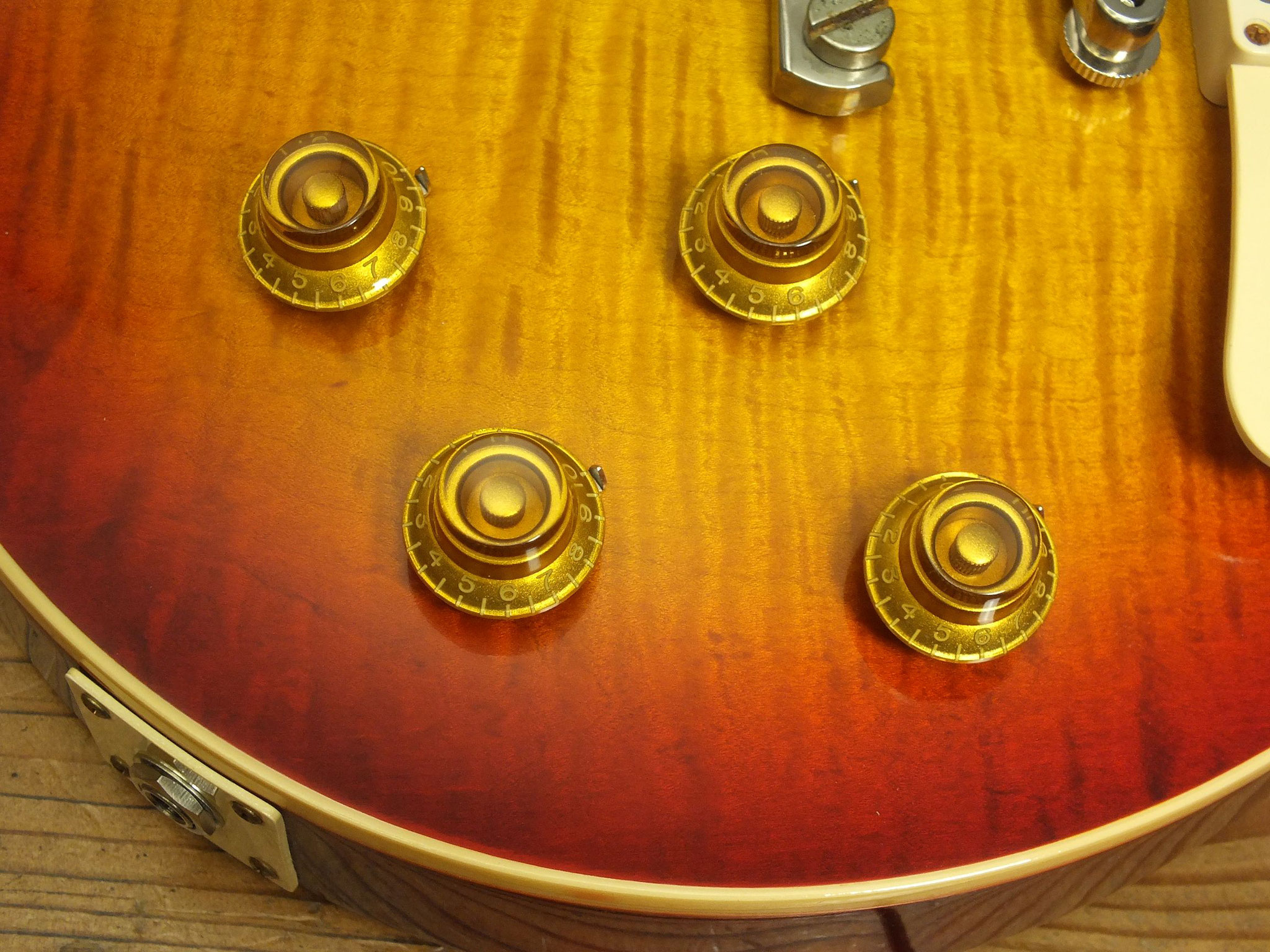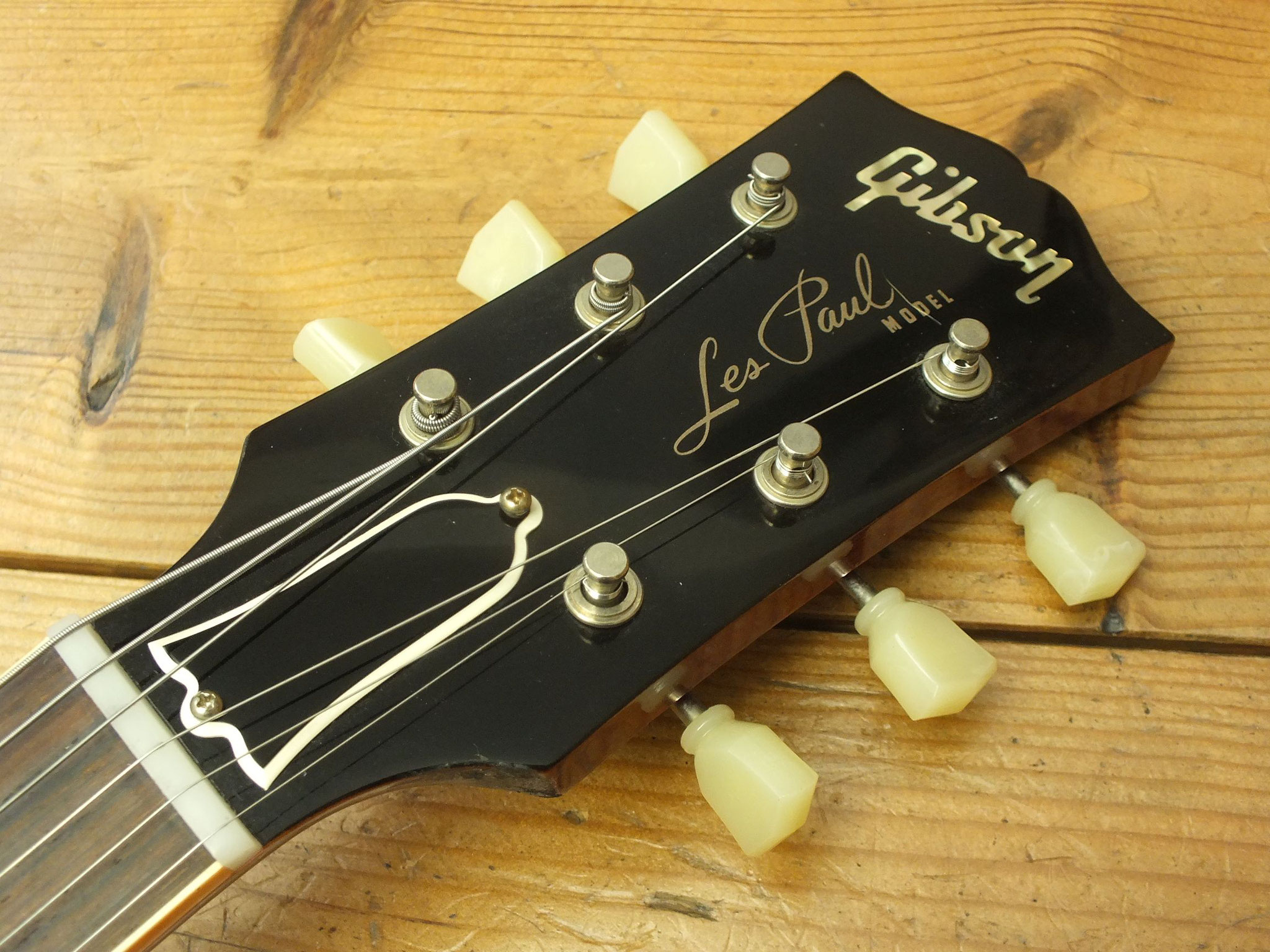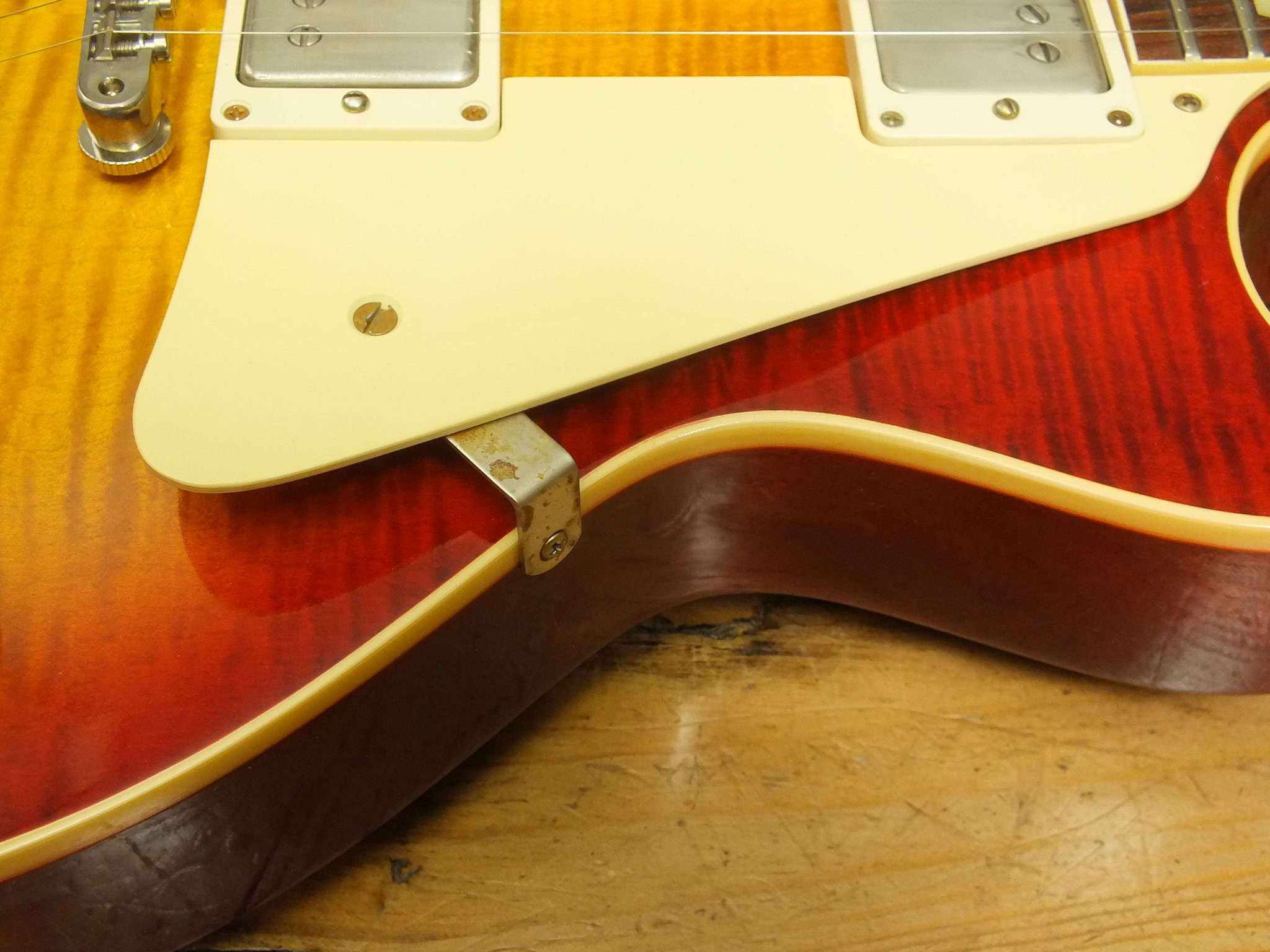 Bestückt mit Gibson Burstbucker Humbucker-Pickups. Die Tonabnehmer sind ebenso wie die Hardware ab Werk geaged. Der Vorbesitzer hatte diese Gitarre übrigens mit mal anderen Pickups bestückt. Nun sind die Originalen wieder verbaut.