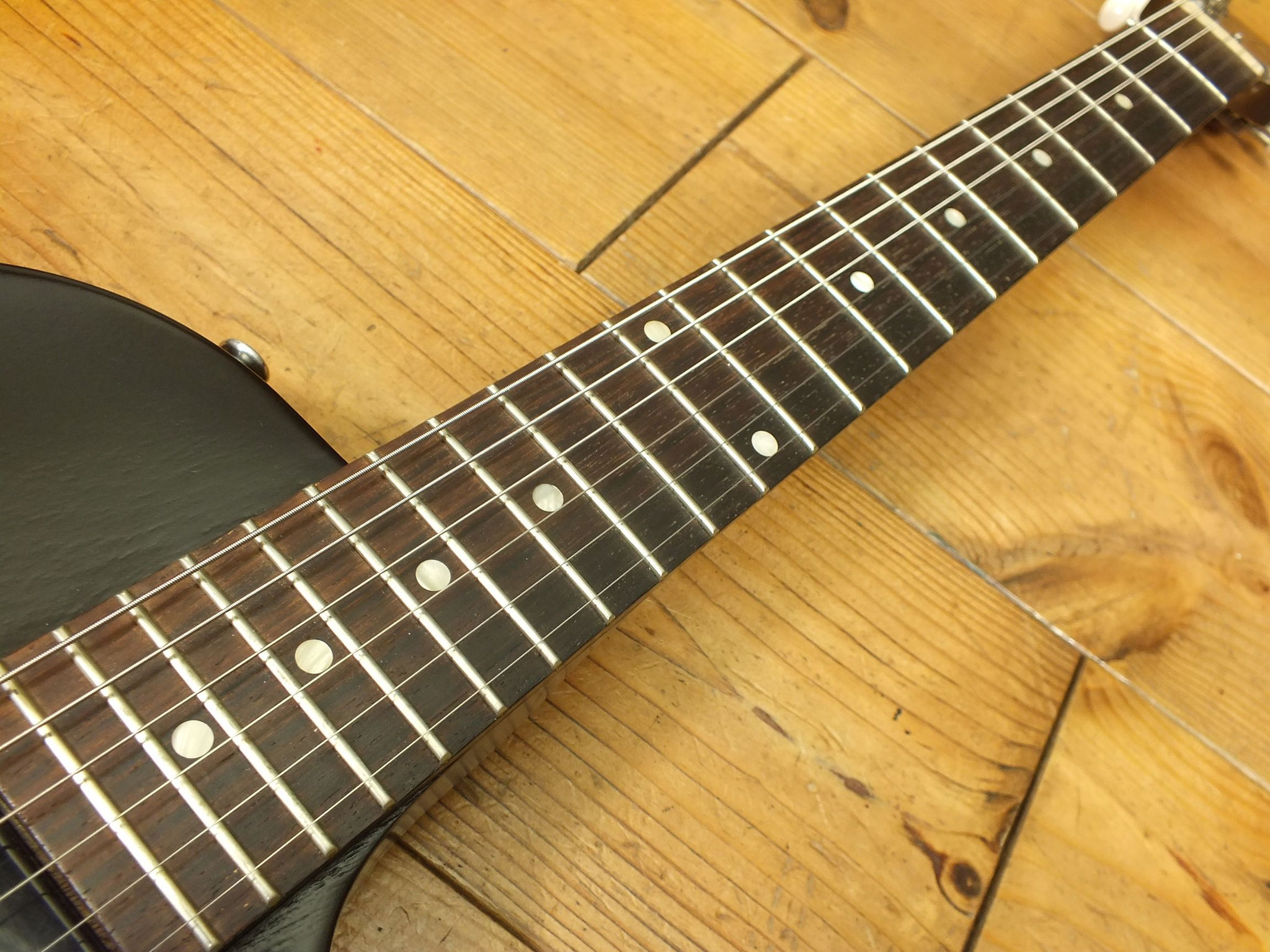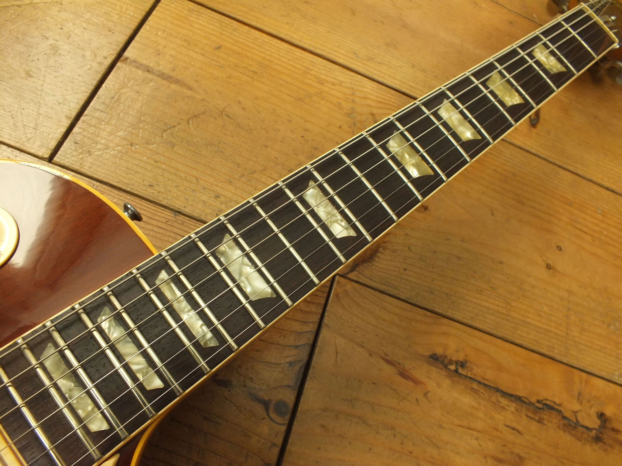 Mahagoni-Hals (eher flaches 50s Profil - gefühlt fast schon ein 60s Neck) mit Palisander-Griffbrett (12" Radius), 22 Jumbo-Bünden und Vintage Style Gibson Deluxe Tuners. Die Les Paul wurde absolut perfekt vom renommierten Gitarrenbauer Mathias Schindehütte neu bundiert. Spielt unglaublich gut.
