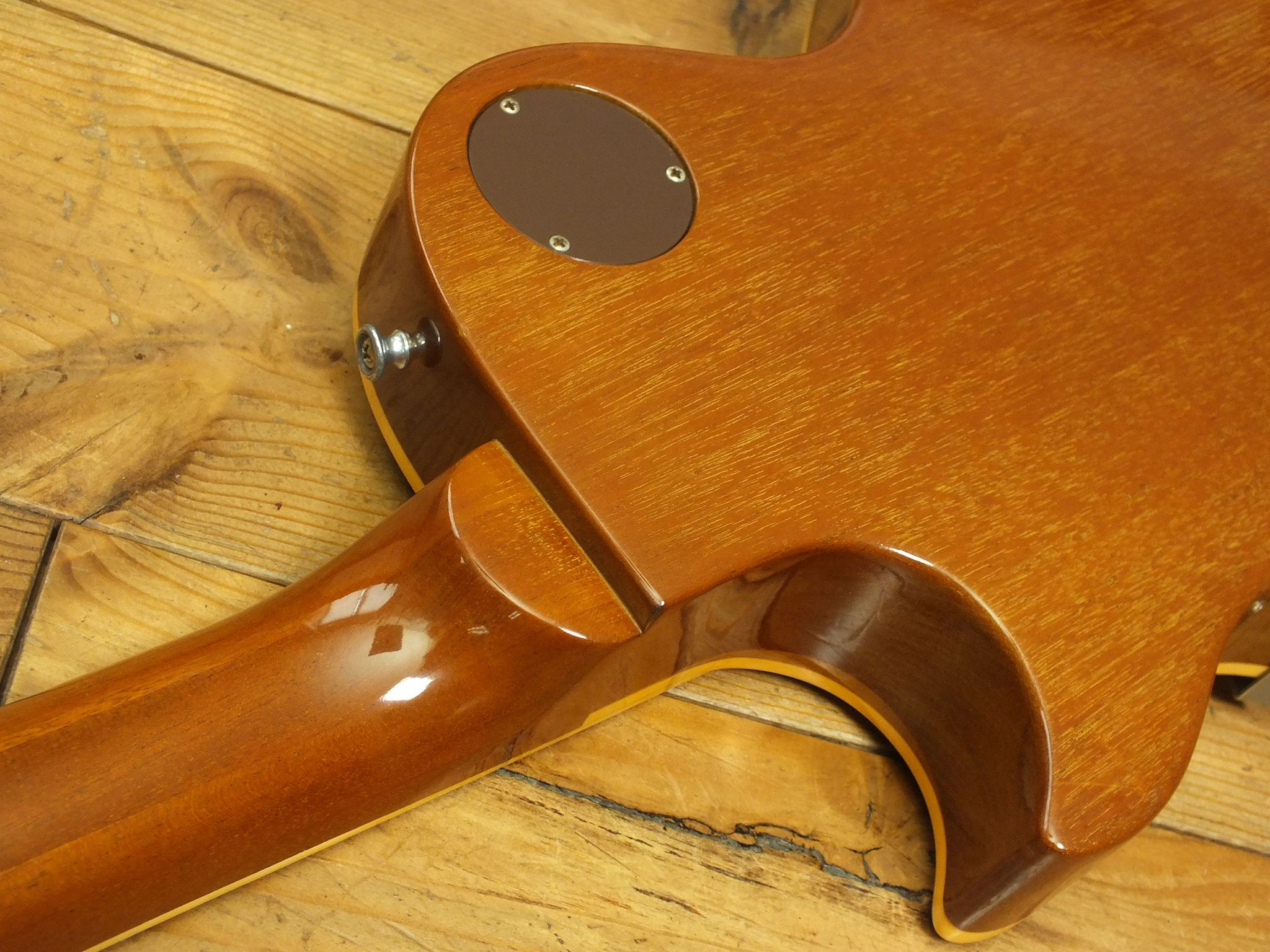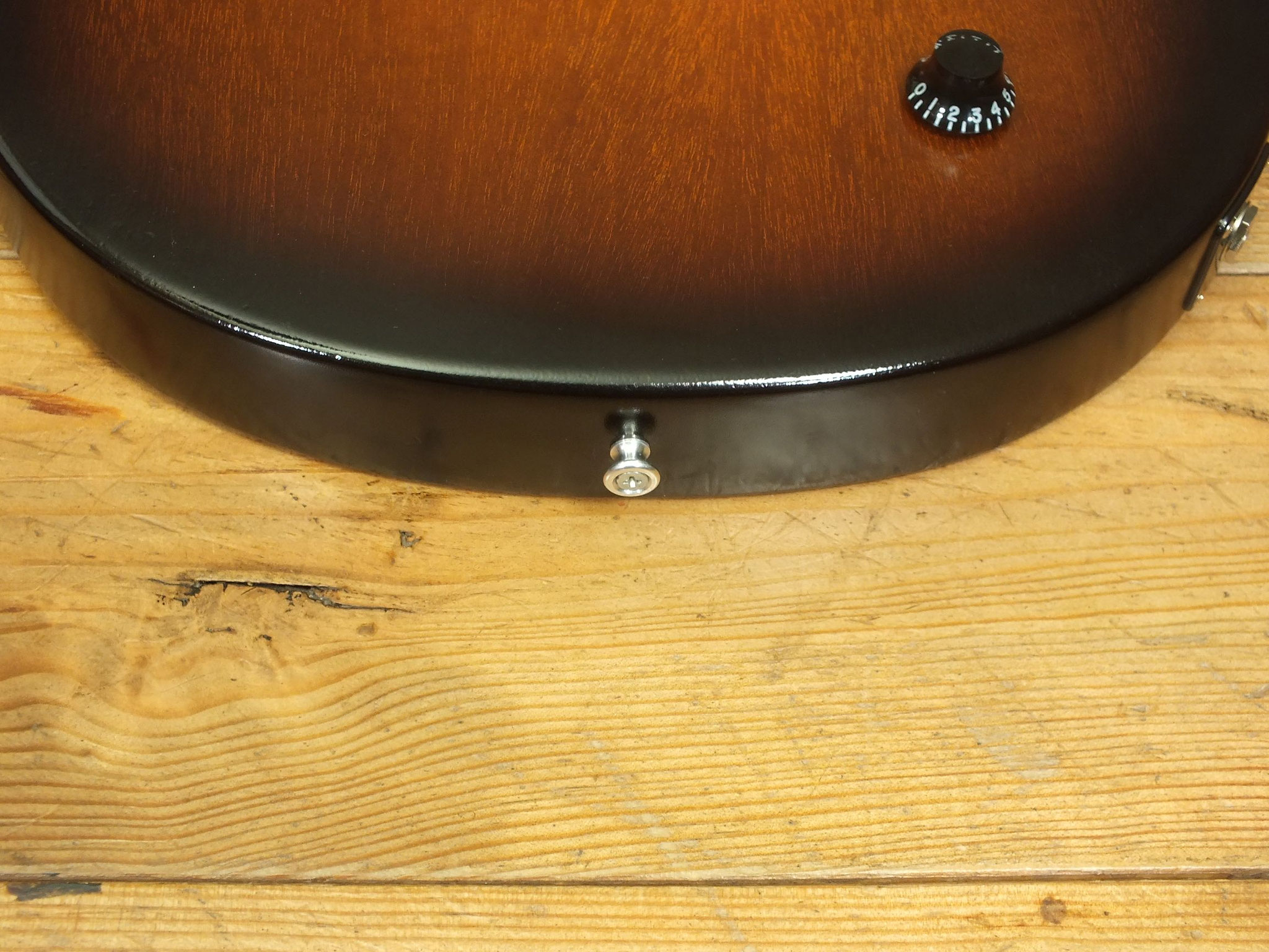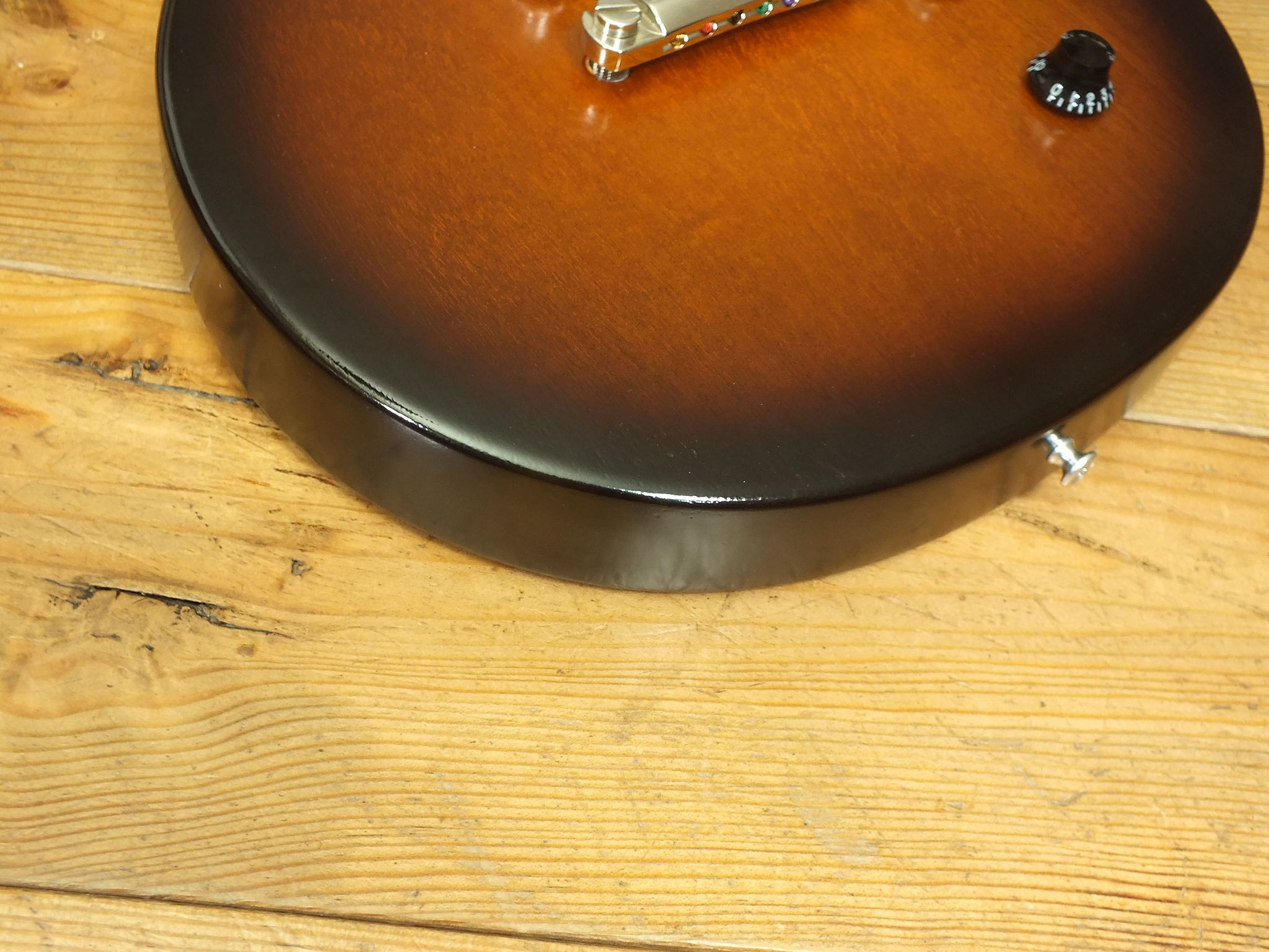 Massiver Mahagoni-Body mit gewölbter Ahorn-Decke in einem recht interessanten "Sunburst Finish" mit rötlich brauner Färbung.