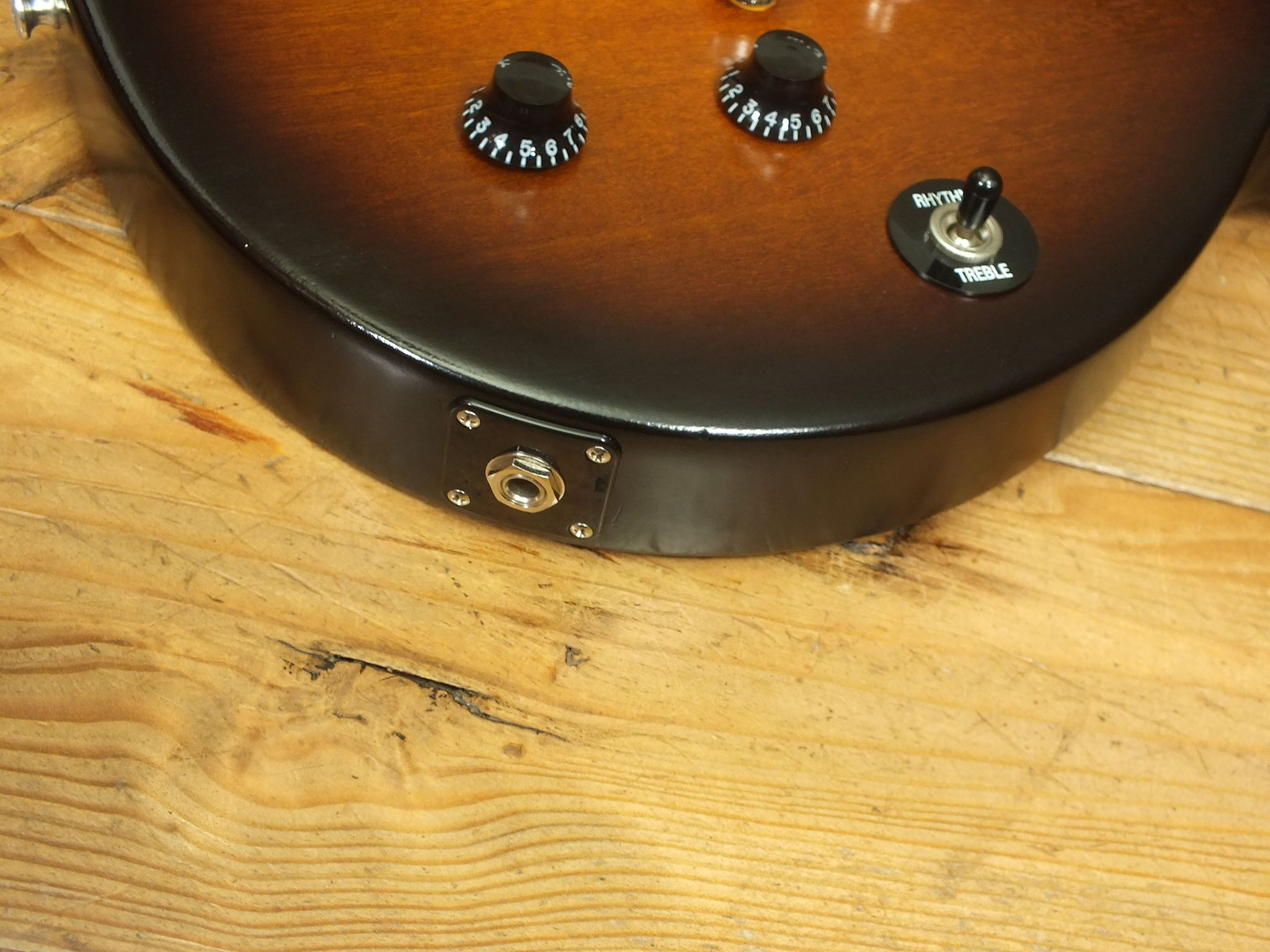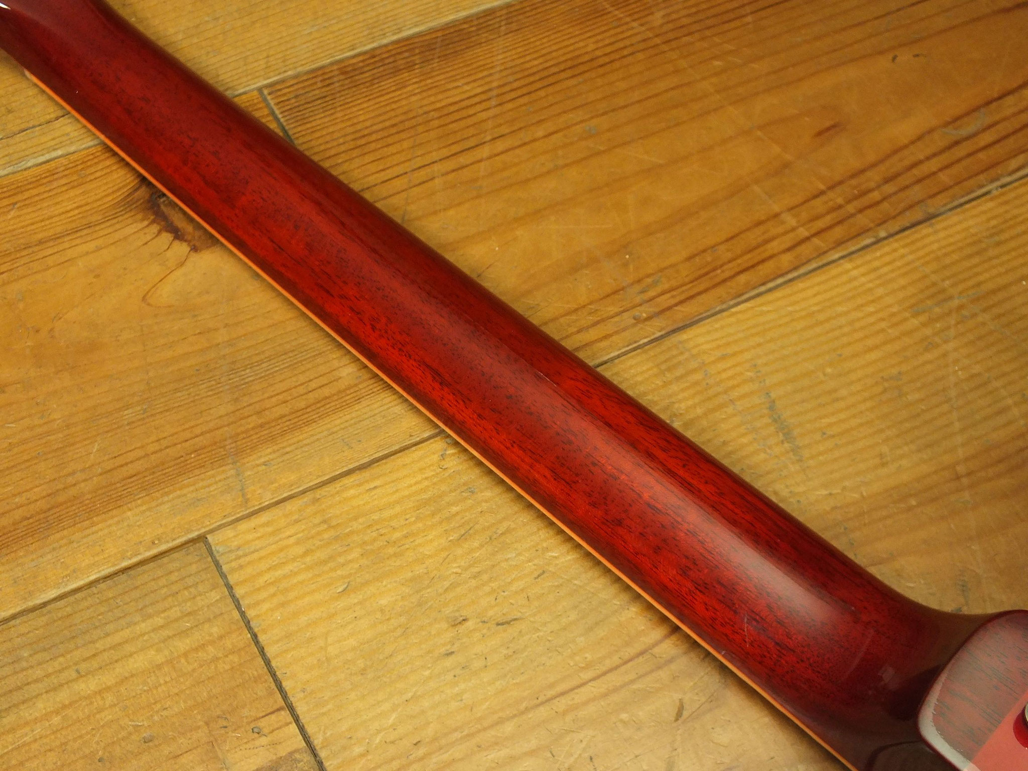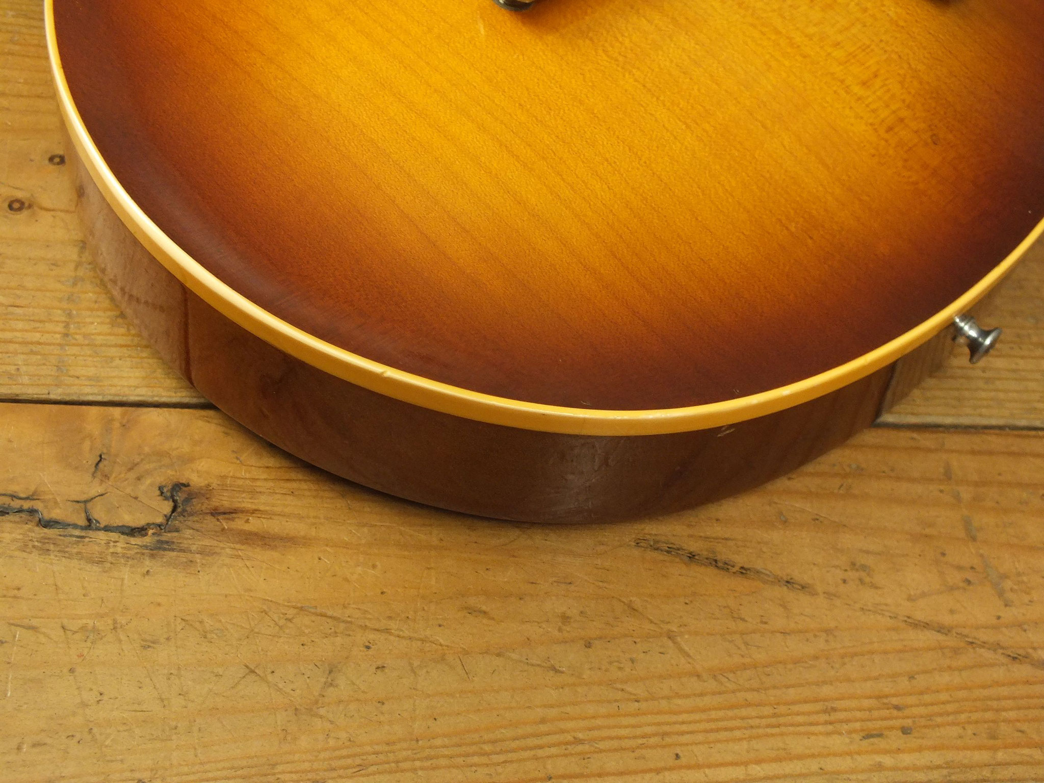 Massiver Mahagoni-Body mit gewölbter Ahorn-Decke in einem recht interessanten "Sunburst Finish" mit rötlich brauner Färbung.