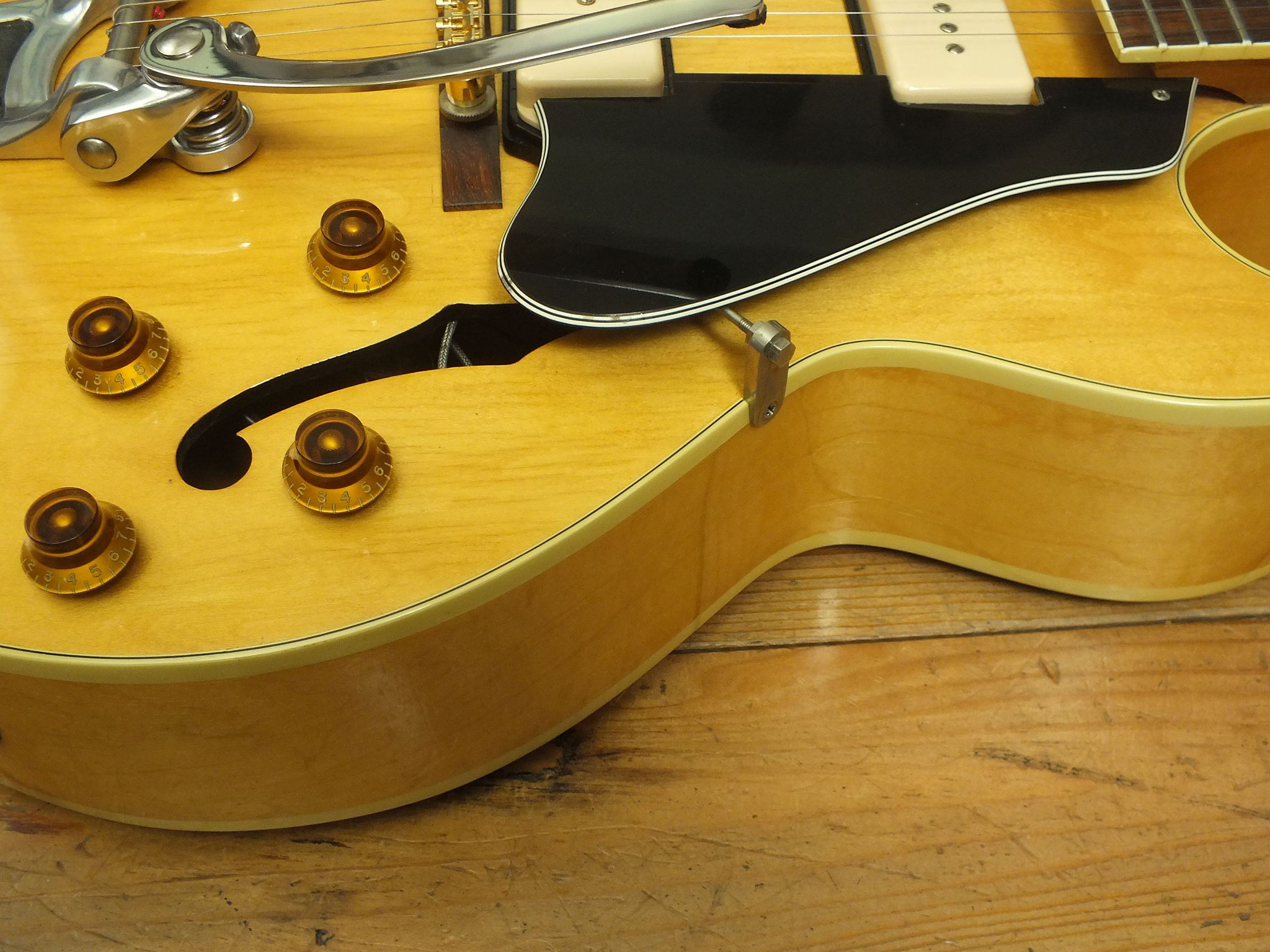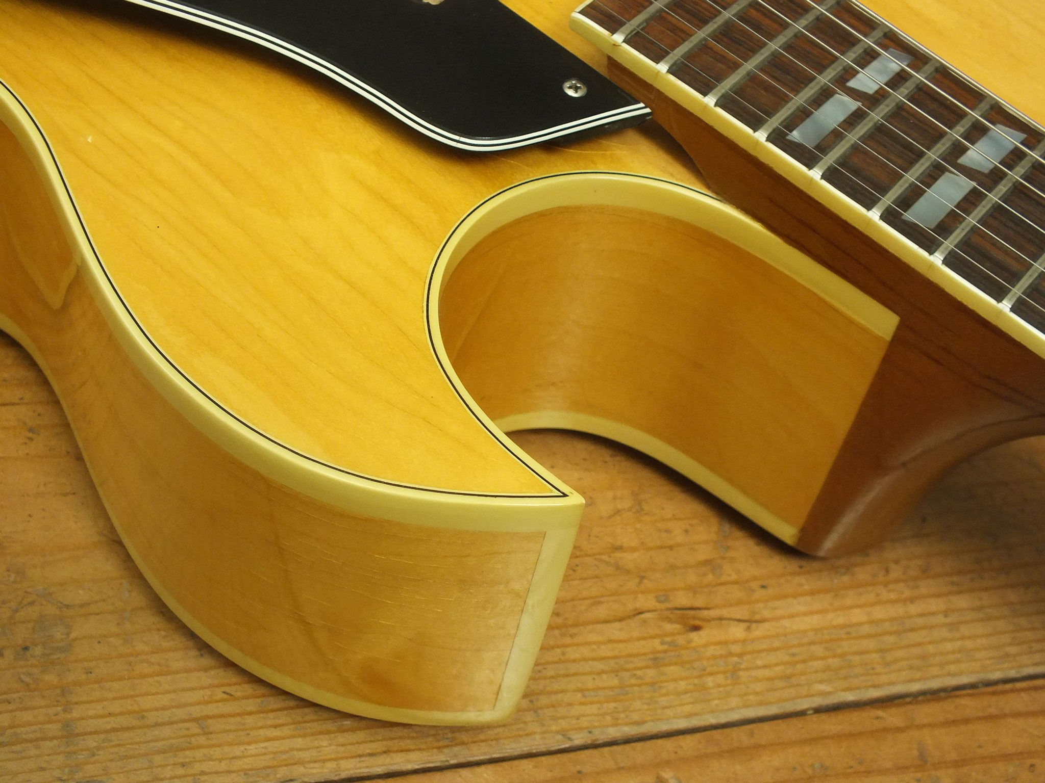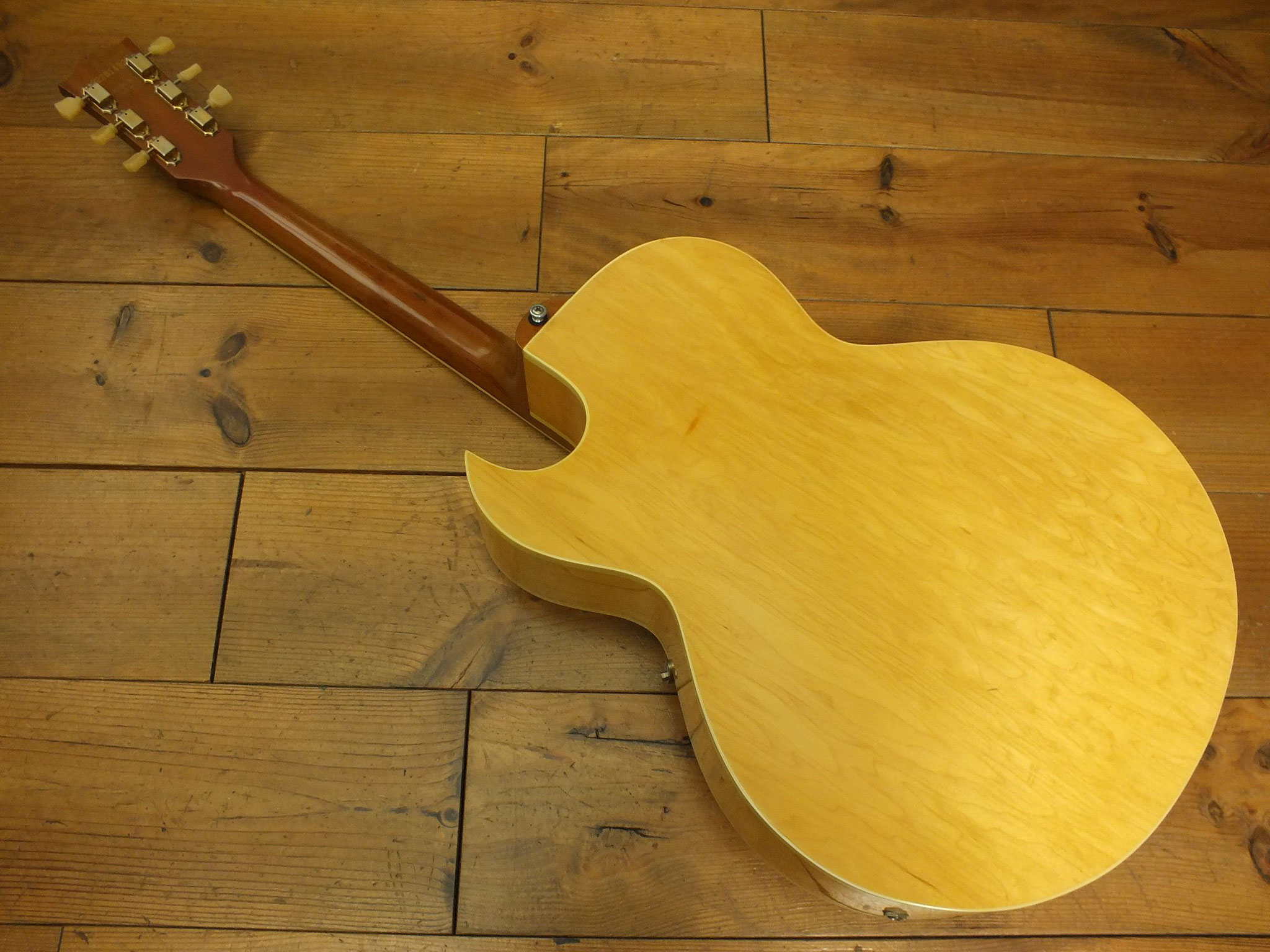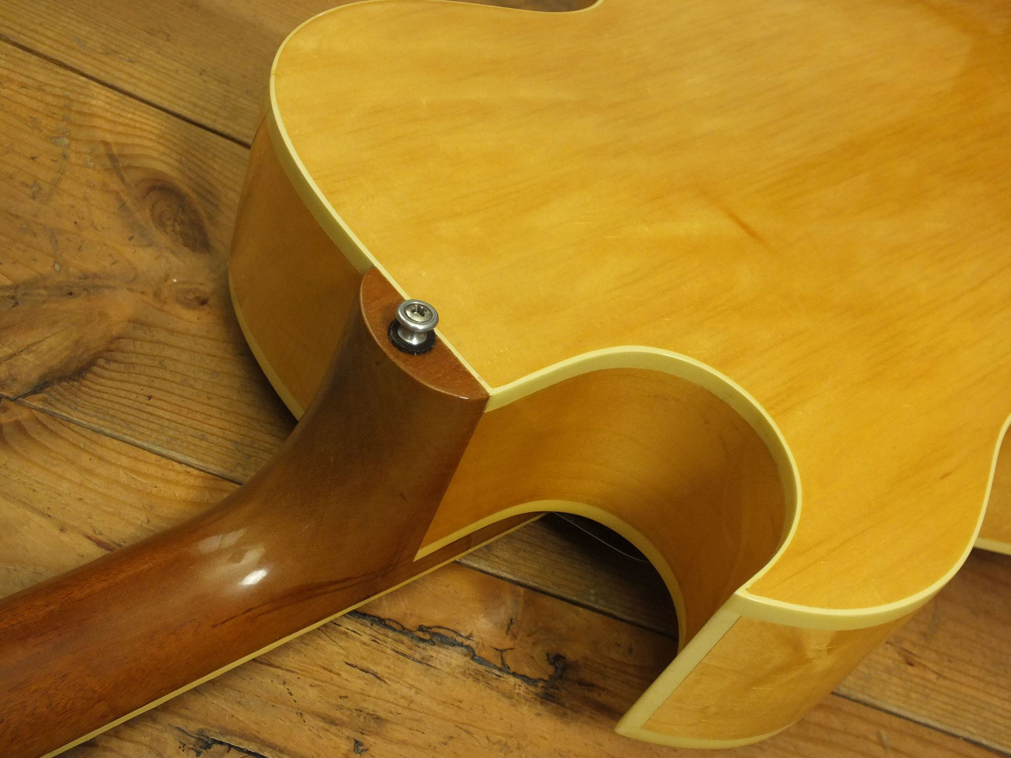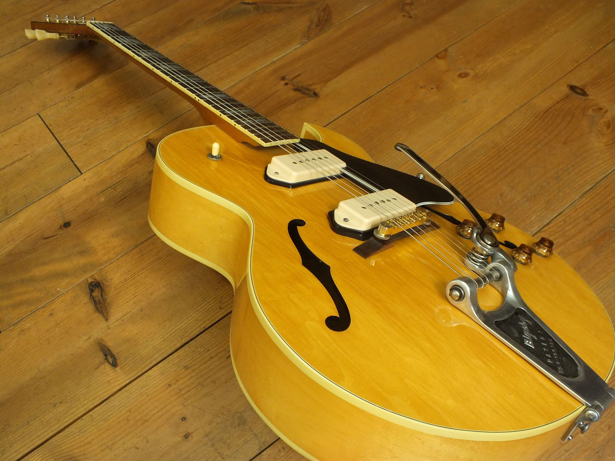 Vollakustik Korpus aus Ahorn mit Florentinischem Cutaway und Bigsby-Tremolo.
