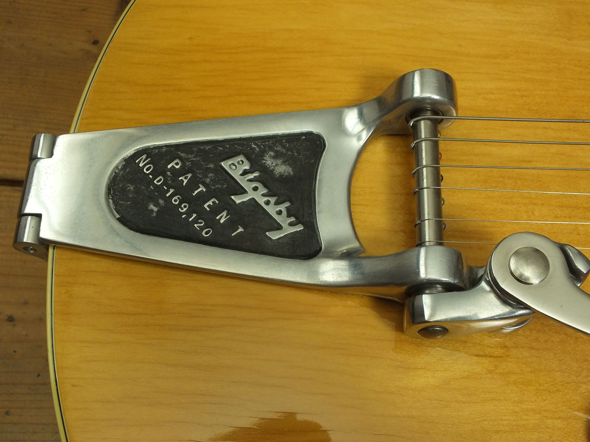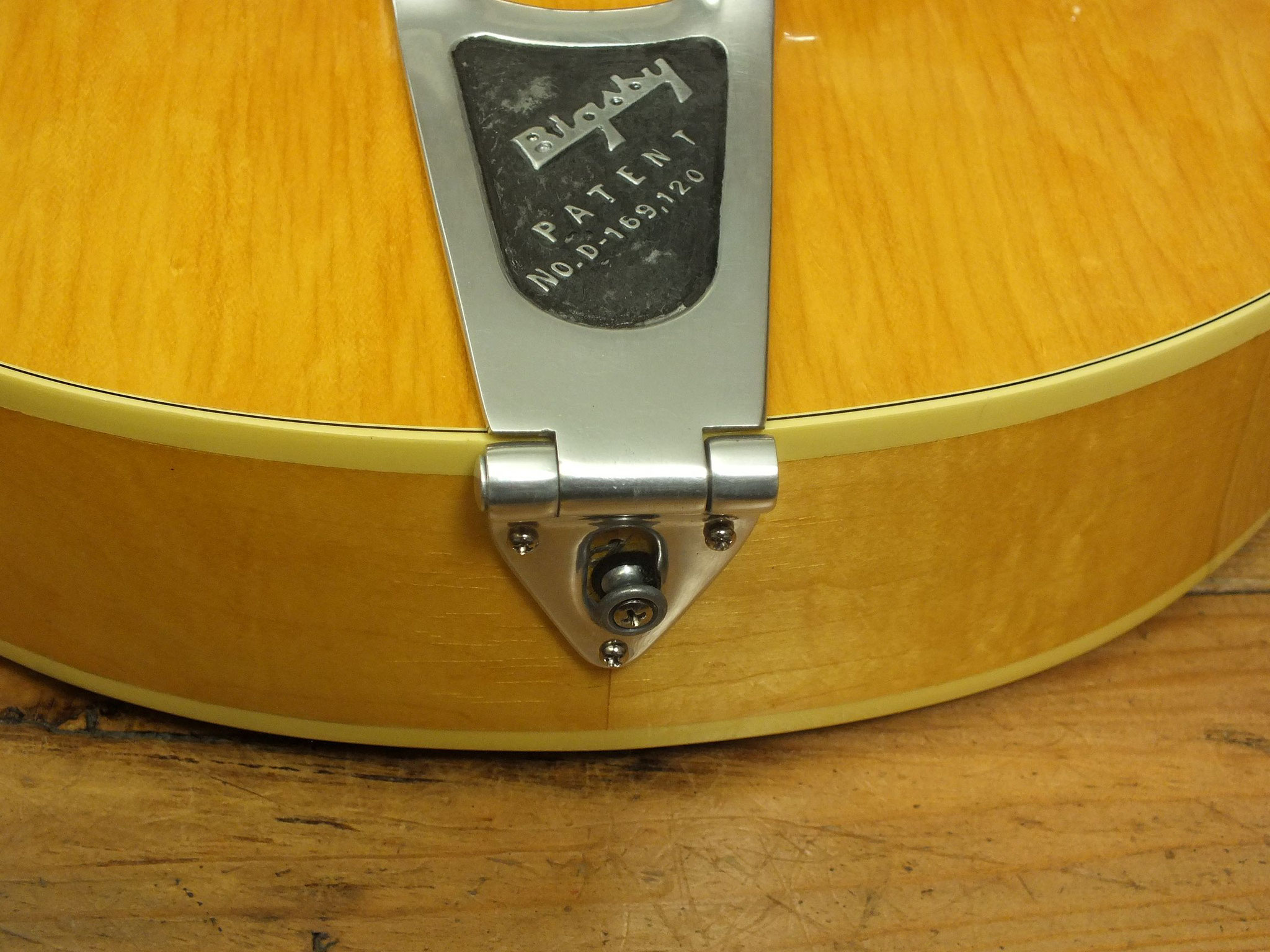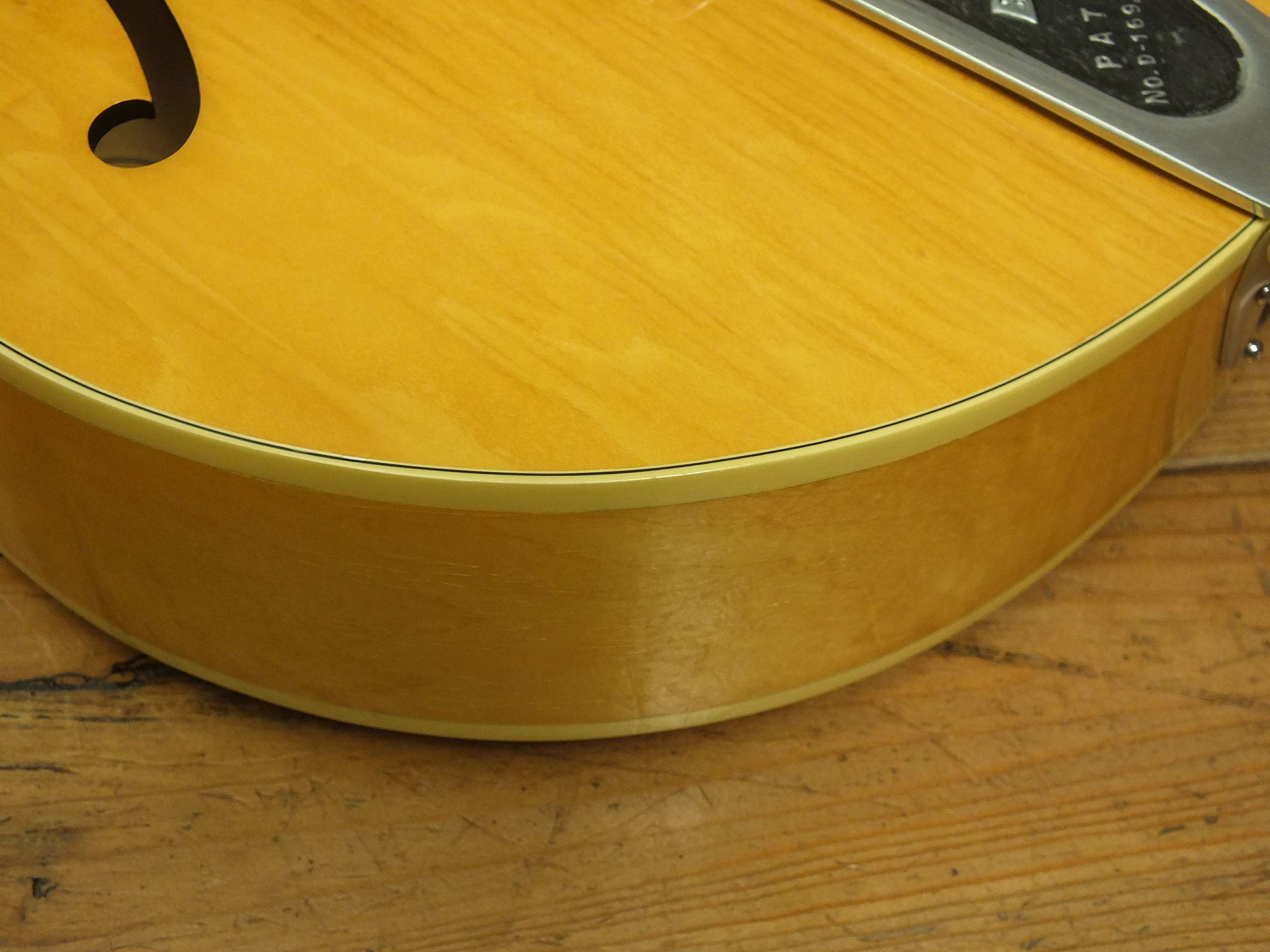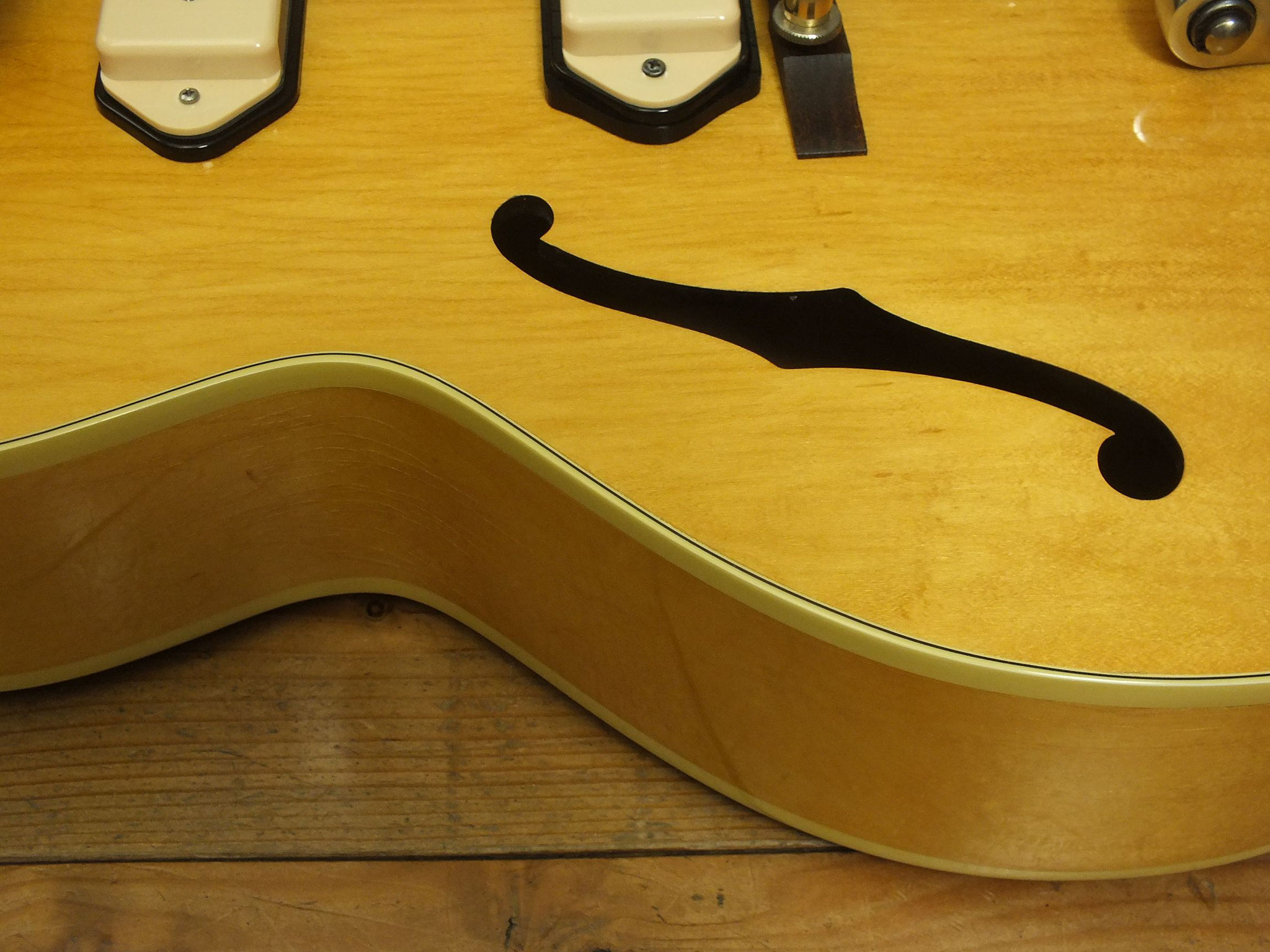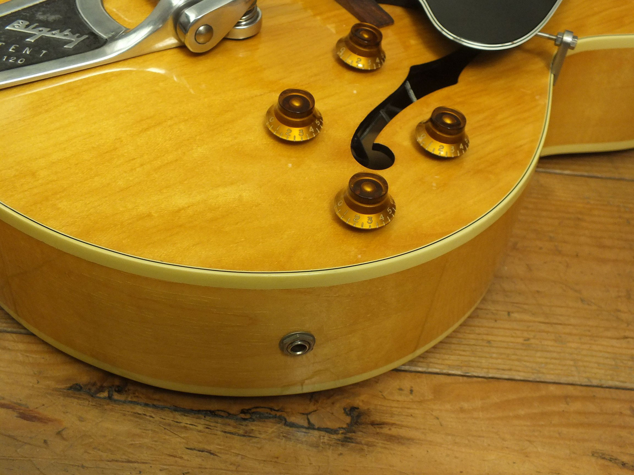 Vollakustik Korpus aus Ahorn mit Florentinischem Cutaway und Bigsby-Tremolo.