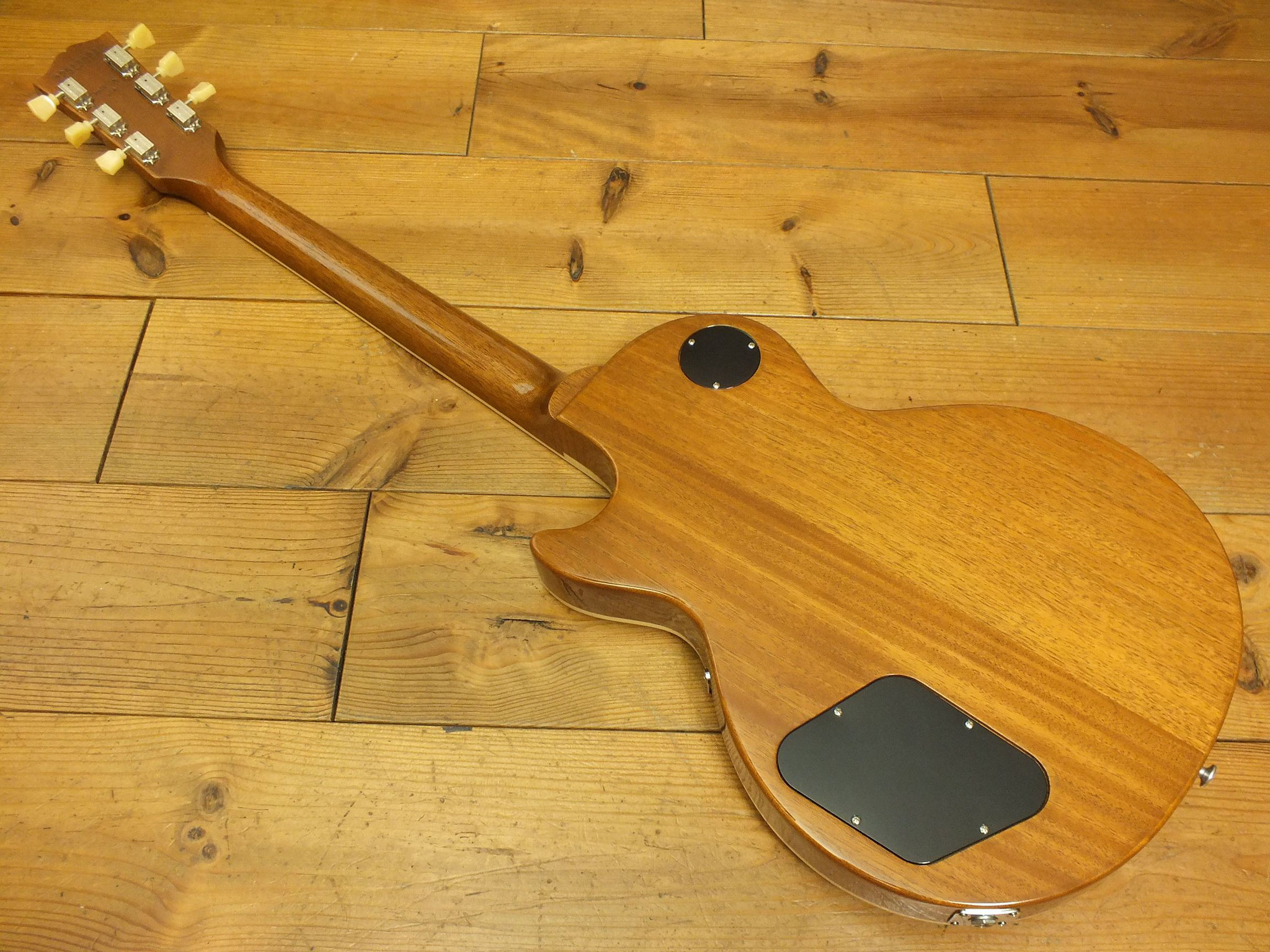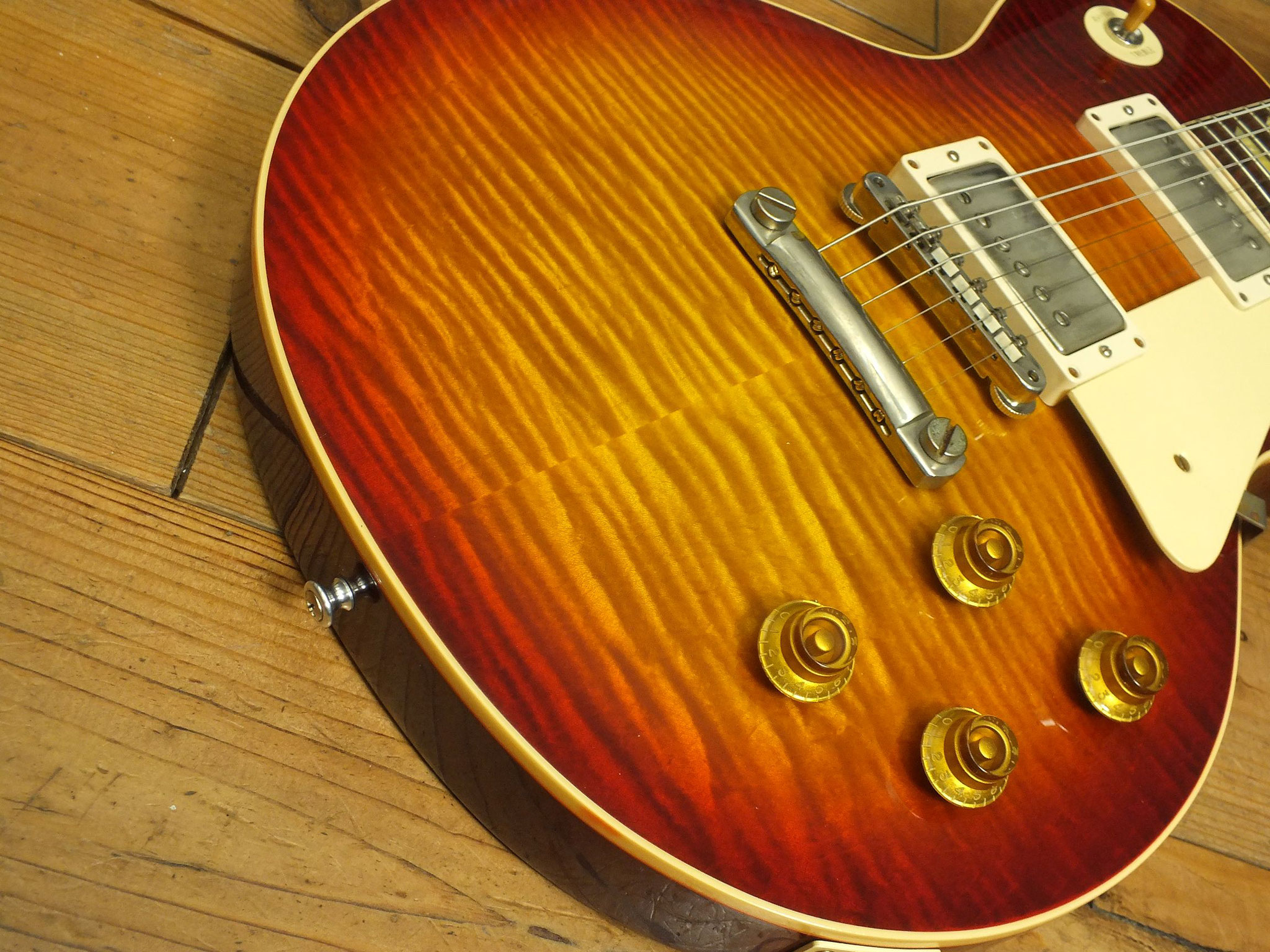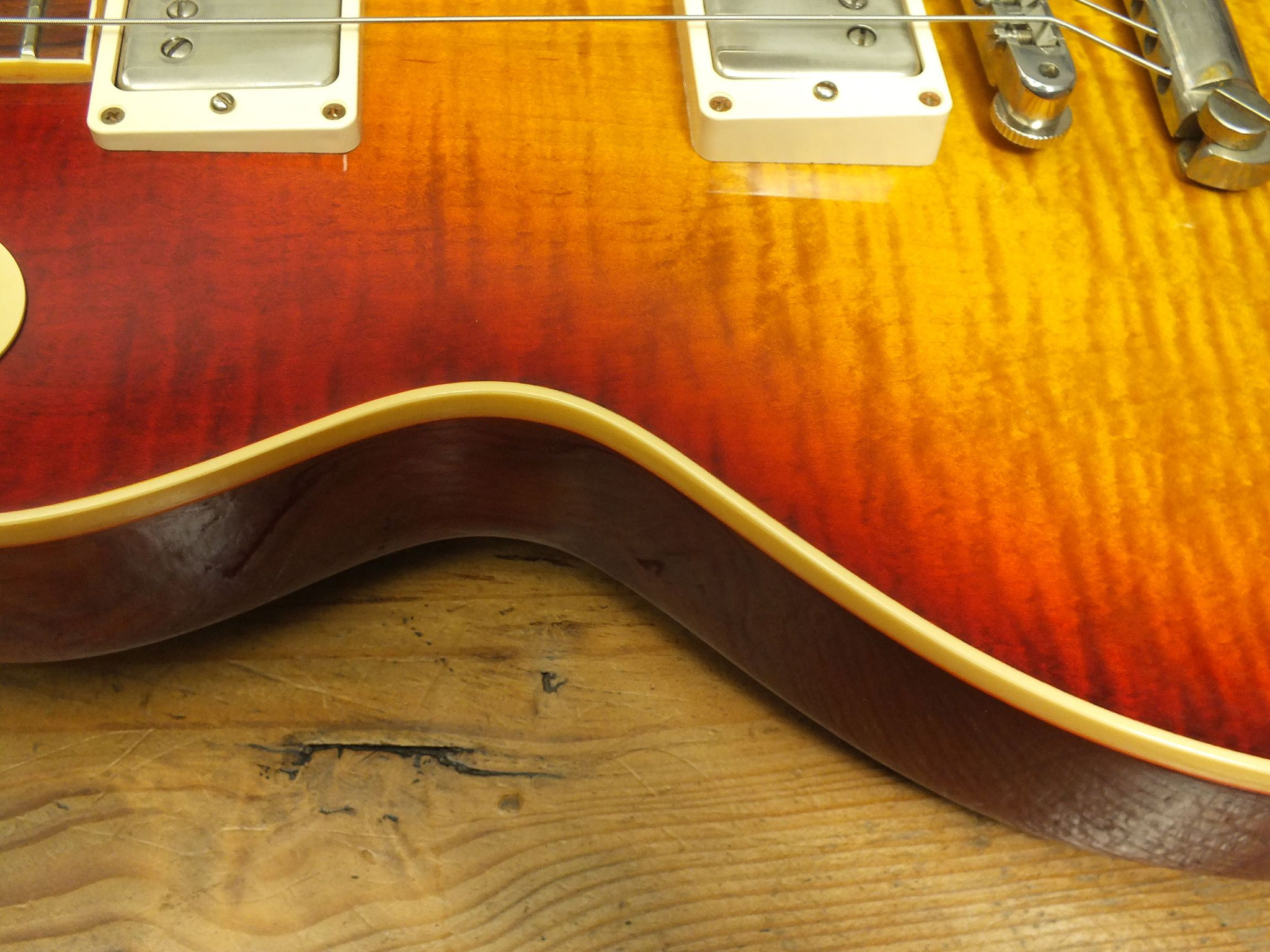 Einteiliger Mahagoni-Body mit unglaublich schönem Flame Top im "Factory Burst" Nitrocellulose Finish - also genau die Farbgebung, in der Gibson das mittlerweile wohl begehrteste Gitarrenmodell auf dem Globus im Jahr 1959 ausgeliefert hat.