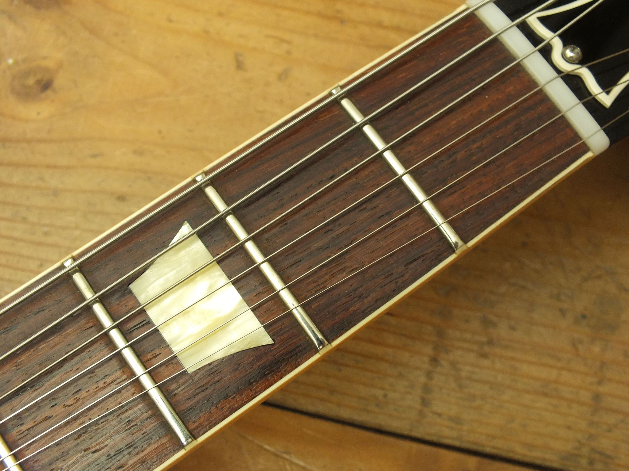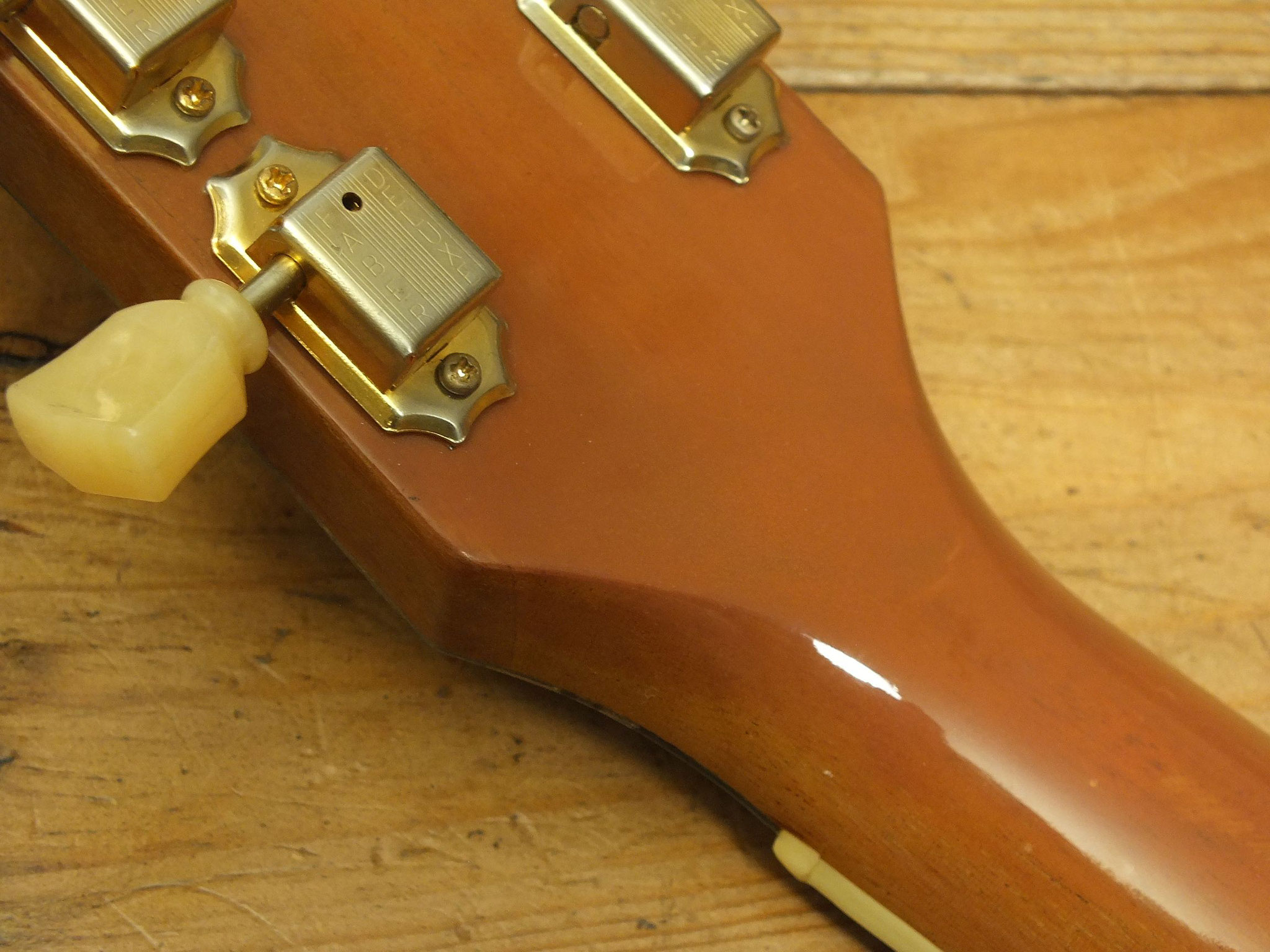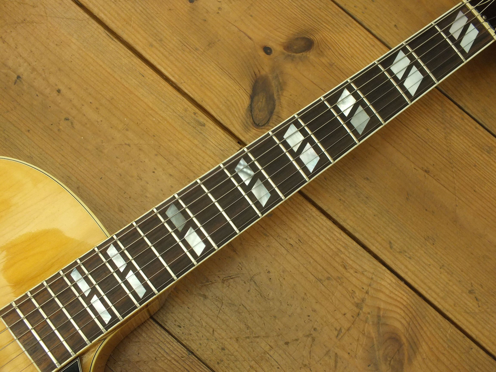 Dem Alter entsprechend guter Gebraucht-Zustand - siehe Bilder. Allerdings gibt es einen sehr professionell reparierten Halsbruch, was hier im Preis berücksichtigt wurde (siehe Detailbild). Natürlich ist alles absolut stabil, und die Reparaturstelle ist beim Spielen nicht spürbar. Die vergoldeten Tuner sind nicht original, sondern stammen von Faber. Die vergoldete Tune-O-Matic Bridge ist eine Gibson ABR-1. Ob sie original ist oder nachgerüstet wurde, ist unbekannt. Das Pickguard wurde wahrscheinlich irgendwann mal nachgerüstet.