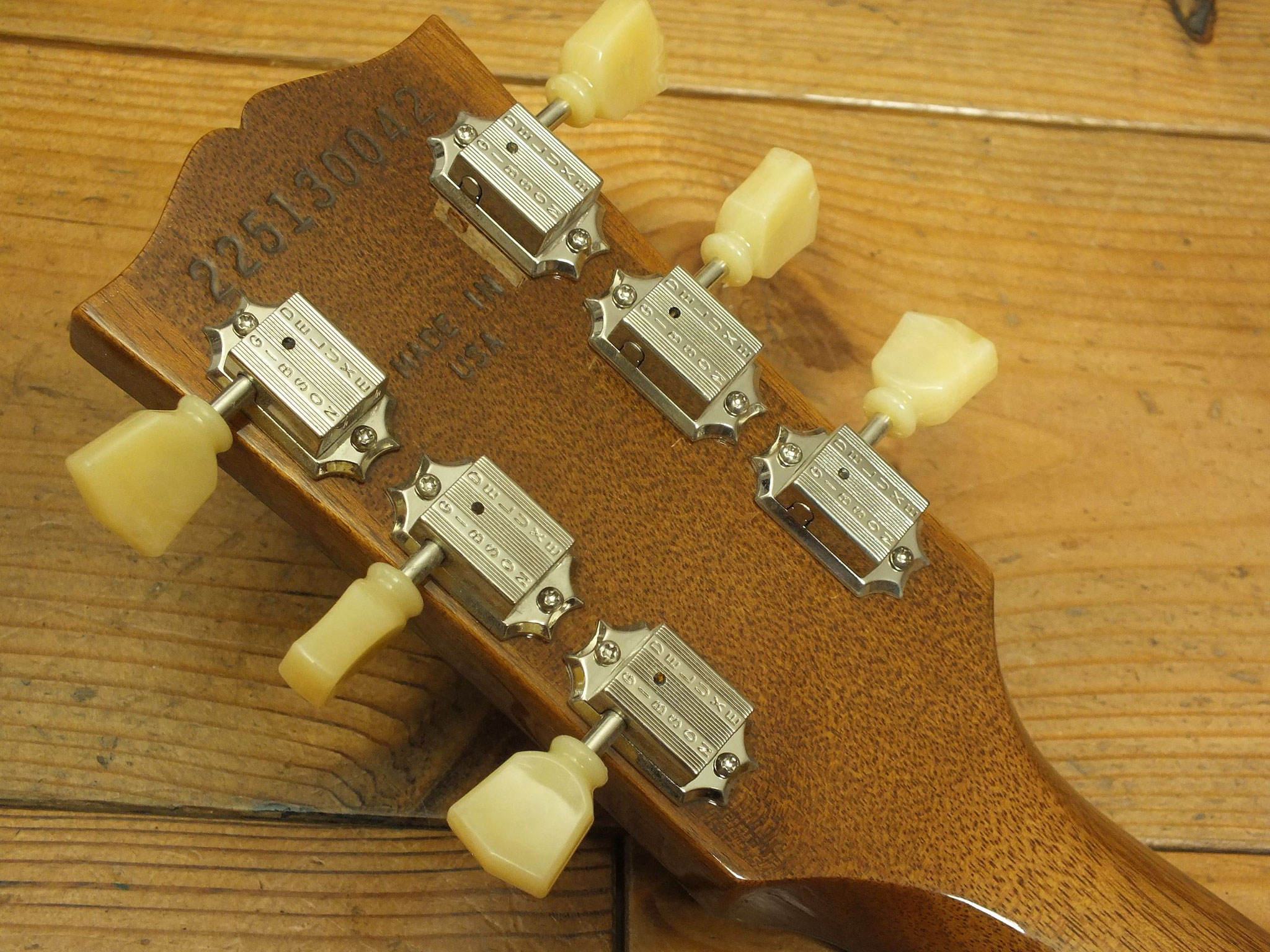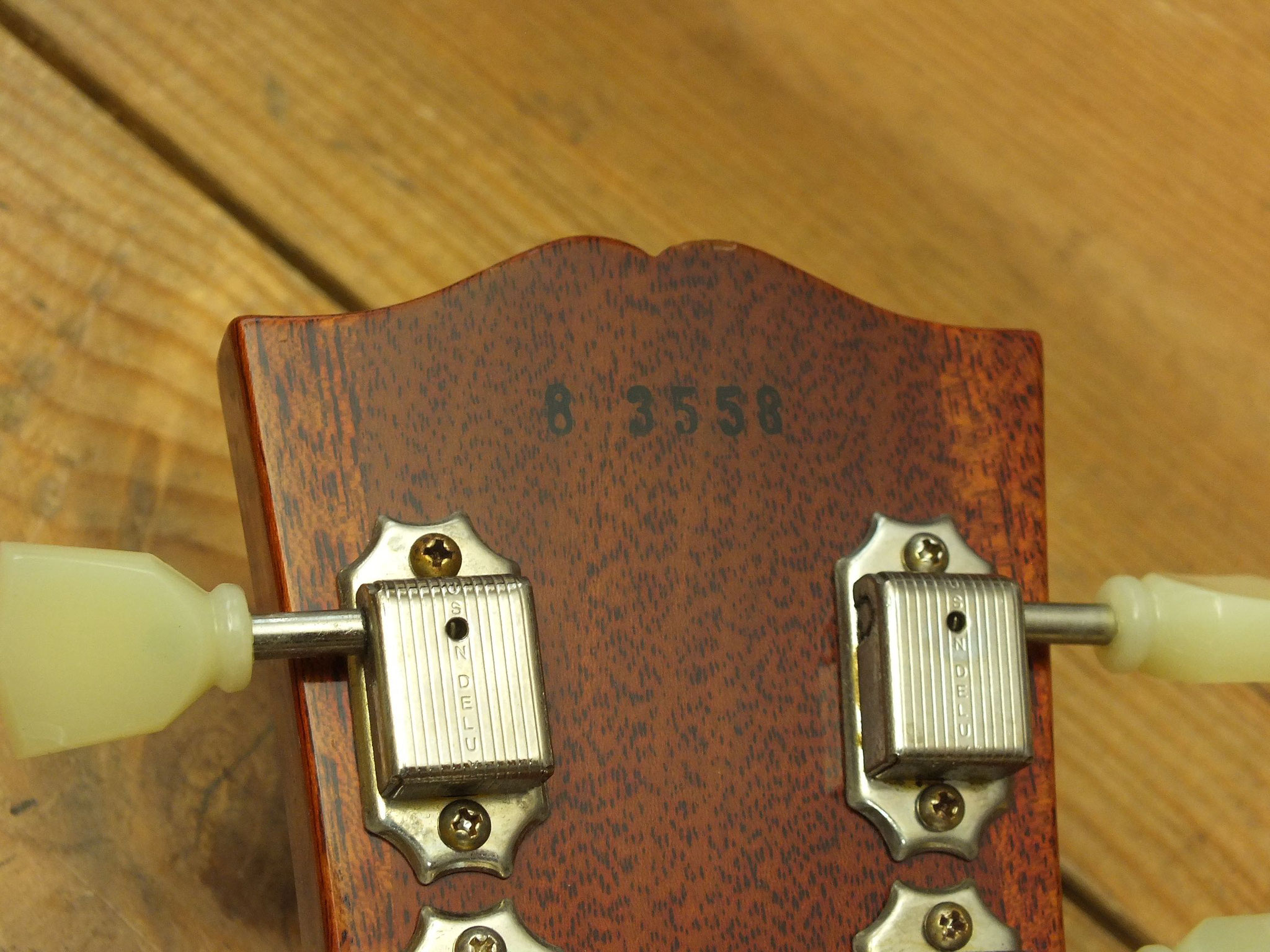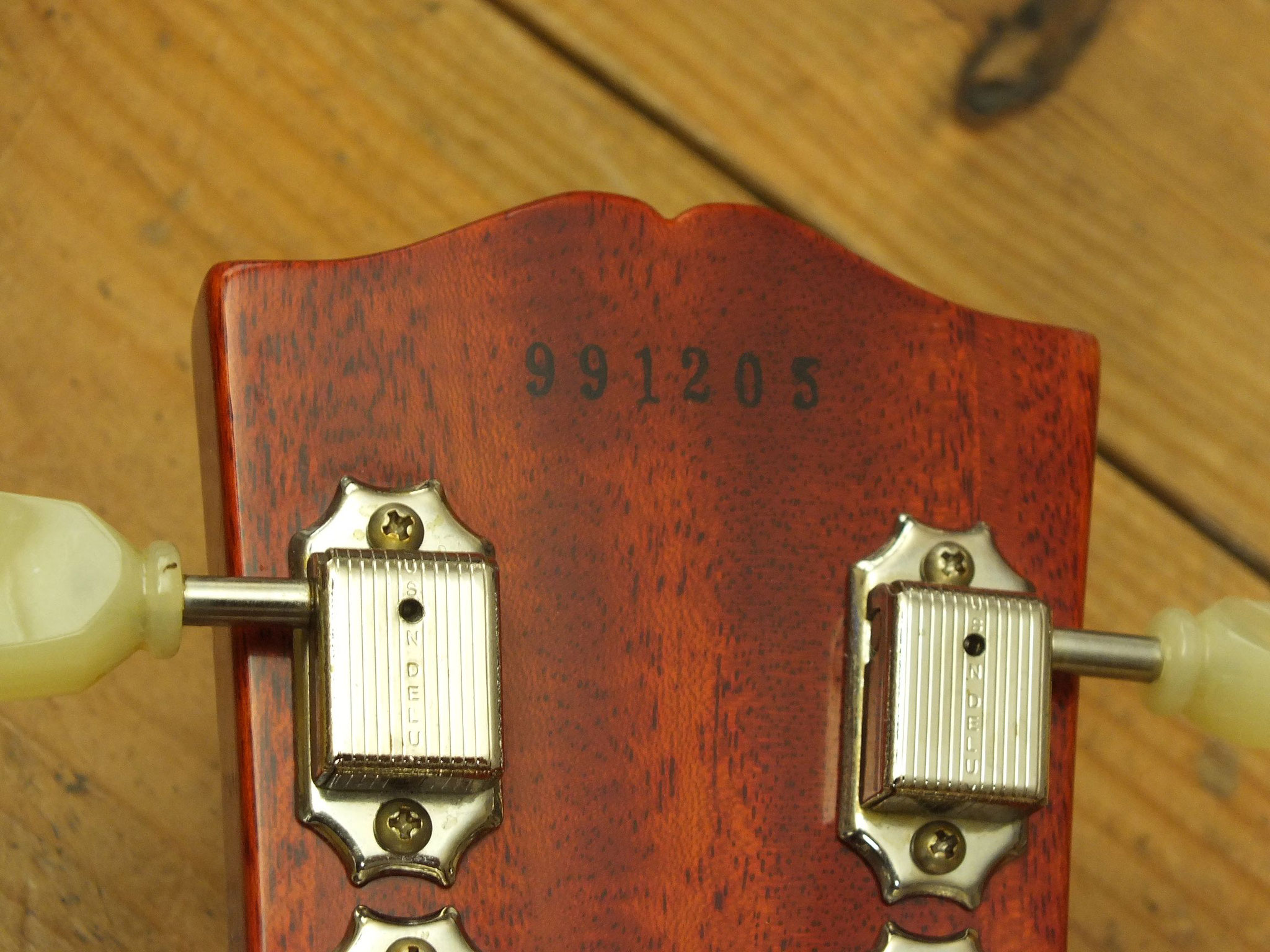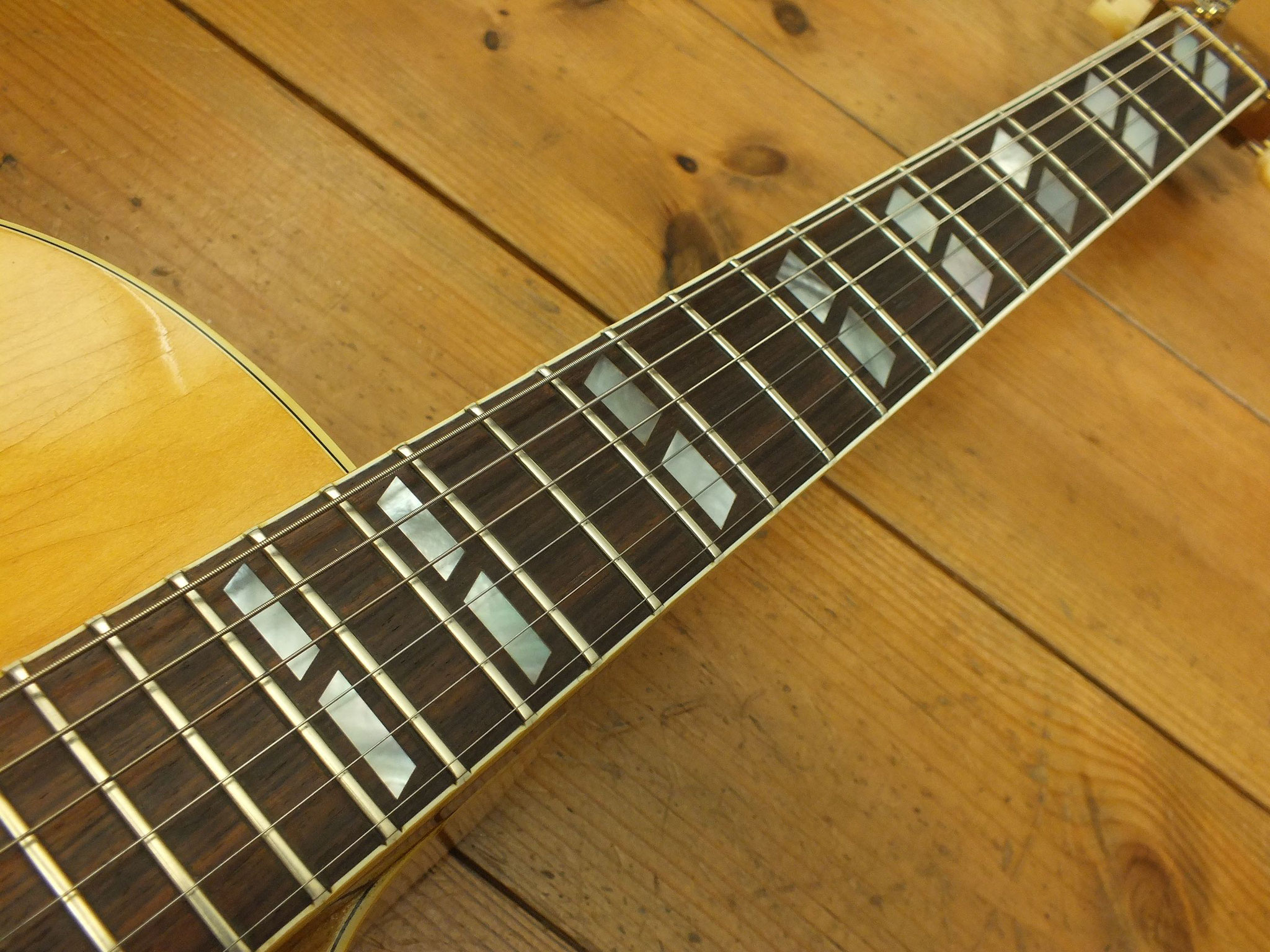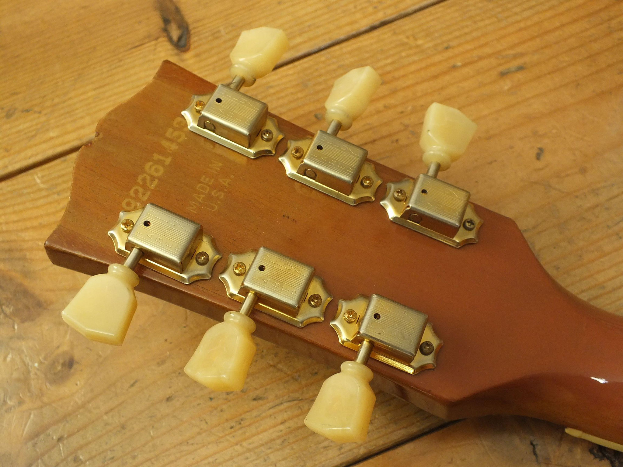 Dreistreifig laminierter Ahorn-Hals mit Ebenholz-Griffbrett, "Hearts and Flowers" Inlays, 22 Bünden und Gibson "Crank Tuners" mit integrierter Kurbel.