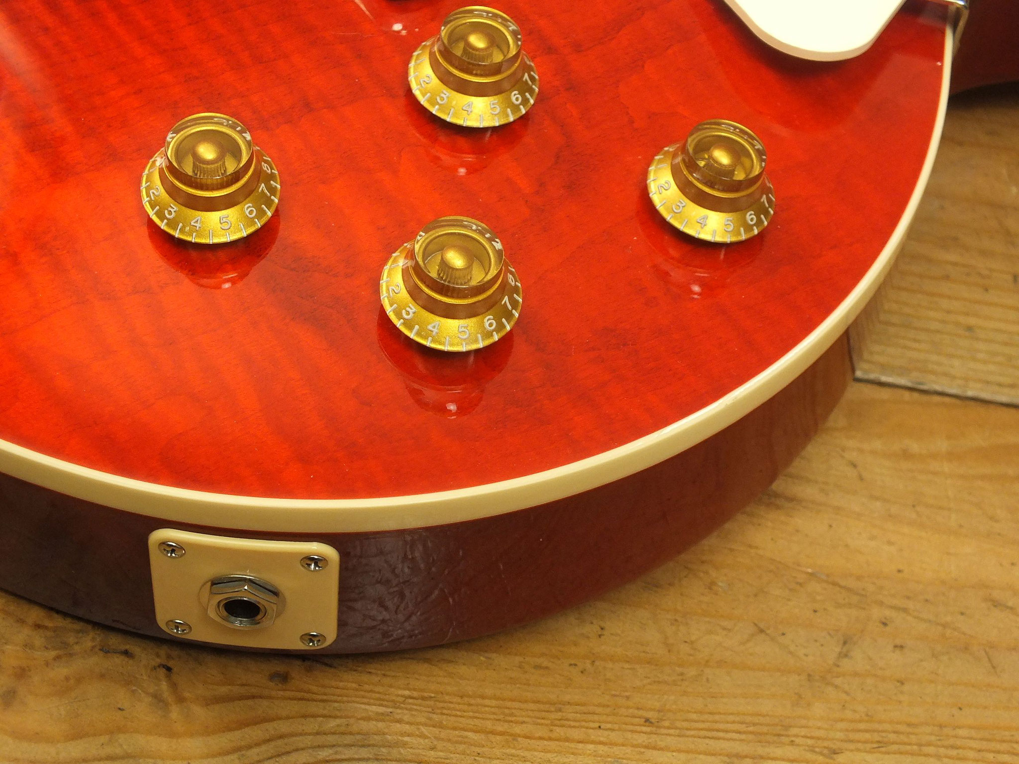 Natürlich in der bewährten Konstruktion aus Mahagoni-Body mit umwerfend schönem "AAA Flamed Maple Top" im "Translucent Cherry" Finish.