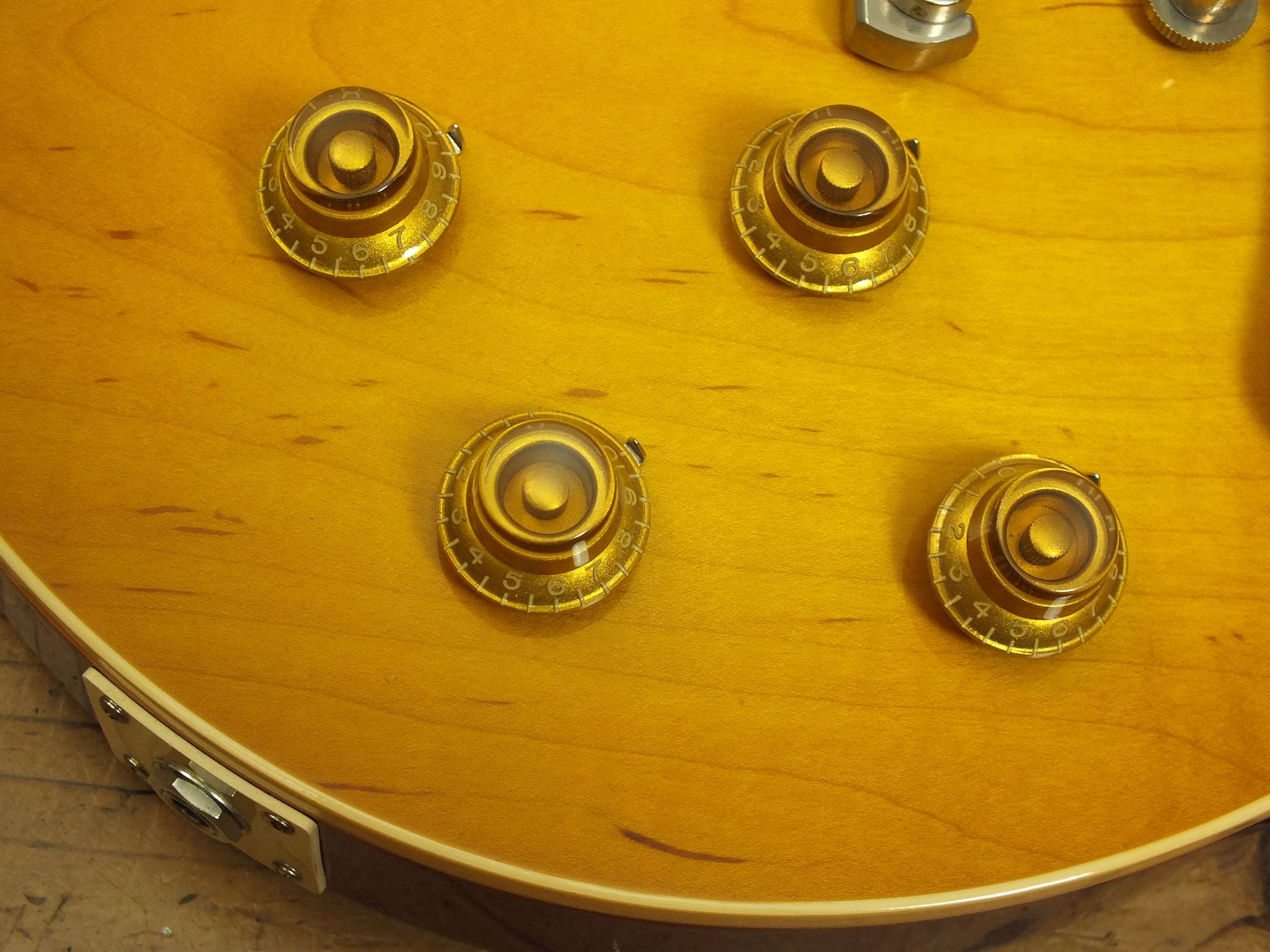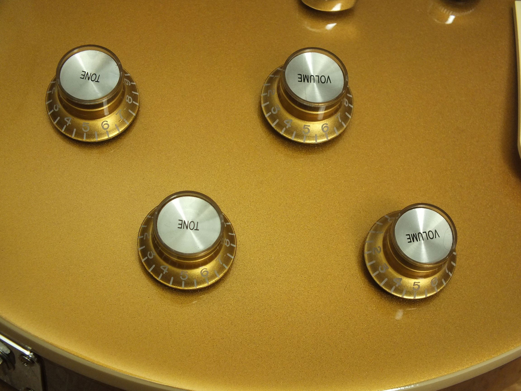 Zwei Volume- und zwei Tone-Potis mit "Orange Drop Capacitors".