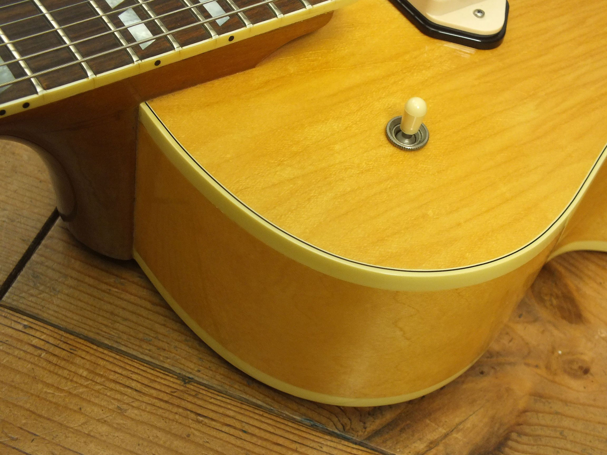 Klassische Bauweise mit Mahagoni-Body und schön gemaserter Ahorn-Decke im Nitro-Finish.