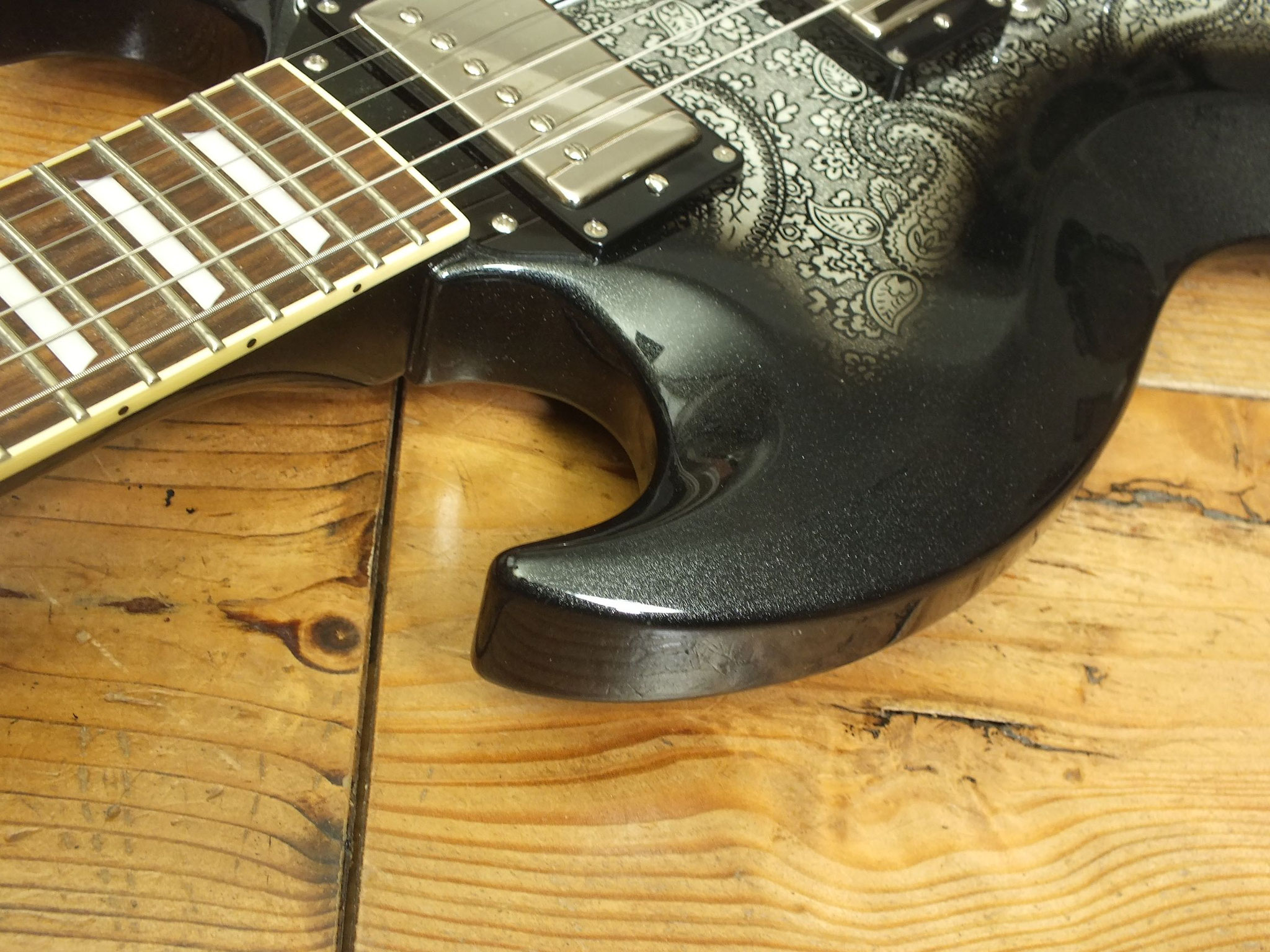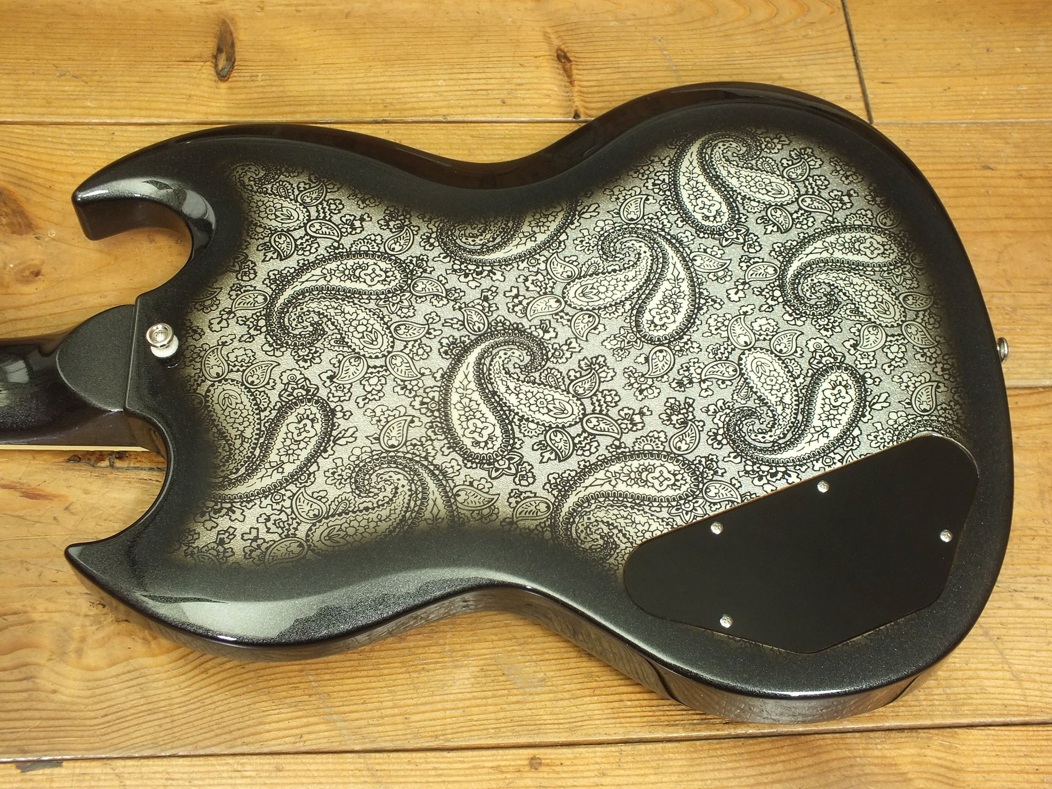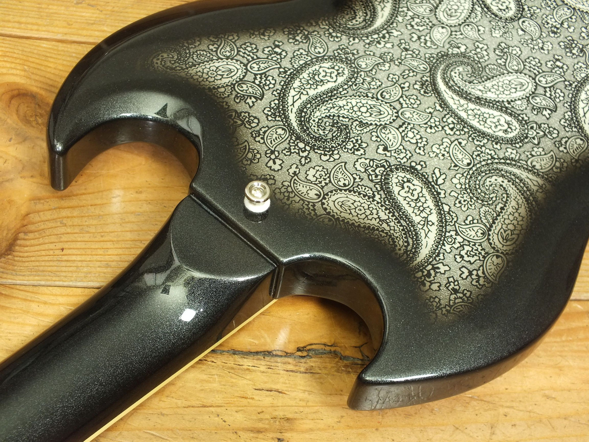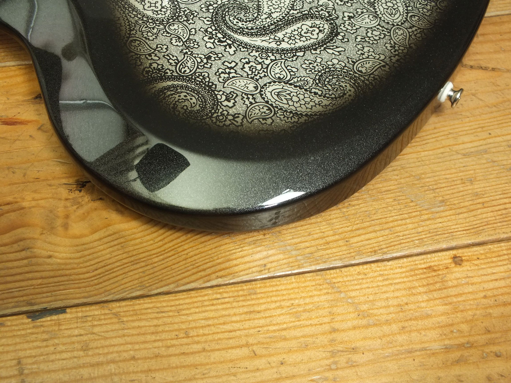 Body aus selektiertem afrikanischem Mahagoni mit auffälligem "Black Paisley" Finish auf Vorder- und Rückseite.