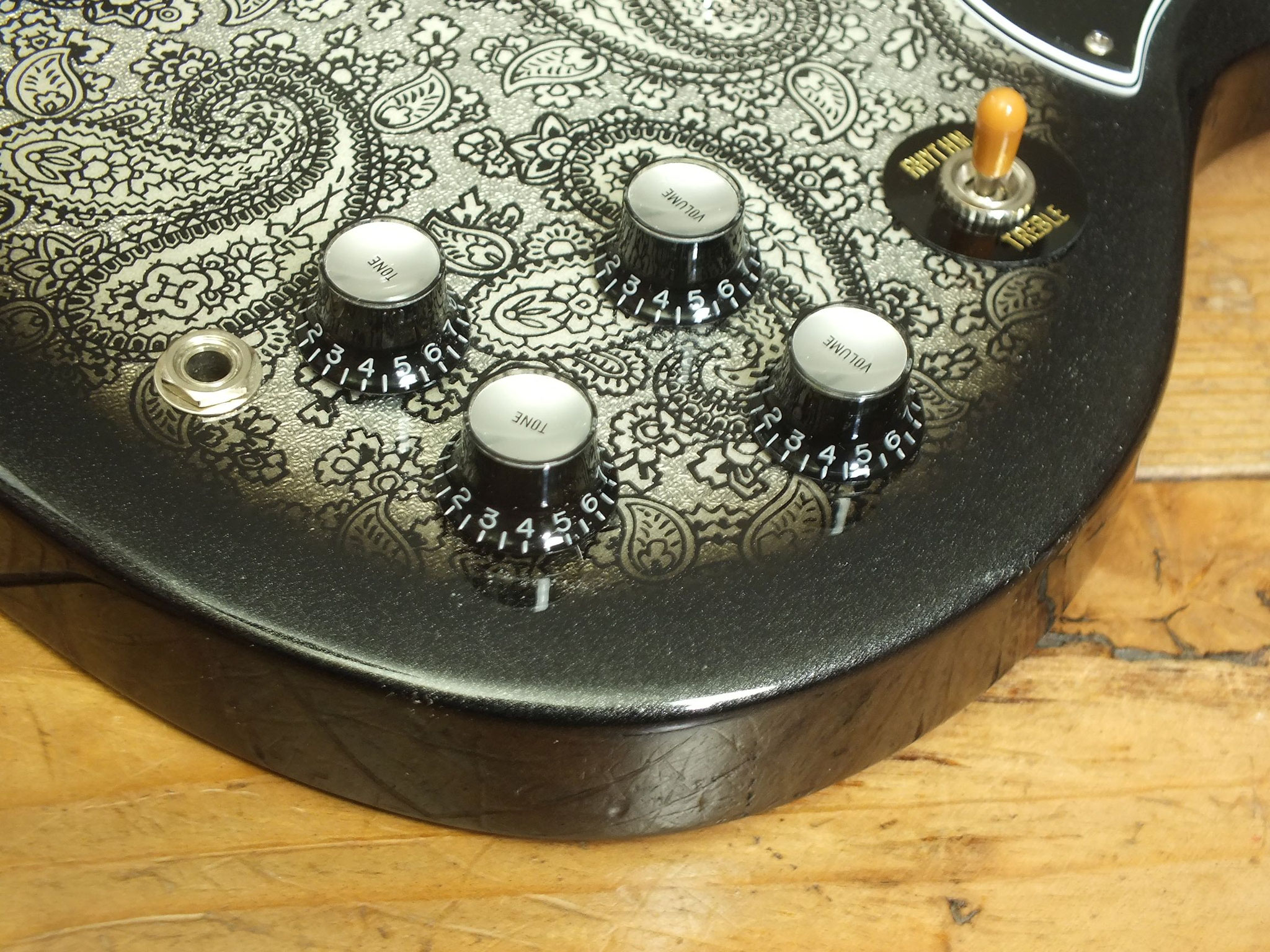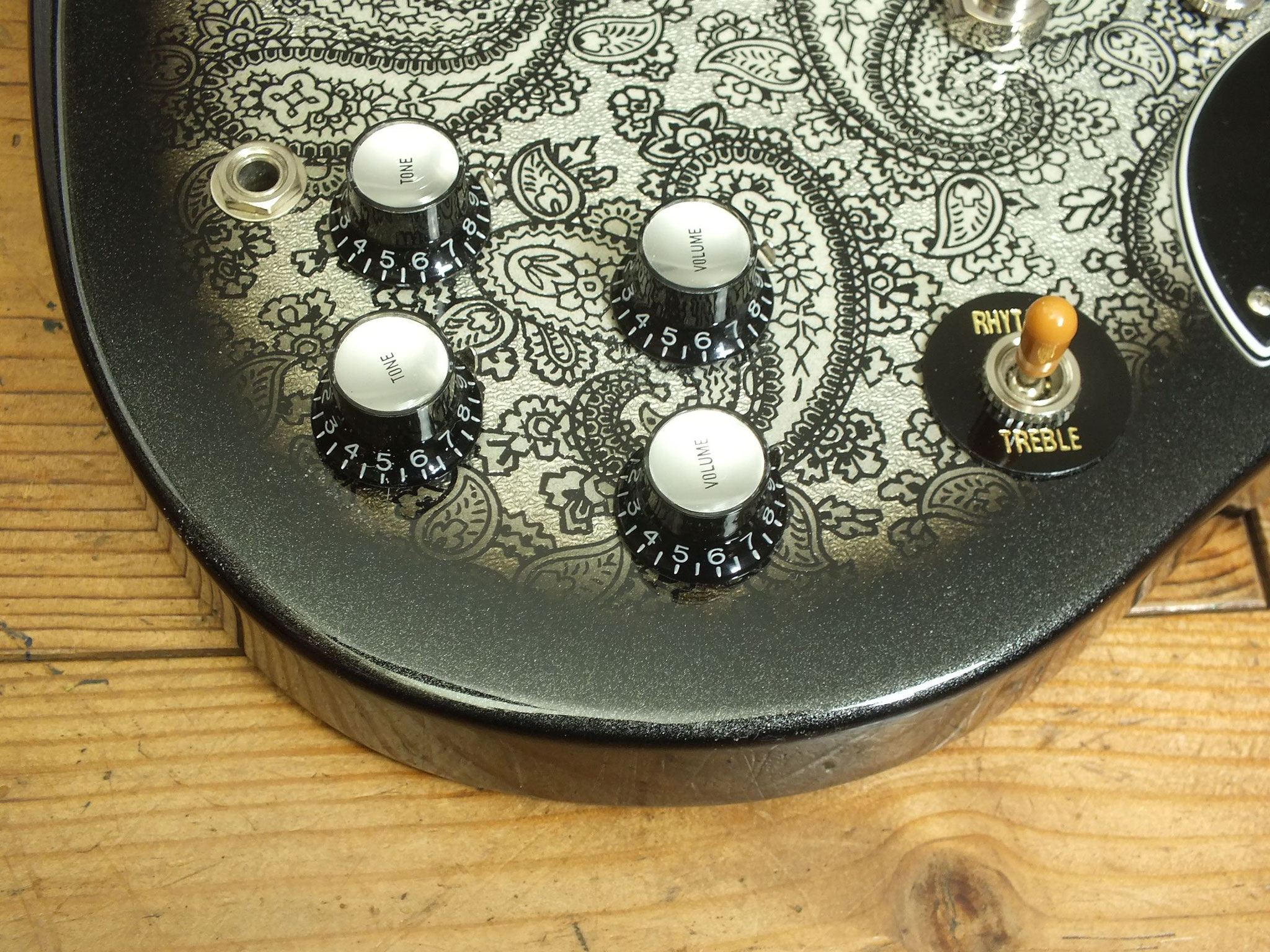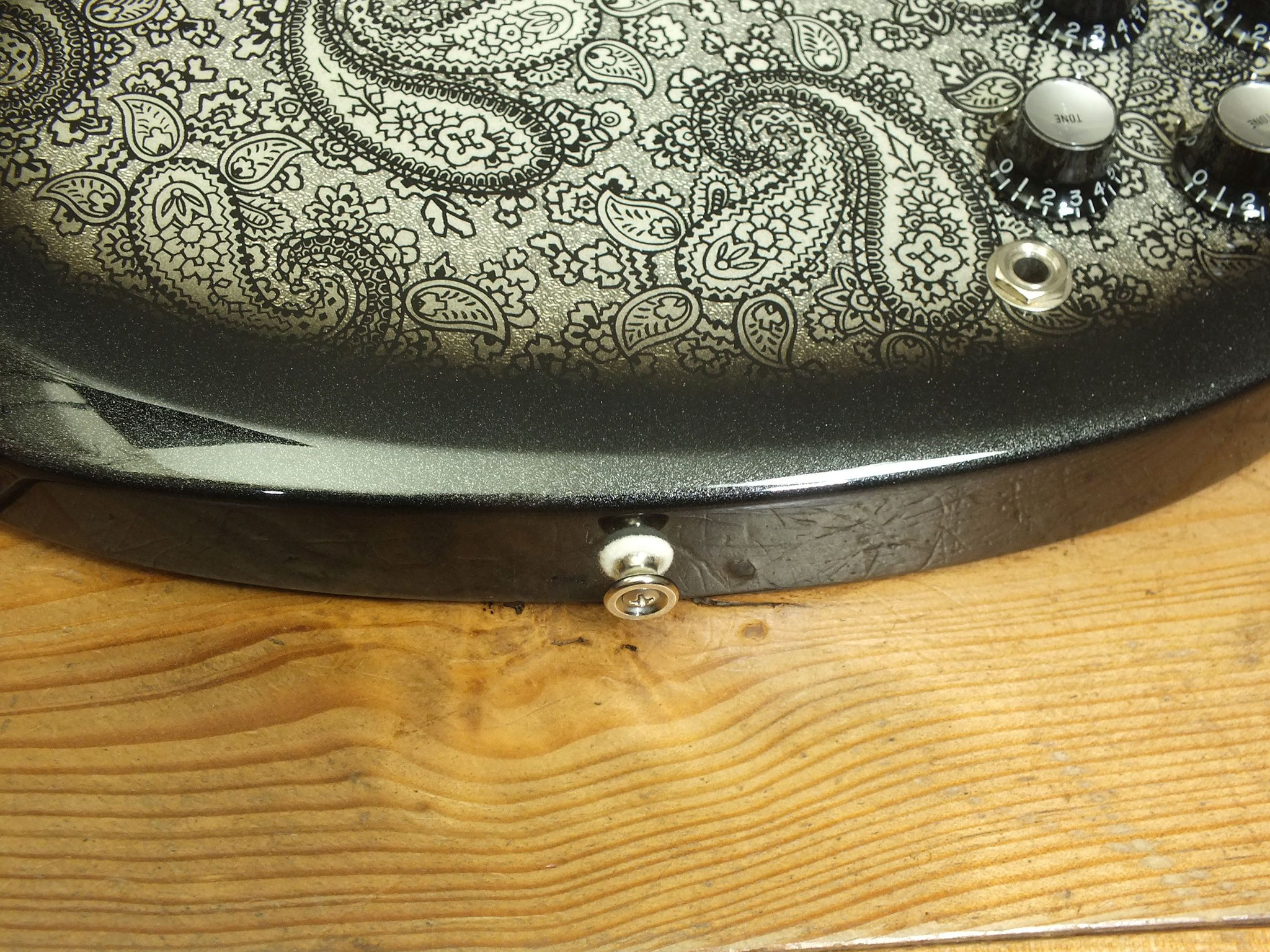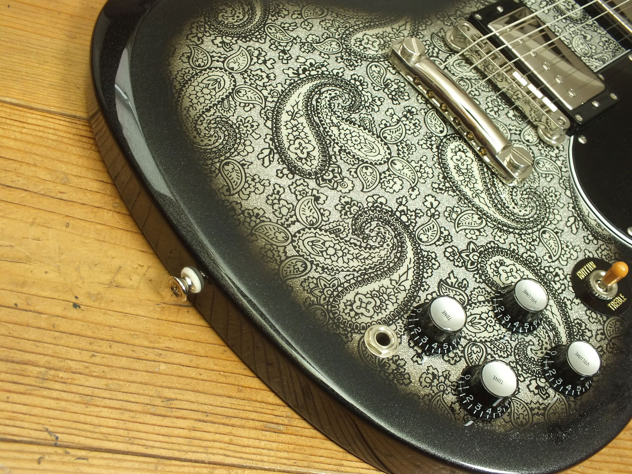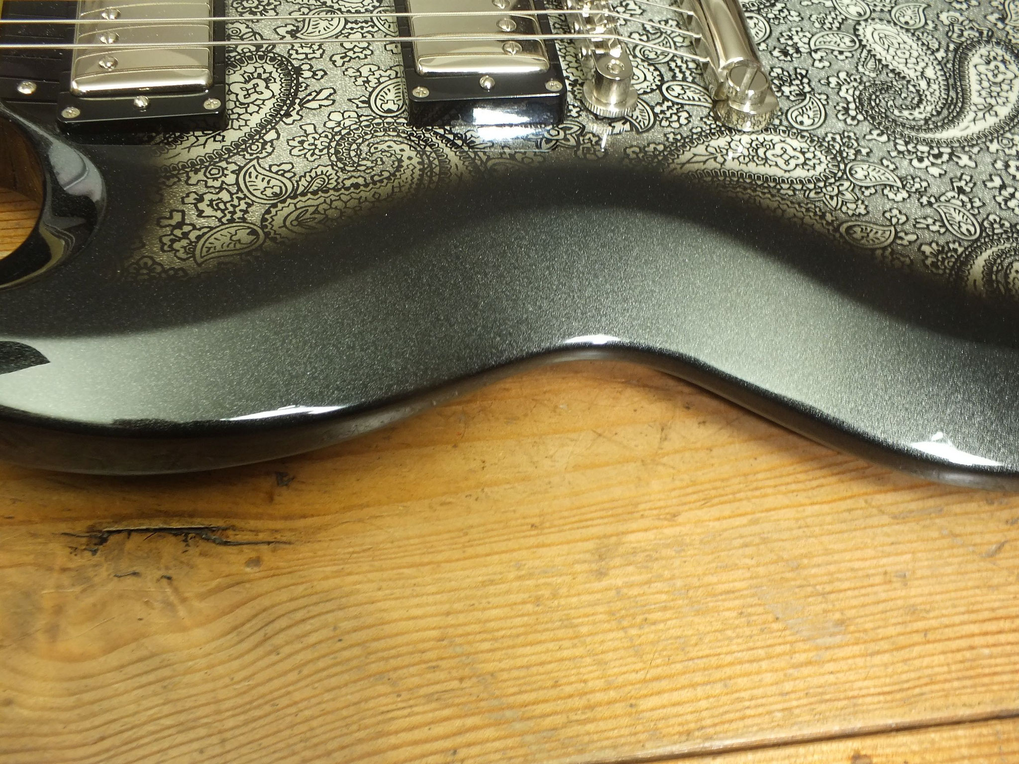 Body aus selektiertem afrikanischem Mahagoni mit auffälligem "Black Paisley" Finish auf Vorder- und Rückseite.
