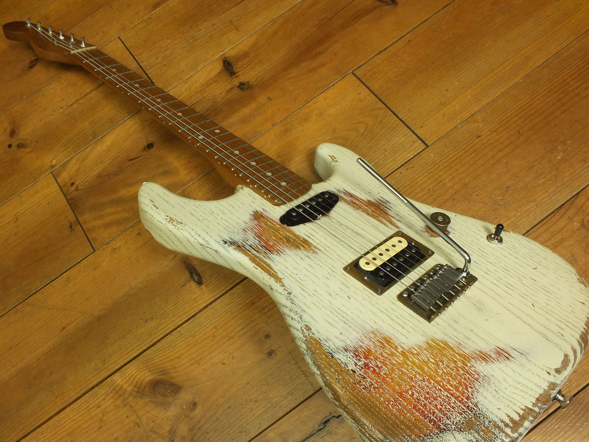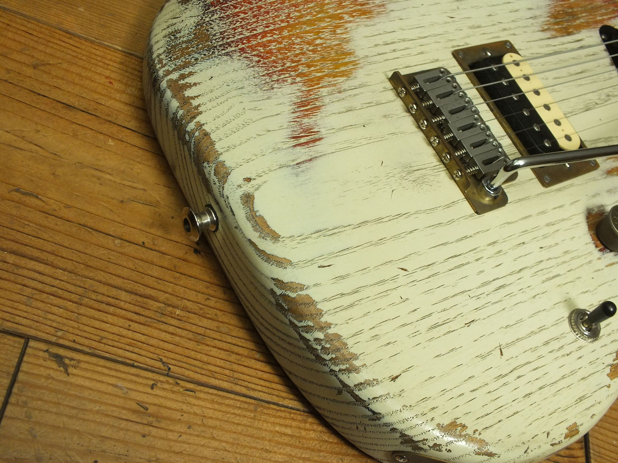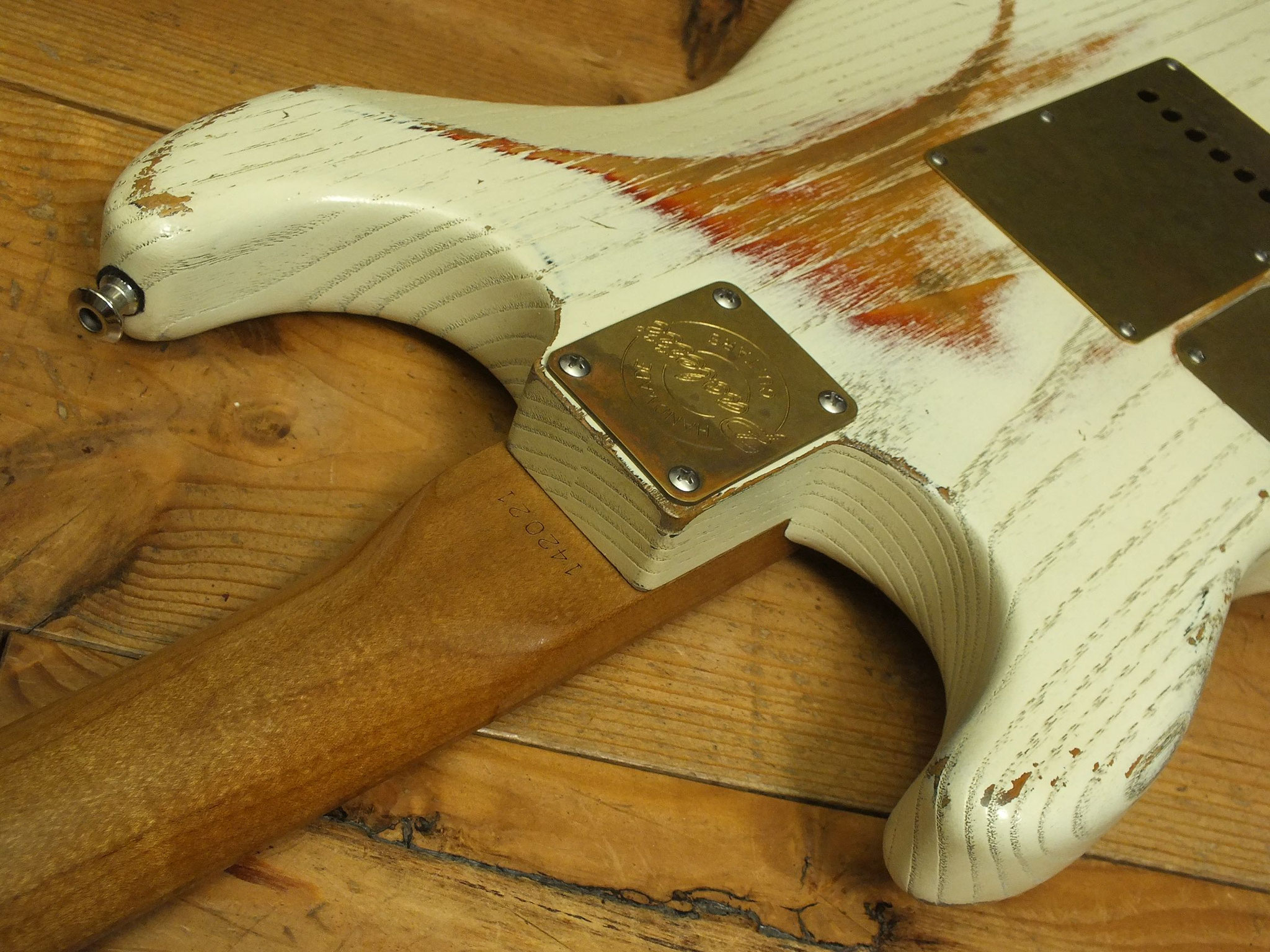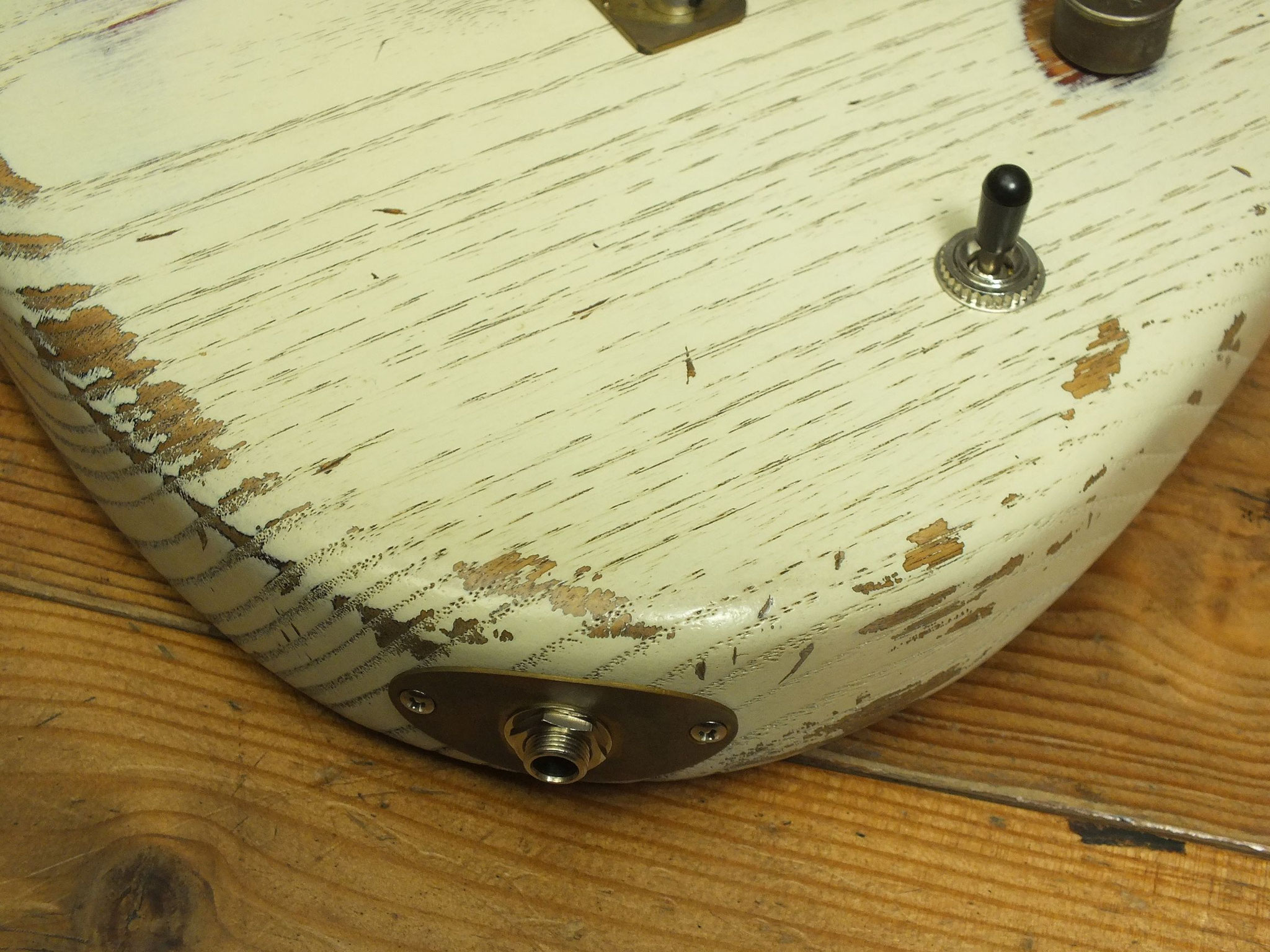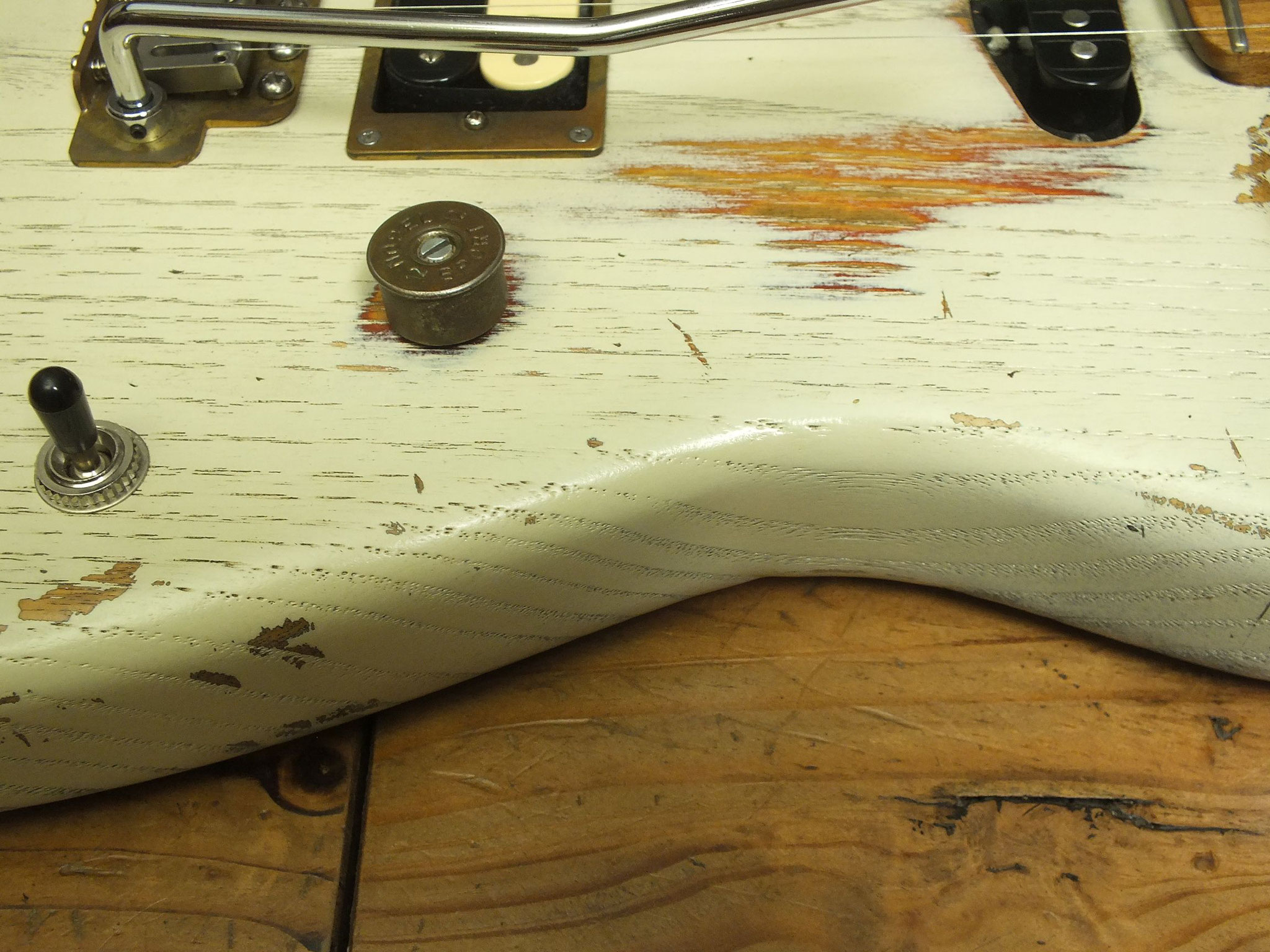 Kastanien-Body im "Heavy White" Relic-Finish mit Vintage Style Tremolo, CTS 250 K Volume-Schalt-Poti im Gewehrpatronen-Design und Dreiweg Hot Switch.