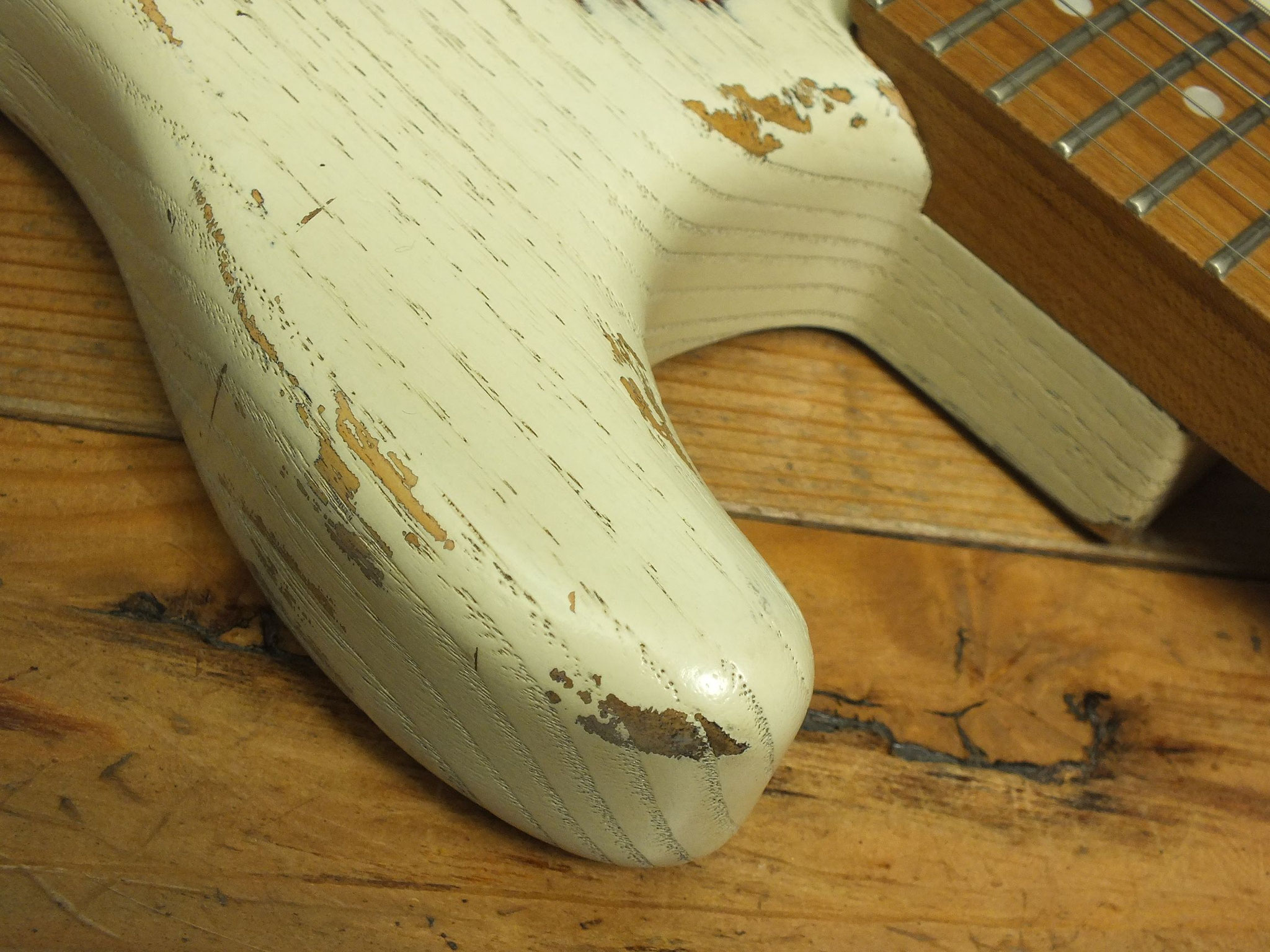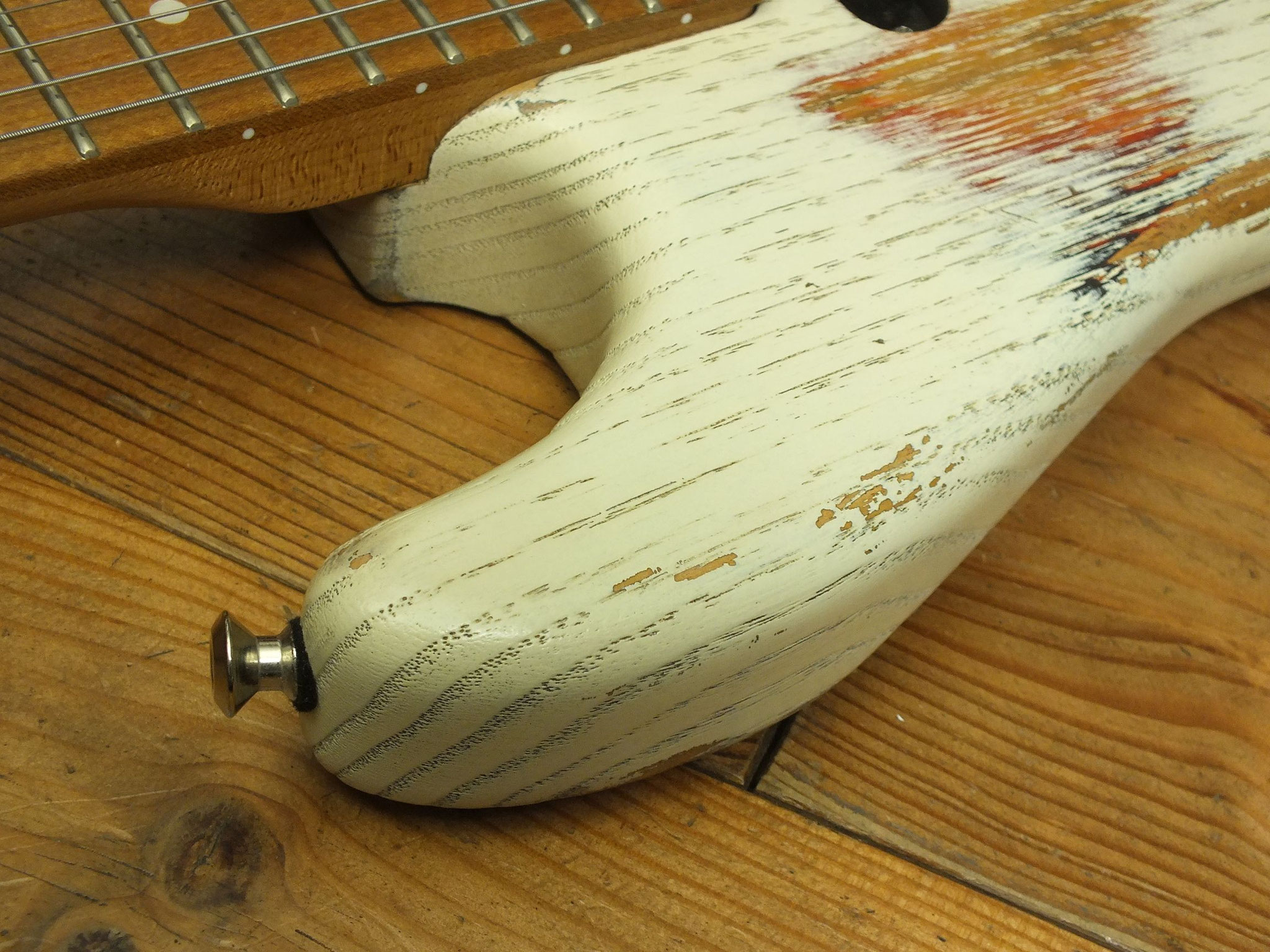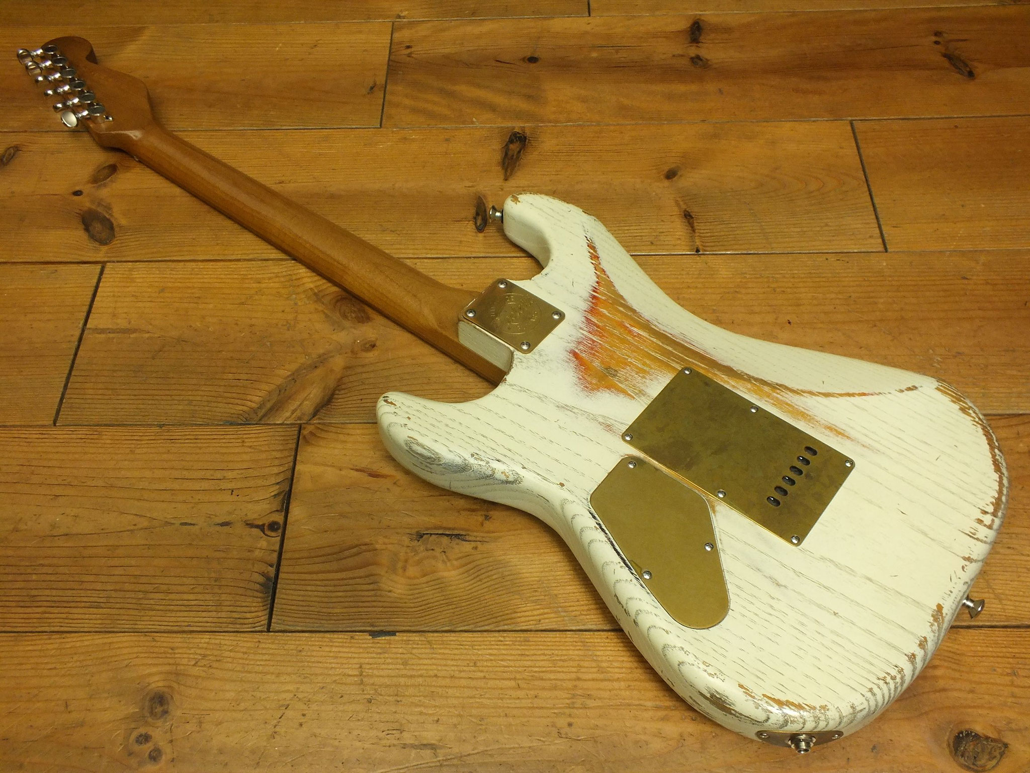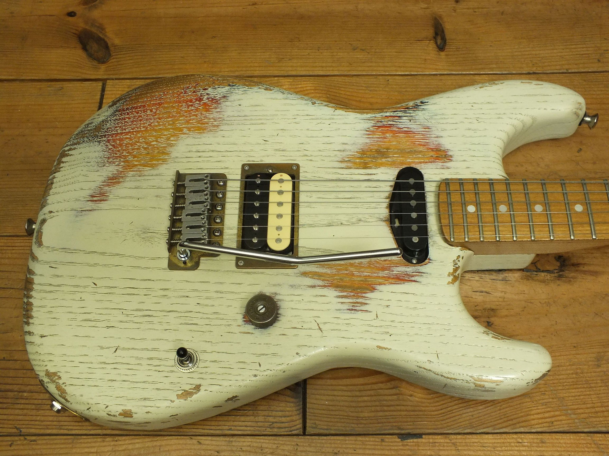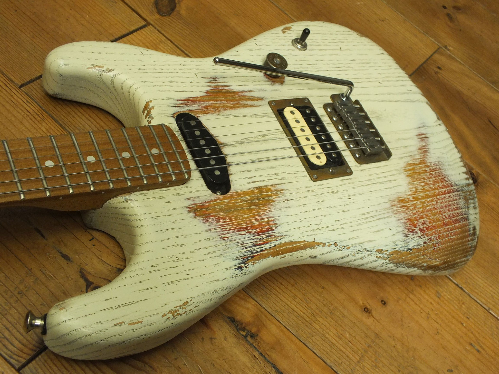 Kastanien-Body im "Heavy White" Relic-Finish mit Vintage Style Tremolo, CTS 250 K Volume-Schalt-Poti im Gewehrpatronen-Design und Dreiweg Hot Switch.