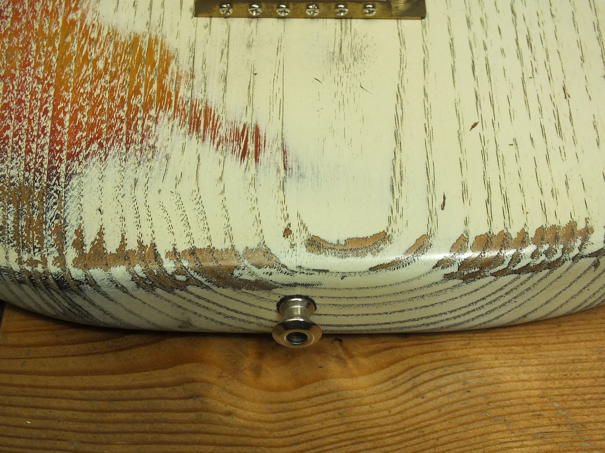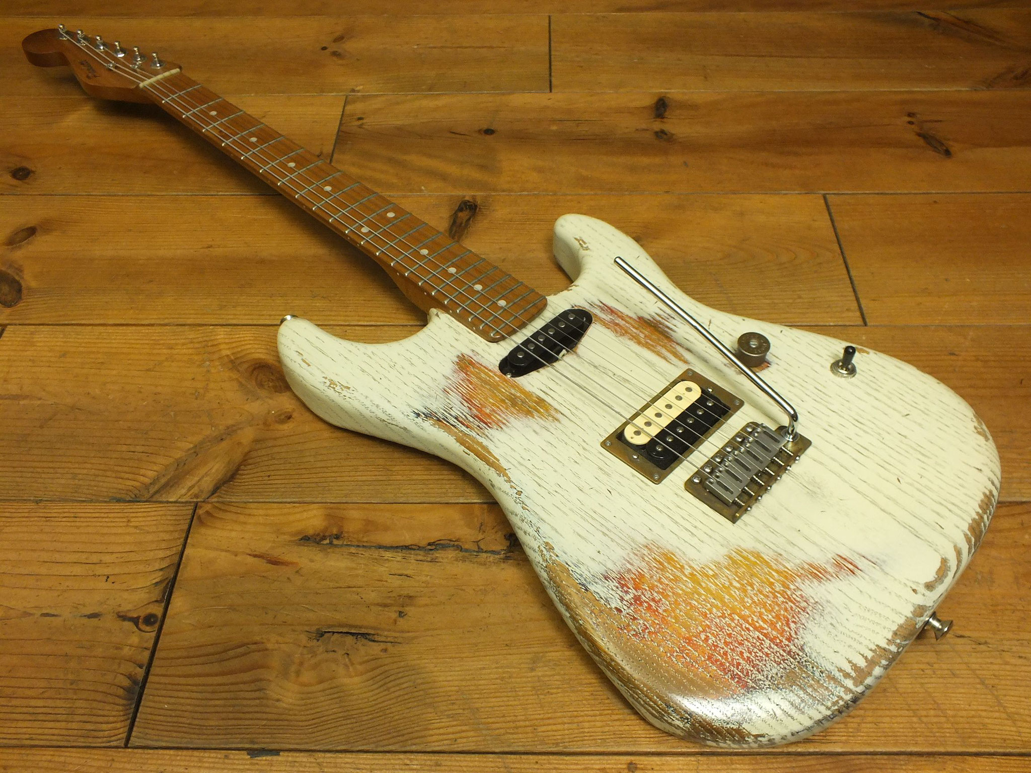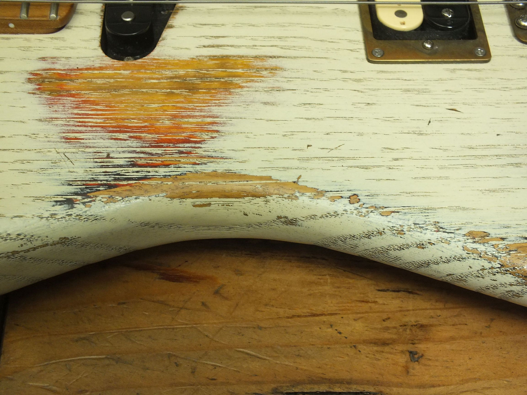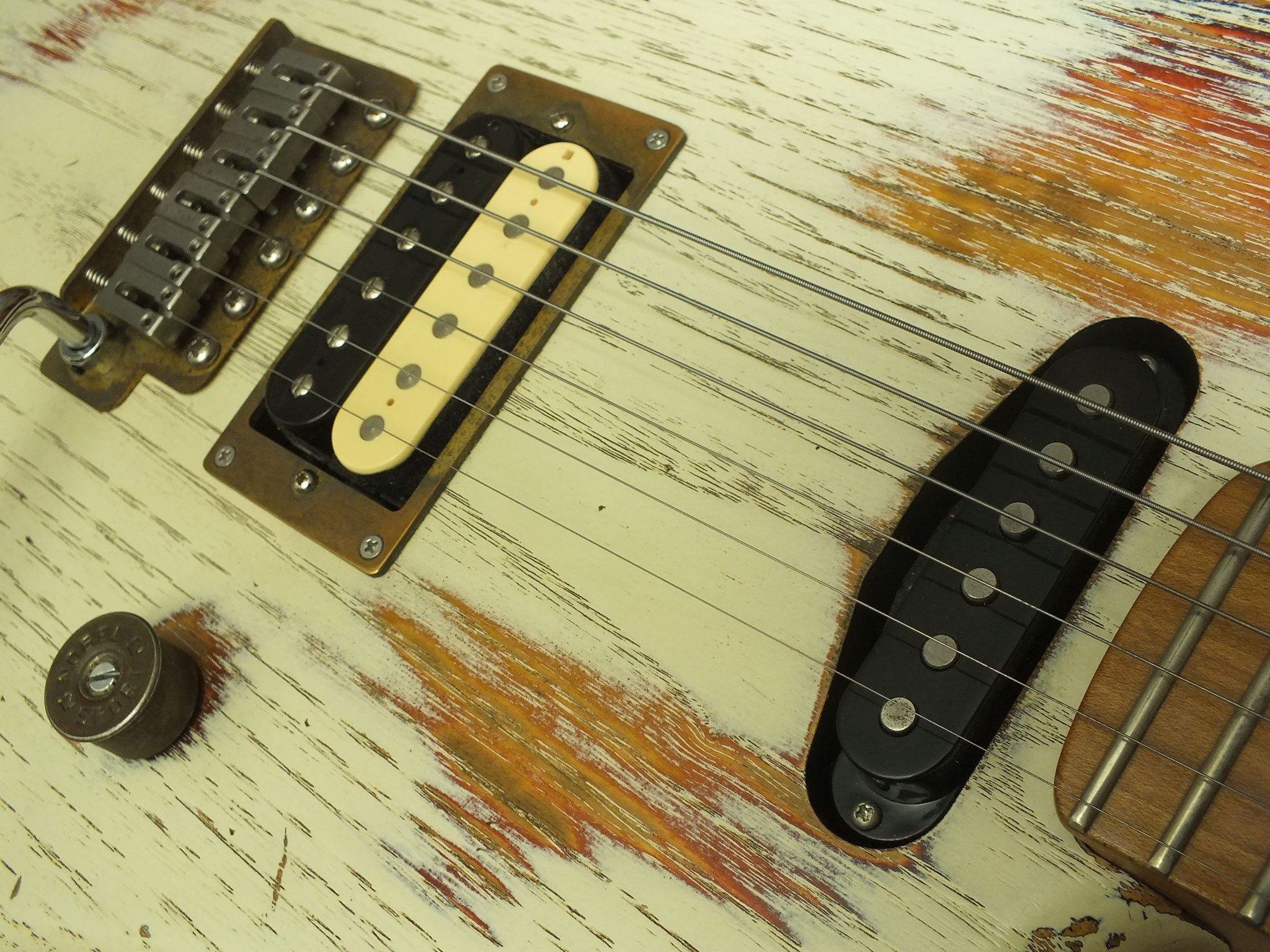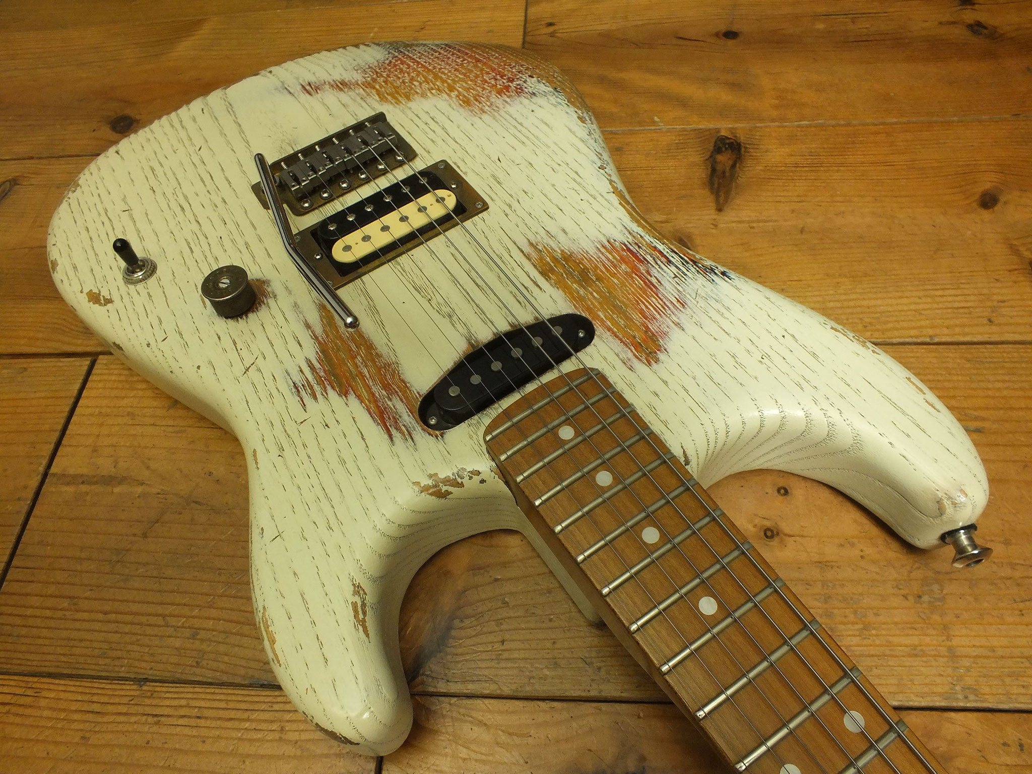 Kastanien-Body im "Heavy White" Relic-Finish mit Vintage Style Tremolo, CTS 250 K Volume-Schalt-Poti im Gewehrpatronen-Design und Dreiweg Hot Switch.