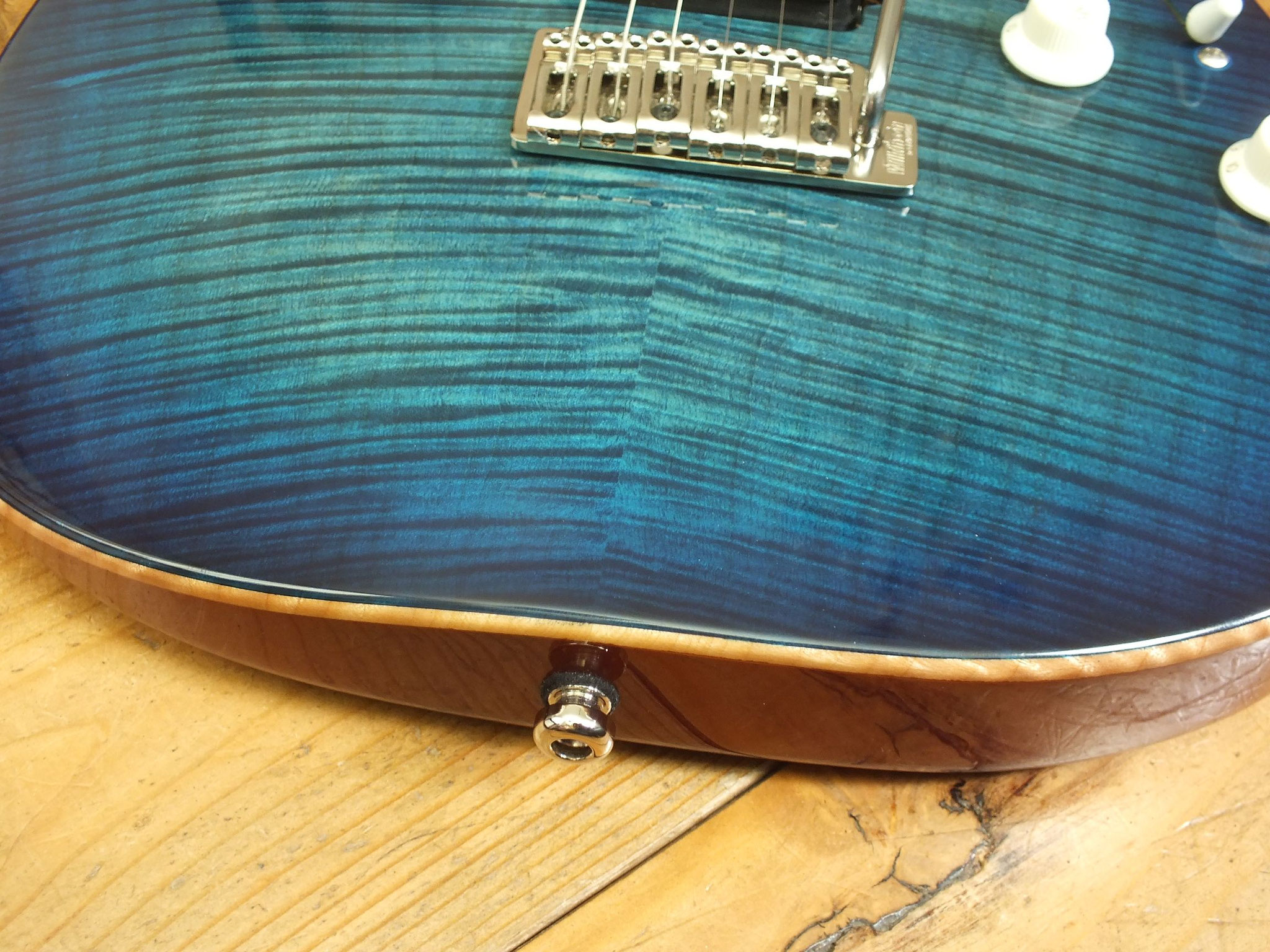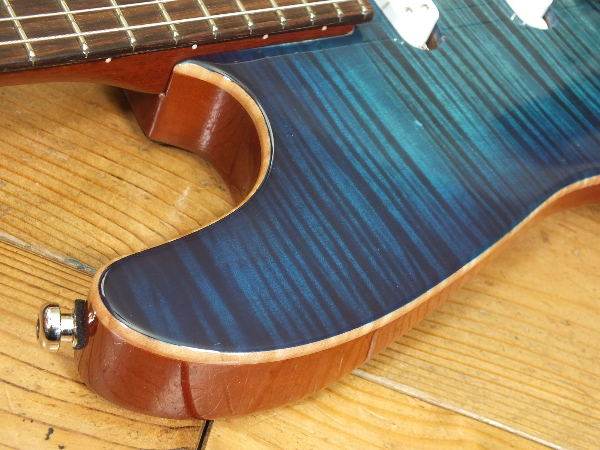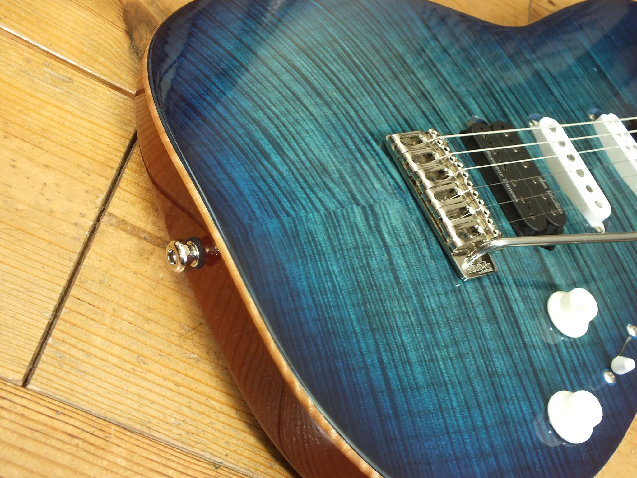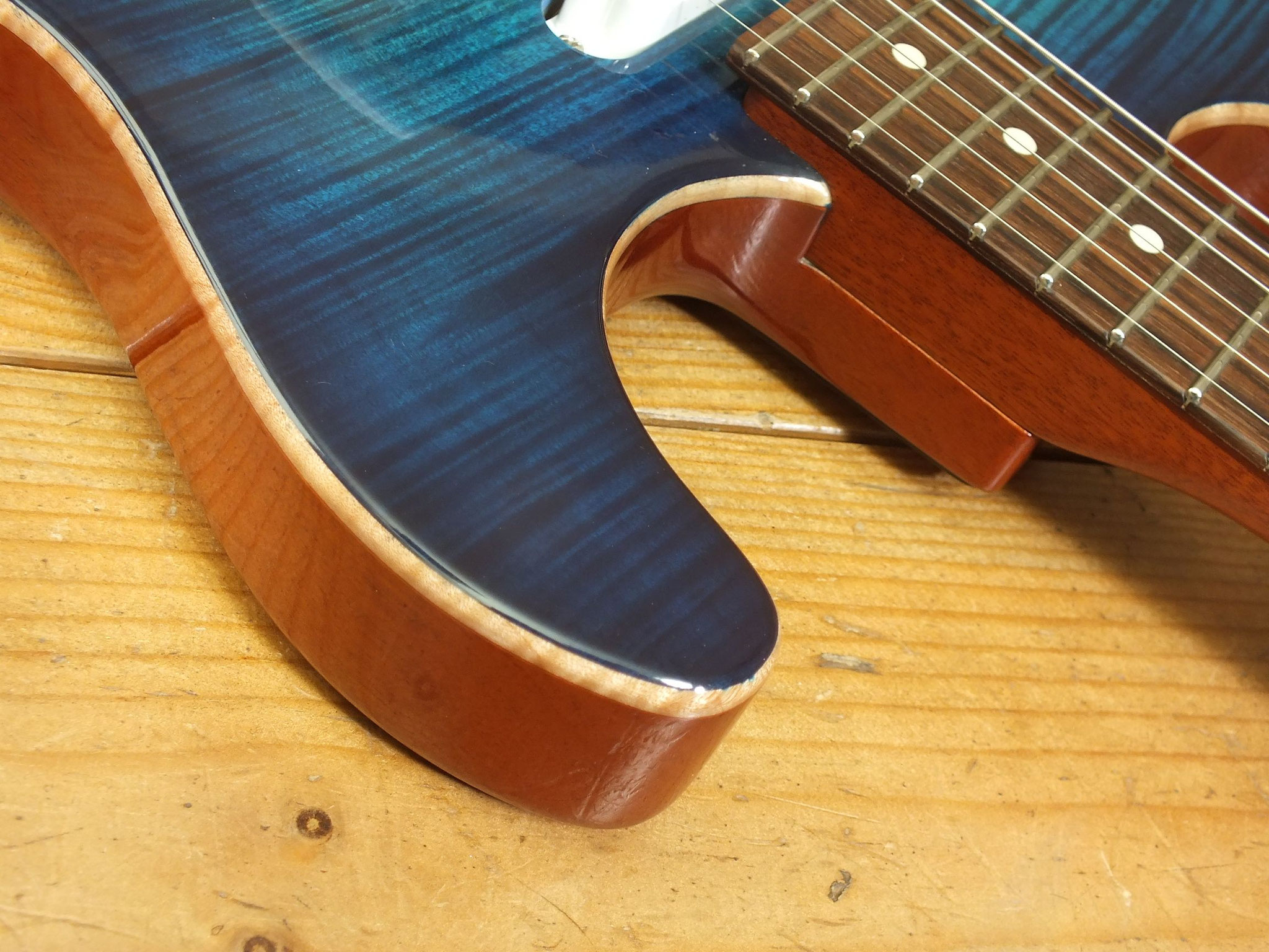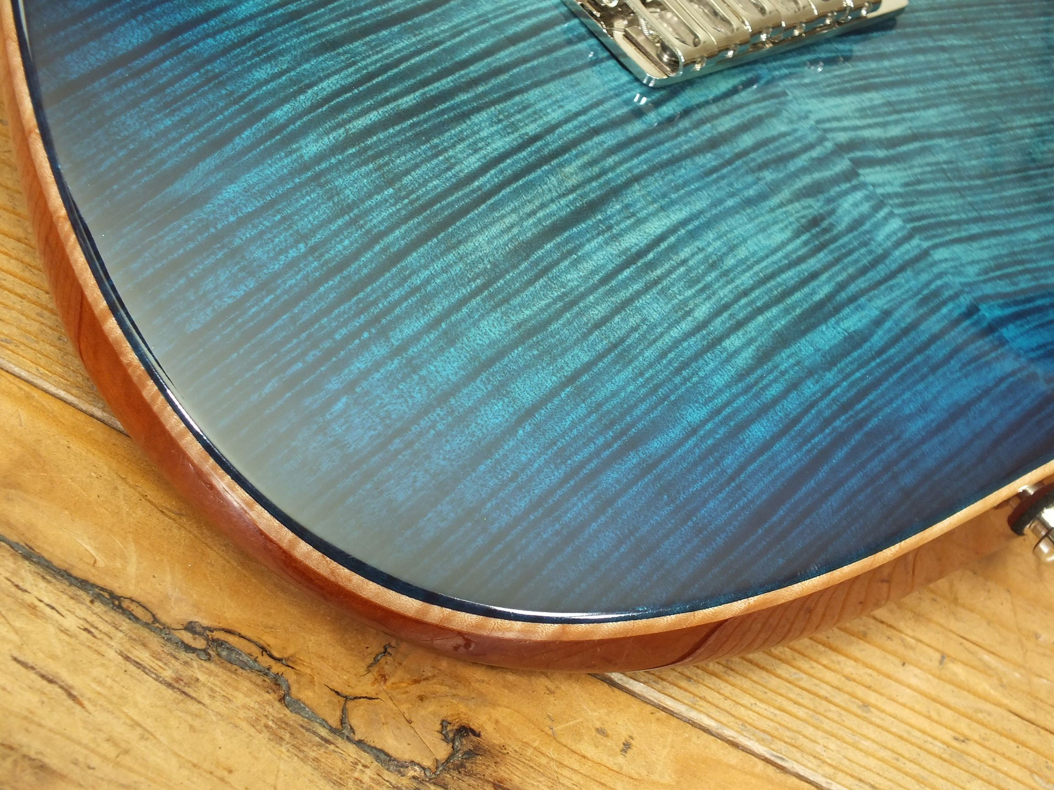 Mahagoni-Body mit wunderschönem "5A Flamed Maple Top" im transparenten Blueburst Finish.