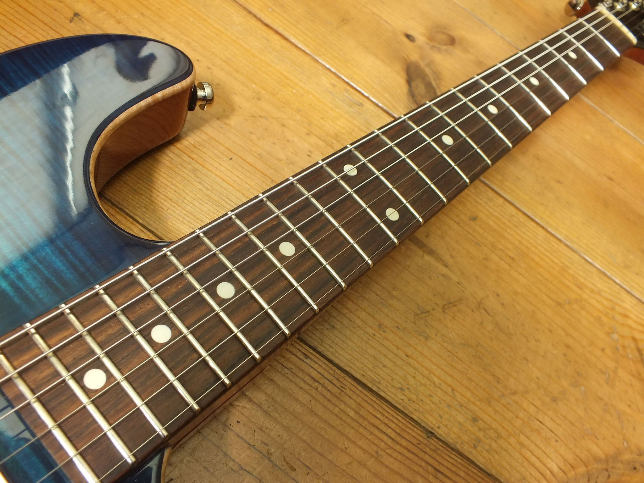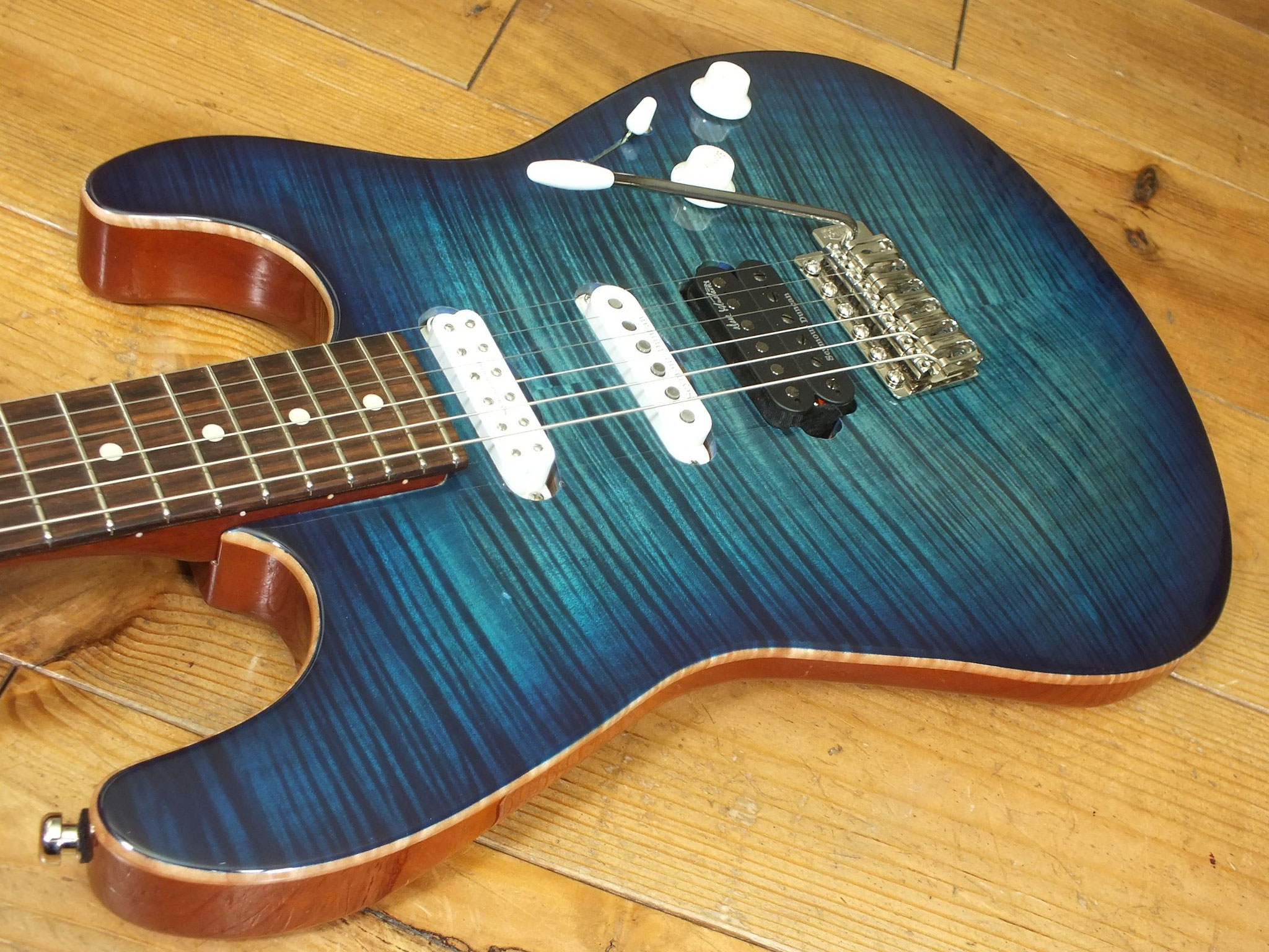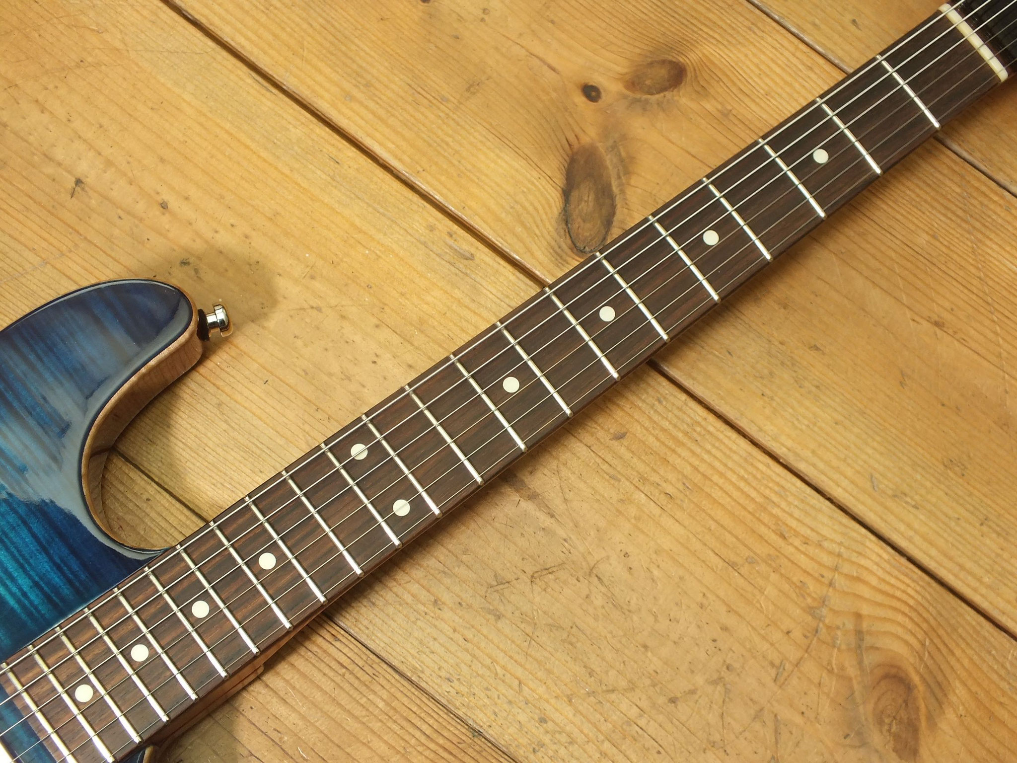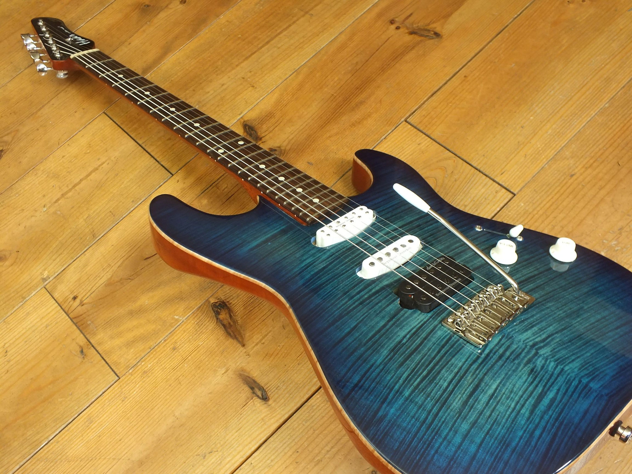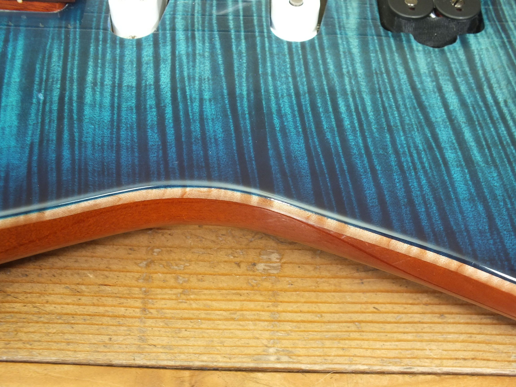 Mahagoni-Body mit wunderschönem "5A Flamed Maple Top" im transparenten Blueburst Finish.