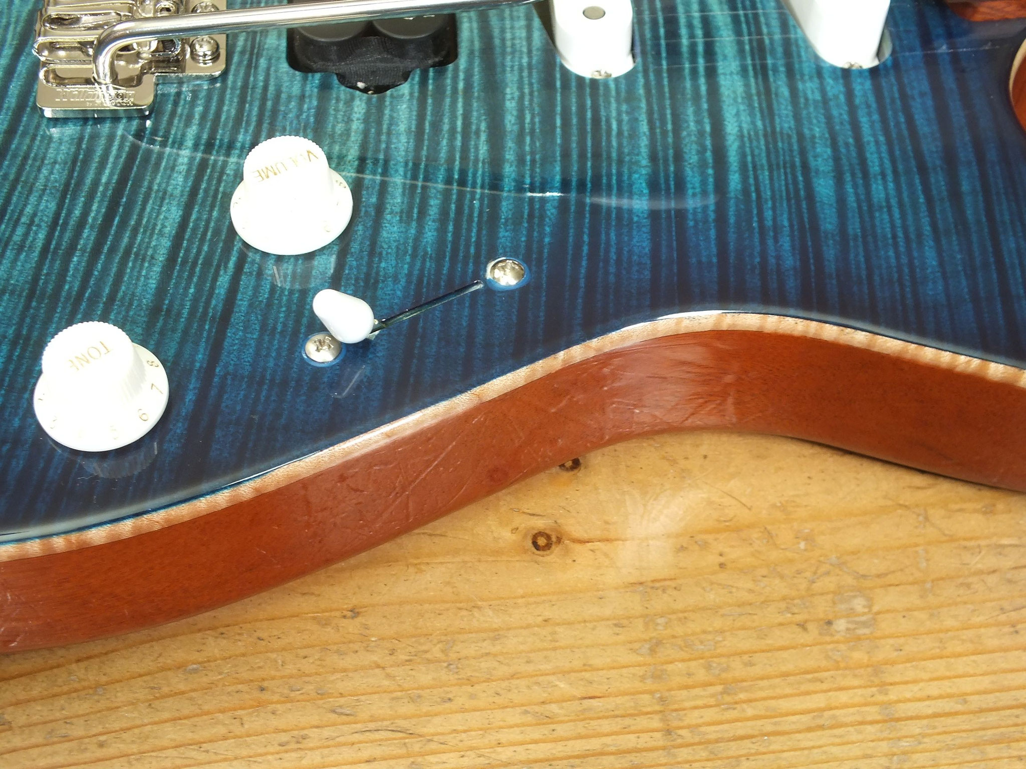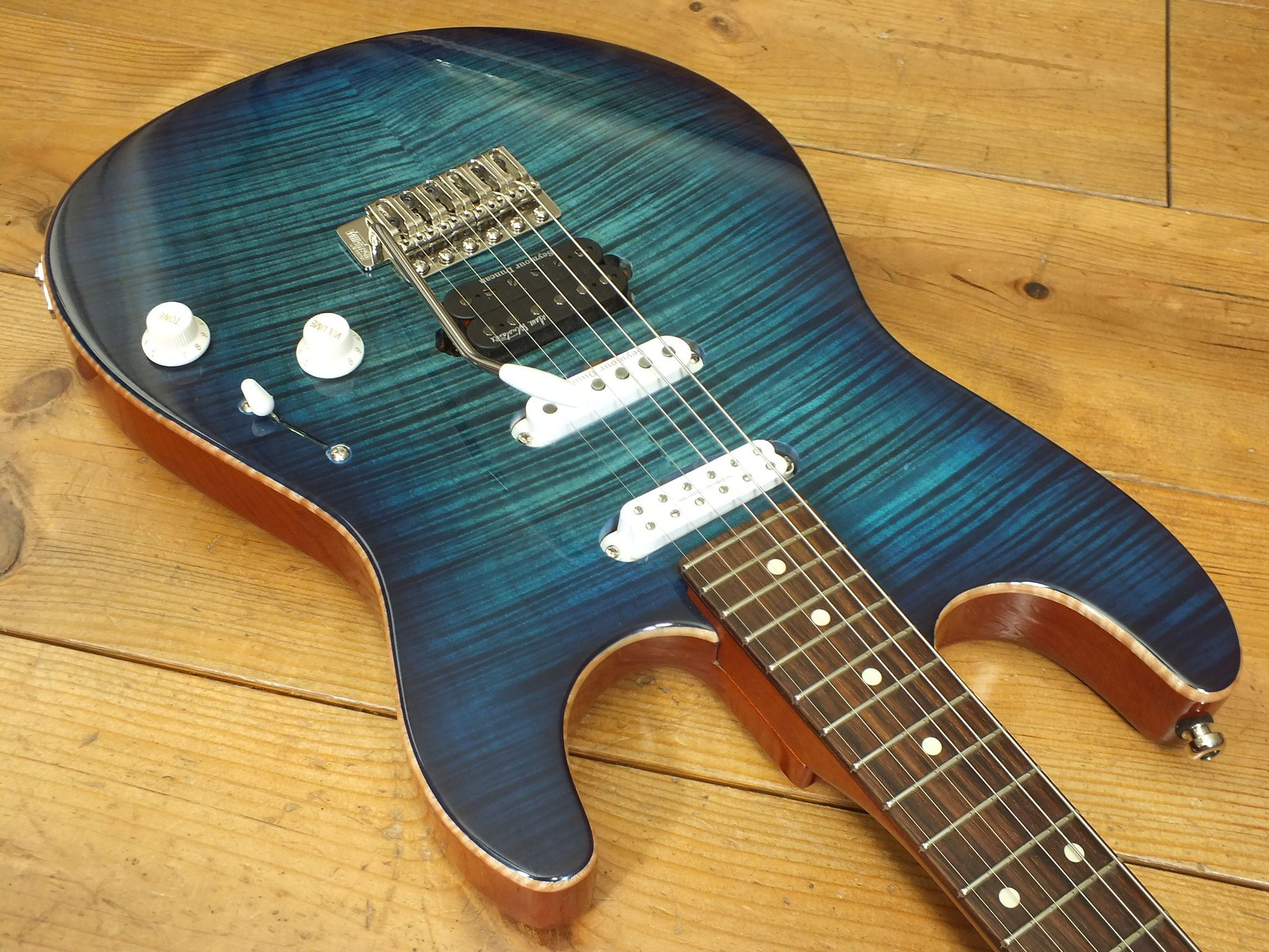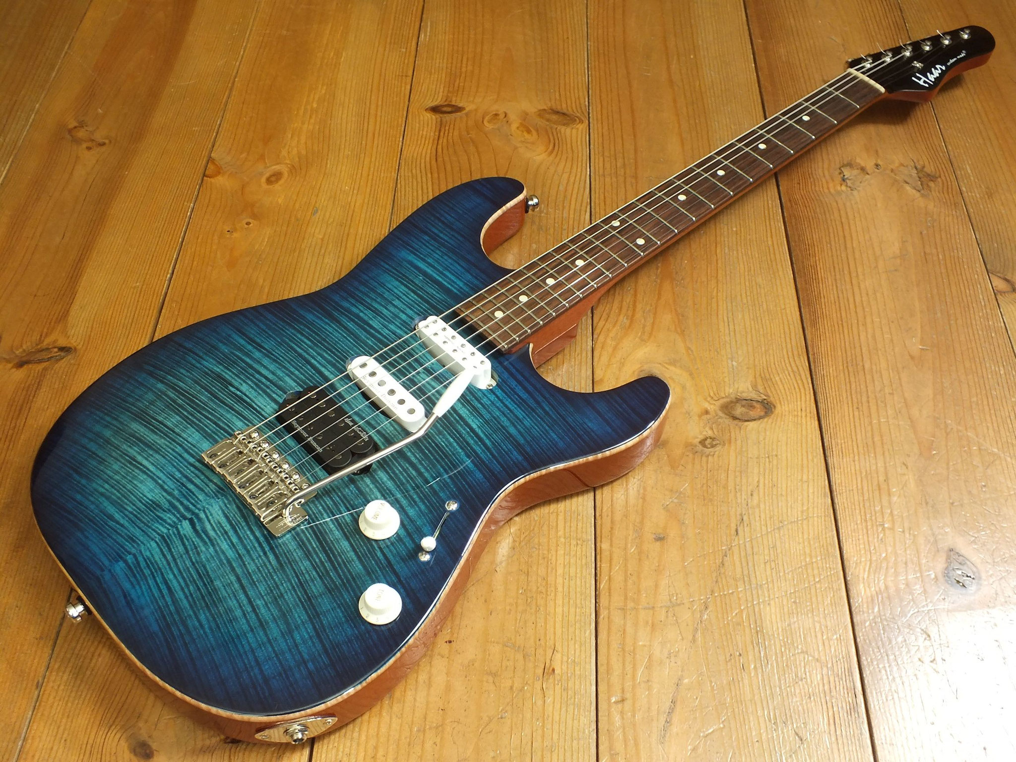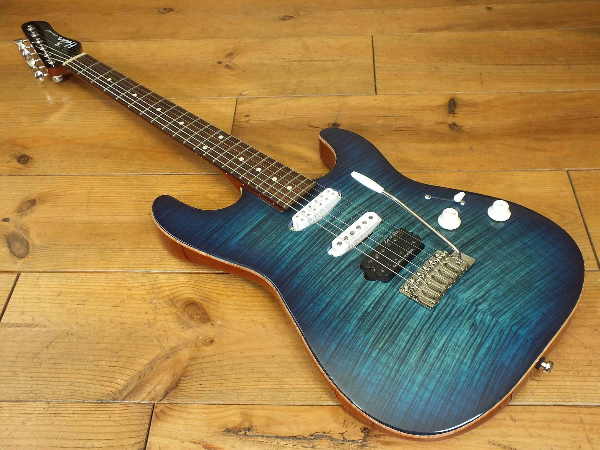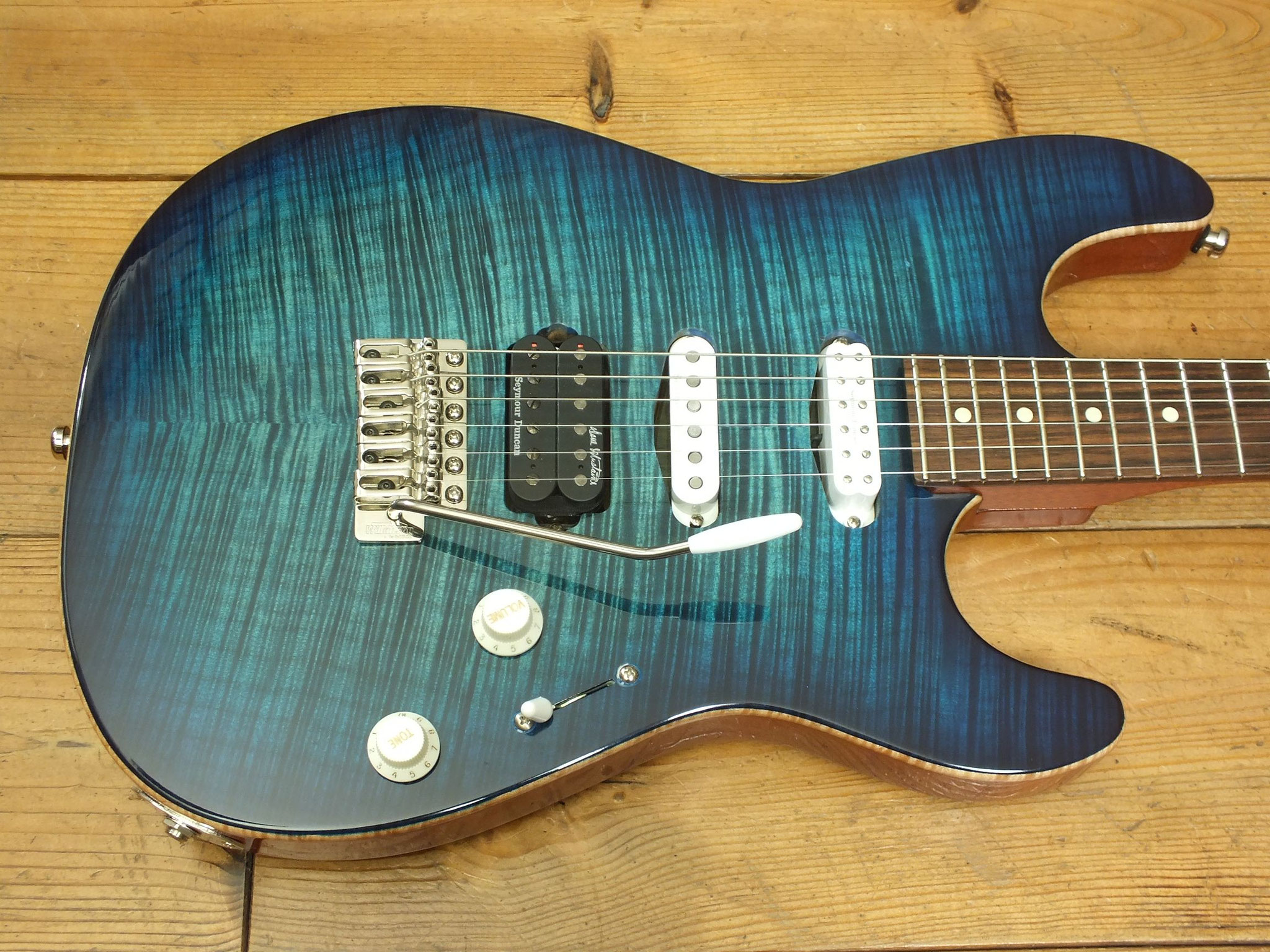 Mahagoni-Body mit wunderschönem "5A Flamed Maple Top" im transparenten Blueburst Finish.