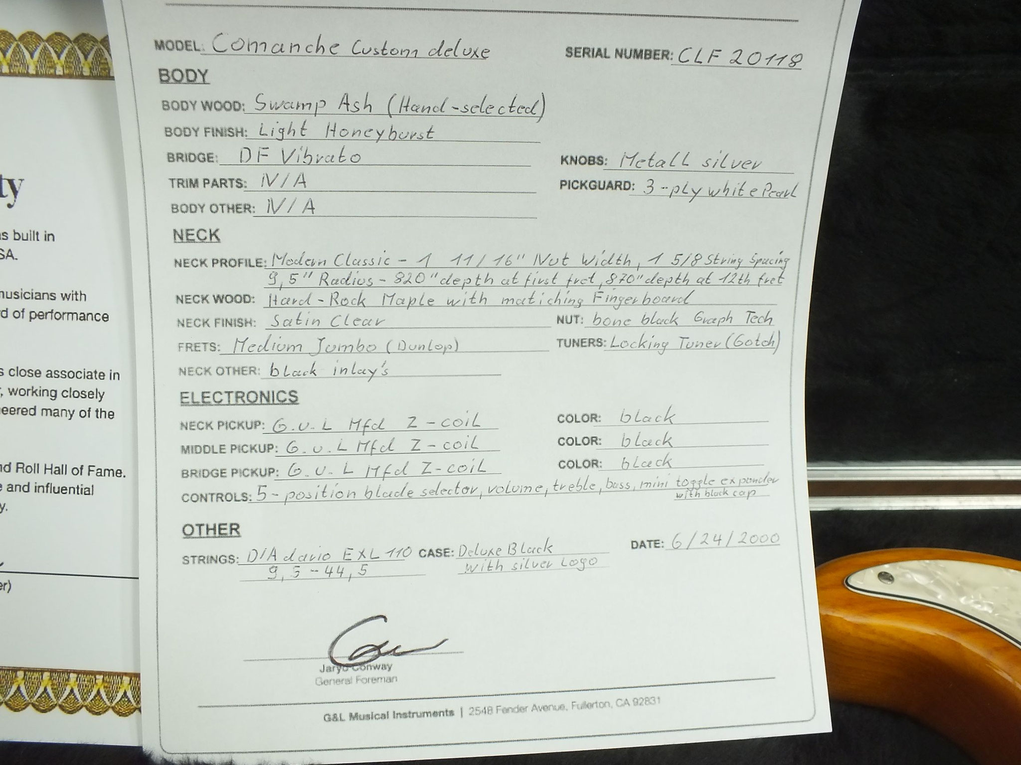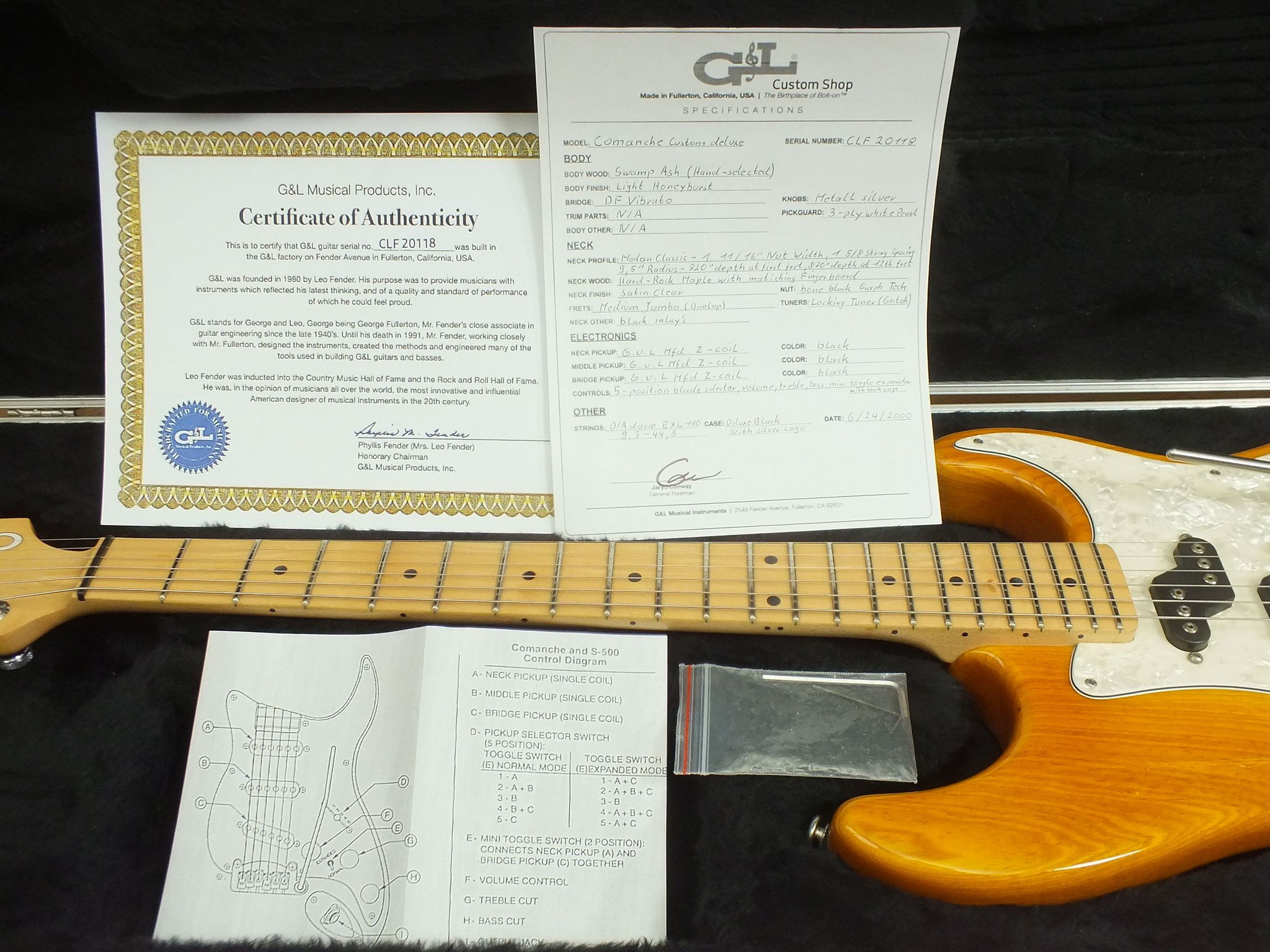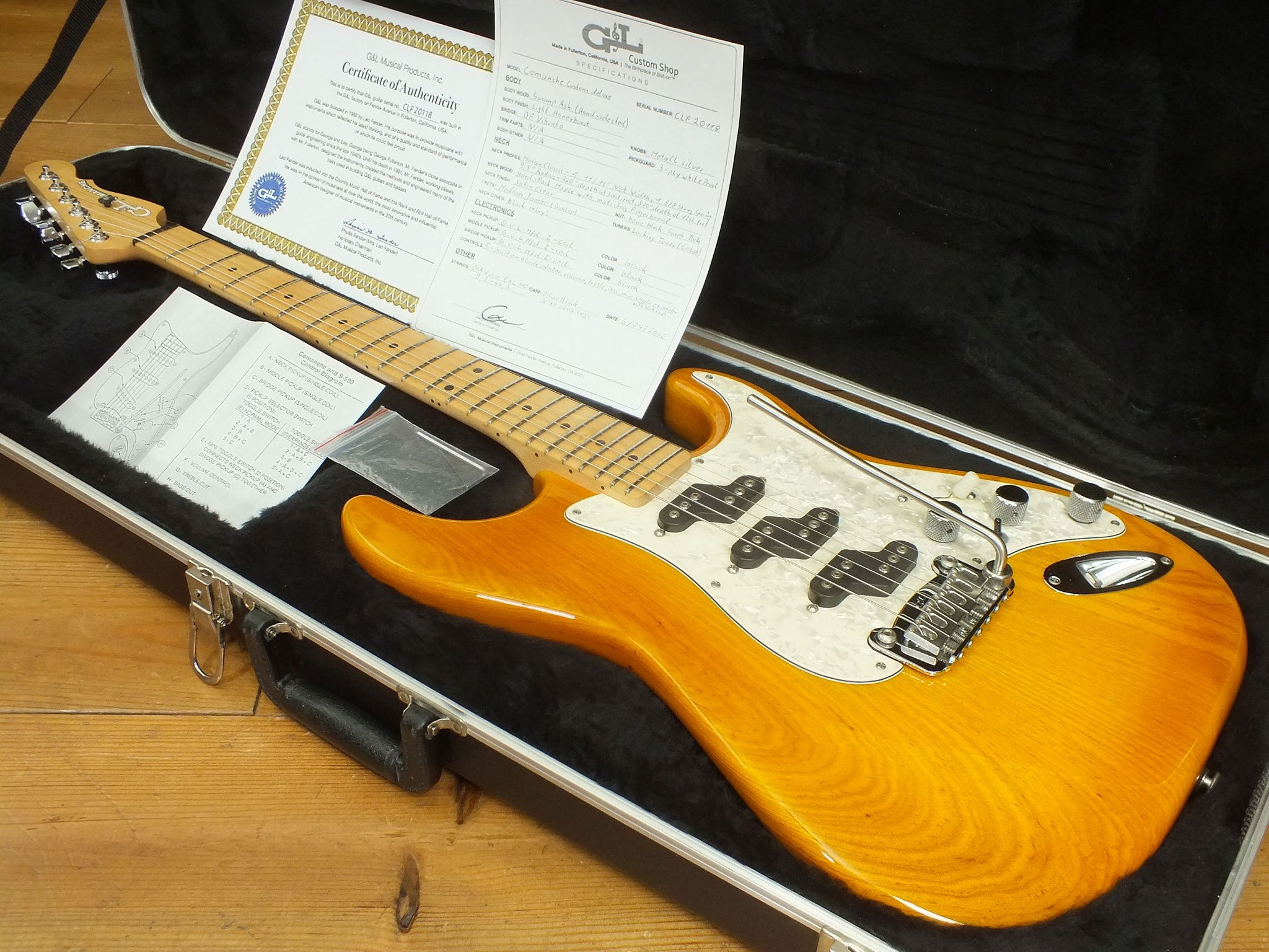 Die Comanche kommt wie abgebildet im originalen G&L Deluxe "Silver Logo" Case inklusive Custom Shop Zertifikat, Spec Sheet sowie weiterem Zubehör.