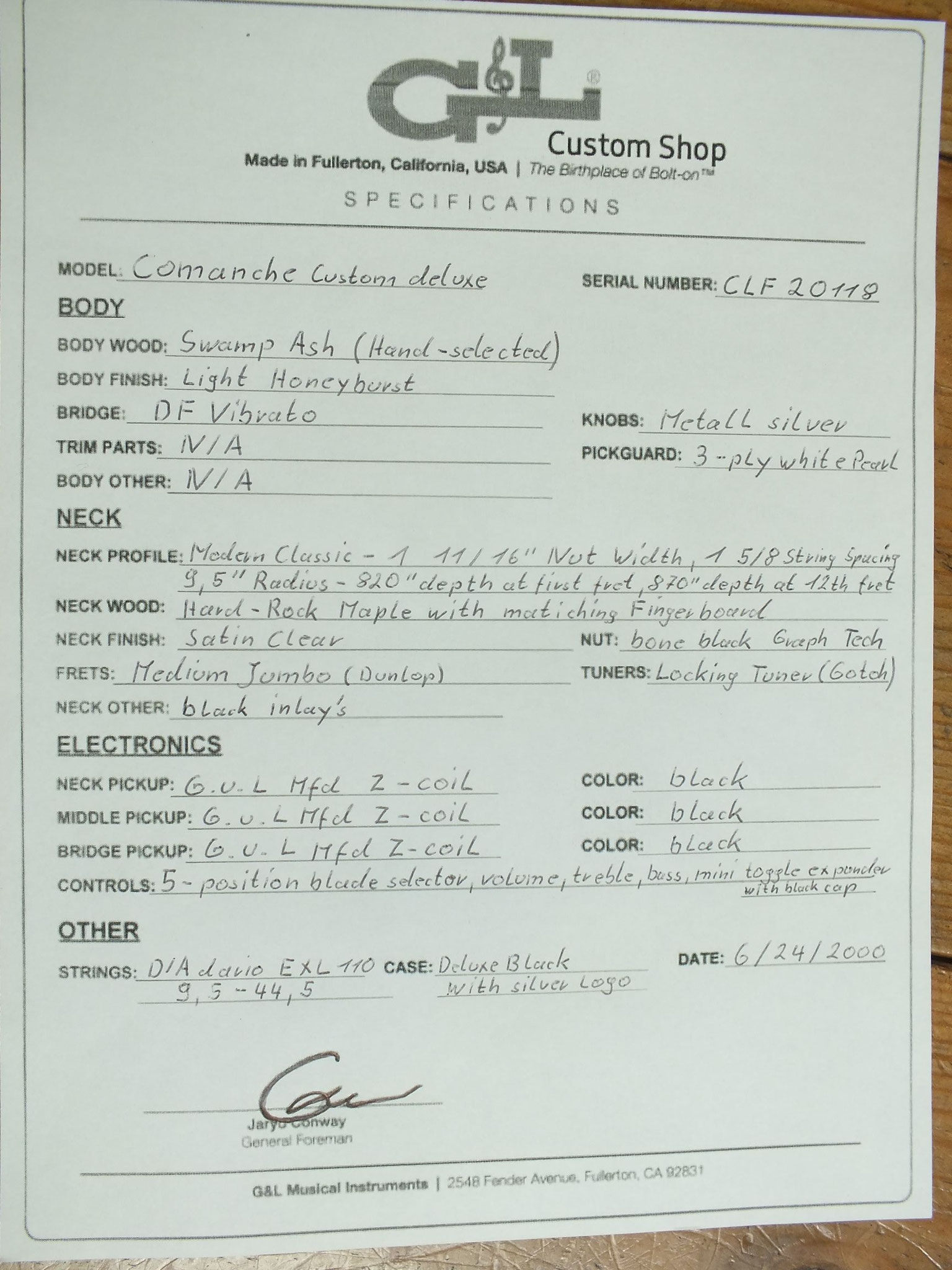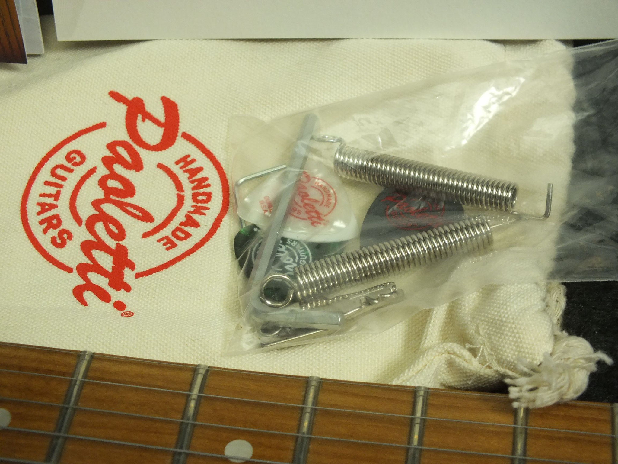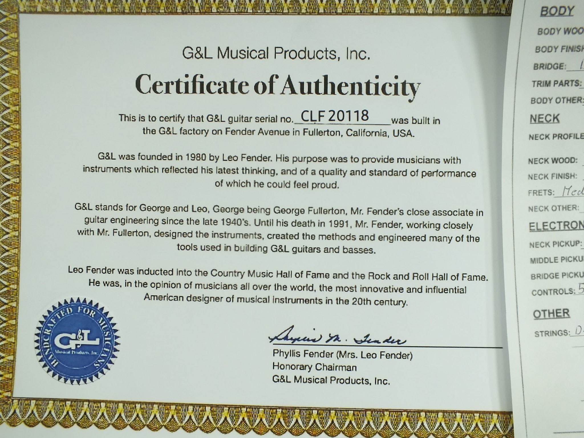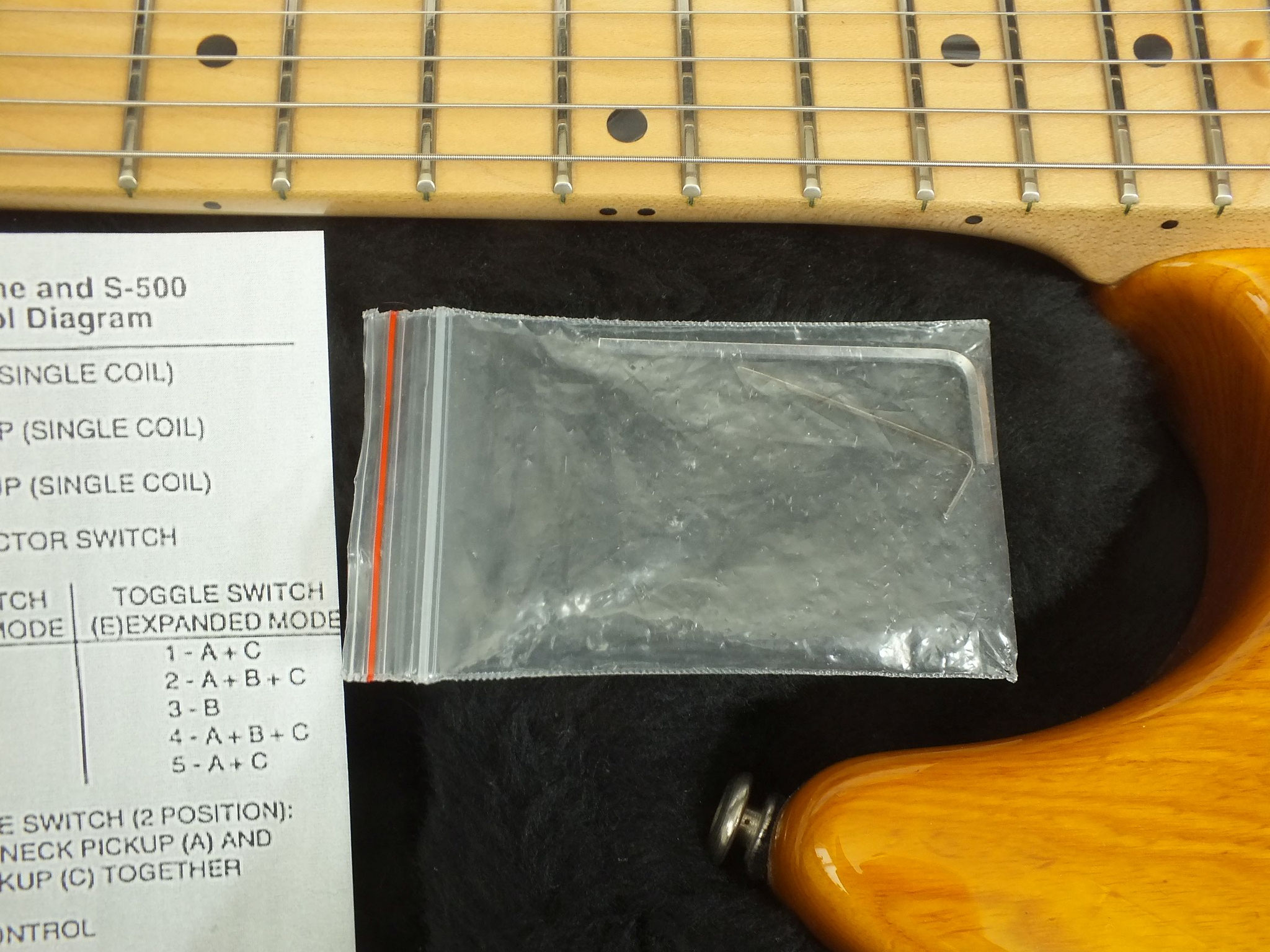 Die Comanche kommt wie abgebildet im originalen G&L Deluxe "Silver Logo" Case inklusive Custom Shop Zertifikat, Spec Sheet sowie weiterem Zubehör.
