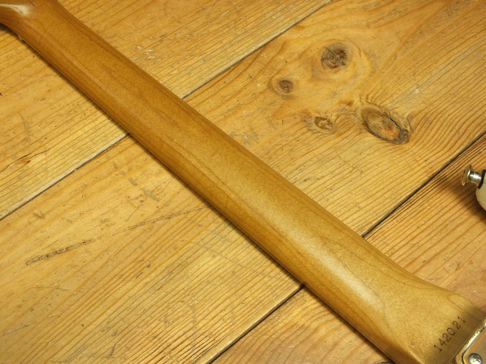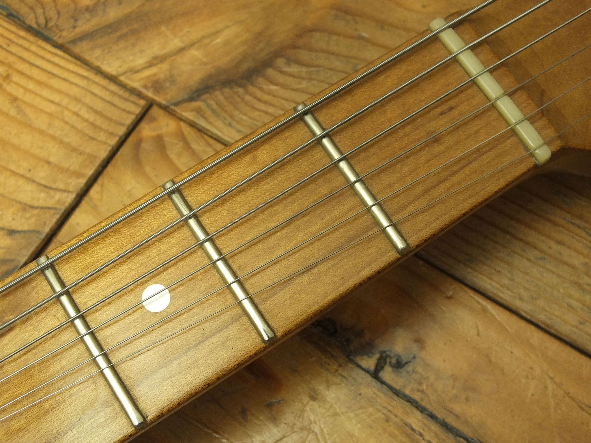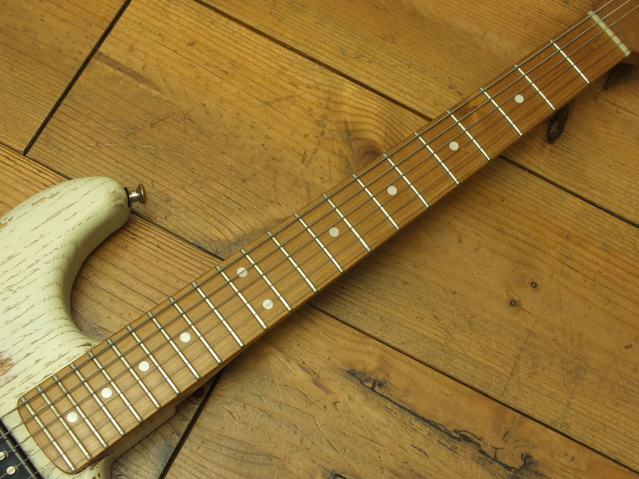 Handgefertigter Ahorn-Hals (mittleres "C Profil") mit Palisander-Griffbrett (7,25" Radius), 21 Medium-Bünden und Vintage Tuners.
