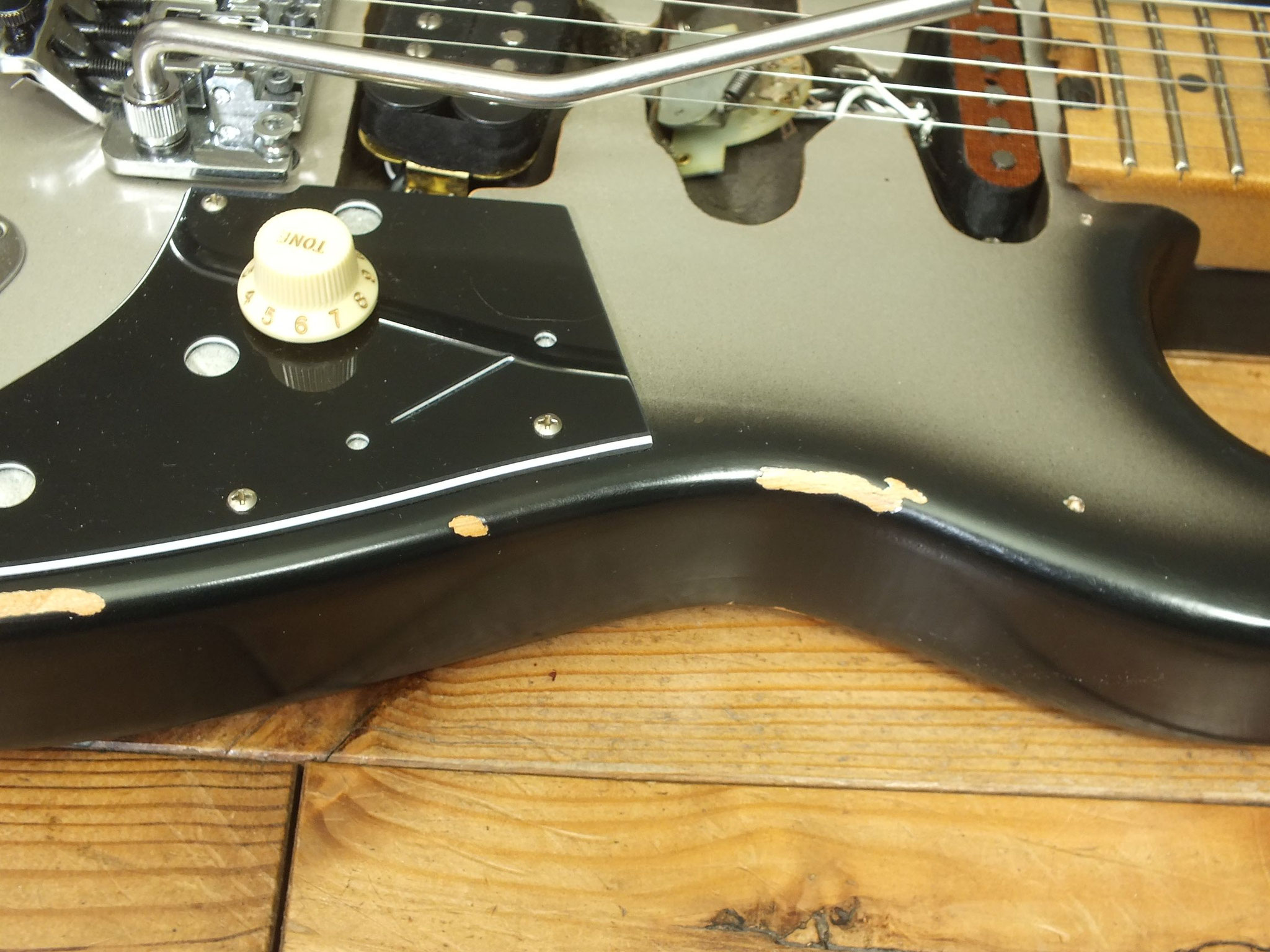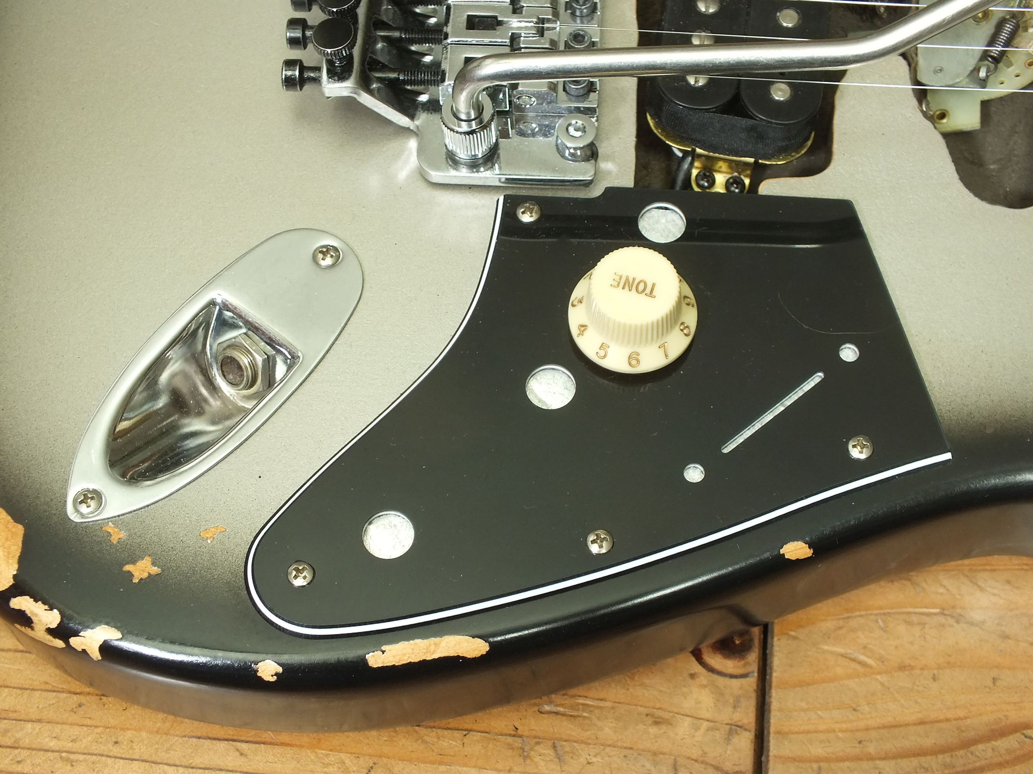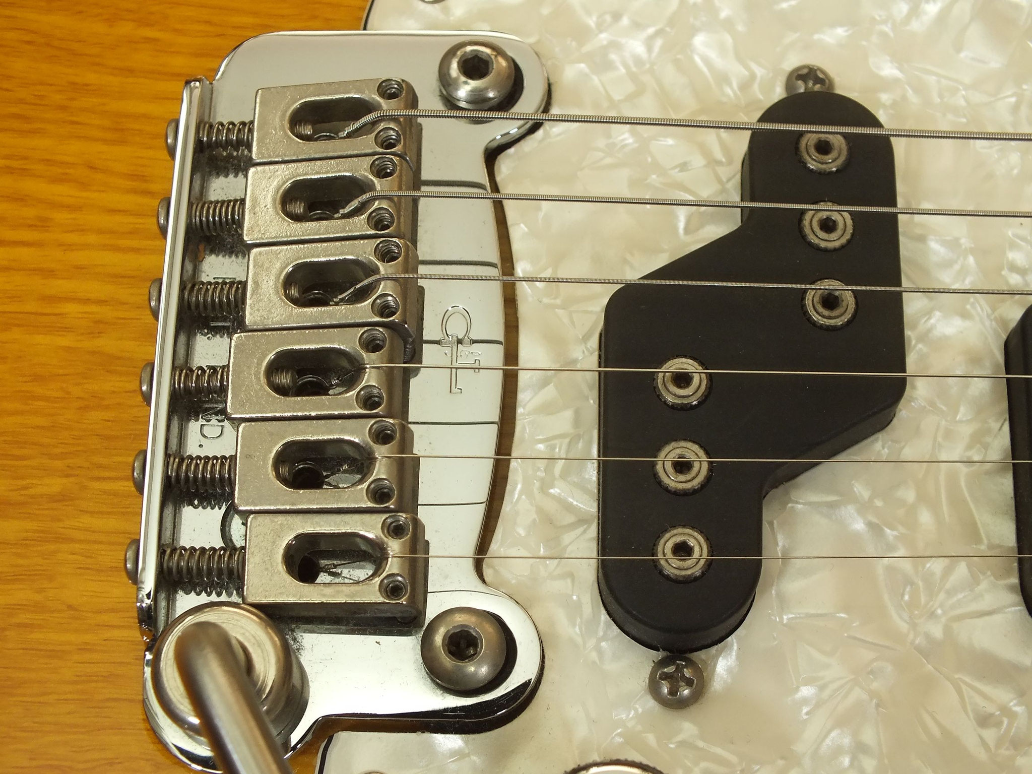 Das Gotoh VSVG Vintage Tremolo ist aktuell aufliegend eingestellt, und arbeitet in Kombination mit den Klemm-Mechaniken gewohnt zuverlässig.