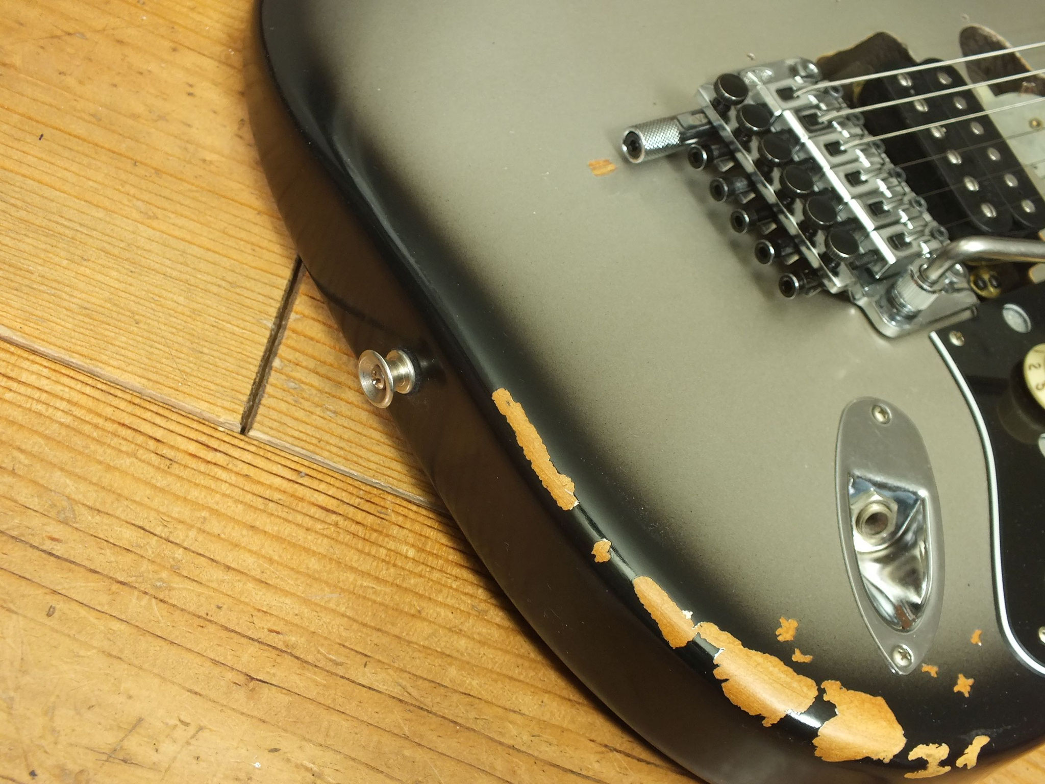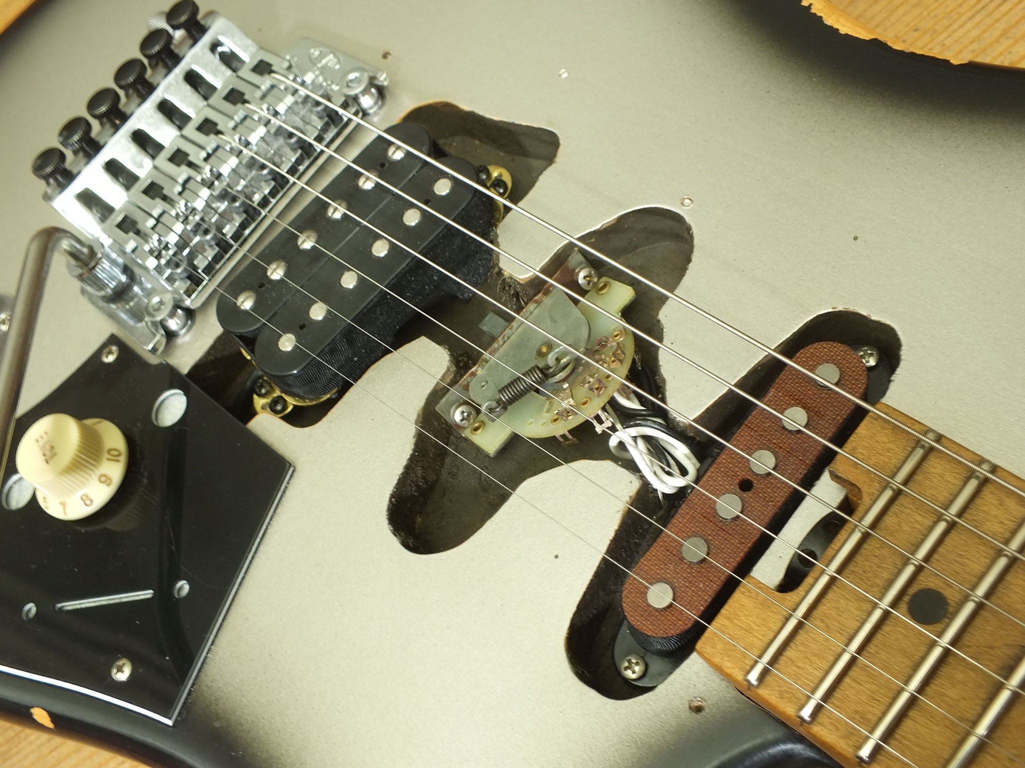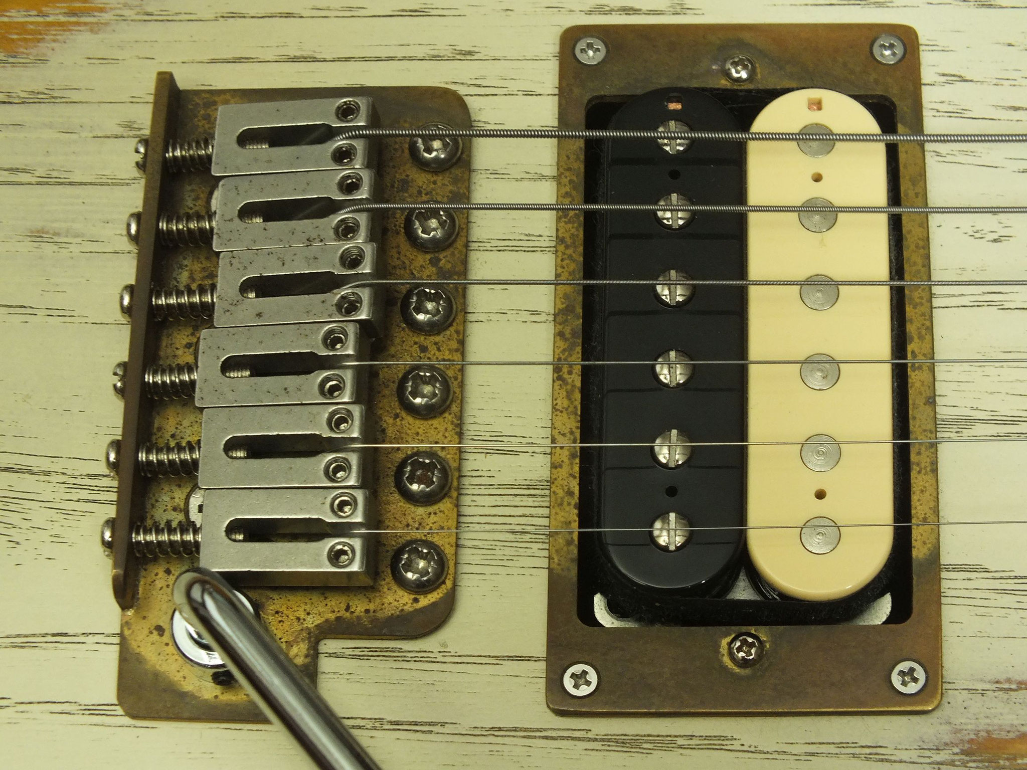 Das Gotoh VSVG Vintage Tremolo ist aktuell aufliegend eingestellt, und arbeitet in Kombination mit den Klemm-Mechaniken gewohnt zuverlässig.