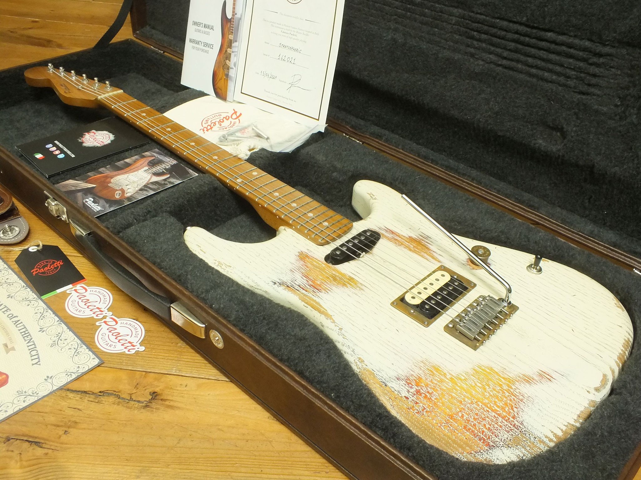 Gitarren aus der italienischen Boutique-Schmiede von Fabrizio Paoletti haben eine Sonderstellung. Sie sind nicht nur optisch einzigartig gestaltet, auch die verwendeten Materialien sind von höchster Güte und absolut eigenständig. So verwendet Paoletti für die Bodies konserviertes Kastanienholz, das aus über 130 Jahre alten Weinfässern gewonnen wird. Das sieht nicht nur spektakulär aus, sondern verleiht den Instrumenten auch ihren einmaligen Ton. Alles natürlich in Handarbeit gefertigt.