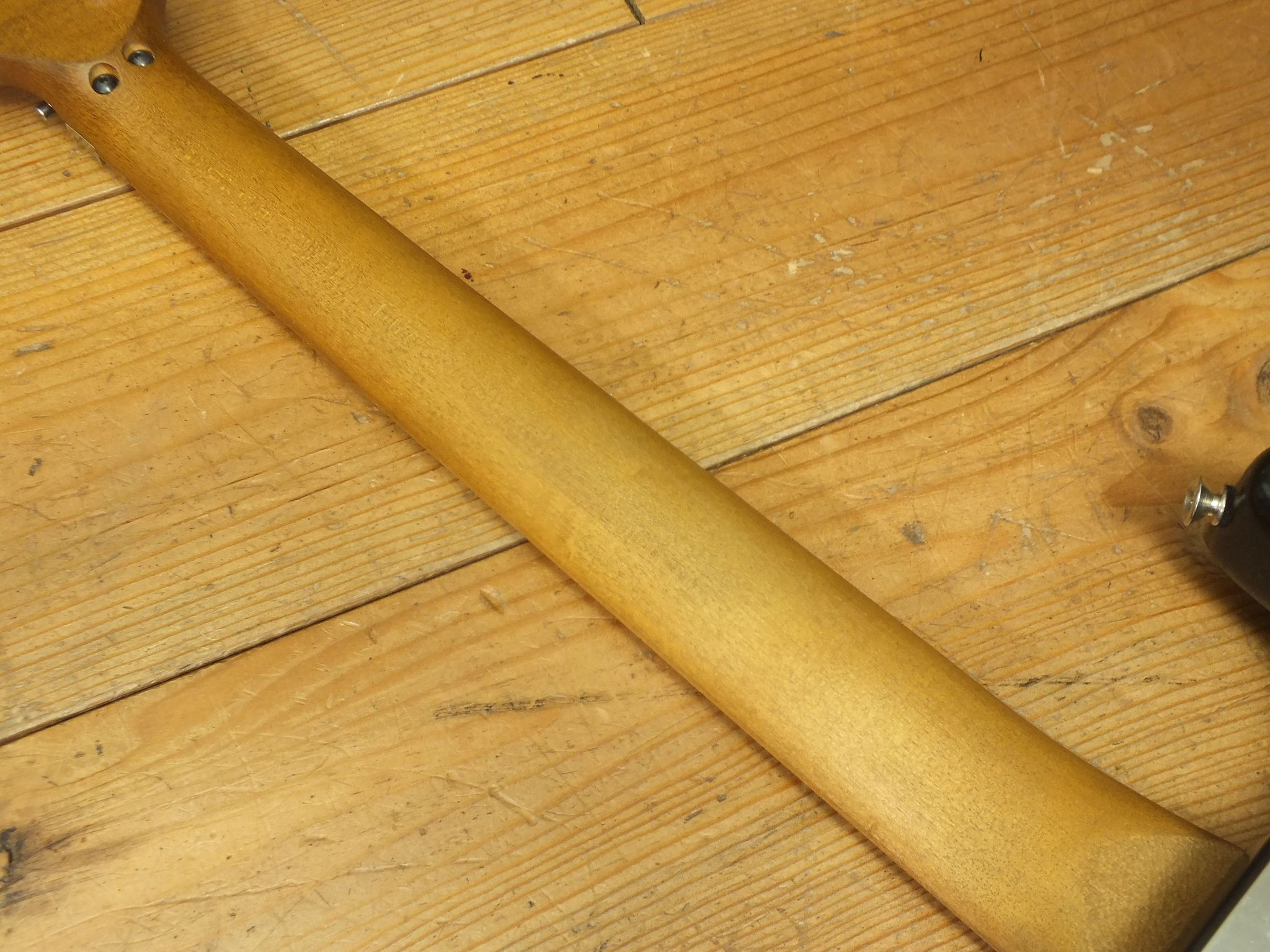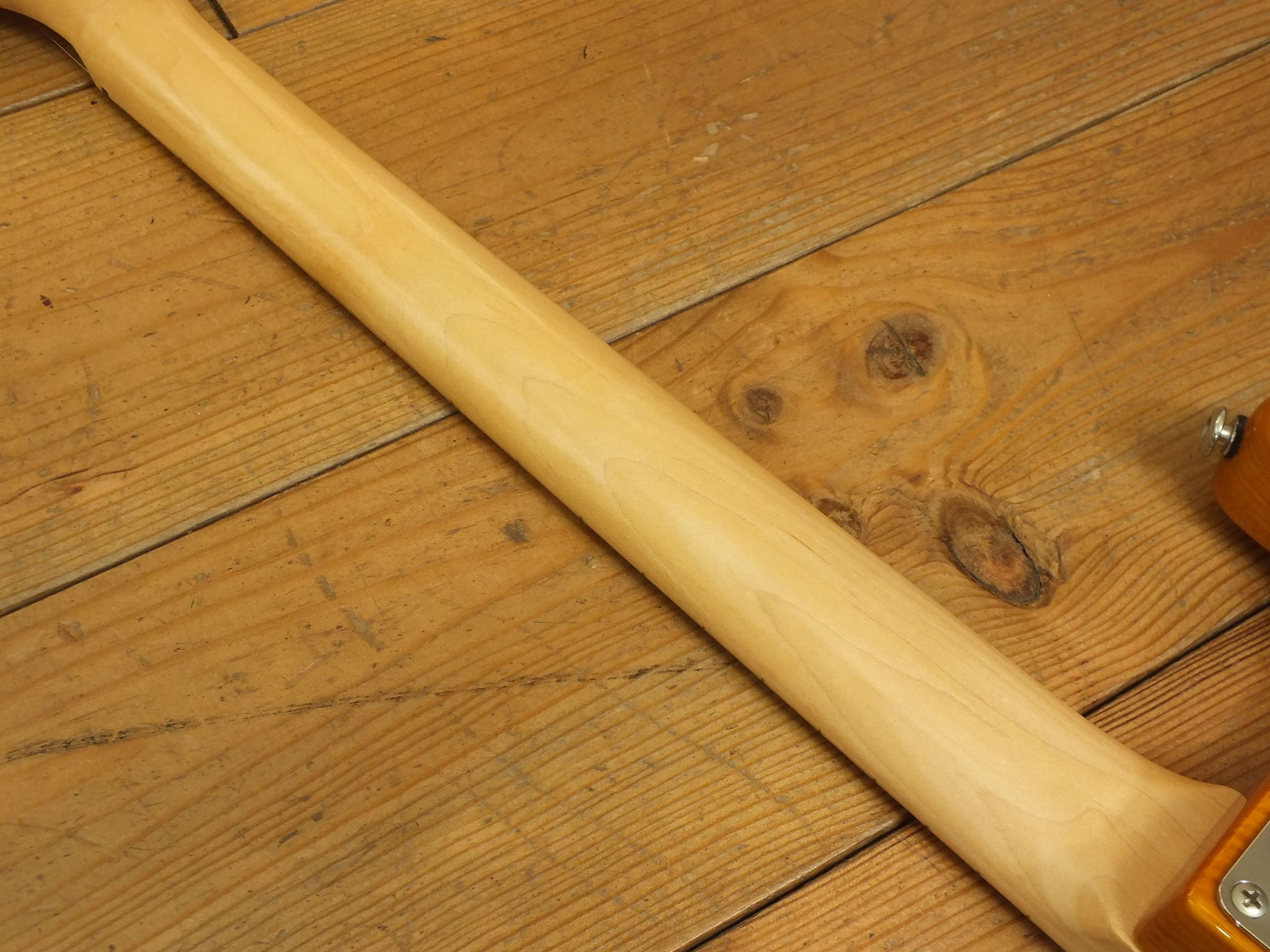Gerösteter kanadischer Ahorn-Hals ("Medium C" Profil) mit ebenfalls geröstetem Ahorn-Griffbrett (12" Radius), 22 Dunlop 6110 Jumbo-Bünden, Knochensattel, Reversed Headstock und Kluson Modern Deluxe Tuners.