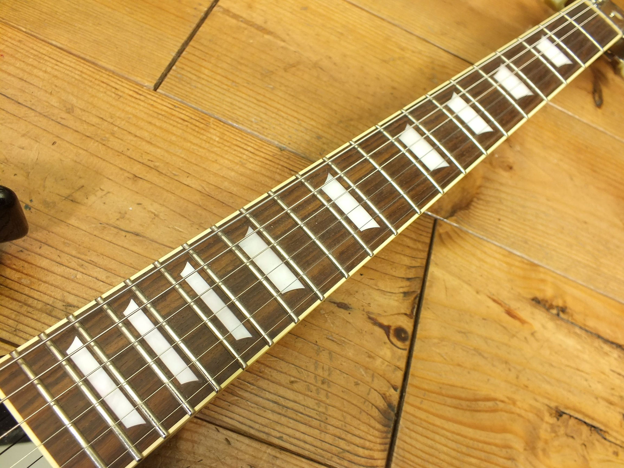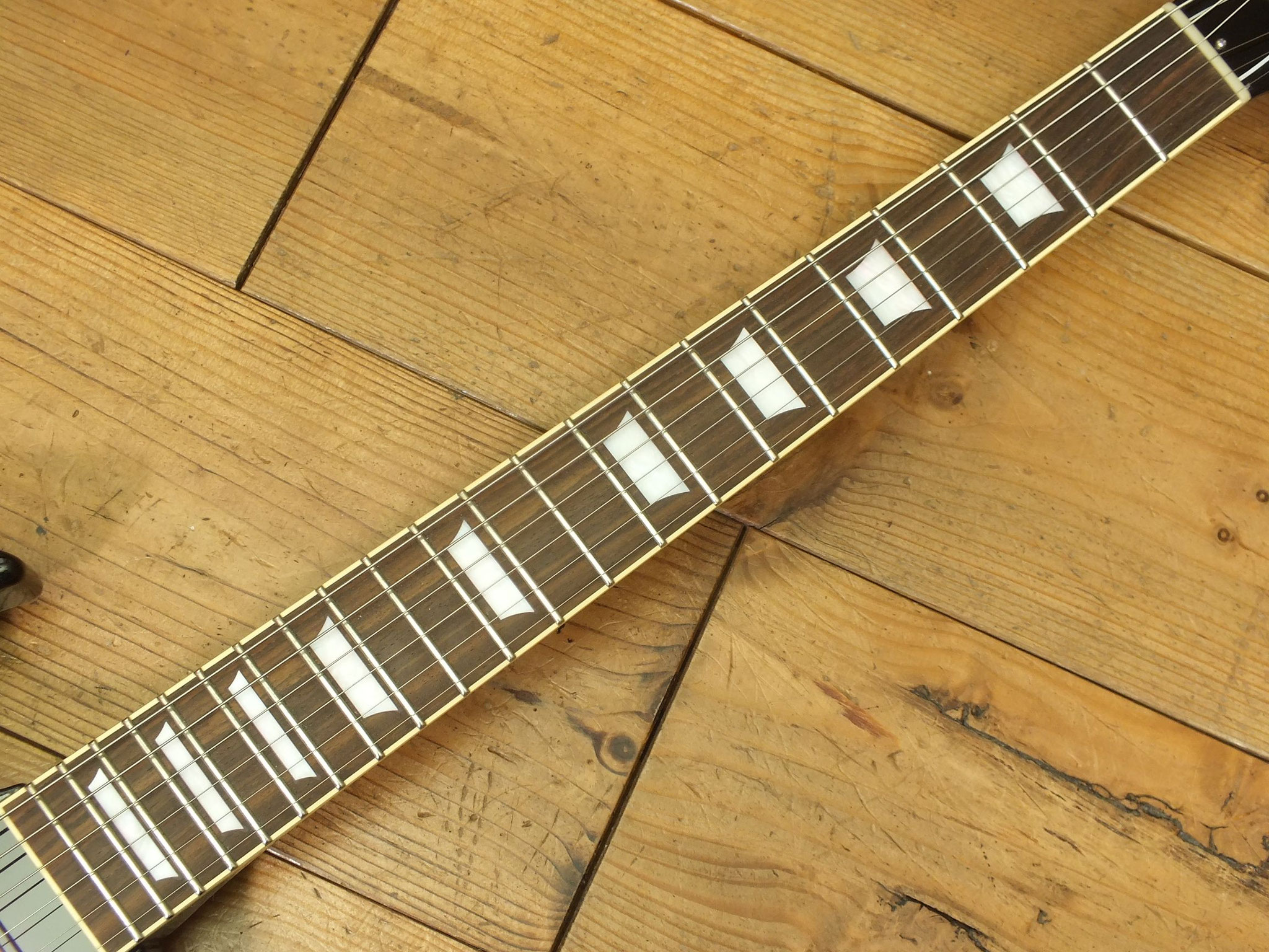 Das Griffbrett besteht aus Ebenholz mit "Angel Wing" Inlays und 24 Bünden, welche ab dem 12. Bund etwas schmaler ausfallen, um die Bespielbarkeit in den oberen Lagen zu erleichtern.
