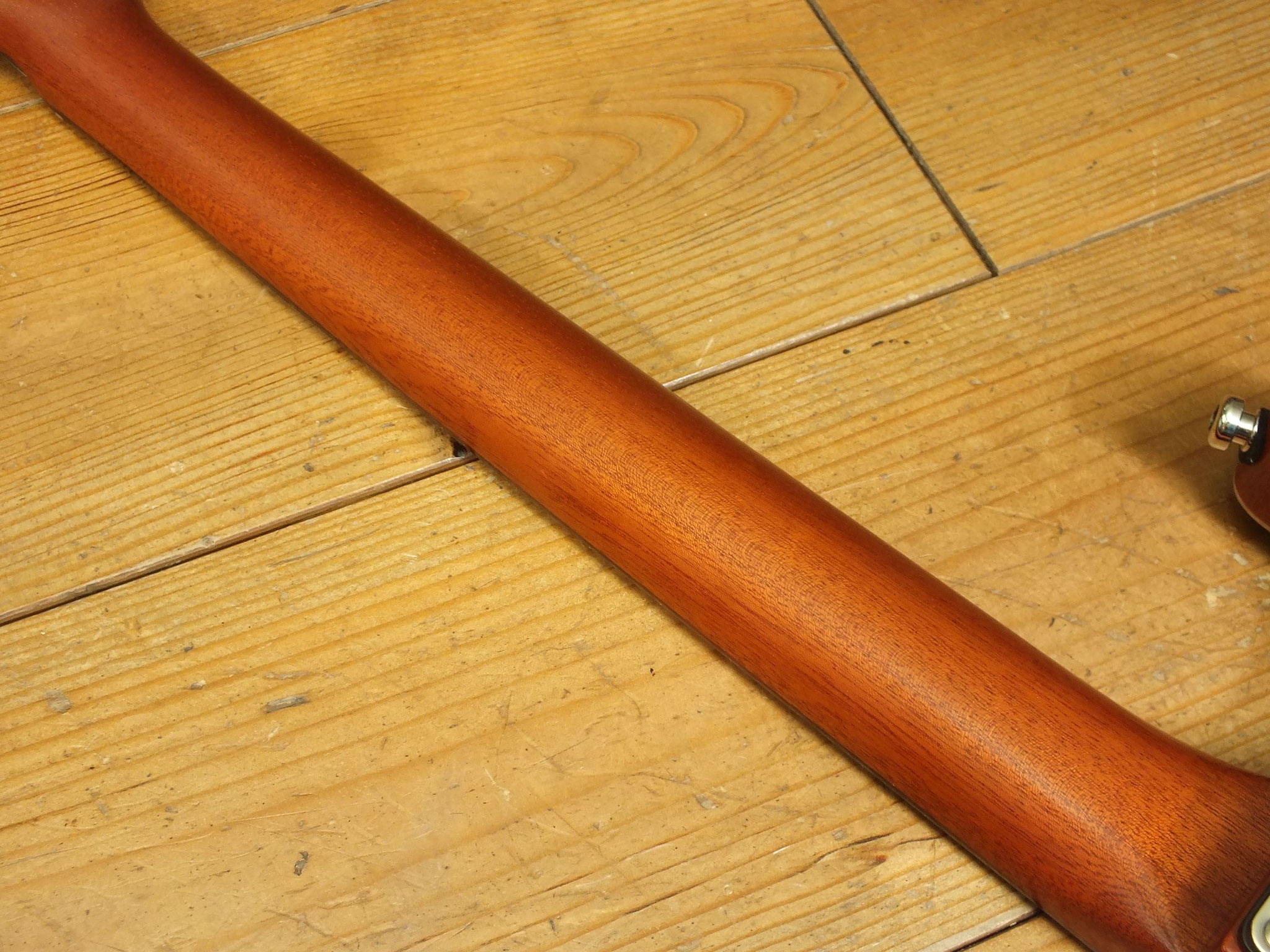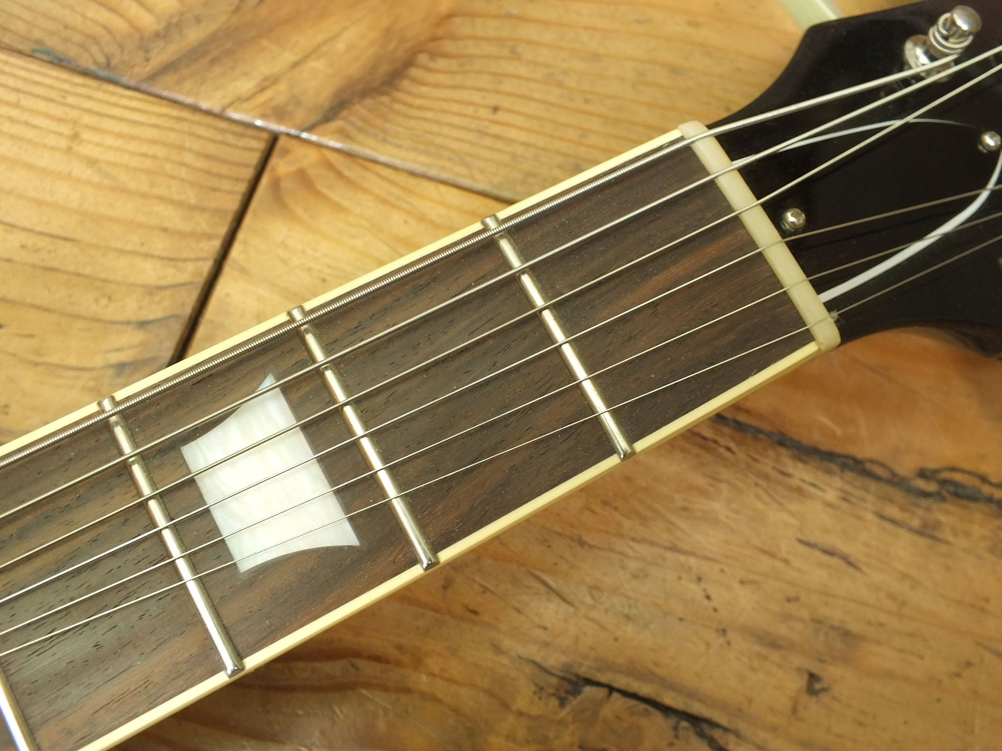 Mahagoni-Hals (mittlelstarkes Pofil - entspricht etwa dem Gibson 60s Vorbild) mit Palisander-Griffbrett, 22 Medium-Jumbo-Bünden und "Rose-Inlay".