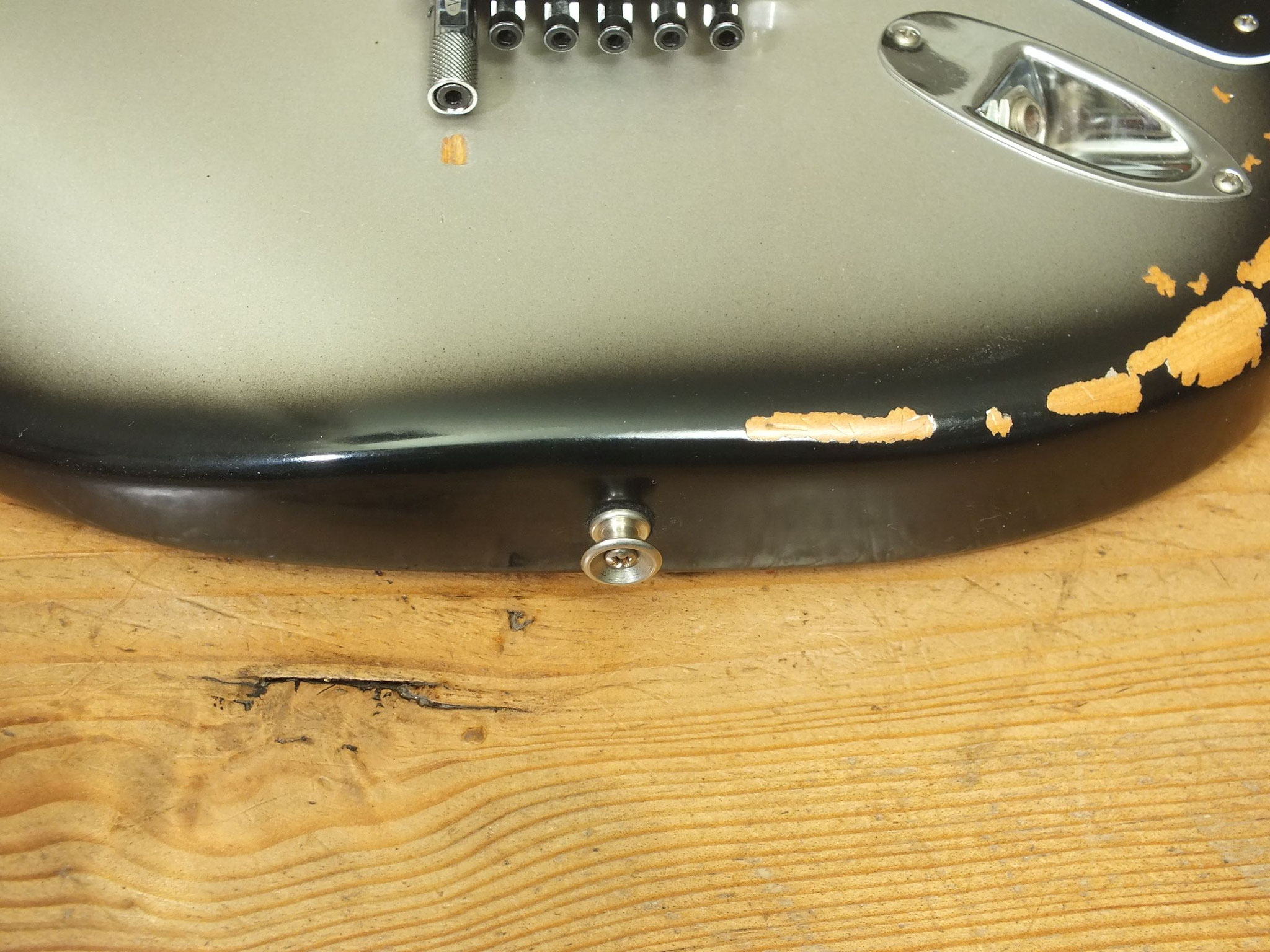 Original Fender Vintage Tremolo. Mit fünf Federn fest aufliegend montiert - ein typischer Gilmour Stummel-Arm liegt bei.