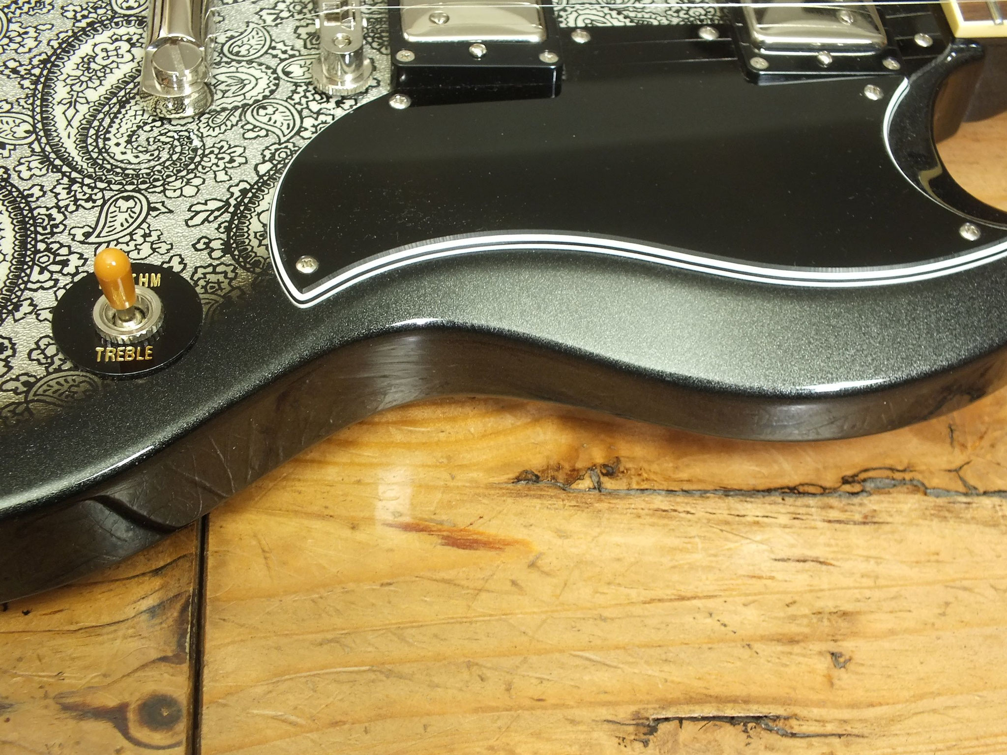 Gepflegter und sauberer Top-Zustand mit allenfalls winzigen Gebrauchsspuren - siehe Bilder. Bei dem kleinen, hellen Fleck auf der Halsrückseite handelt es sich um eine Farbanomalie und nicht um eine Beschädigung. Der Lack ist dort spiegelglatt.