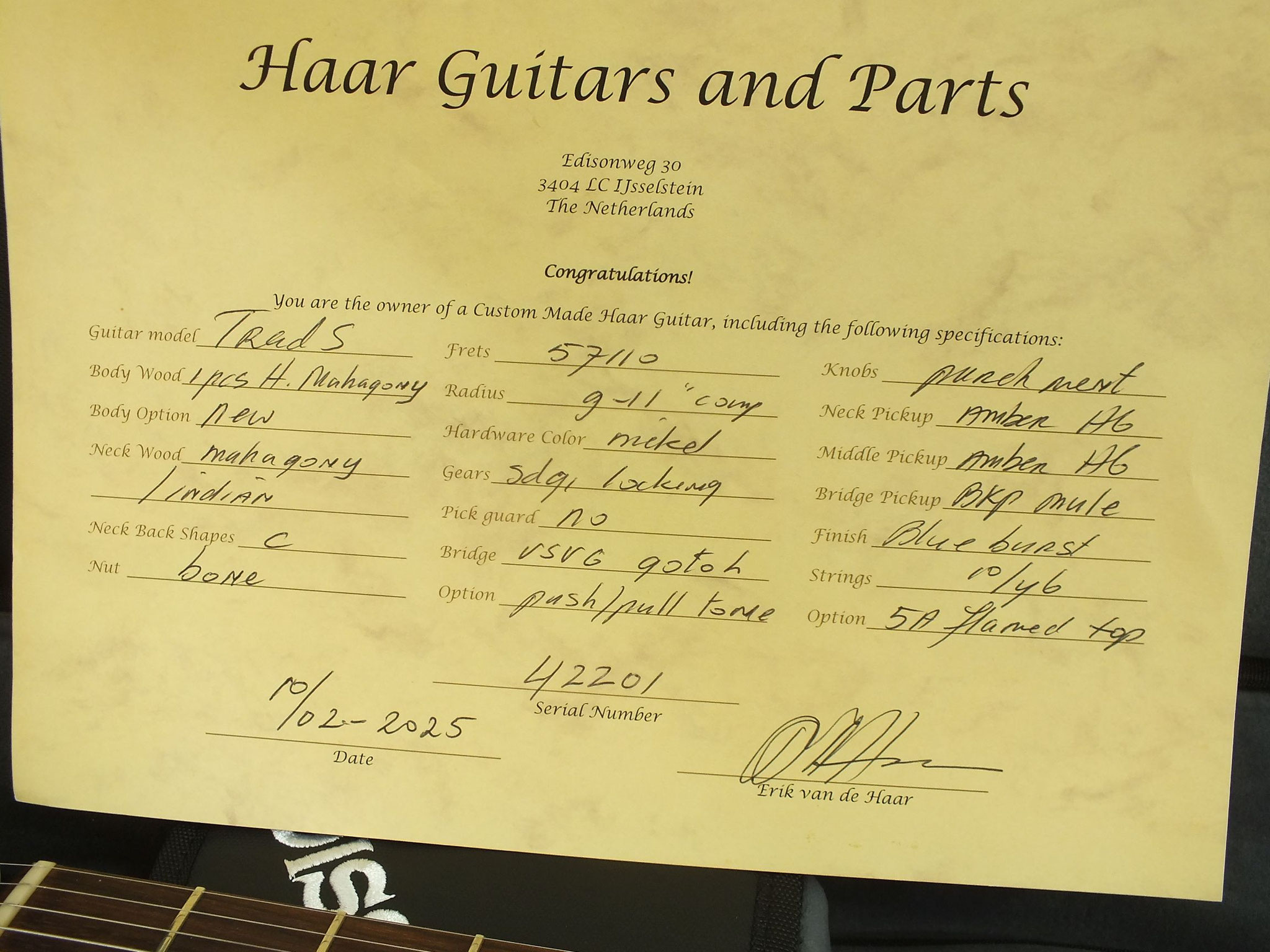 Kommt im originale Nik Huber Custom Shop Case inklusive Zertifikat und weiterem Zubehör wie abgebildet.