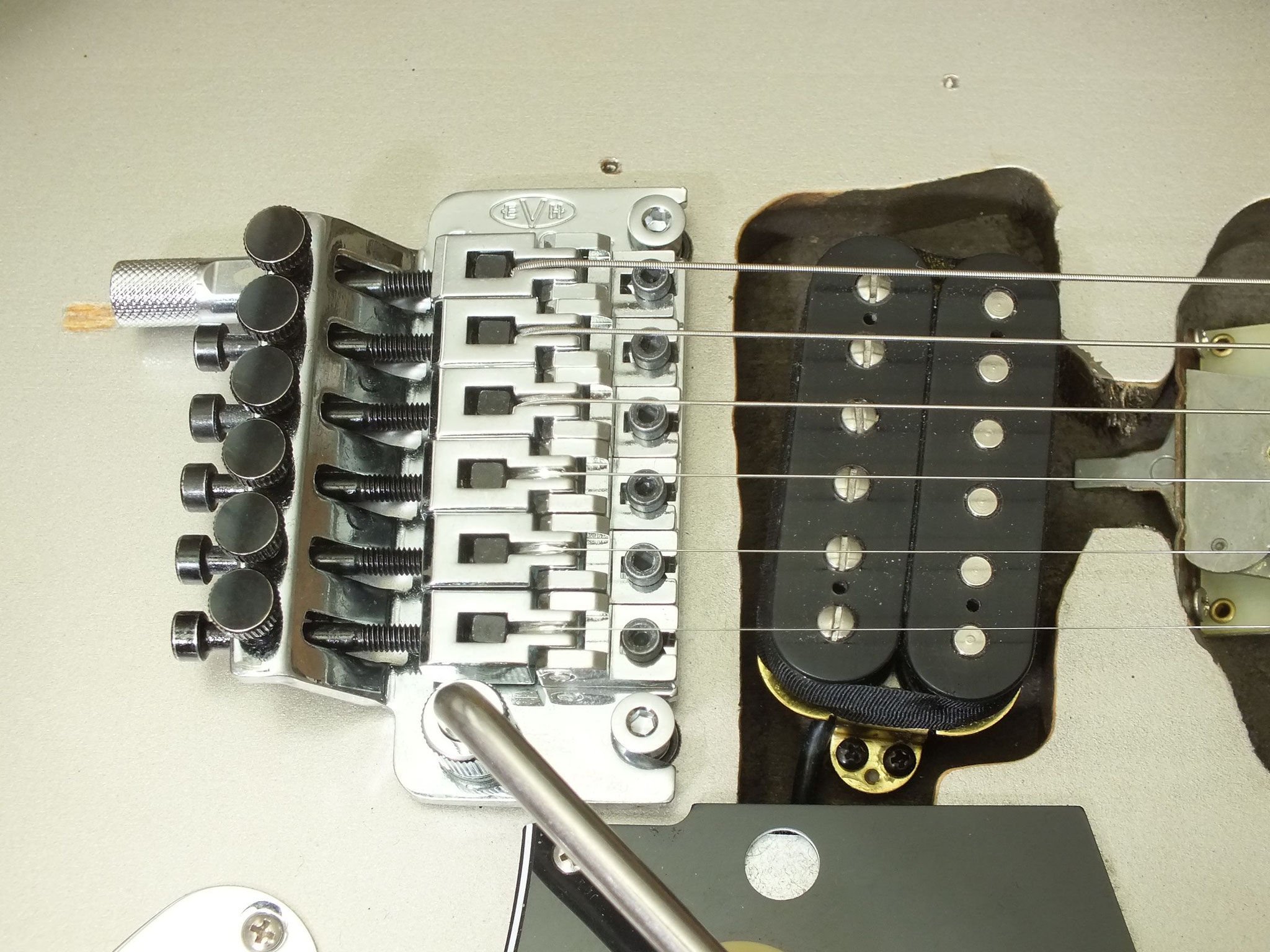 Bestückt mit einem EVH Wolfgang Humbucker-Pickup sowie lediglich einem Volume-Poti. Eddie-Fans wissen natürlich, warum dessen Knopf mit "Tone" beschriftet ist. Der Singlecoil am Hals sowie der in mittleren PU-Fräsung versenkte Pickup-Schalter sind wie beim Original nicht angeschlossen.