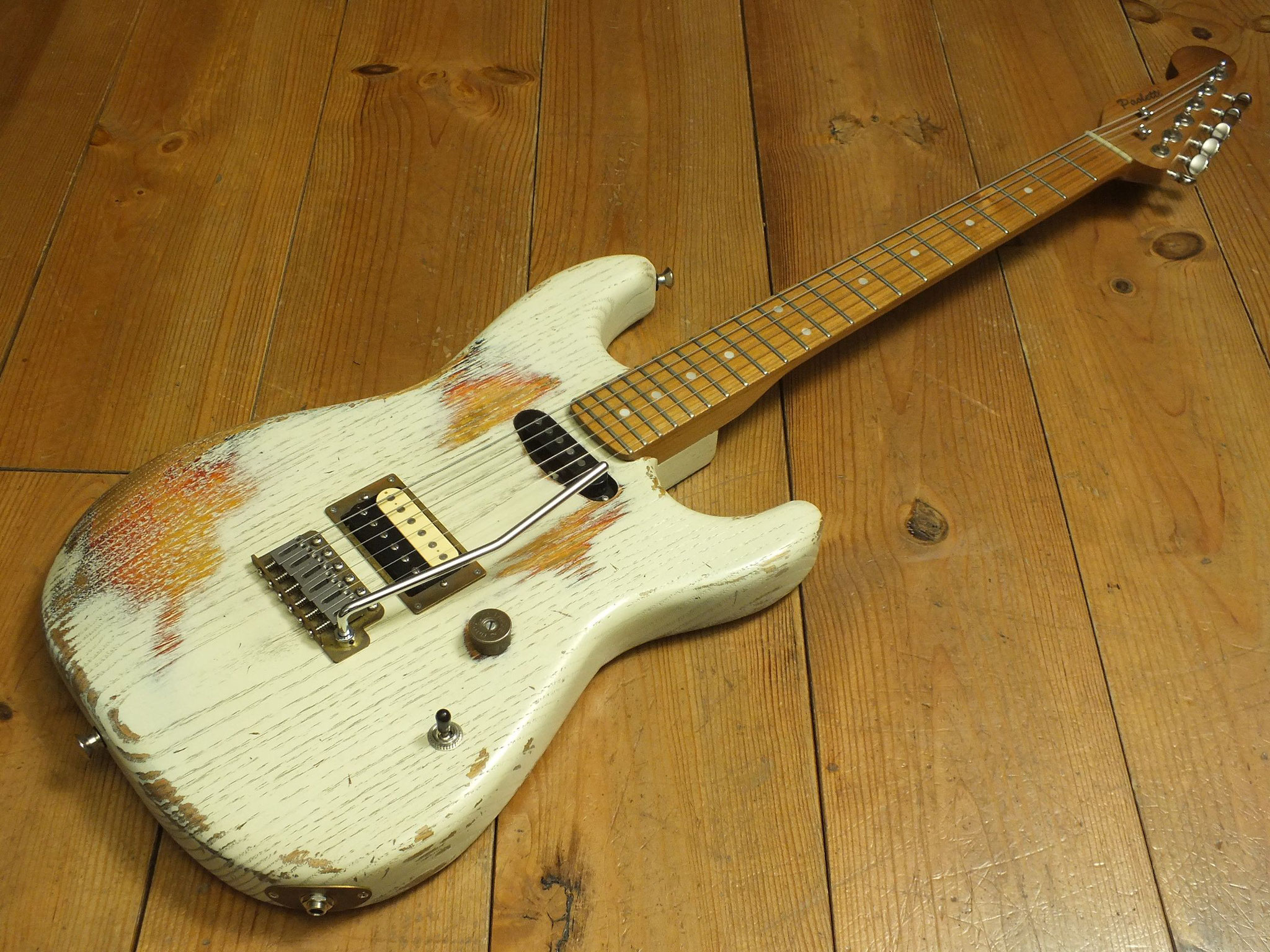 Hier ein Paoletti Strat-Style-Modell, das mit seiner etwas eigenwilligen Pickup-Bestückung besonders für Gitarristen aus dem härteren Lager interessant sein dürfte, aber auch durch aus universell einsetzbar ist.