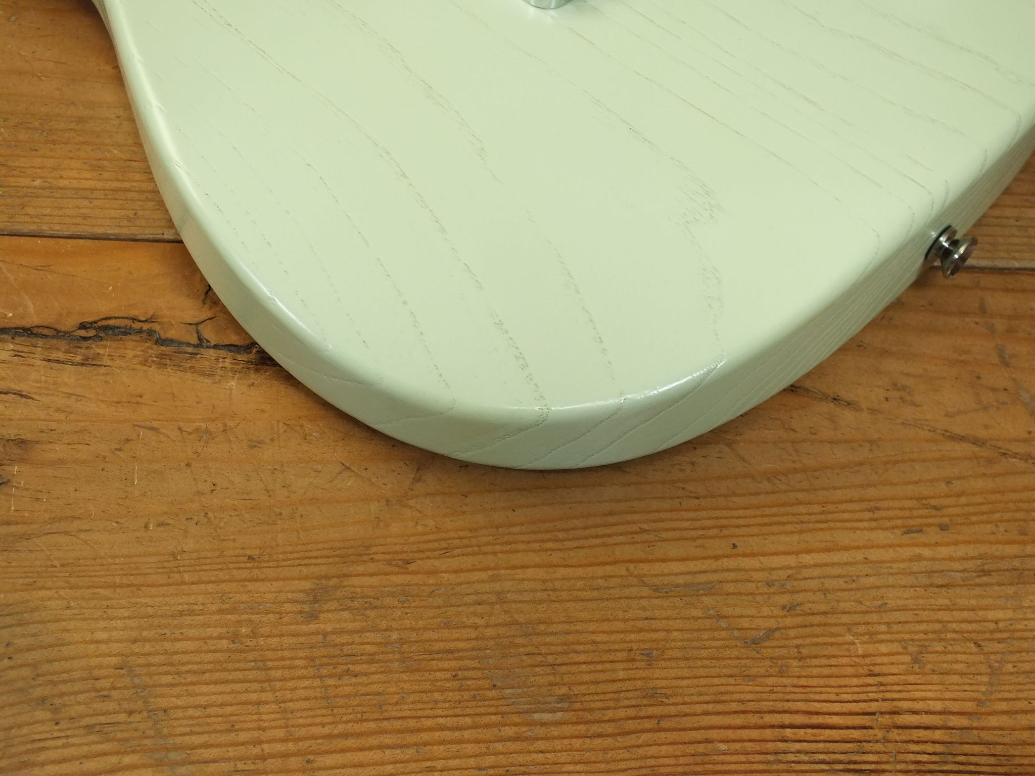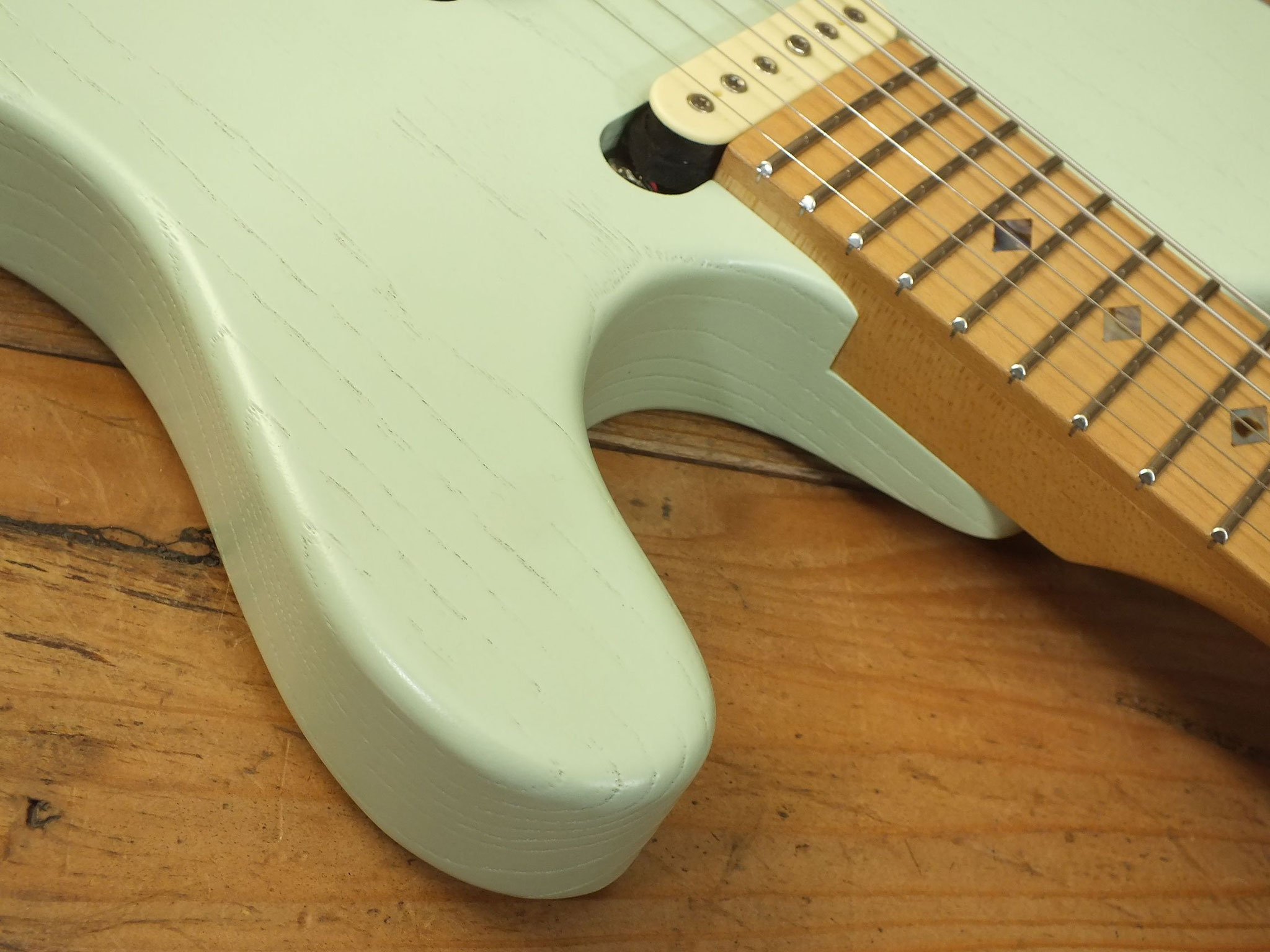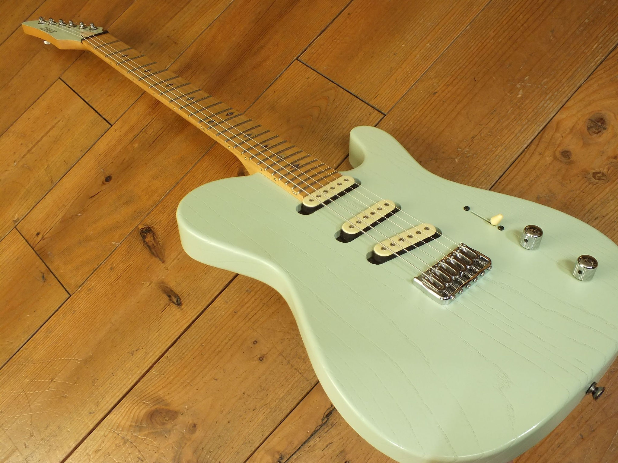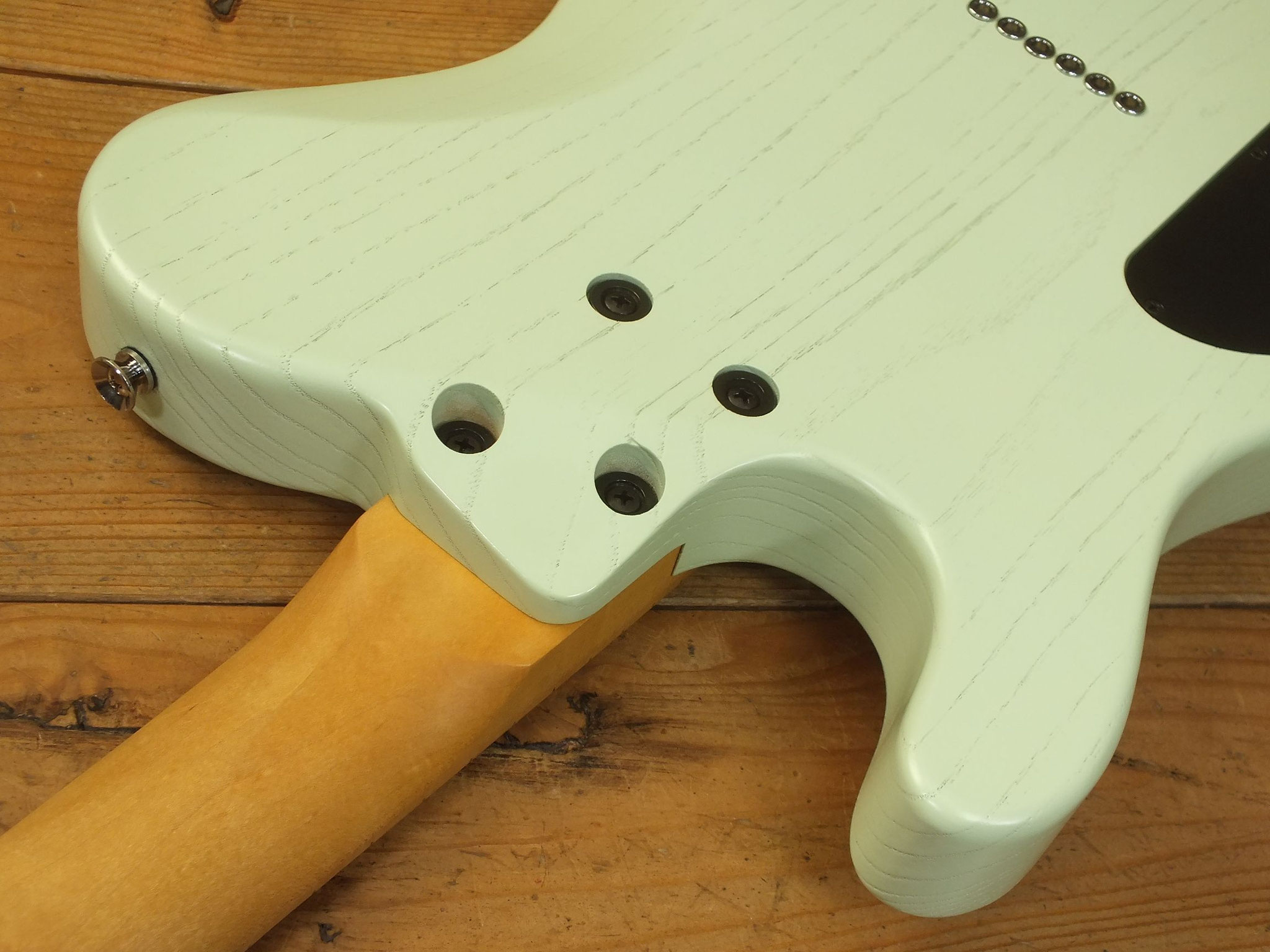 Konturierter Eschen-Body mit abgeflachtem Hals-Übergang im "Raw Tone Seafoam Green" Finish mit Hipshot Fixed Bridge und "Strings Through Body" Saitenführung.