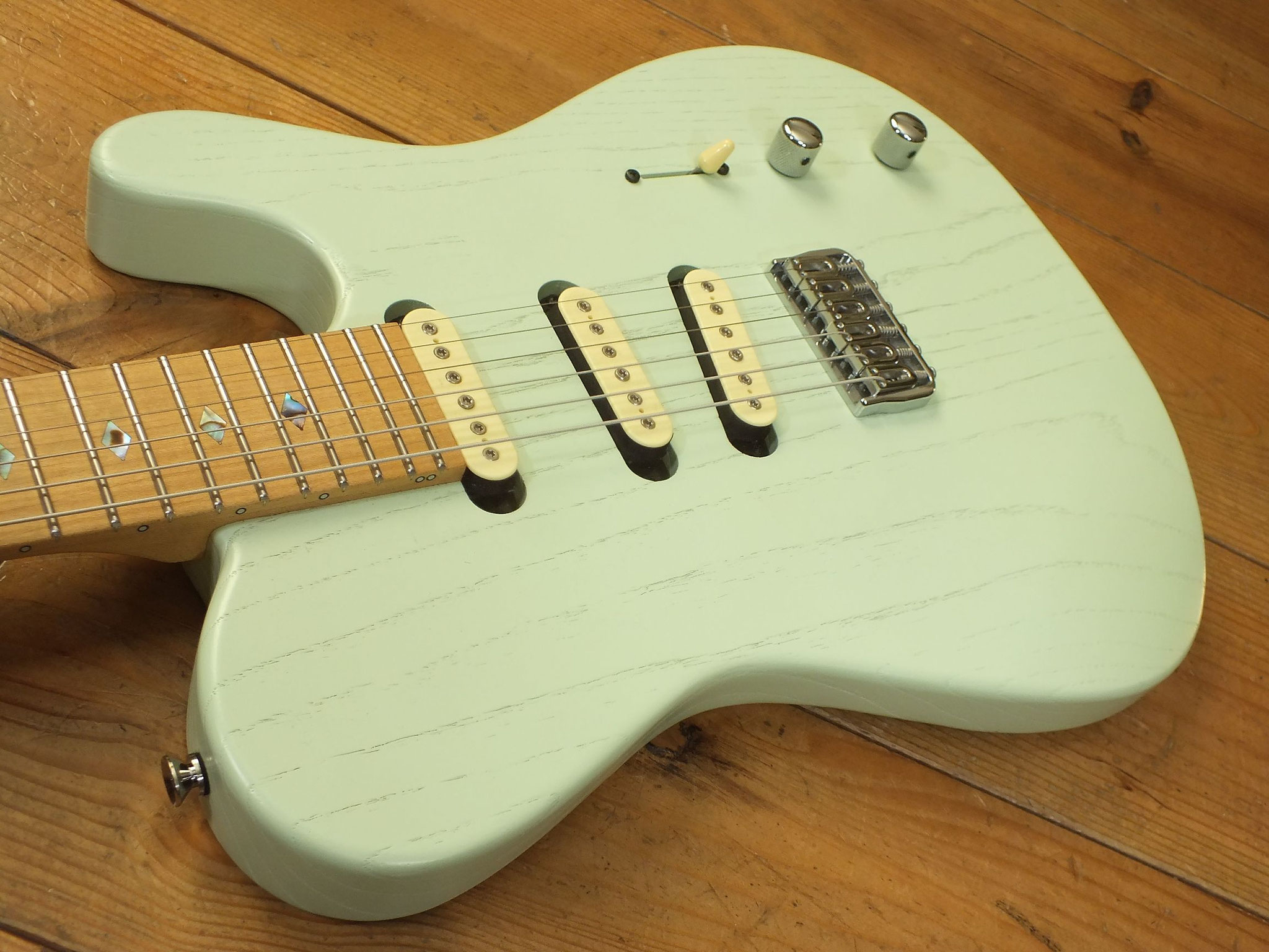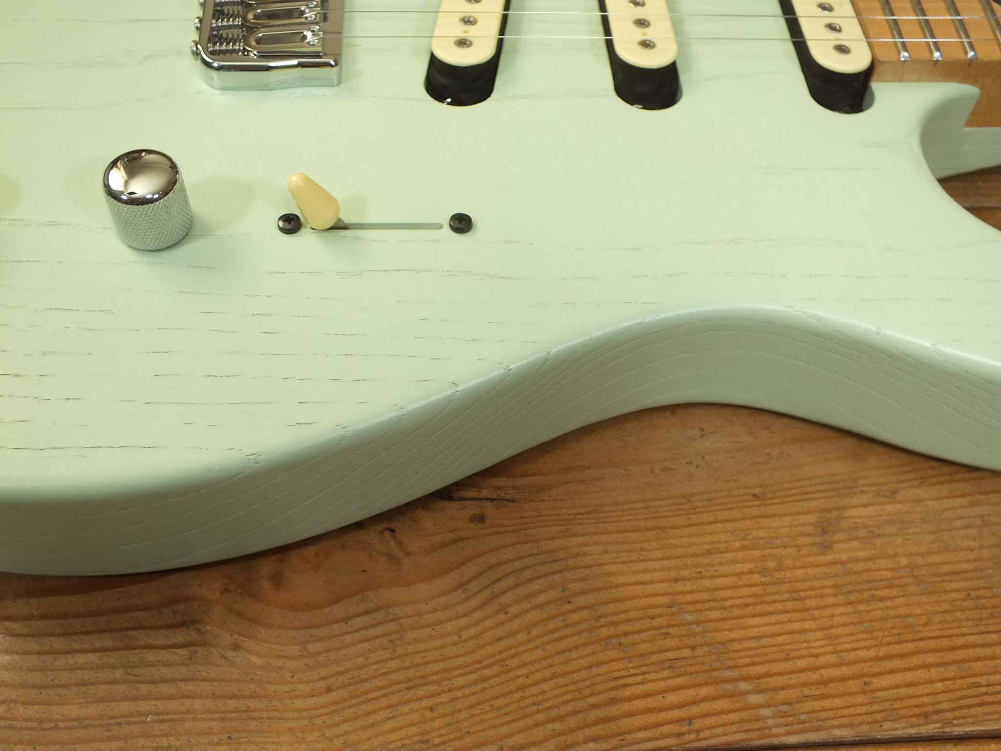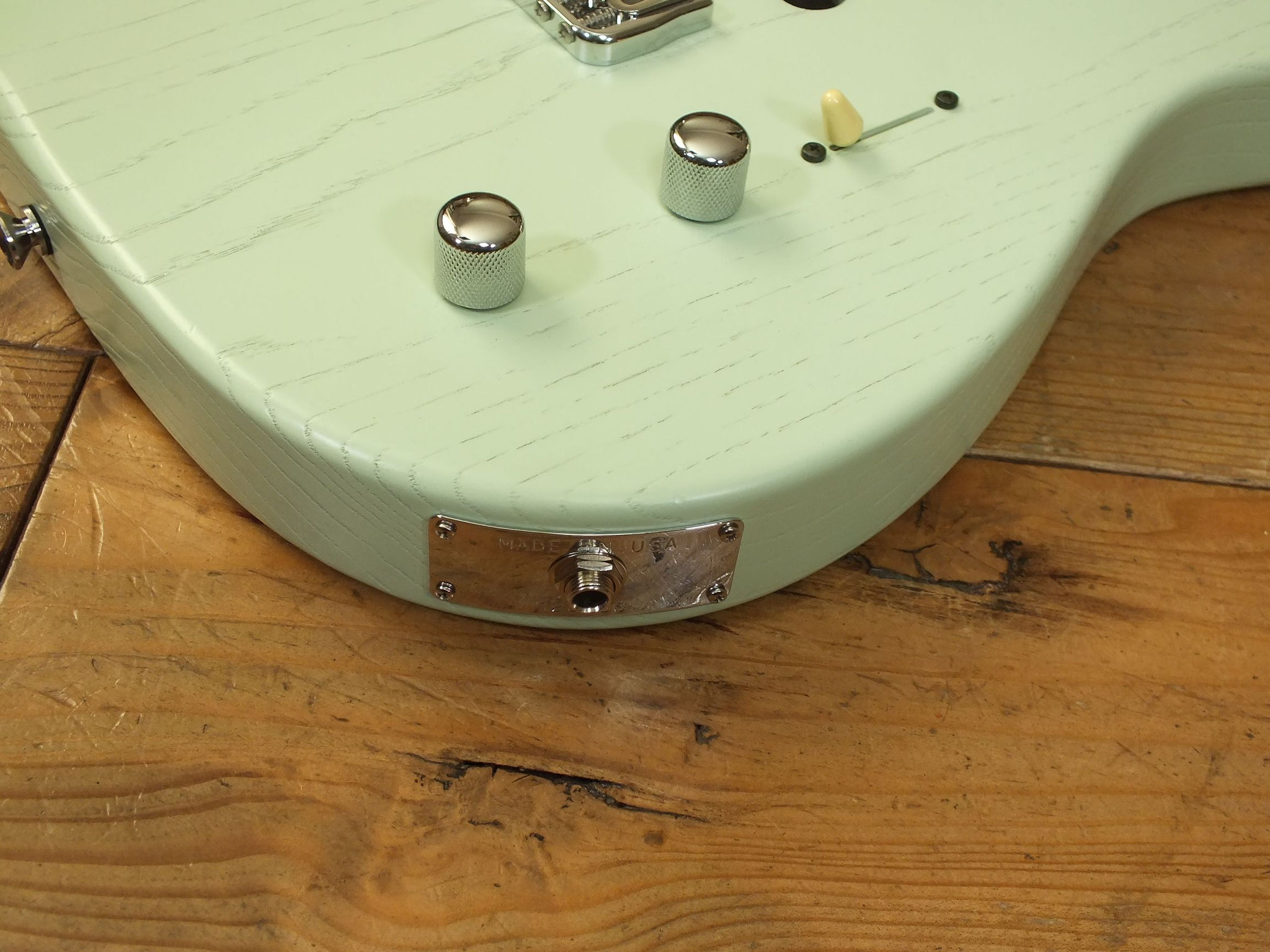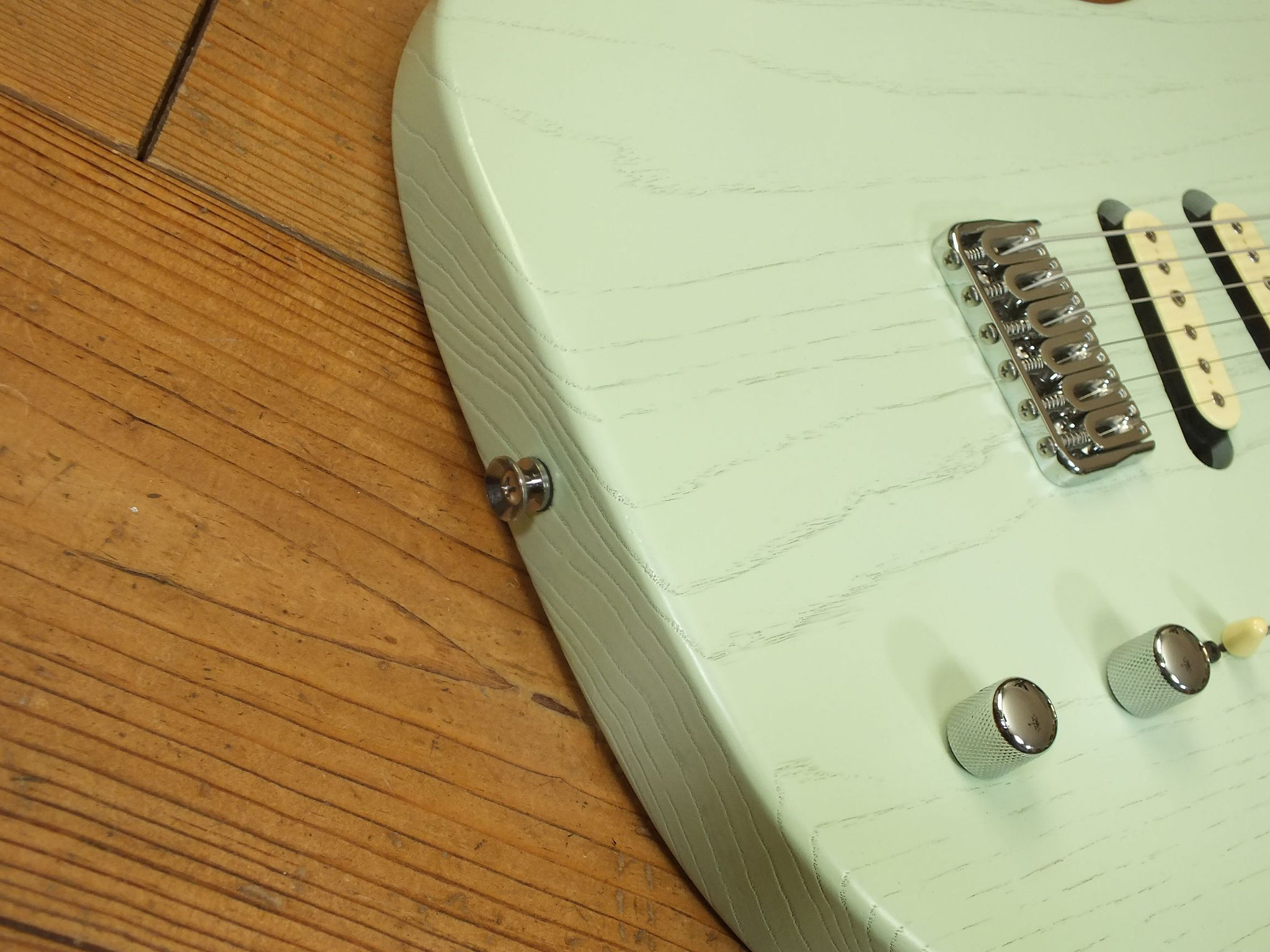 Konturierter Eschen-Body mit abgeflachtem Hals-Übergang im "Raw Tone Seafoam Green" Finish mit Hipshot Fixed Bridge und "Strings Through Body" Saitenführung.