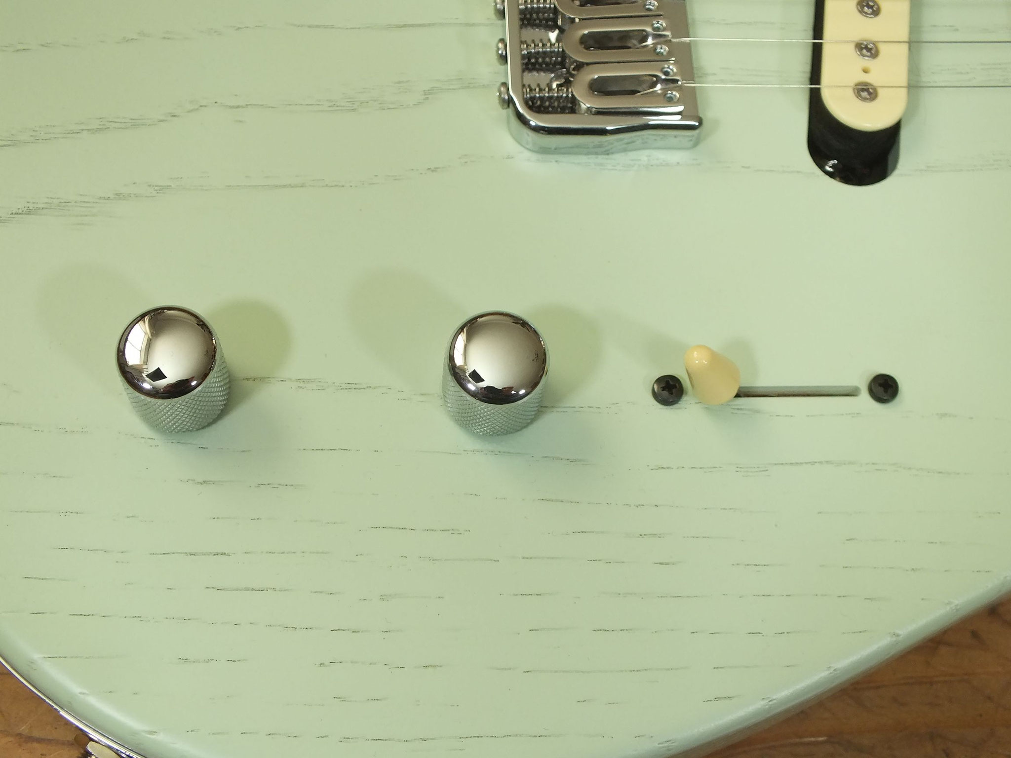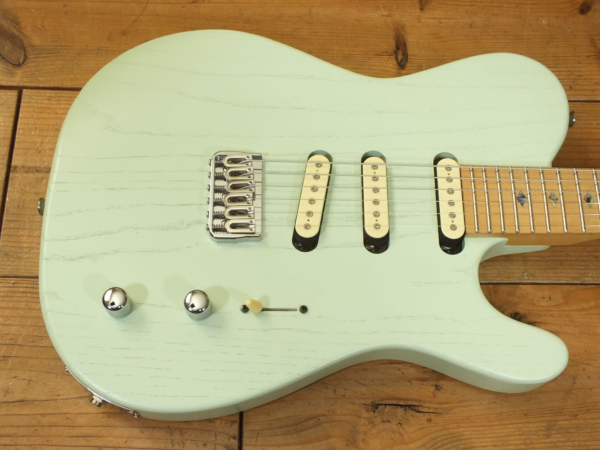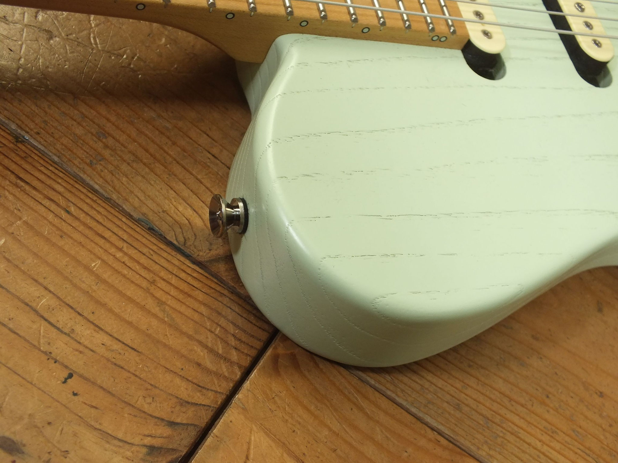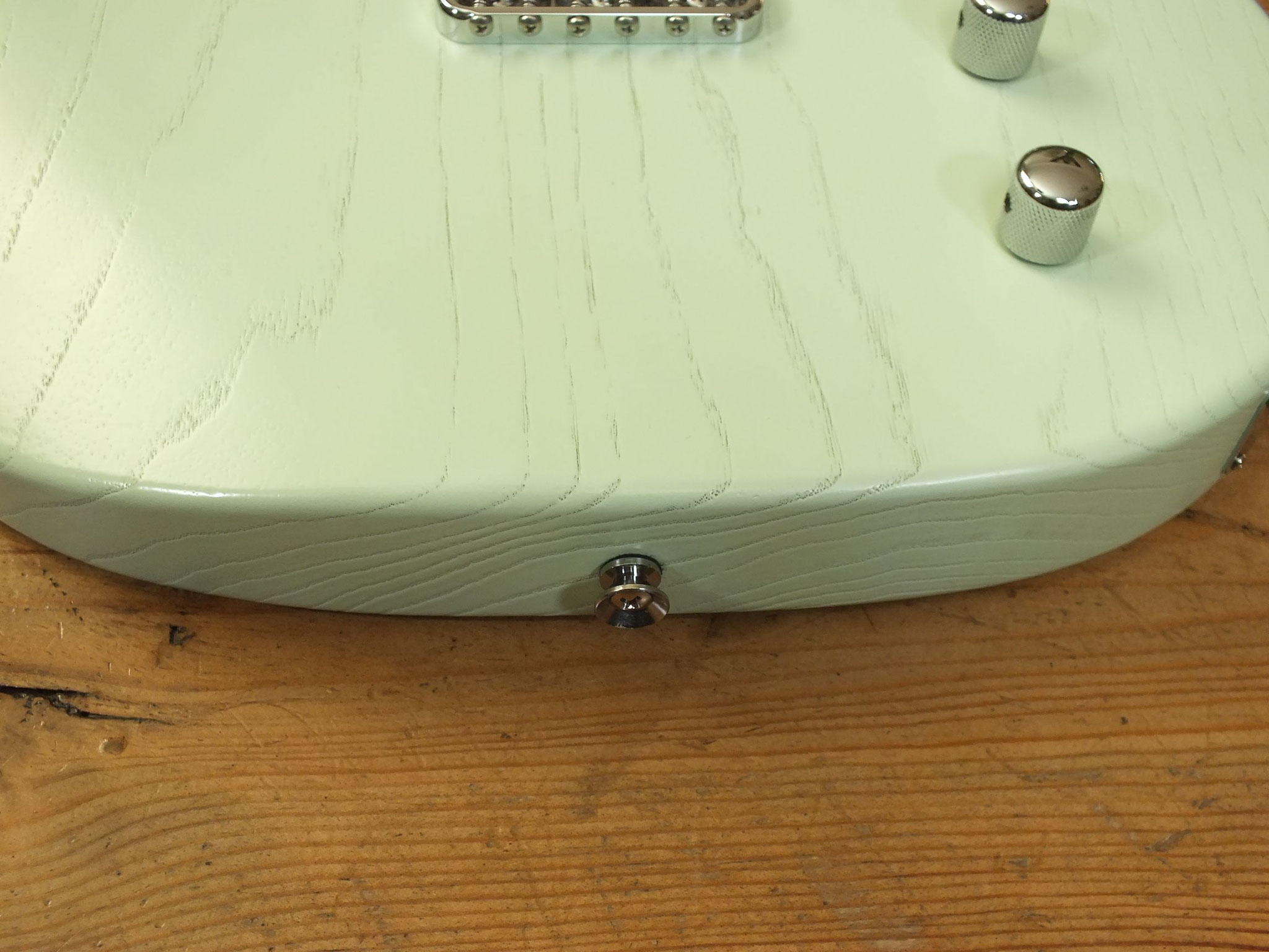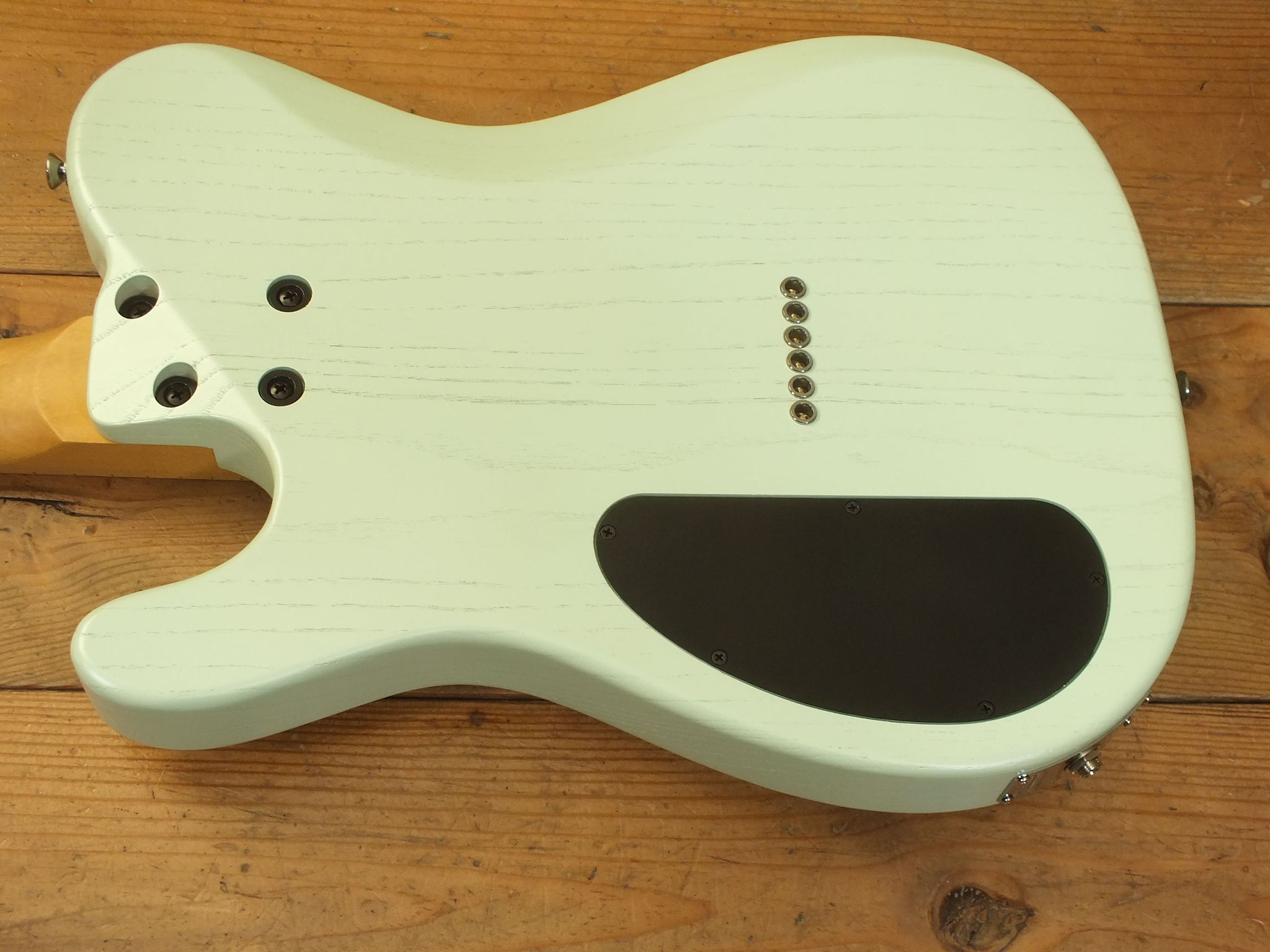 Konturierter Eschen-Body mit abgeflachtem Hals-Übergang im "Raw Tone Seafoam Green" Finish mit Hipshot Fixed Bridge und "Strings Through Body" Saitenführung.