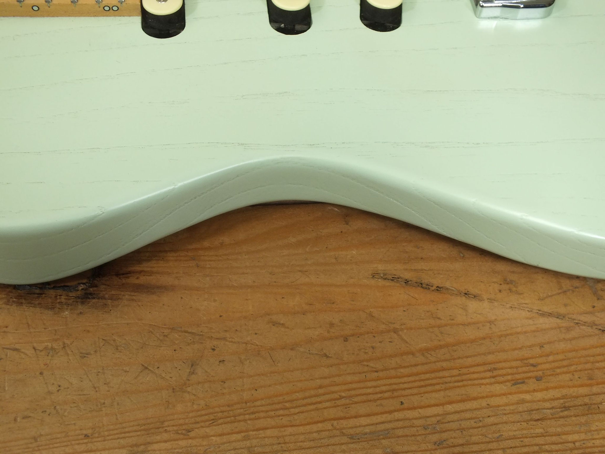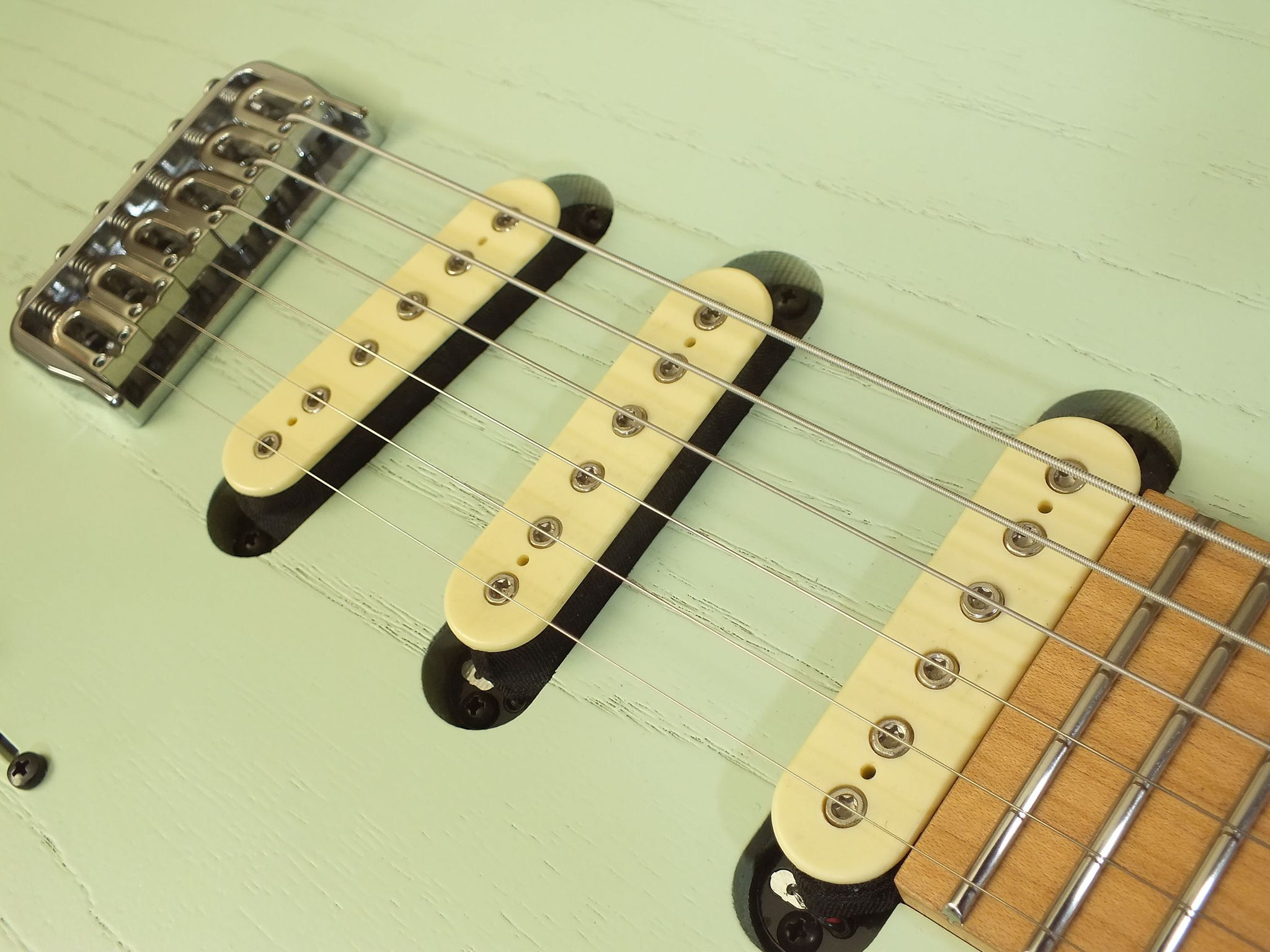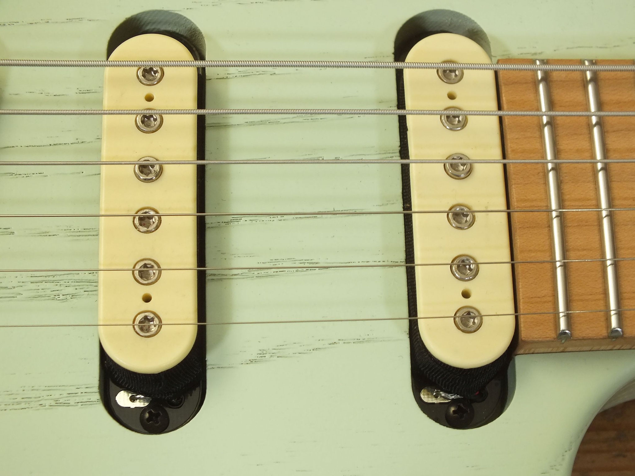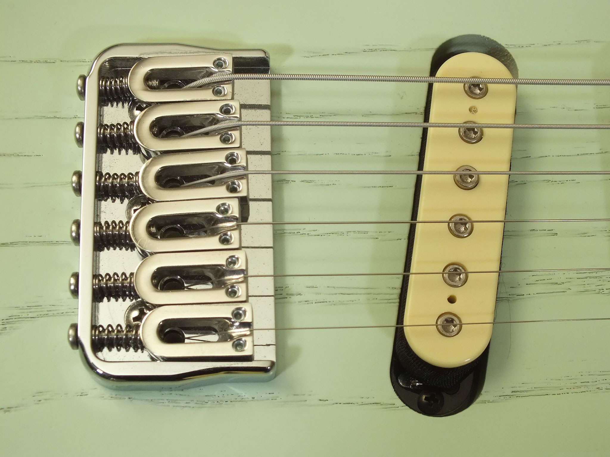 Konturierter Eschen-Body mit abgeflachtem Hals-Übergang im "Raw Tone Seafoam Green" Finish mit Hipshot Fixed Bridge und "Strings Through Body" Saitenführung.