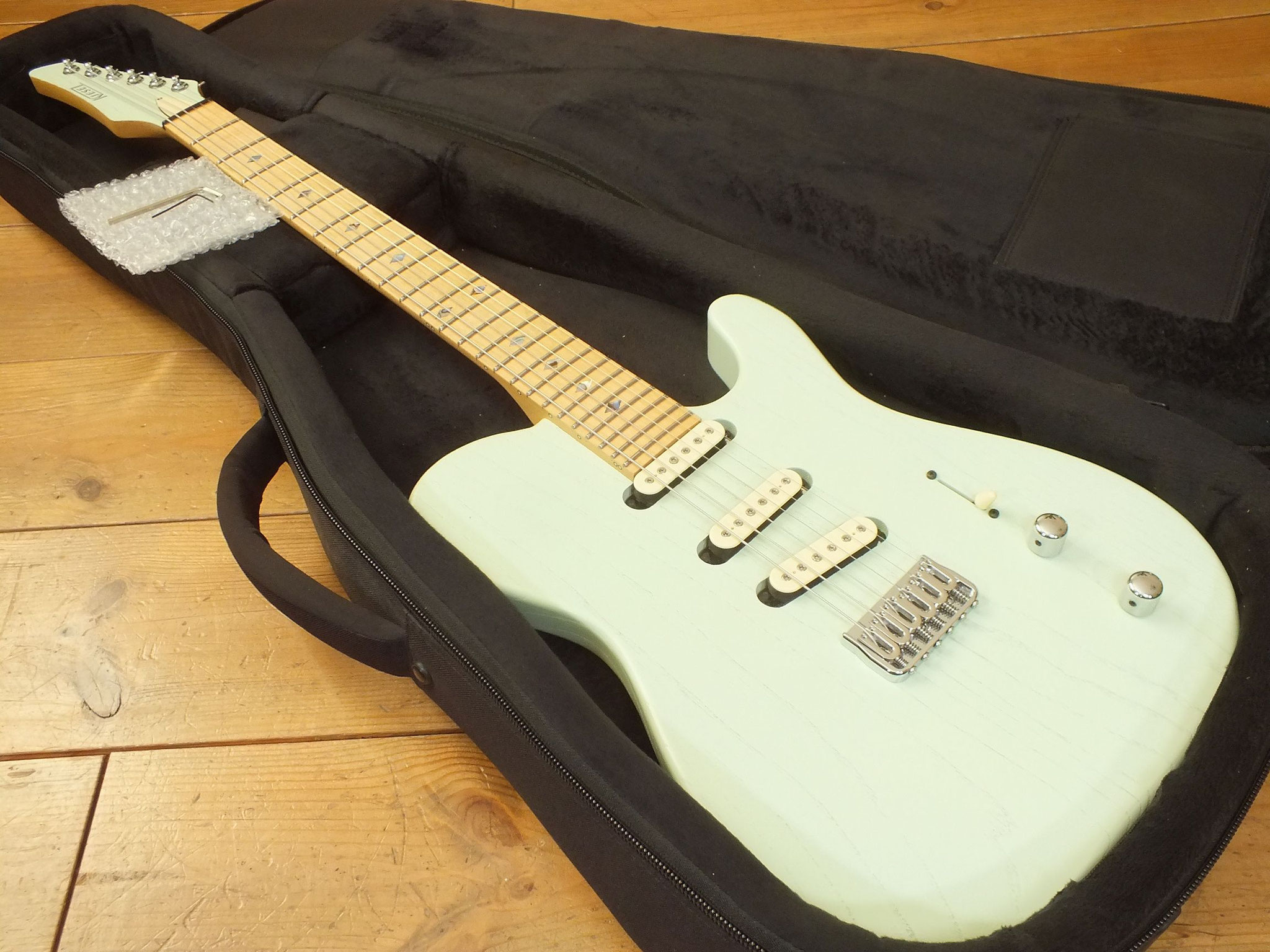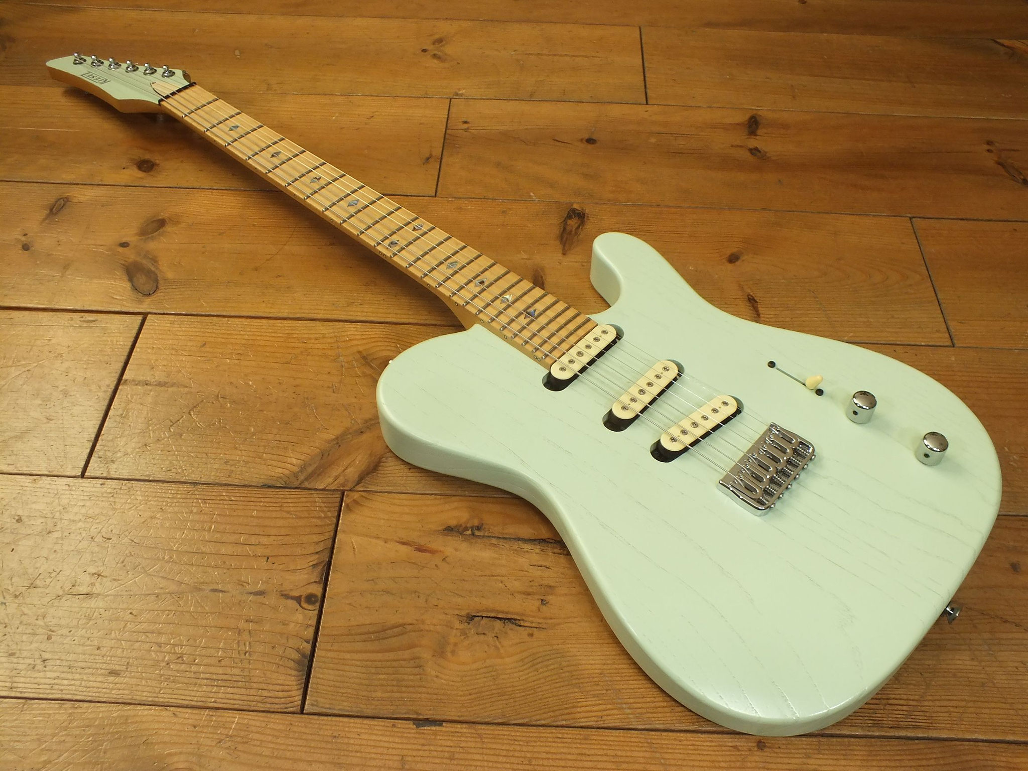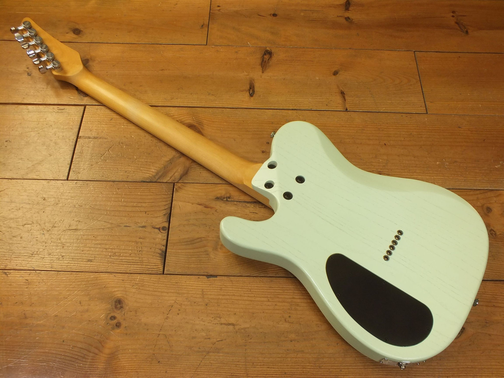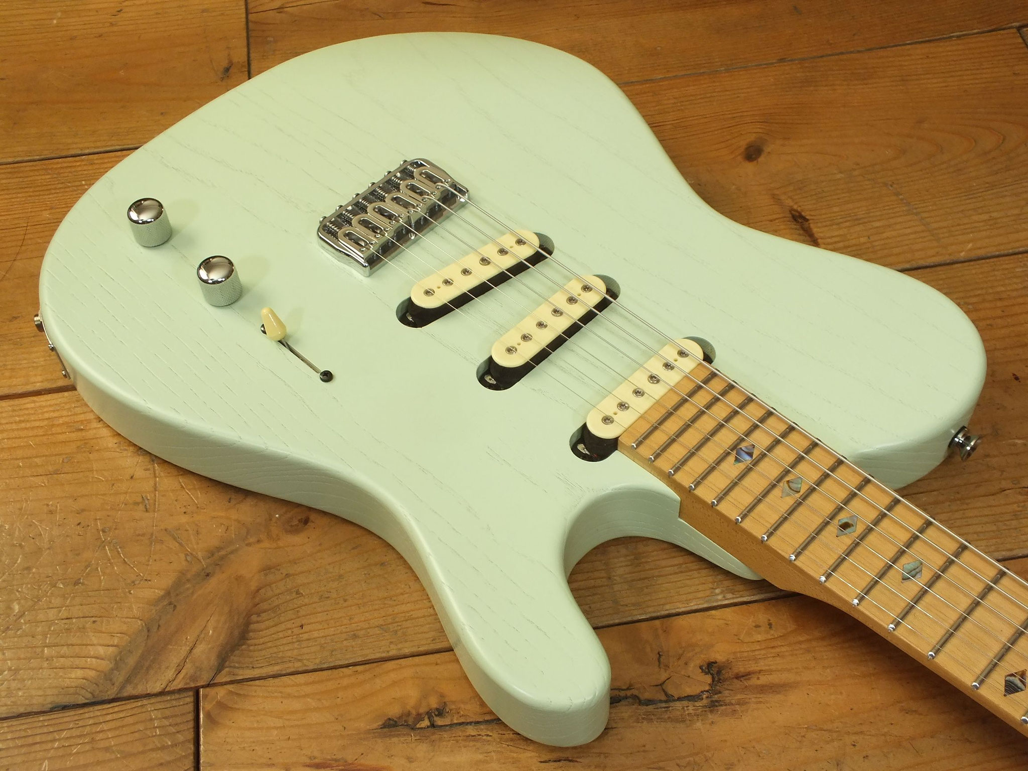Konturierter Eschen-Body mit abgeflachtem Hals-Übergang im "Raw Tone Seafoam Green" Finish mit Hipshot Fixed Bridge und "Strings Through Body" Saitenführung.