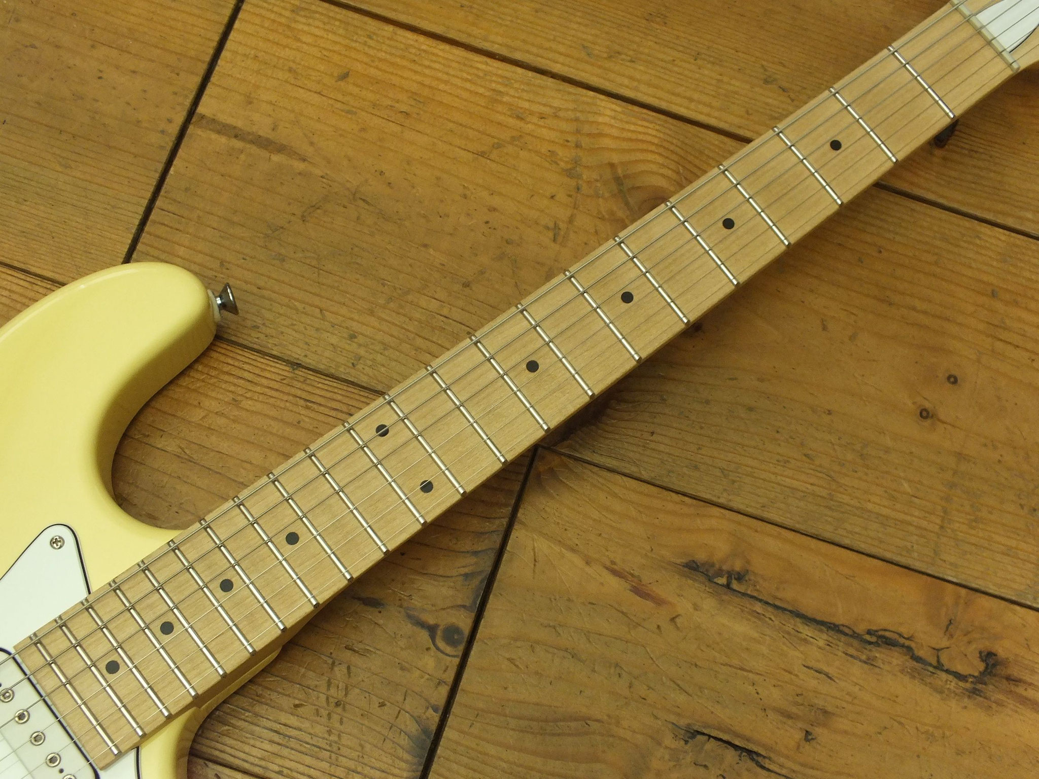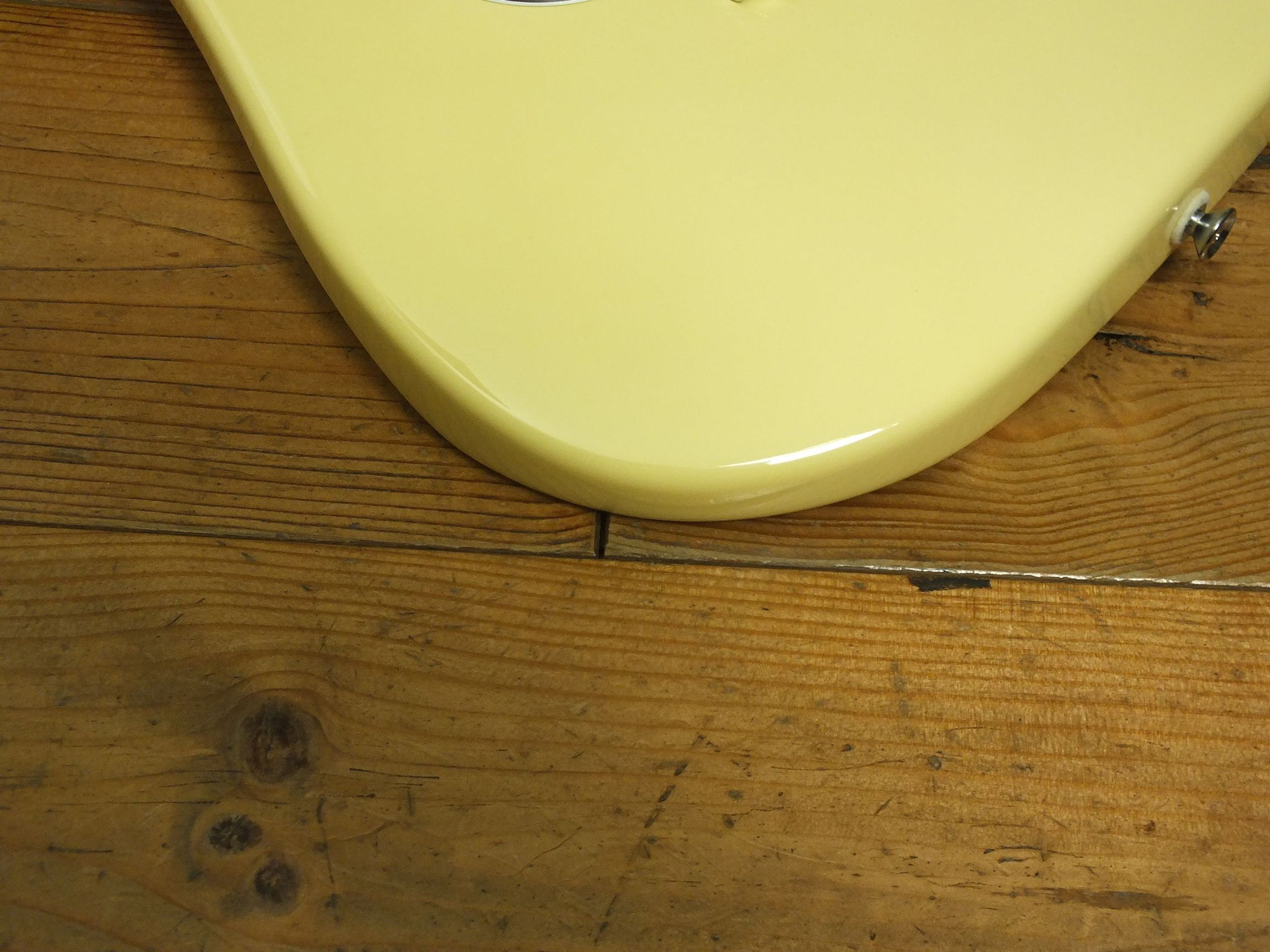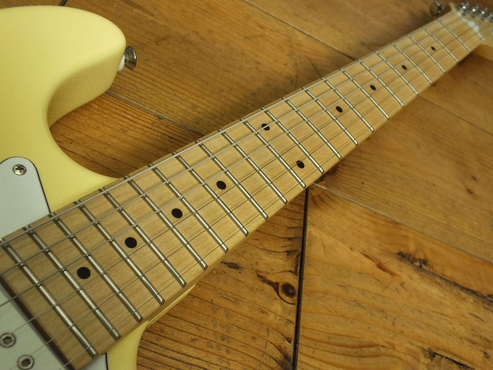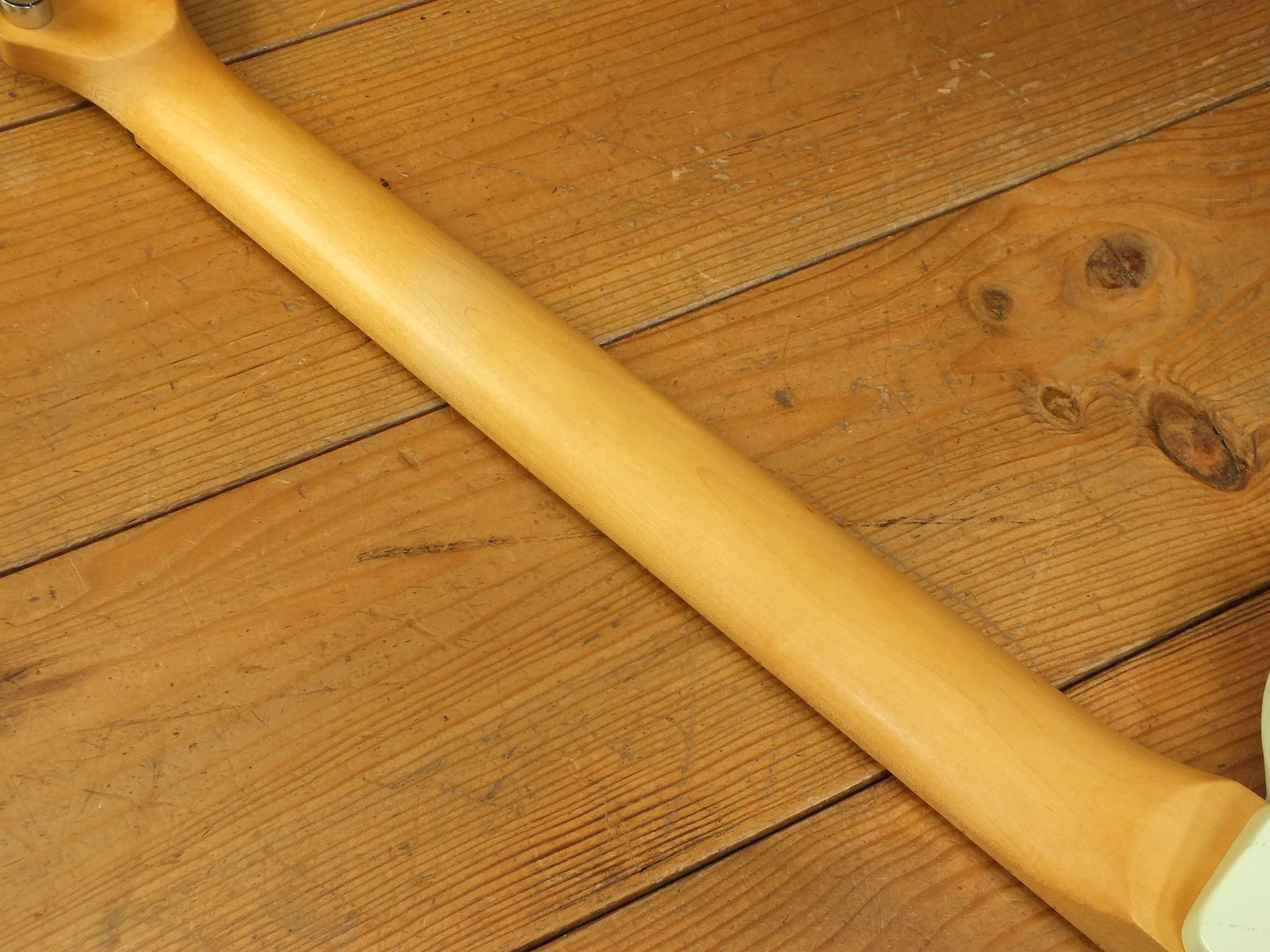 Konturierter Erlen-Body mit abgeflachtem Hals-Übergang im geschmackvollen "Vintage White" Finish.