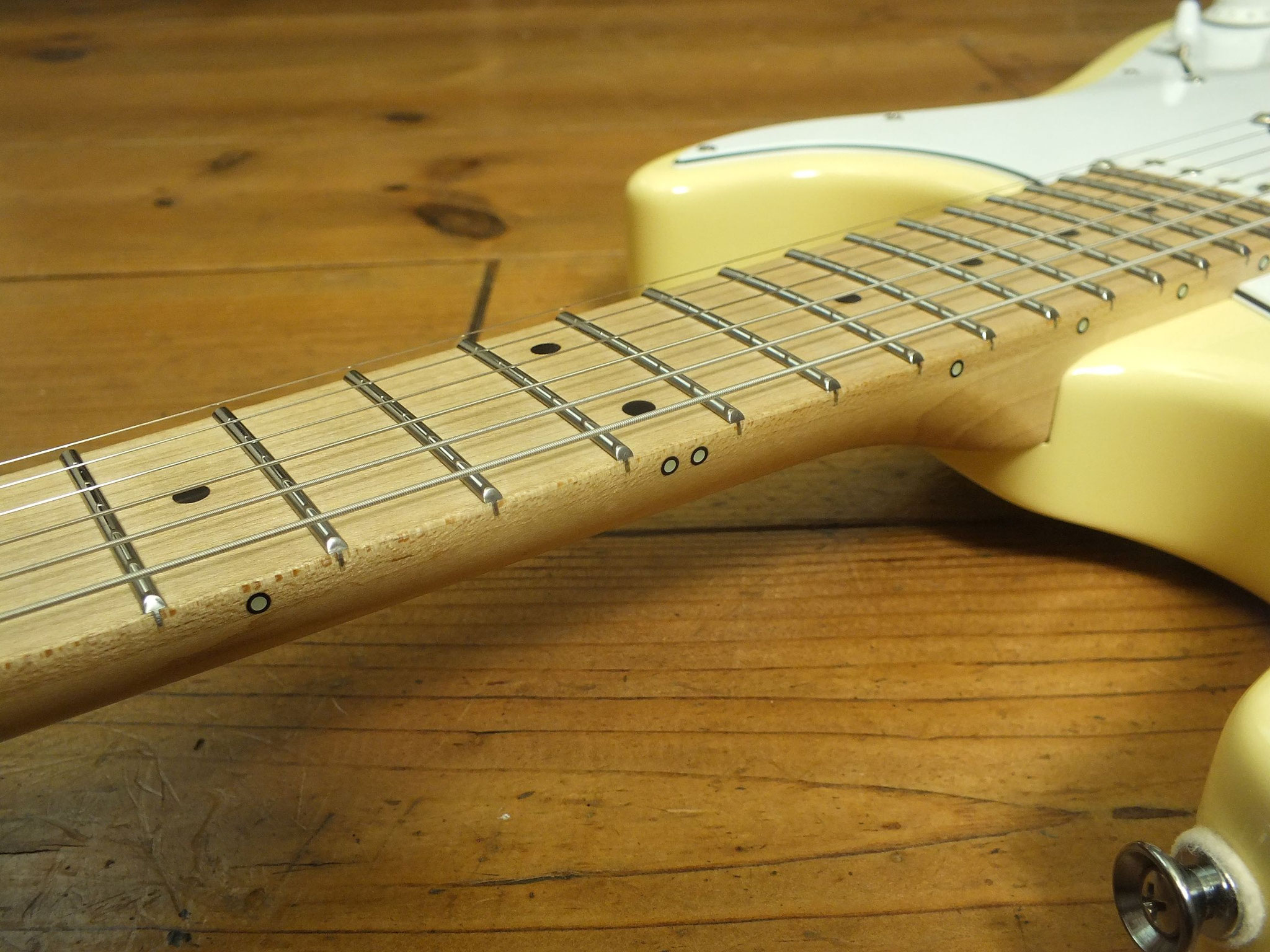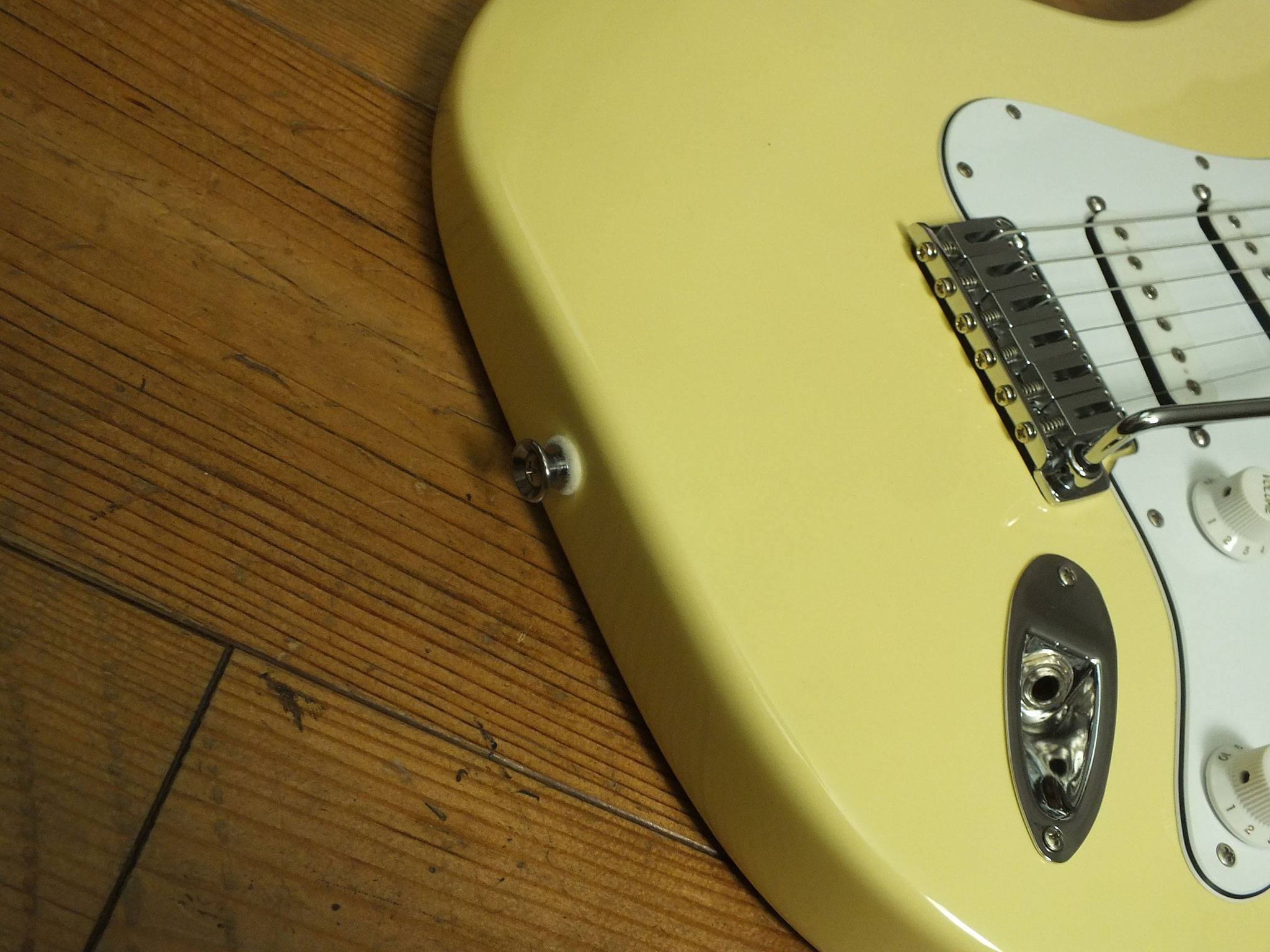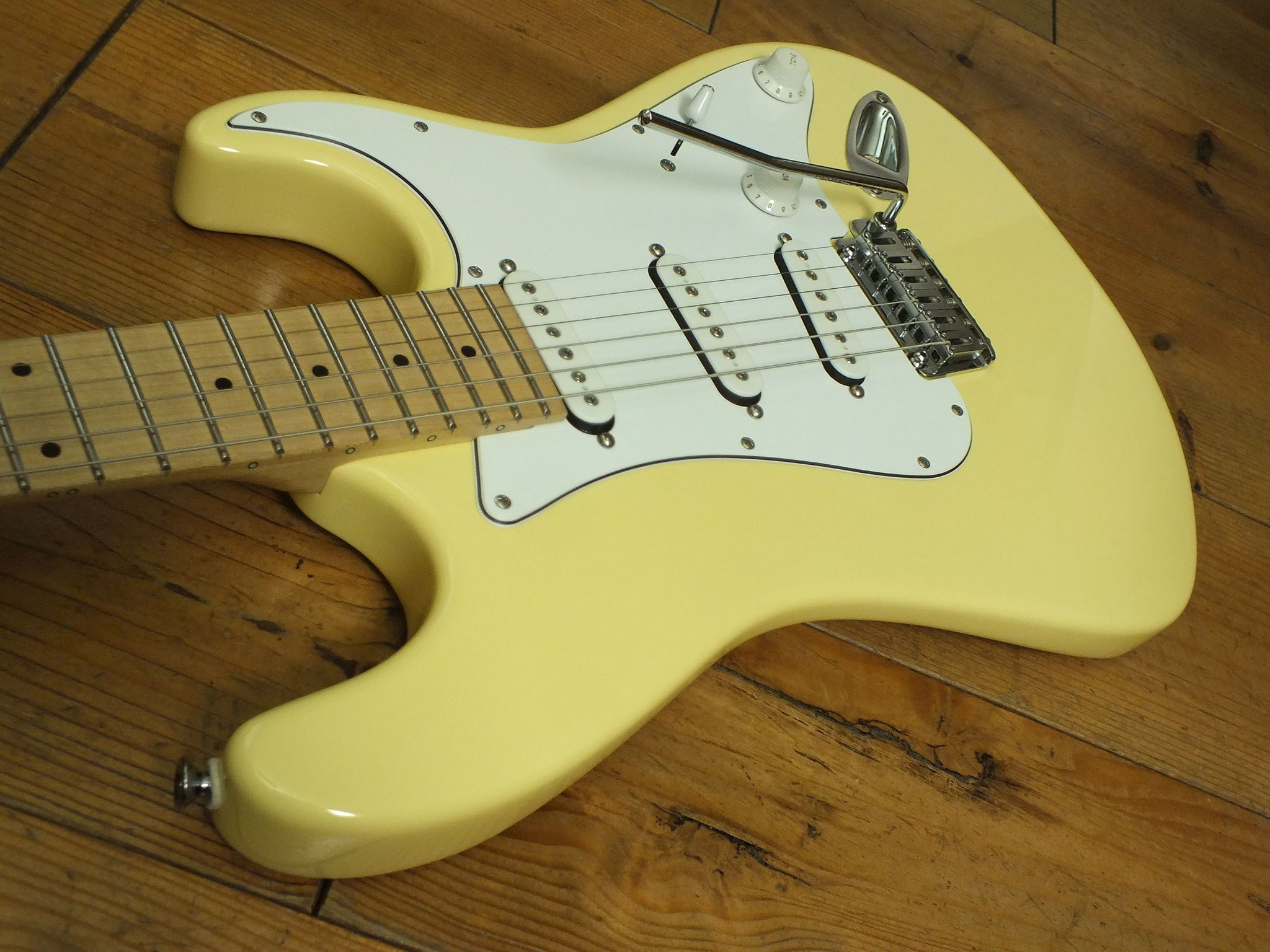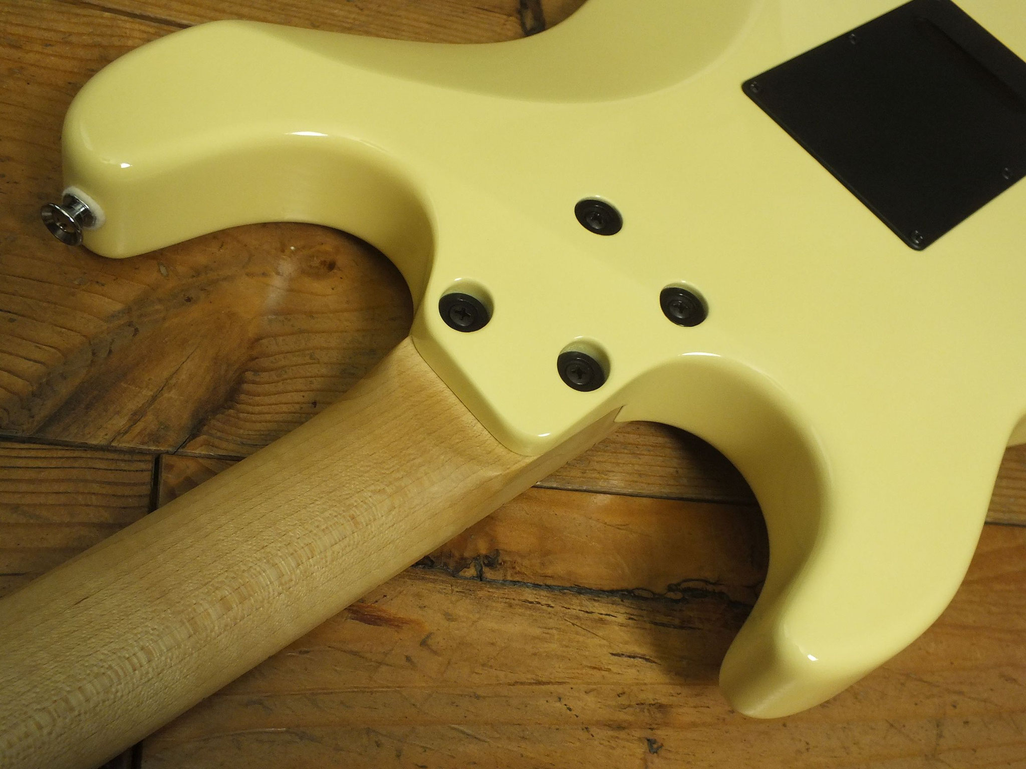 Konturierter Erlen-Body mit abgeflachtem Hals-Übergang im geschmackvollen "Vintage White" Finish.