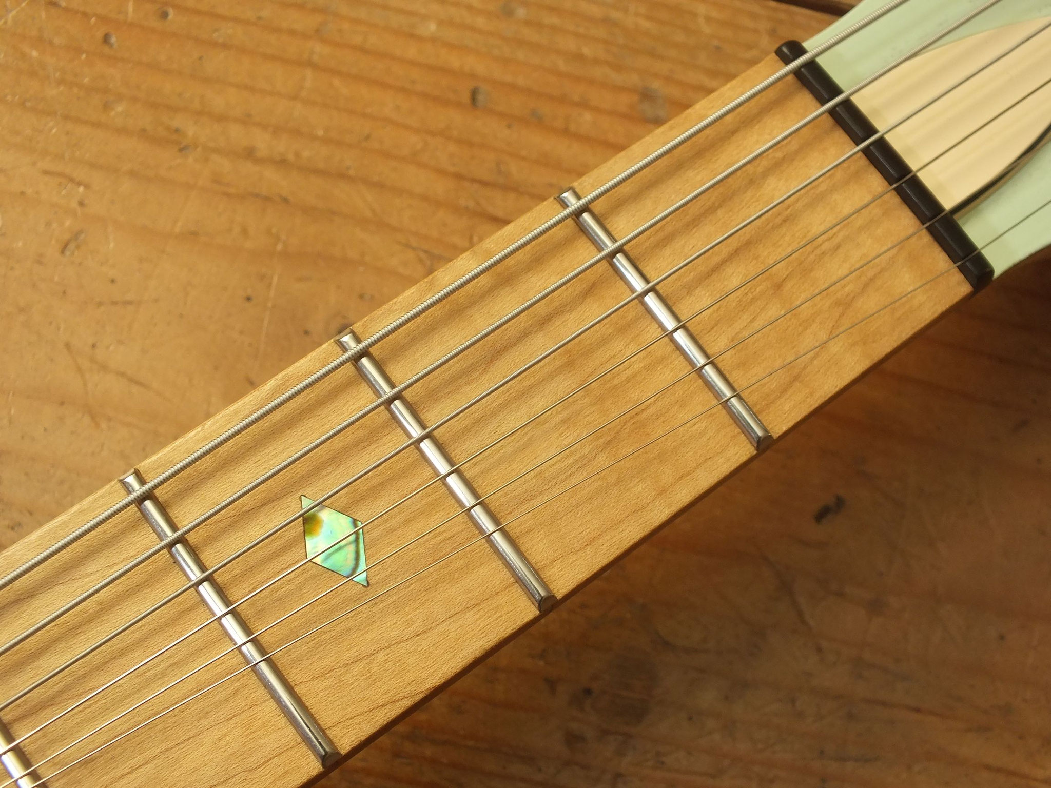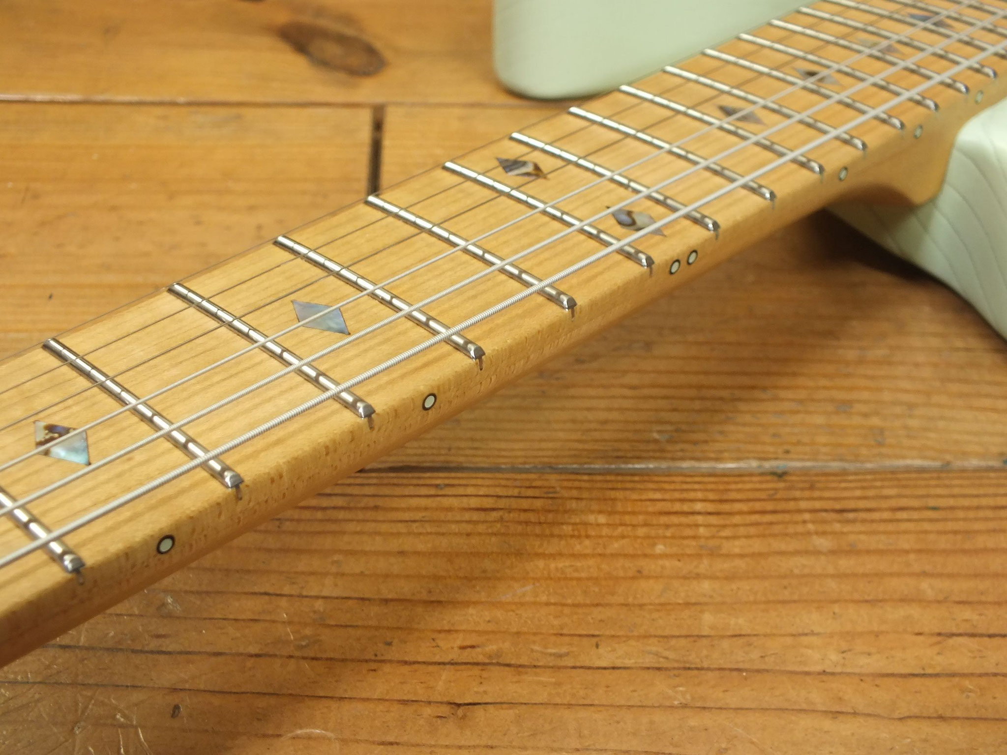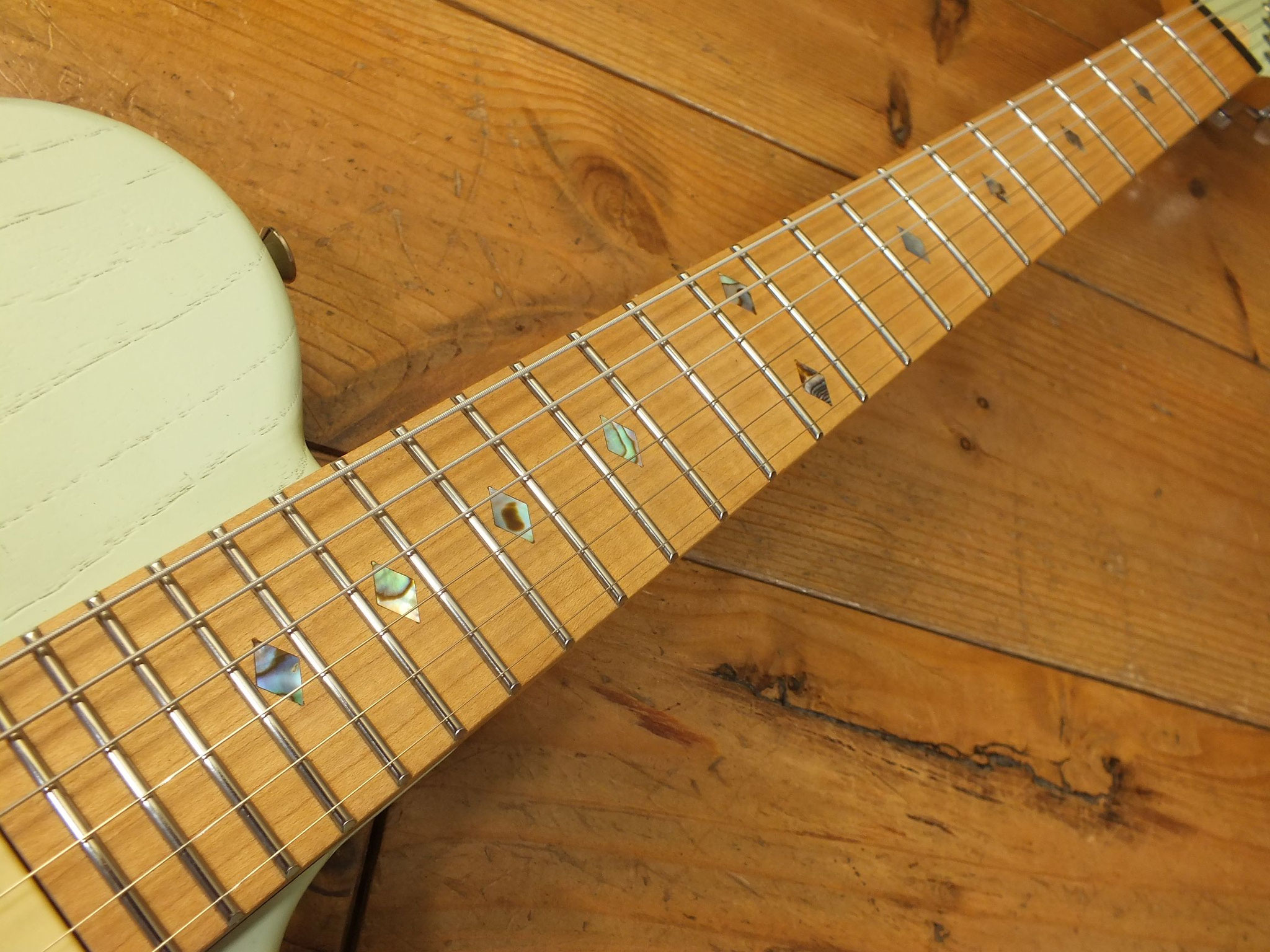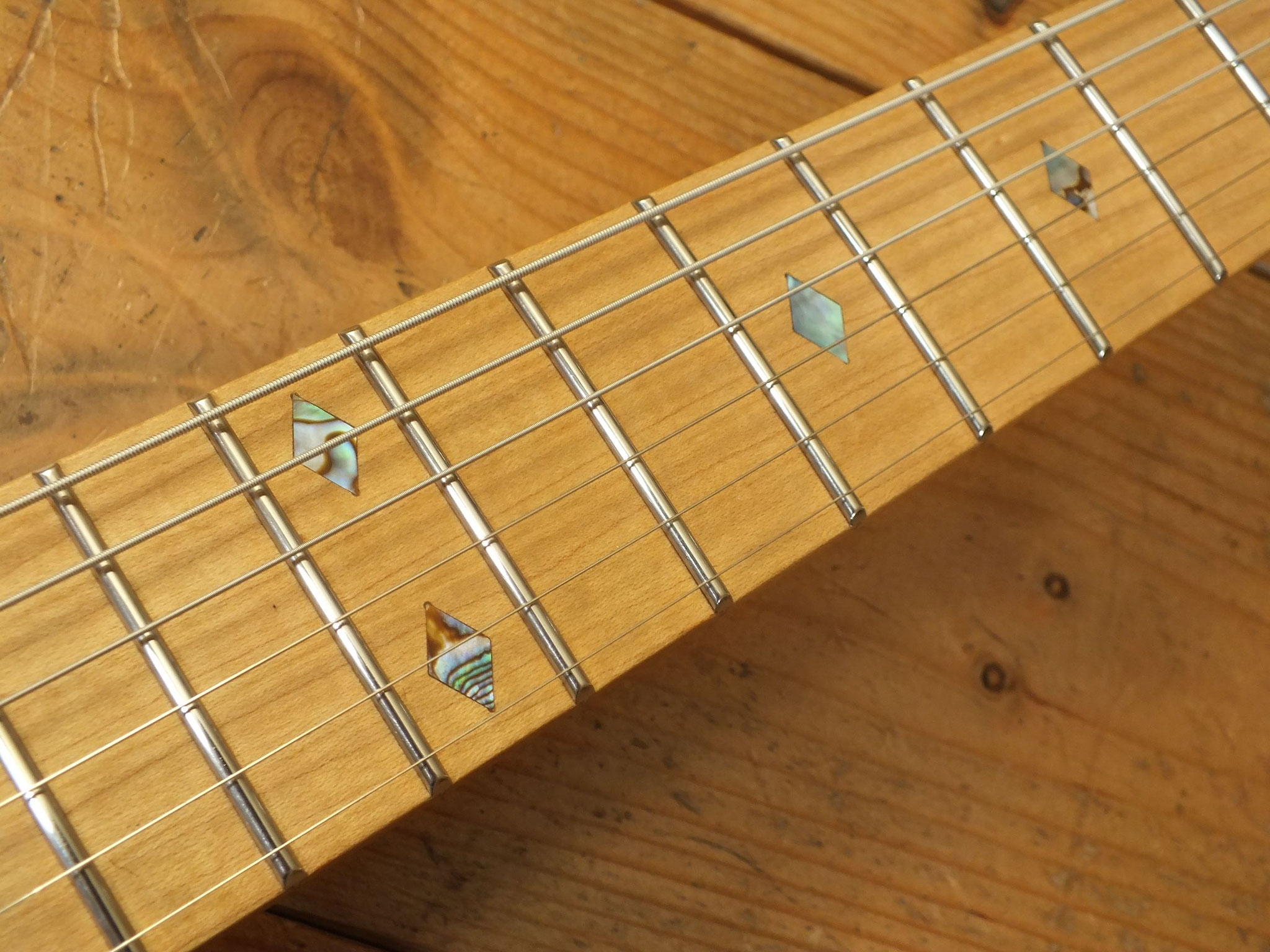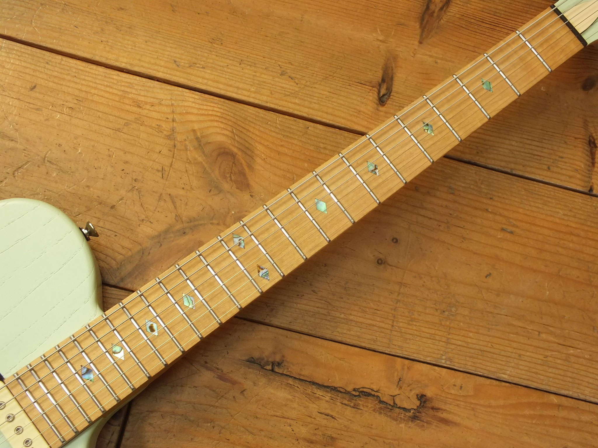 Schlanker Ahorn-Hals mit Ahorn-Griffbrett (12" Radius), 22 verschleißfreien Jumbo Stahl-Bünden, Abalone Diamond Inlays, fluoreszierenden Side Dots, Matching Reverse Headstock und Kiesel Locking Tuners.